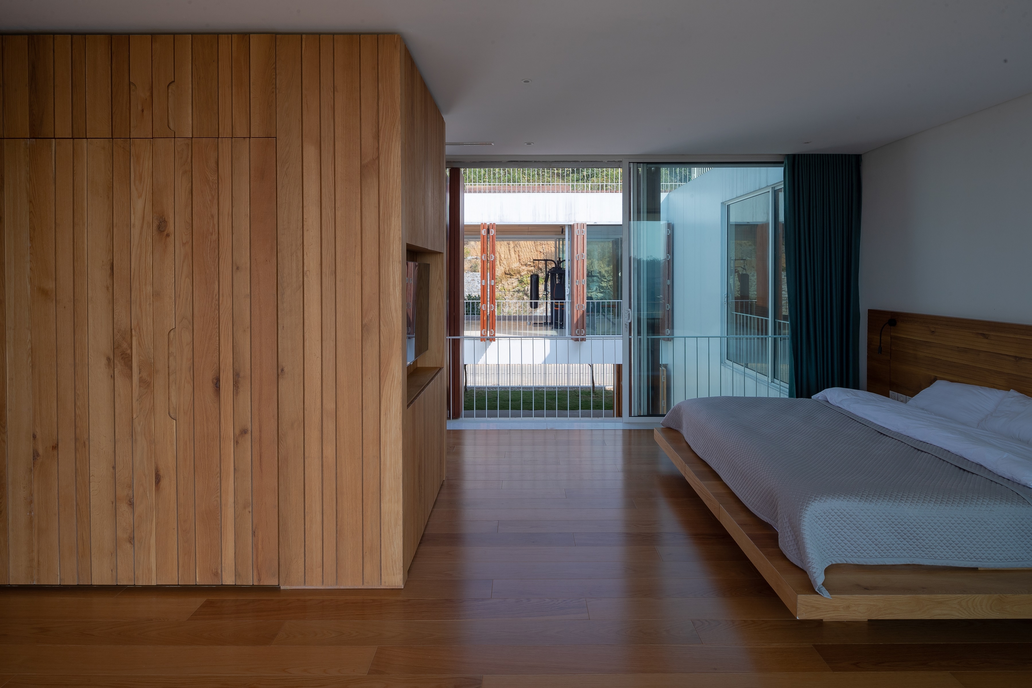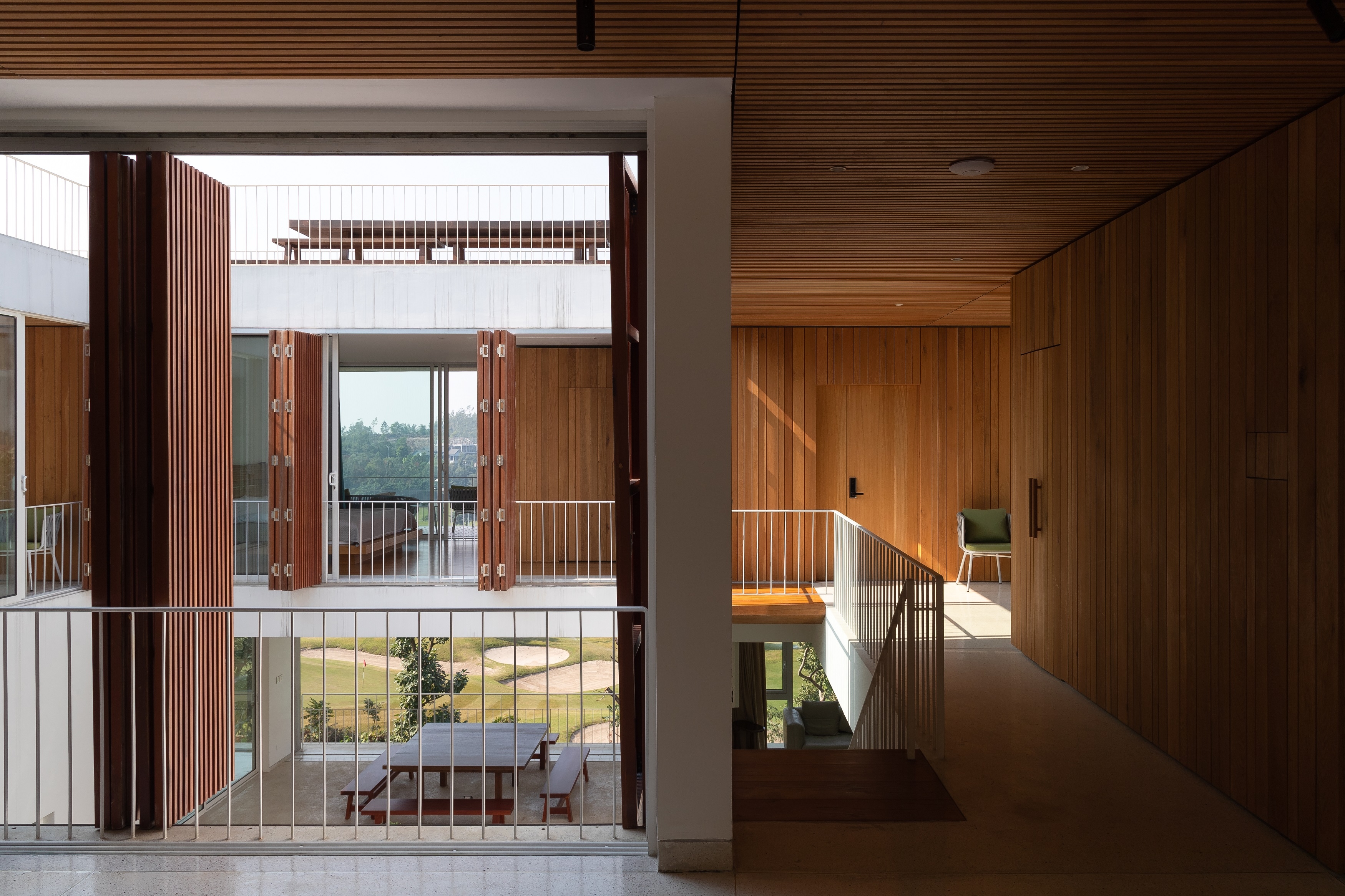 The entrance of the house is from the foot of the mountain, the architects designed the main hall on the ground floor , the front and the rear to be extended and connected to the courtyard, which helps the house not hide the valley landscape for everyone could see from the main road.