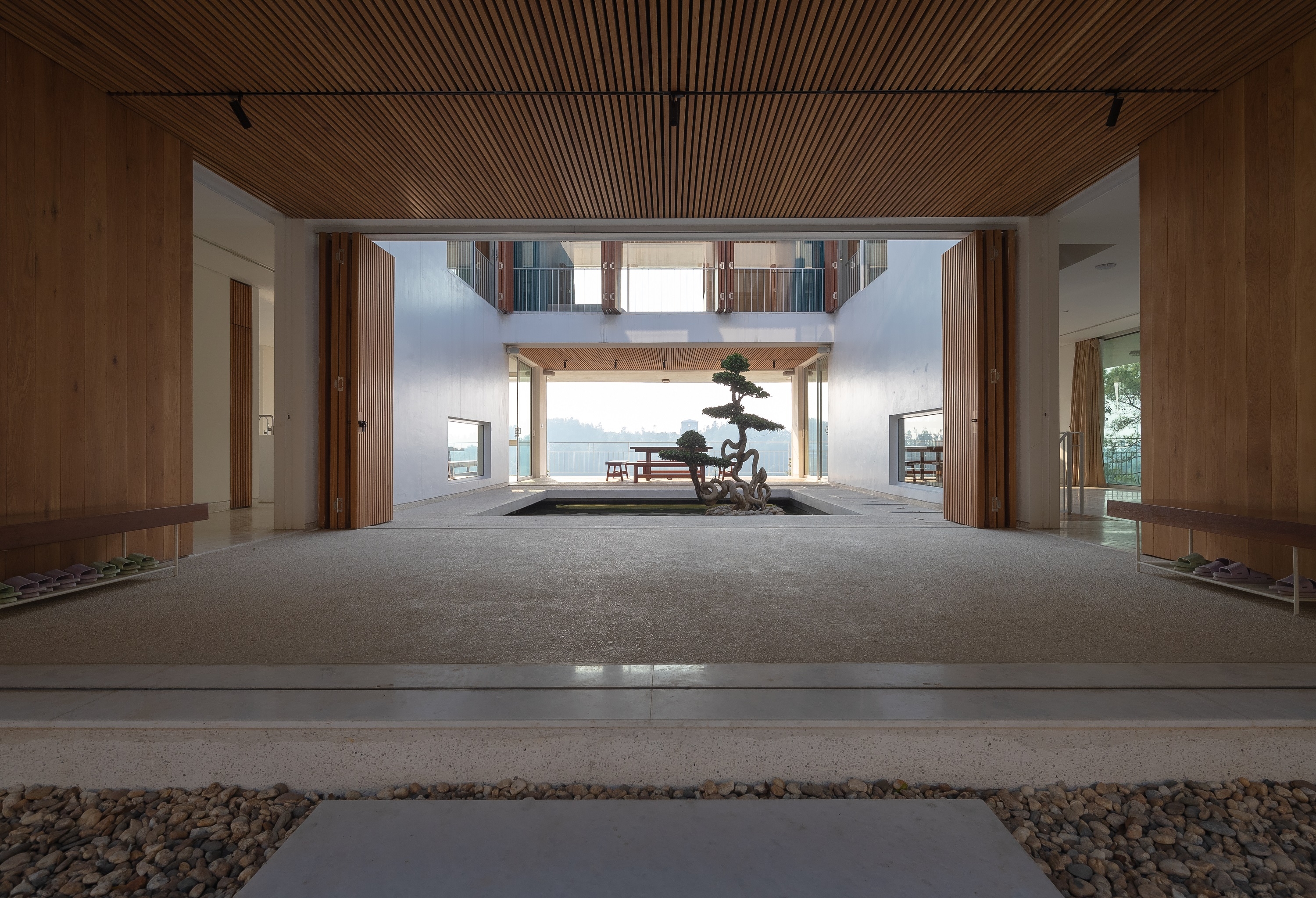 The courtyard and the pond also take part in ventilating to bring breeze into the house. The hall is designed open, is a place to sit down, have some tea, relax and feel the changing moments of the weather, the scenery, the sunshine and the rain.