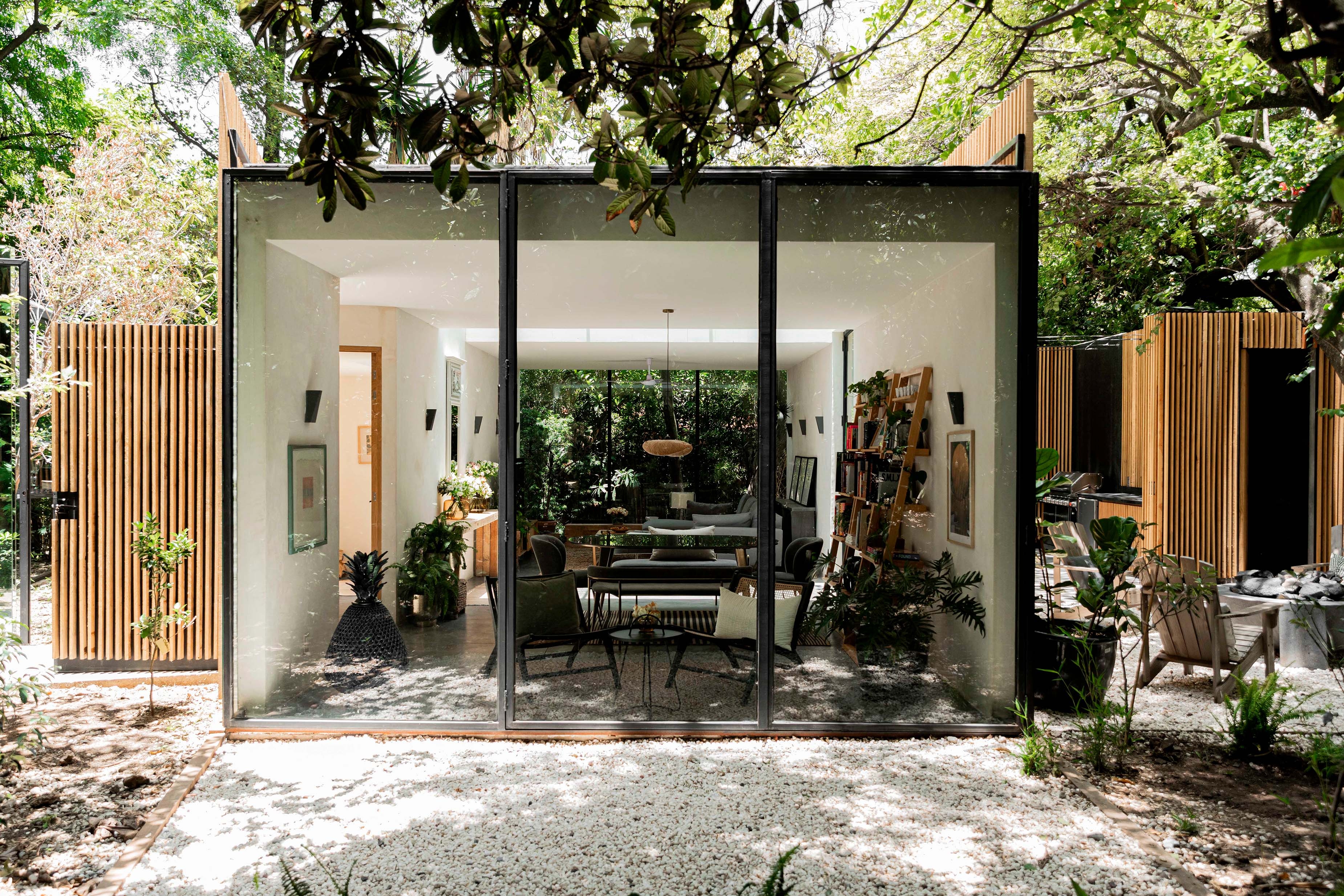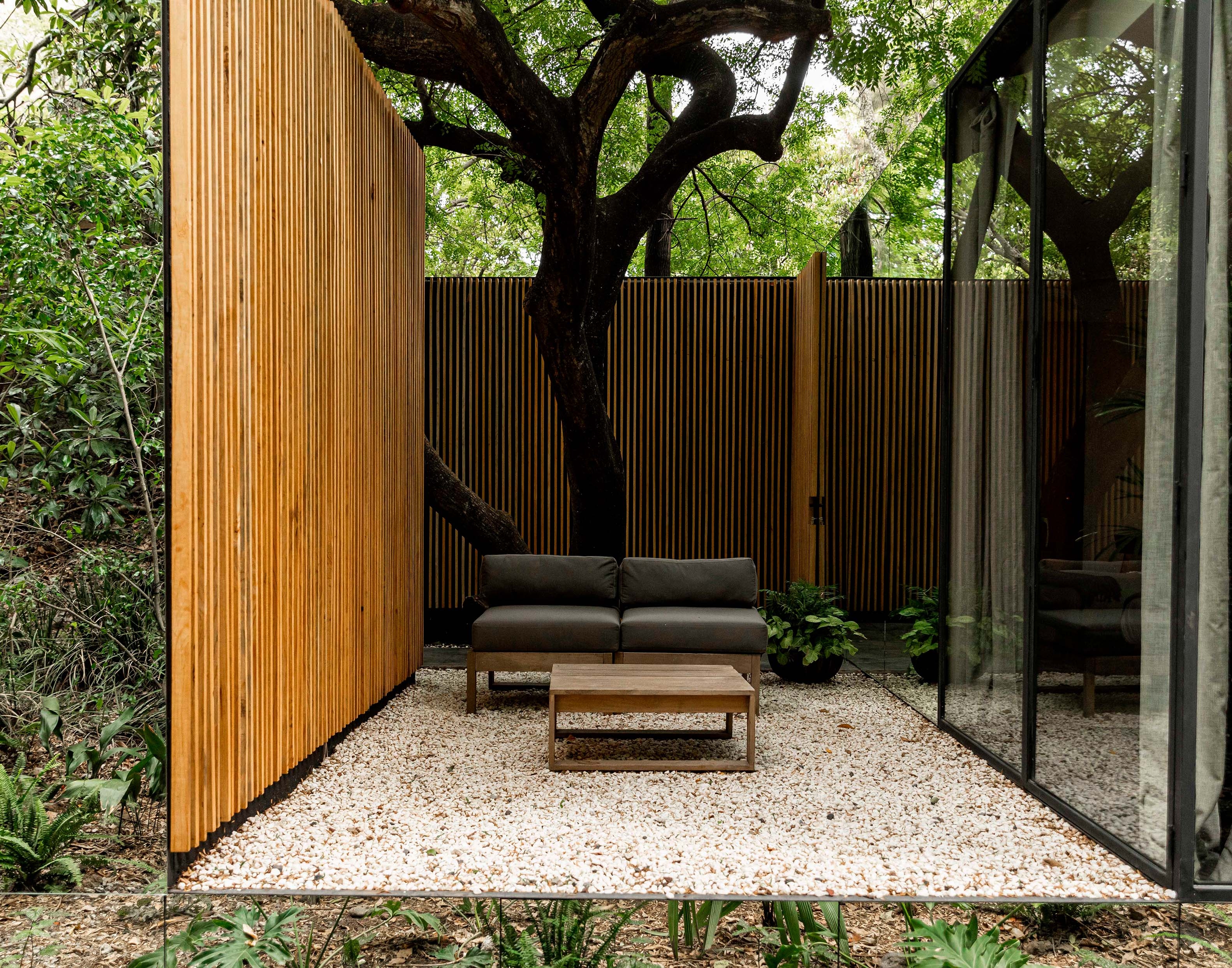 Casa Mague’s concept is based following the mesoamerican worldview, where trees have a symbolic meaning starting from the roots to the trunks, to the canopy. The project is divided into three levels: a mirror base that reflects the ground, giving the architecture a floating appearance. The living space, located at the same level. And the natural outer cover formed by the foliage of the trees; all of the preexisting vegetation was respected in the design and construction