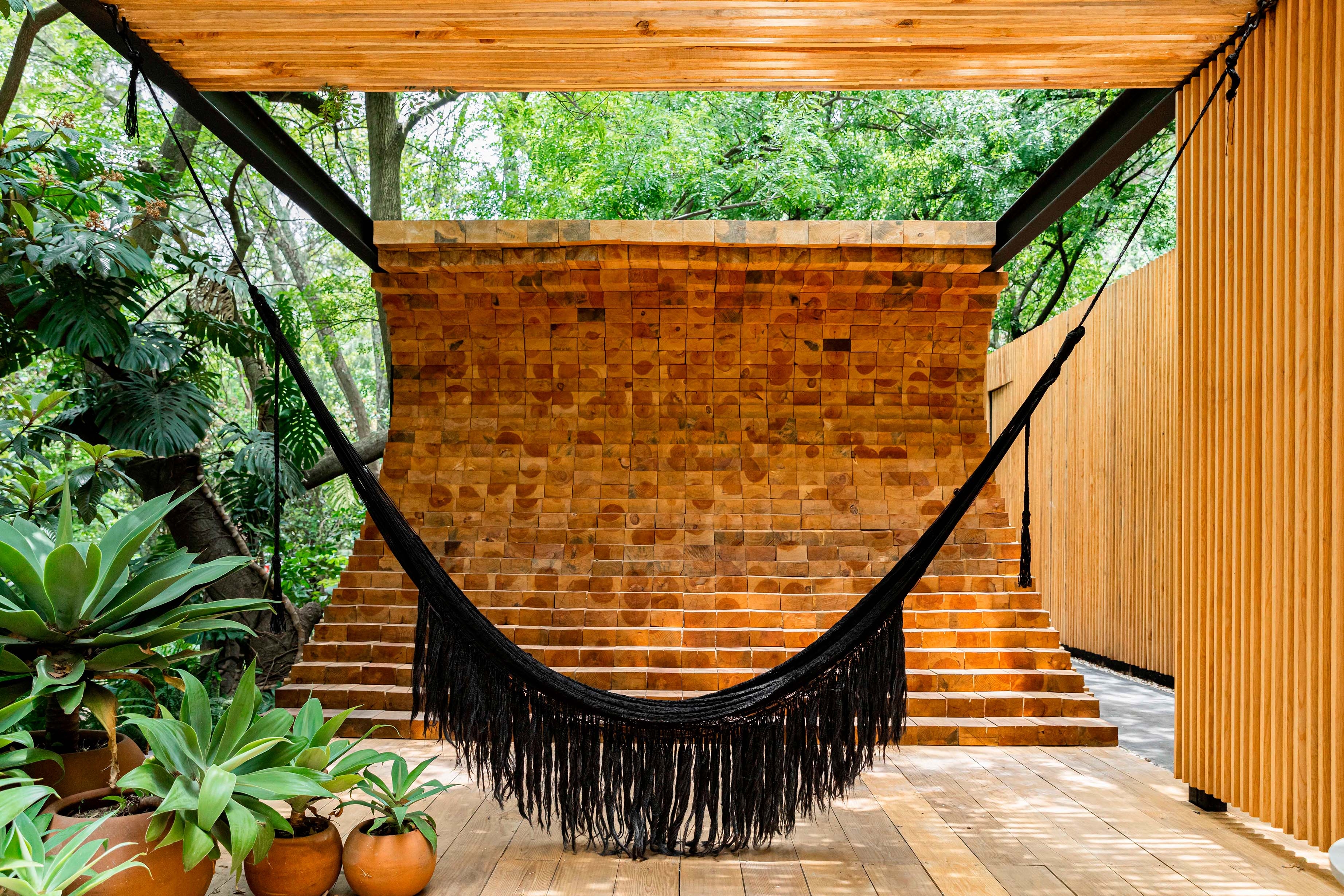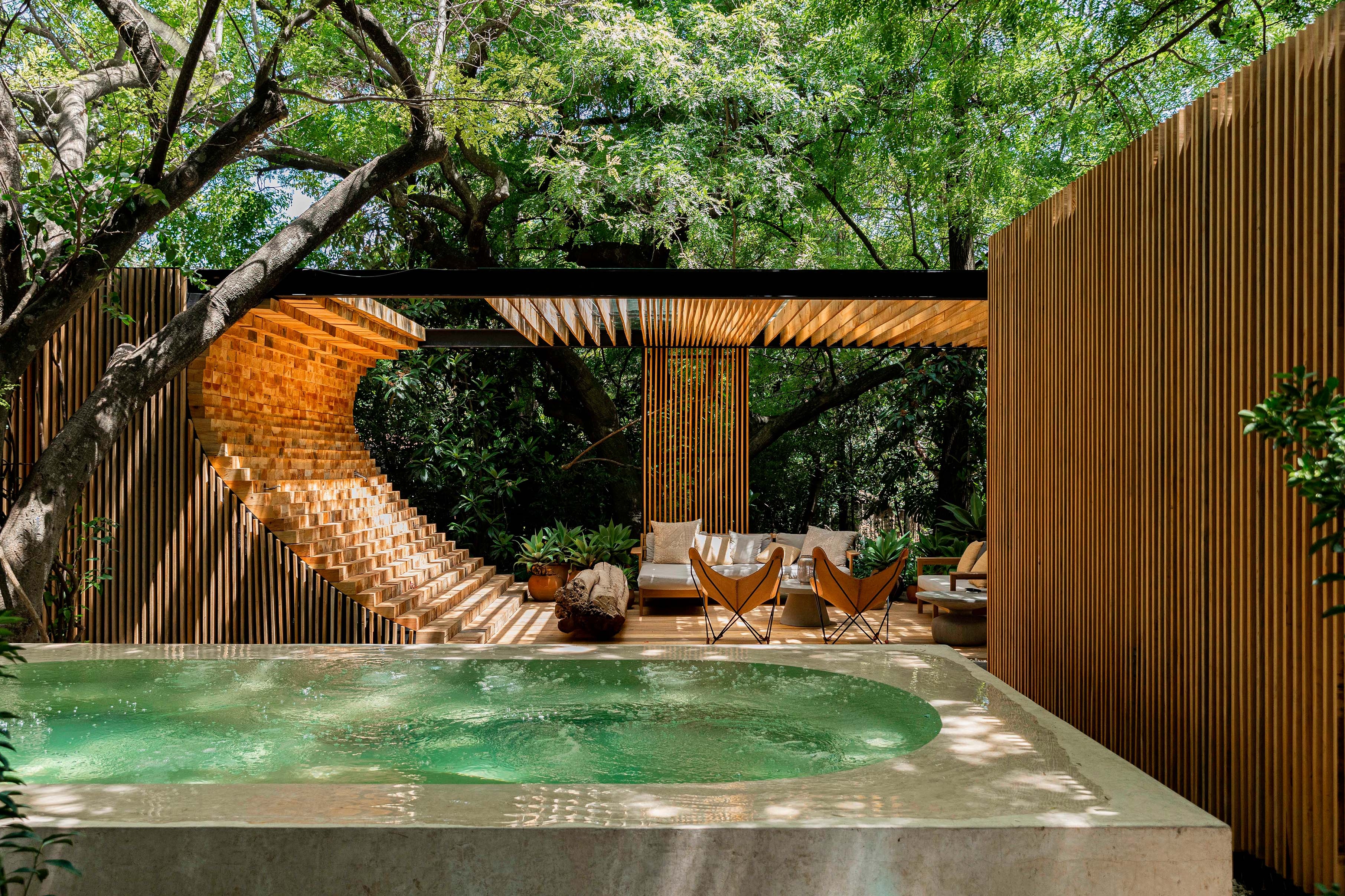 The design is dominated by local materials such as wood, stone and chukum (ancient mayan stucco). Sustainability was prioritized on the project, reaching a minimal footprint by the employment of rainwater harvesting, a water treatment system, energy consumption reduction through solar panels and waste management for compost creation and glass, aluminum and cardboard recycling, using only local materials with low levels of VOC.
