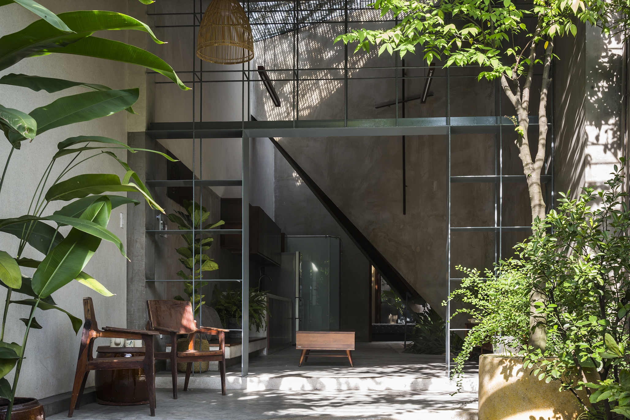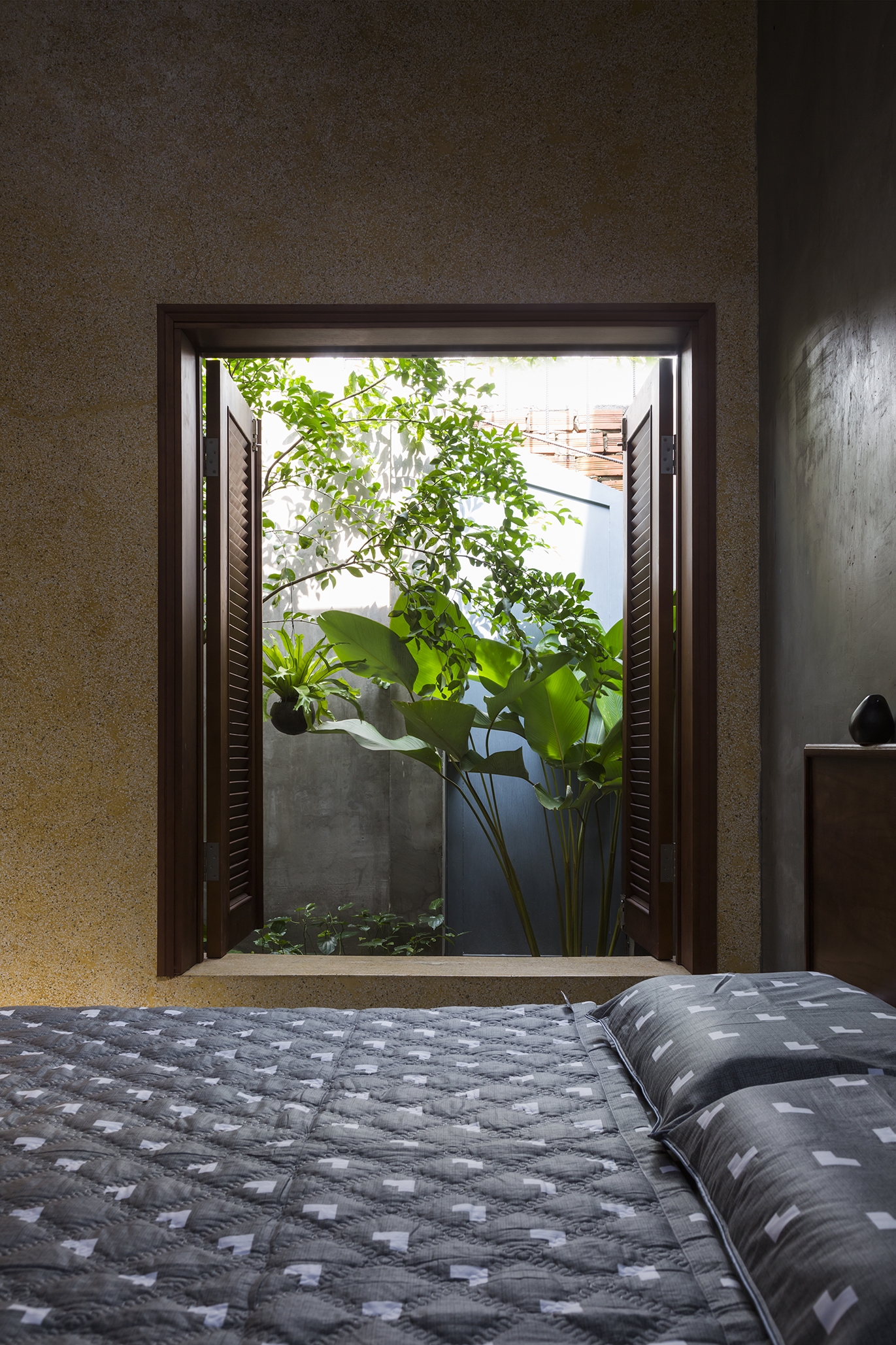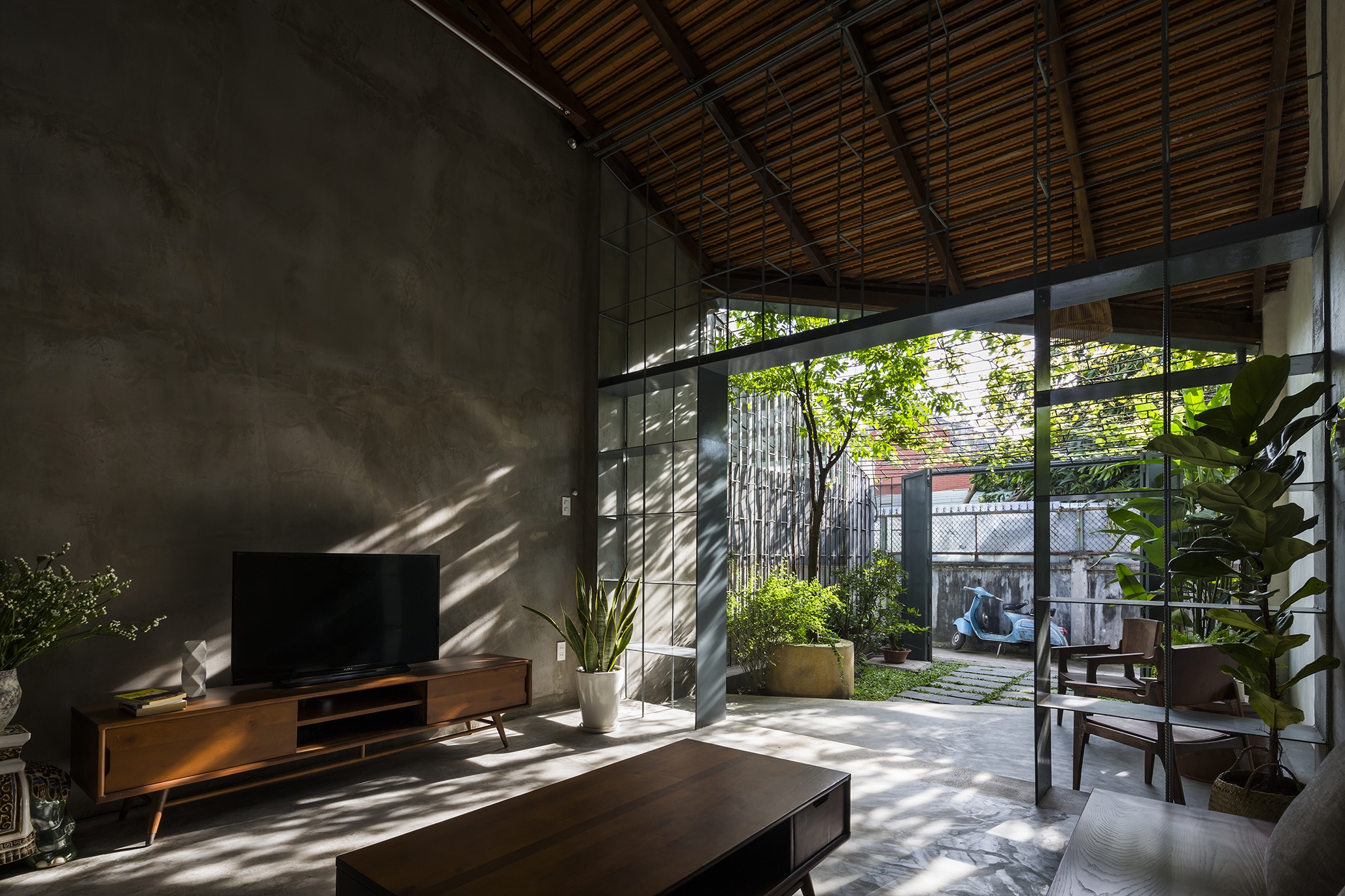 Door - in the overall space, we design only one main door to reach the house. The house is a seamless connection, there is no limit between home and garden - feeling freedom. We use the iron shelves as a way of positioning between the living room and the porch, but do not lose the ventilation. The kitchen space is separated by natural - light, combining a small garden with some vegetables for cooking. A small garden like a wind trap circulates the air to the house. The continuity is long, the bedroom is arranged at the end of the house combined with a garden, the room opens the window to the natural space.