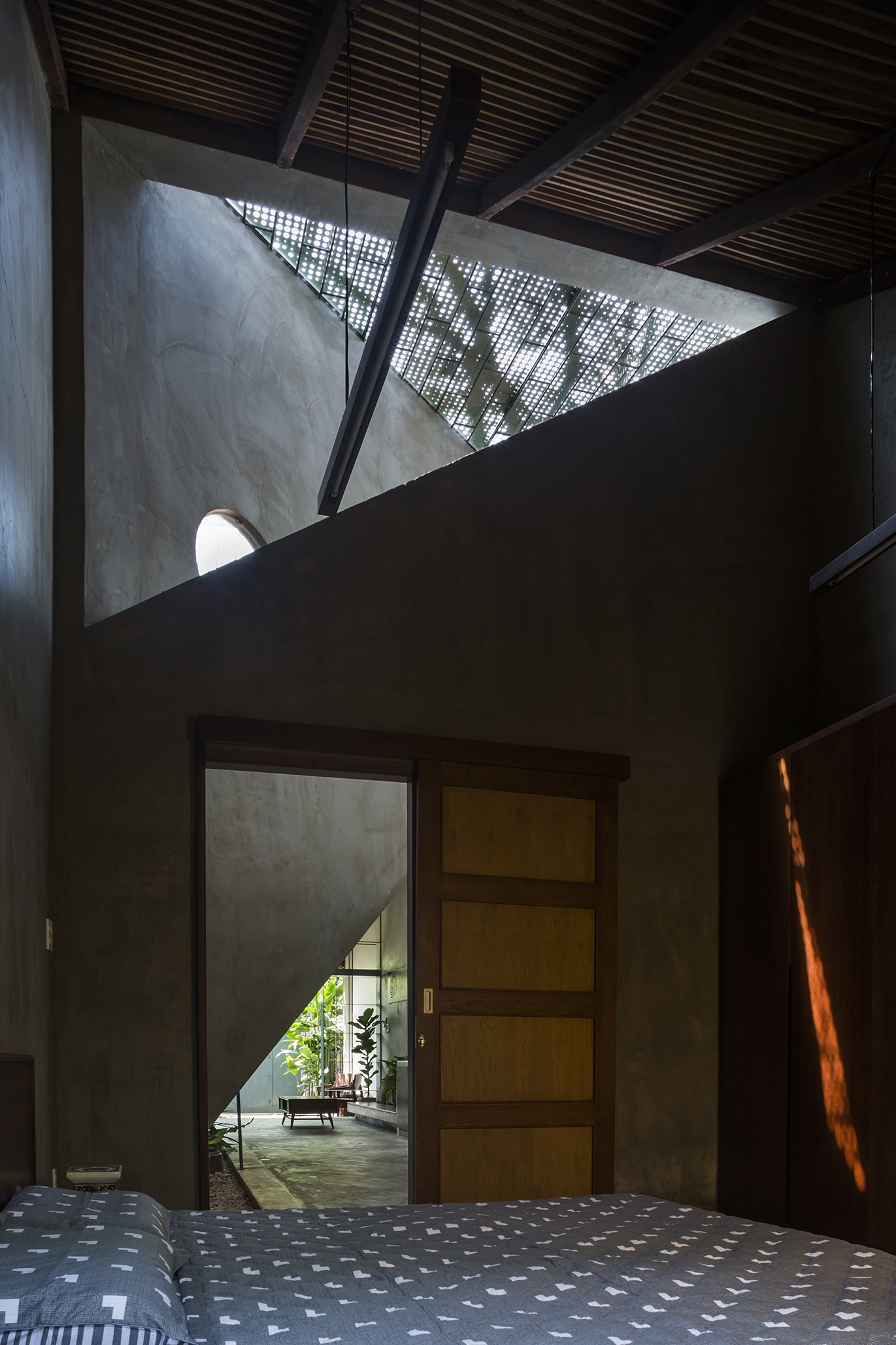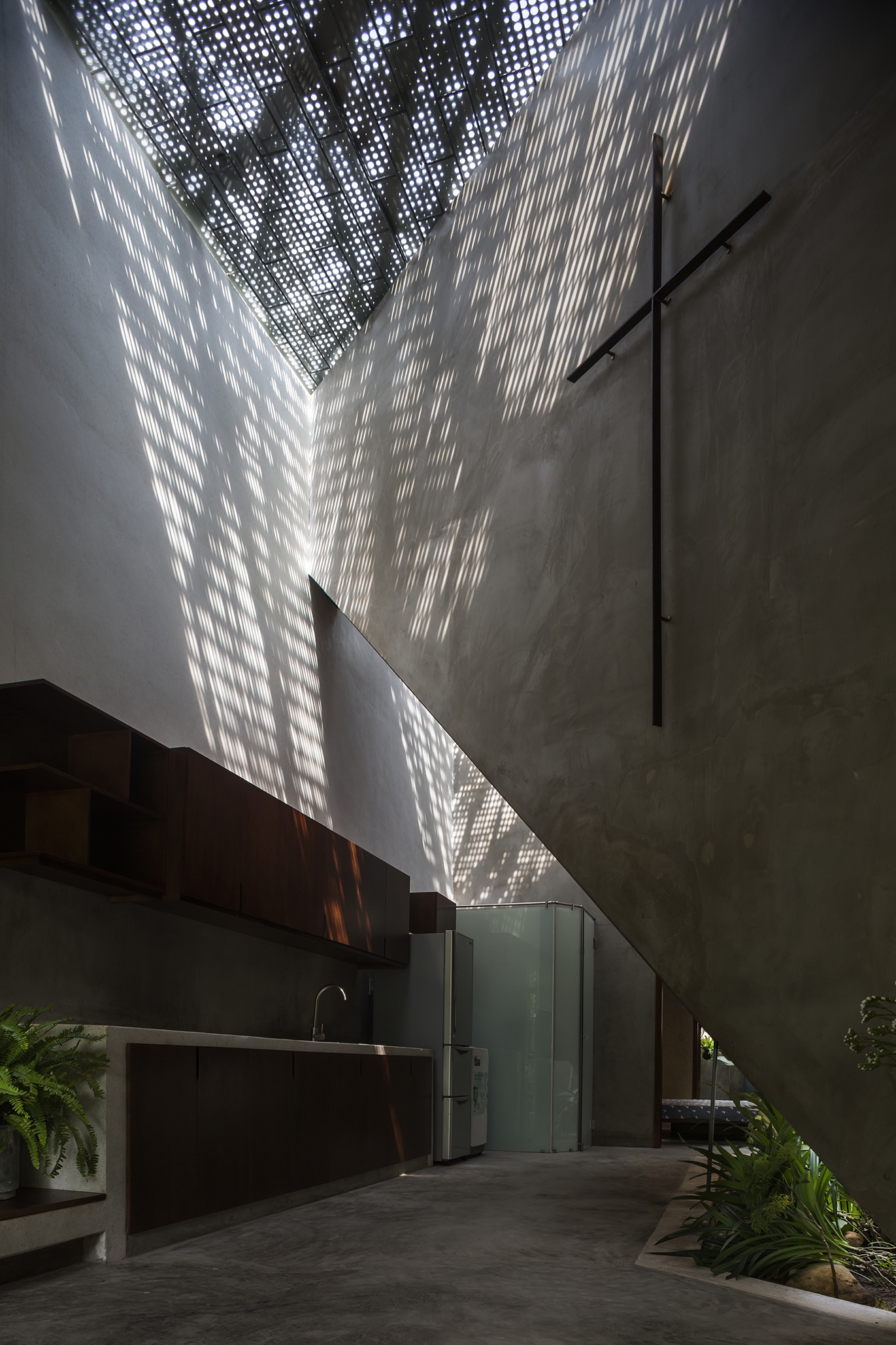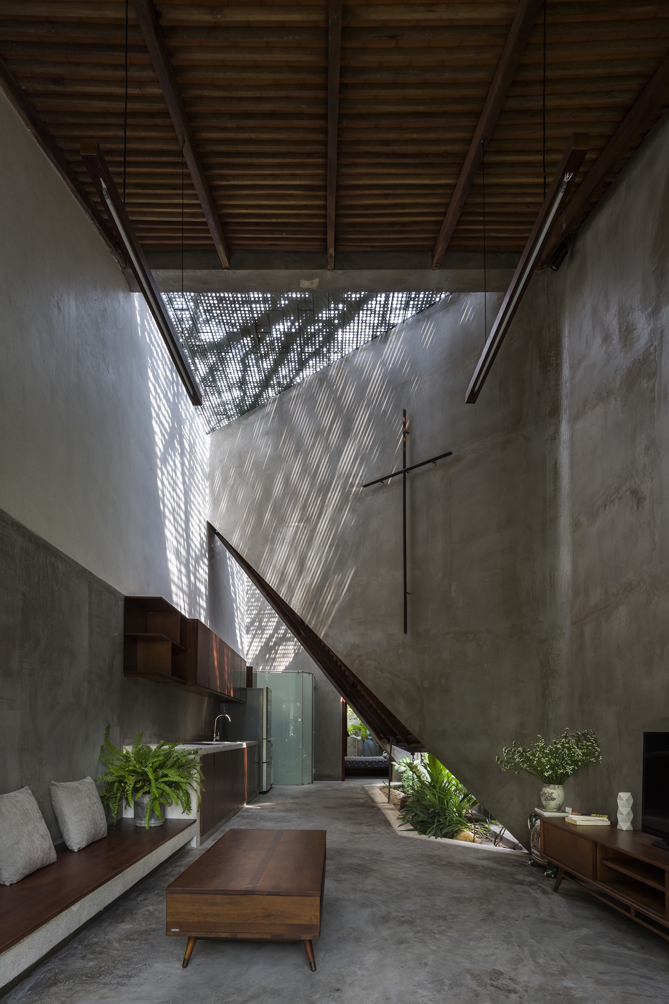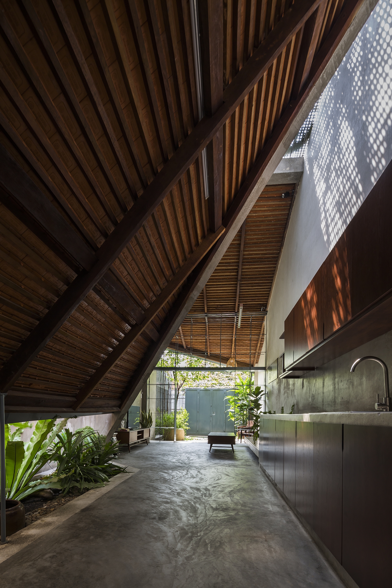 Door - in the overall space, we design only one main door to reach the house. The house is a seamless connection, there is no limit between home and garden - feeling freedom. We use the iron shelves as a way of positioning between the living room and the porch, but do not lose the ventilation. The kitchen space is separated by natural - light, combining a small garden with some vegetables for cooking. A small garden like a wind trap circulates the air to the house. The continuity is long, the bedroom is arranged at the end of the house combined with a garden, the room opens the window to the natural space.