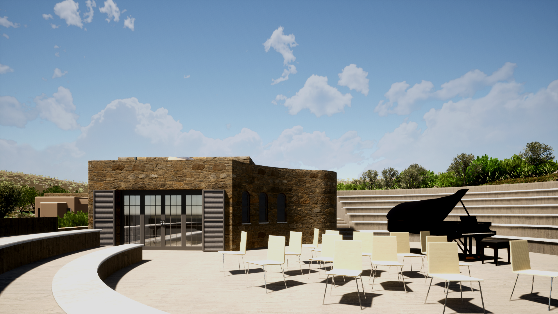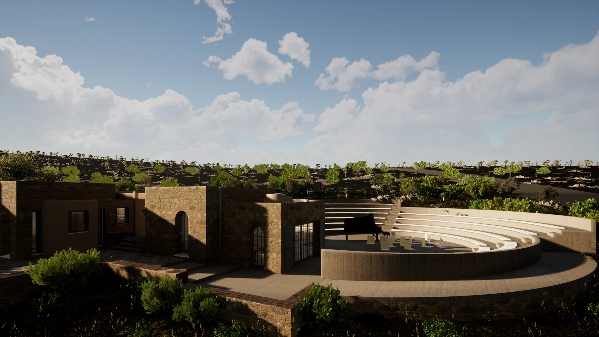 This project is about a proposal for the Koufonisia Classical Music Festival Complex located at Ano Koufonisi Island of the Cyclades islands Complex aiming at the cultural upgrade of the region. The Development consists of a circular Theater and Musical Stage along with its facilities and three small residences that host the musicians who participate at the event. The conceptualization of the project has been defined by the spatial reinterpretation of places that play a unique role in the history of Architecture and Cultural expression such as the Temple, the Theater, and the Residence.