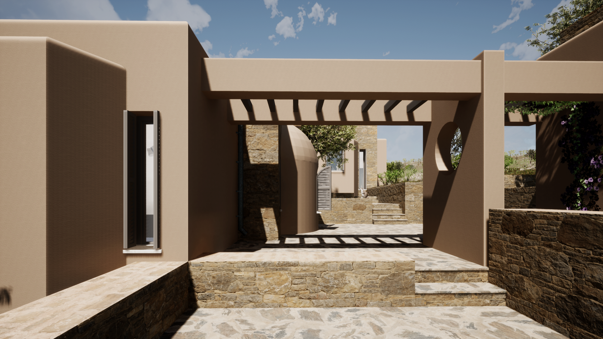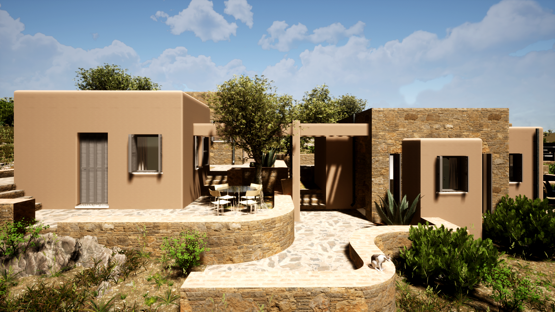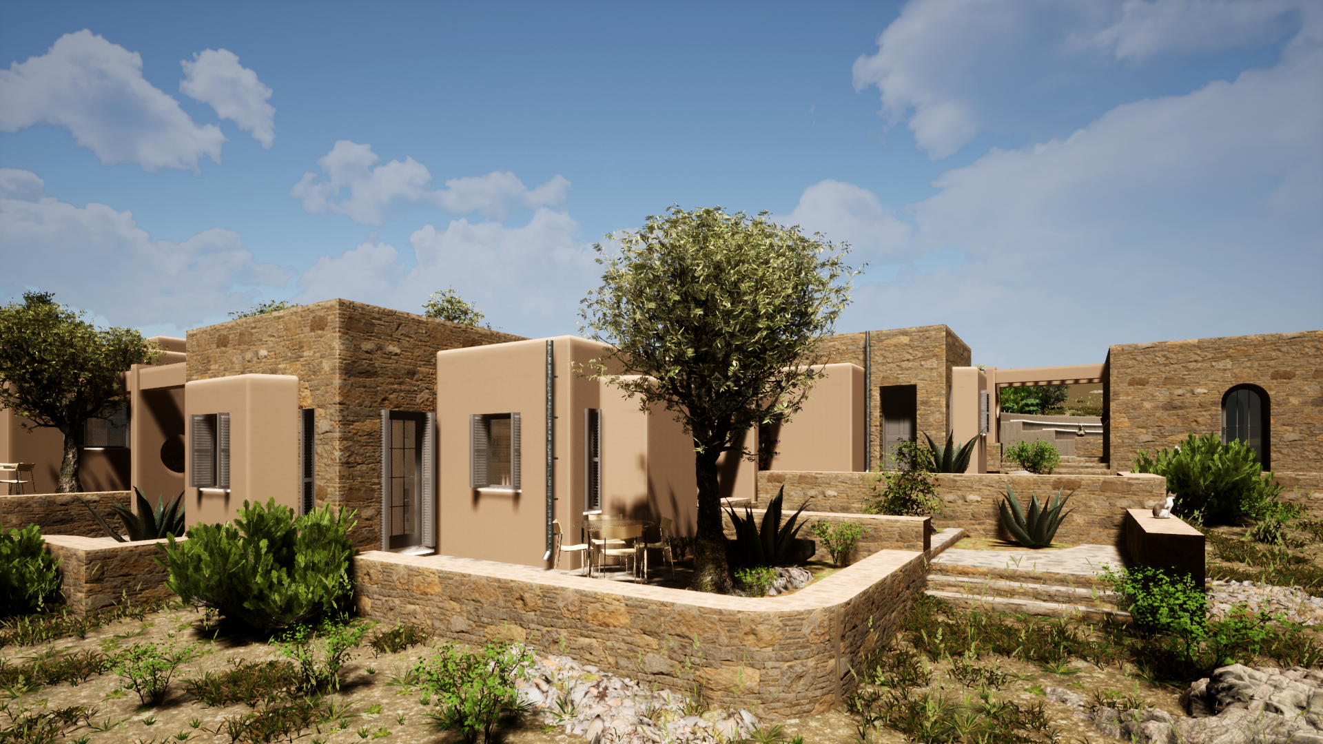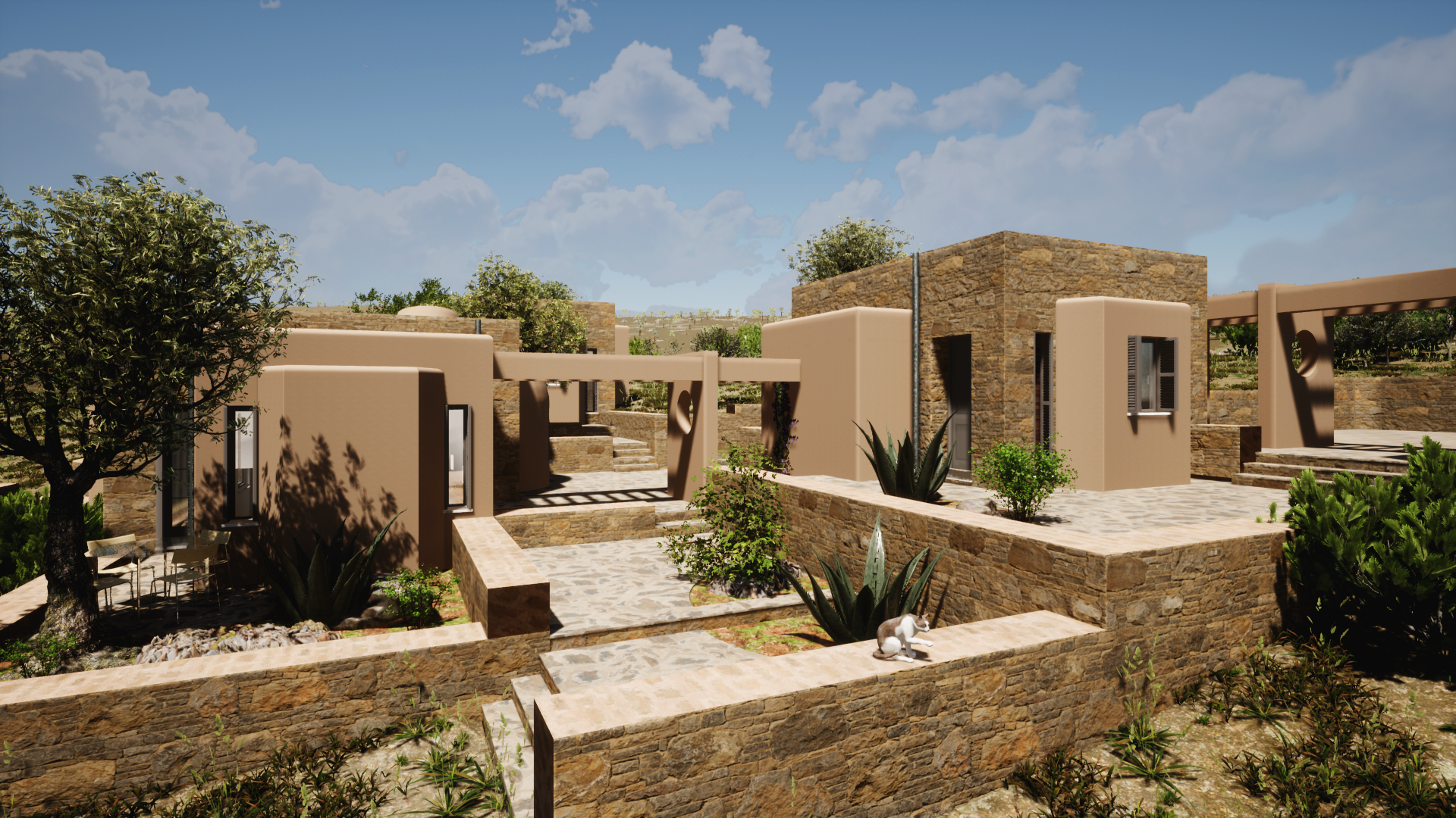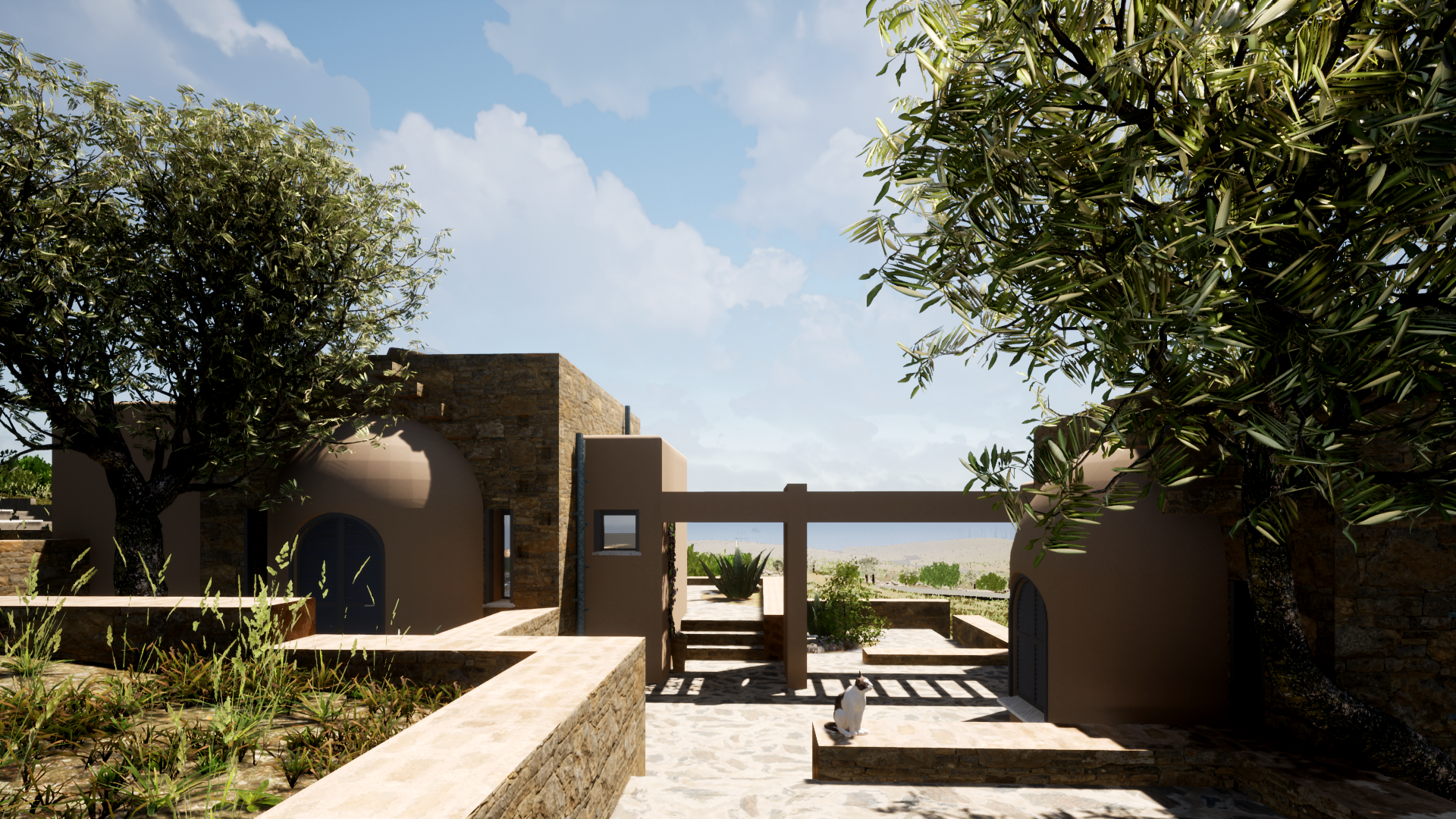 The Residences are composed around a central courtyard, which is dissolved in smaller private yards, each belonging to the corresponding residence. This arrangement enhance the communal living of the Residents and encourages social participation. The Theater has an advantageous location with regards to the unobstracted South views over the sea and the port of Koufonisi village.