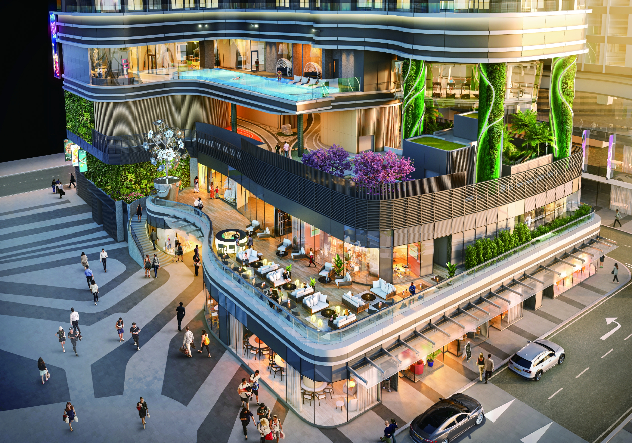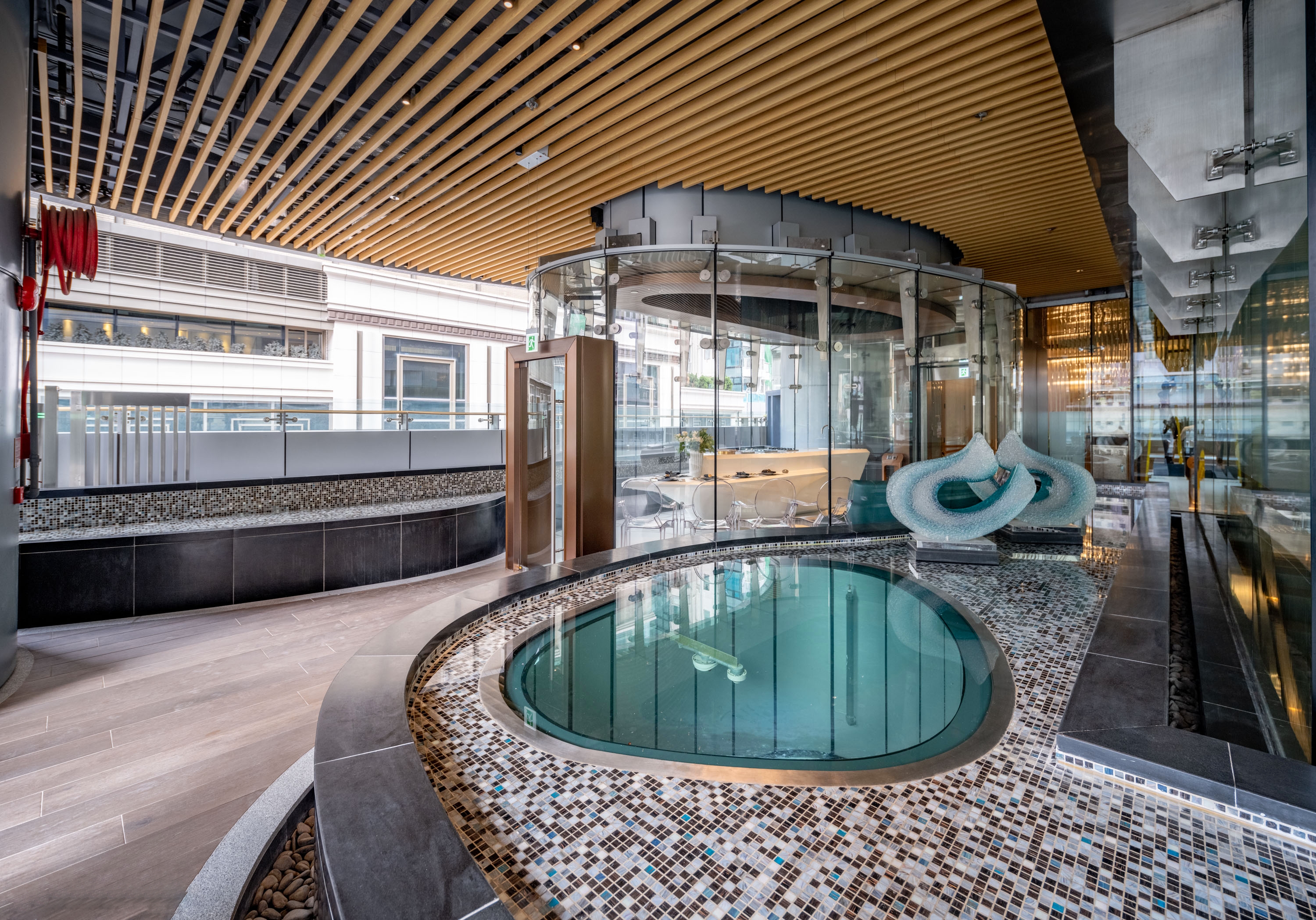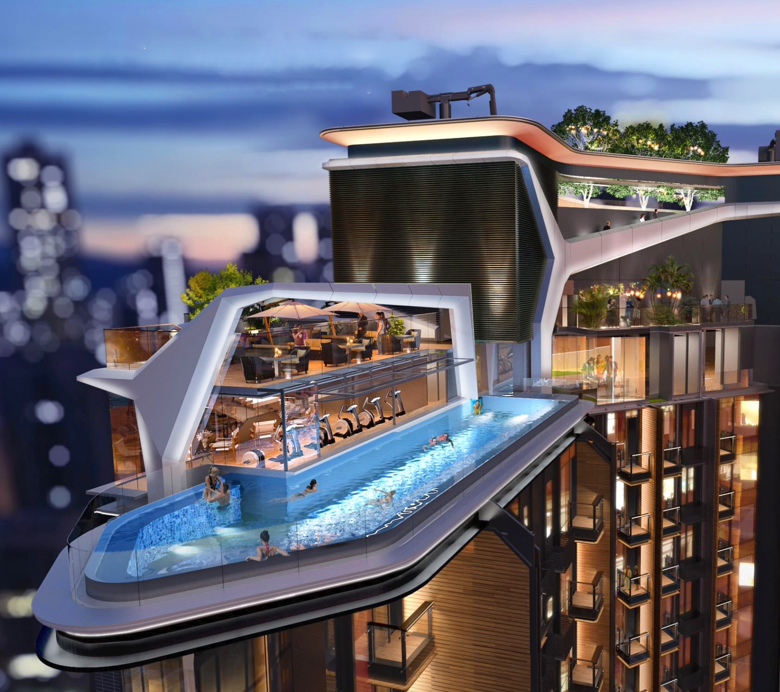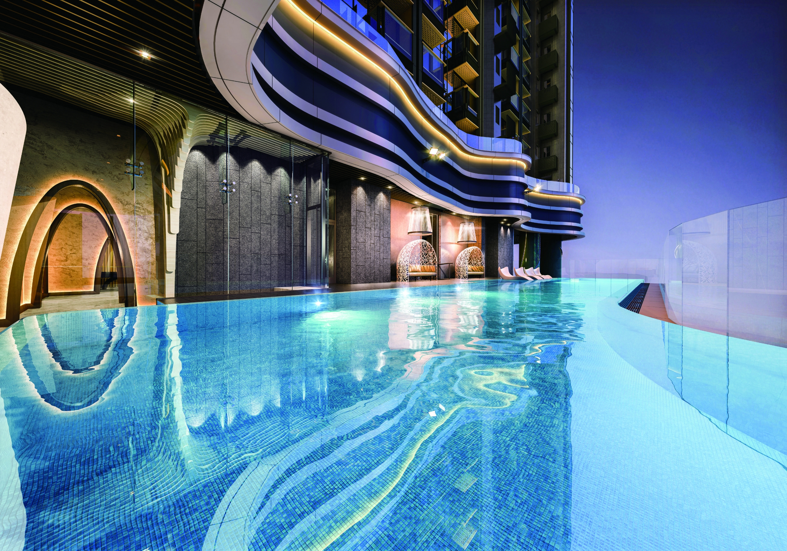 The second tower occupied, Cetus, has a clubhouse function room with clear glass panels for walls, by an outdoor swimming pool flanked by a green wall.