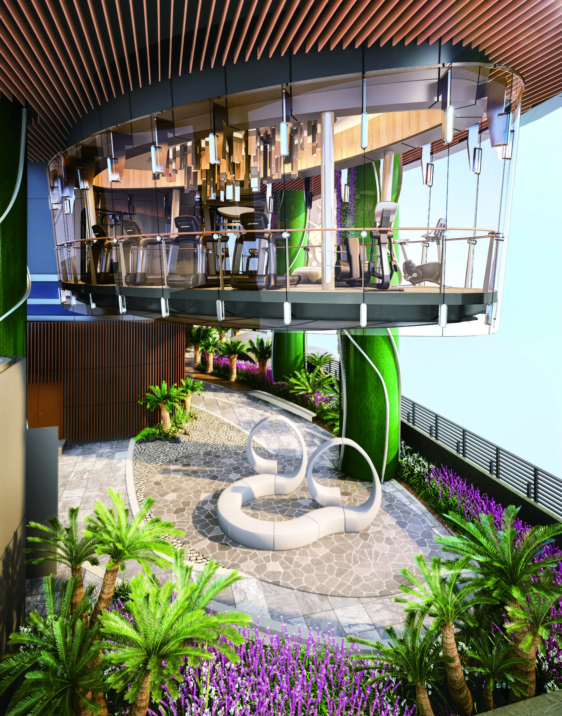 A focal point in recently launched Aquila is the Floating Gym, suspended from a transfer plate above the corridor and garden. From here, residents will be able to overlook the garden of neighbouring Site F.