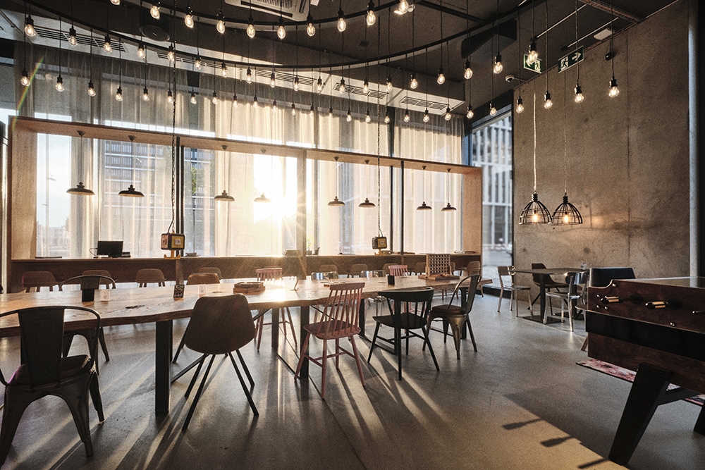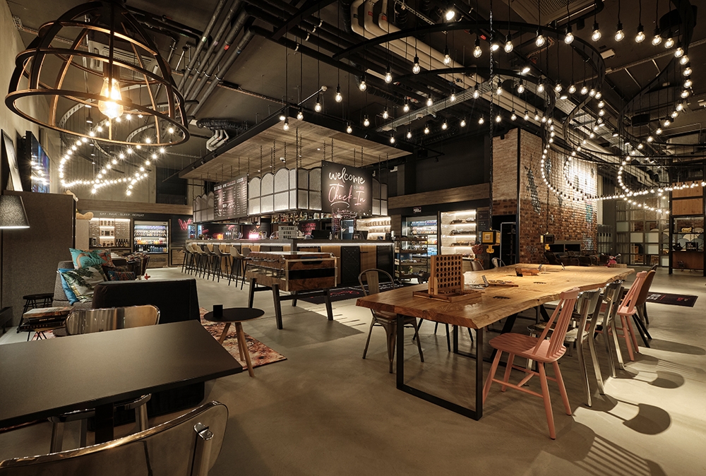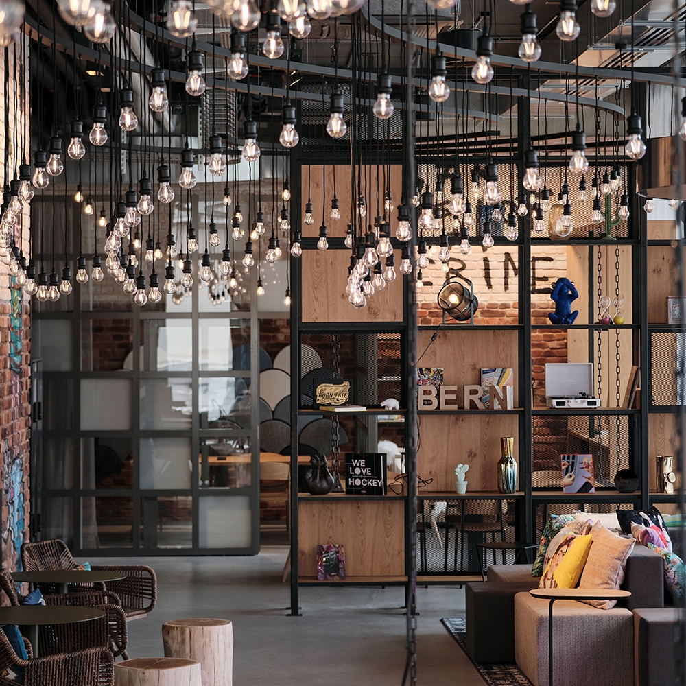 Inspired by the picturesque arches and alleyways of Bern’s old town, a UNESCO World Heritage Site, the Moxy’s design marries traditional highlights with modern interpretations. Clever illumination becomes the star of the show with radiant swathes of light suspended in a series of curves that move playfully through public spaces to cast a warm glow. This poetic feature evokes an evening walk under the starlit sky of the medieval quarter’s famed six-kilometre stretch of arcades, one of Europe’s largest covered shopping promenades.
