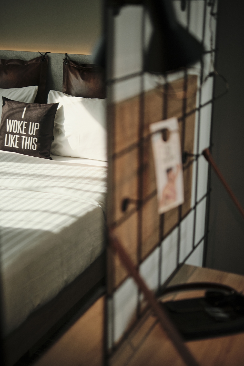The earthy, tone-on-tone palette of the guestrooms’ concrete walls, leather finishes, felt textiles and a back-to-basics peg wall form a calming antidote to the public areas’ vibe.