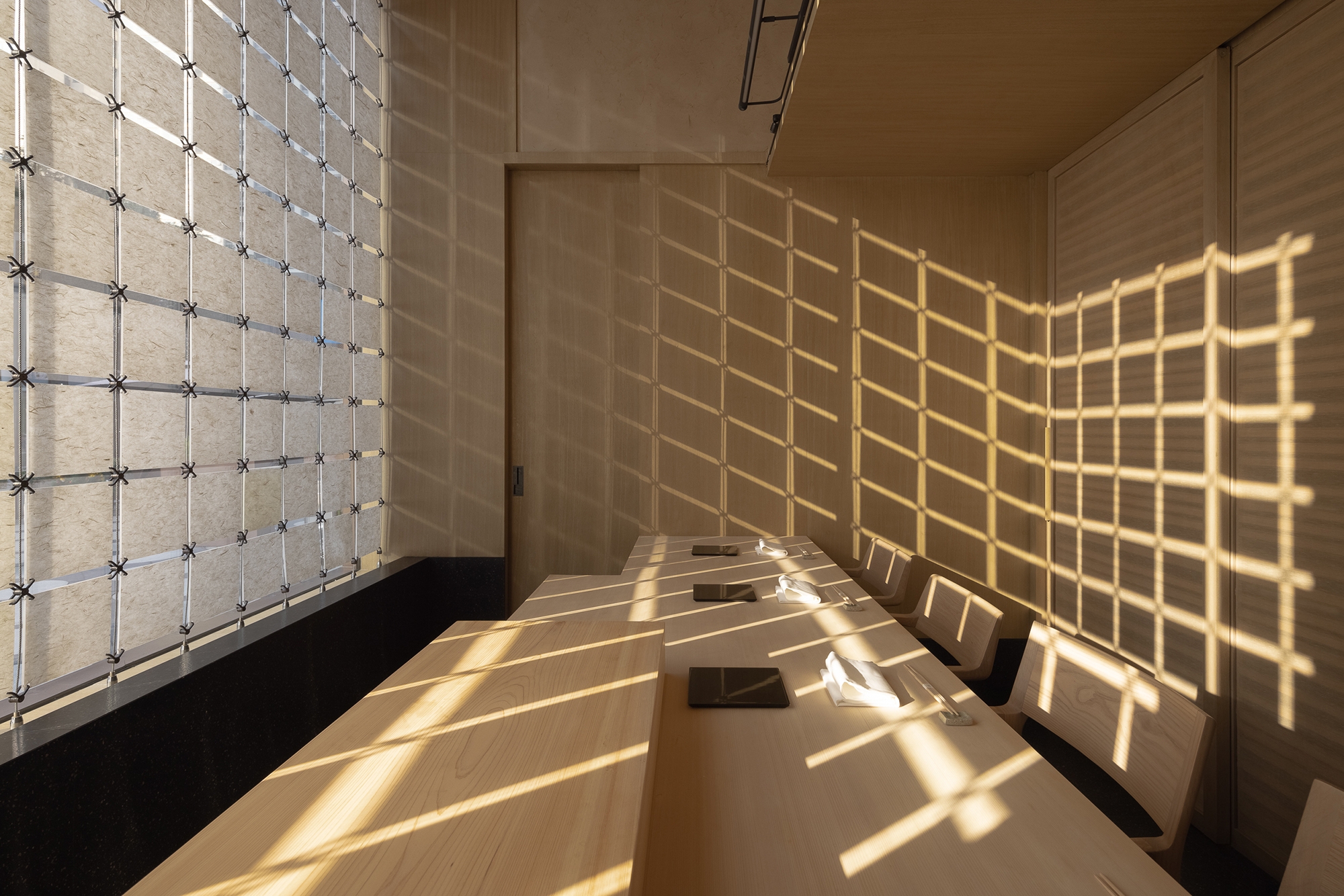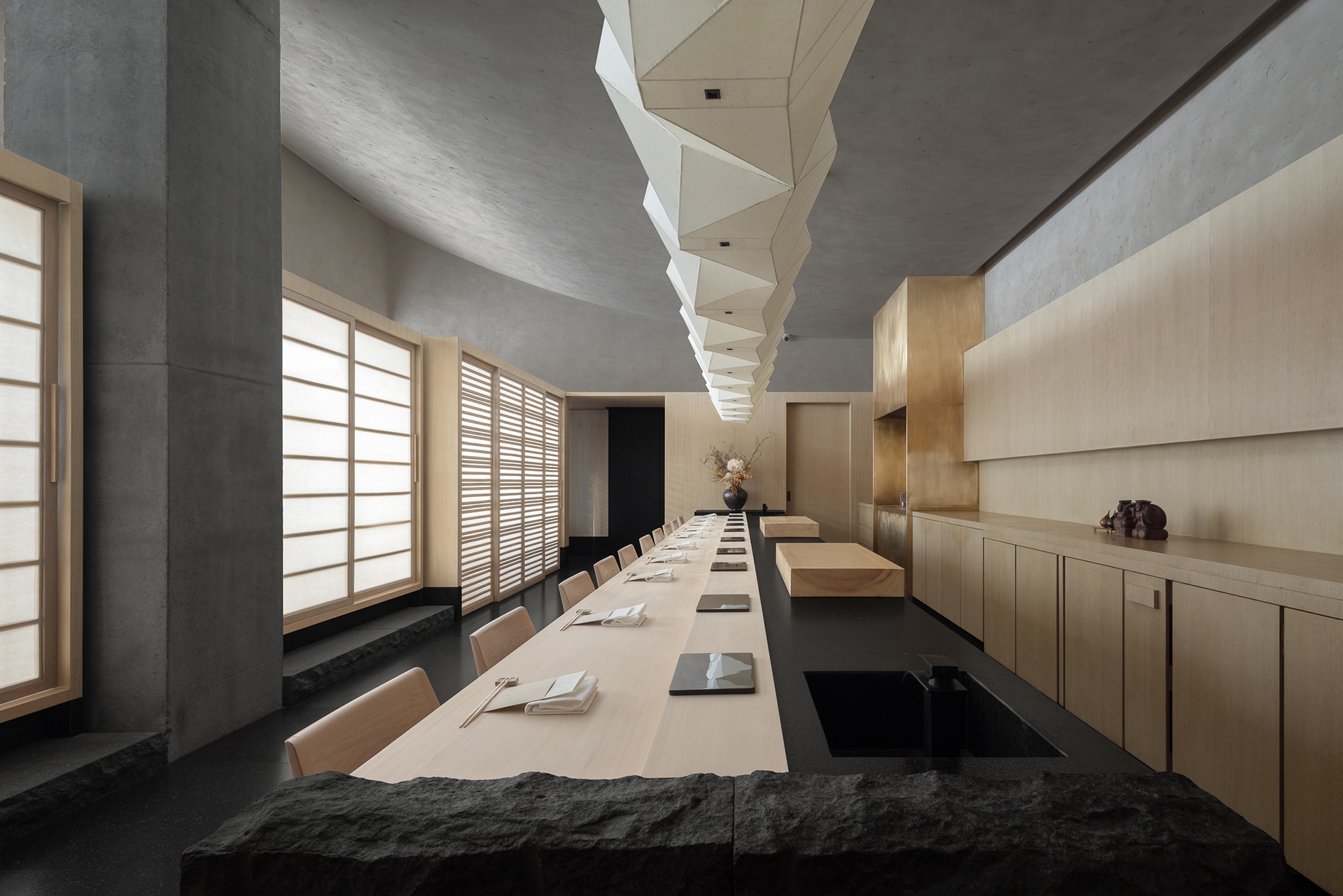 Shoku-tei Sushi, a Michelin-level Japanese cuisine brand, chose Shenzhen as the site for its first restaurant in Mainland China, and entrusted local design practice NATURE TIMES ART DESIGN to conceive the space. The brand commits to serving superior, delicate sushi to customers, and inherits the quintessence of the traditional craftsmanship of Edomae sushi. For the project, the design team tried to combine traditional Japanese cuisine with Oriental visual elements via modern design languages, intending to bring diners fabulous poetic experiences. Restaurant often bears the mission of offering a relaxing, sensitive, immersive and intimate environment to let people temporarily get away from the daily routine. This attribute determines that its spatial design shouldn't be merely restricted to create distinctive experiential consumption scenes for brands, but also needs to convey positive aesthetics and humanistic care to the public and return to the essence of life, especially in the post-pandemic era.