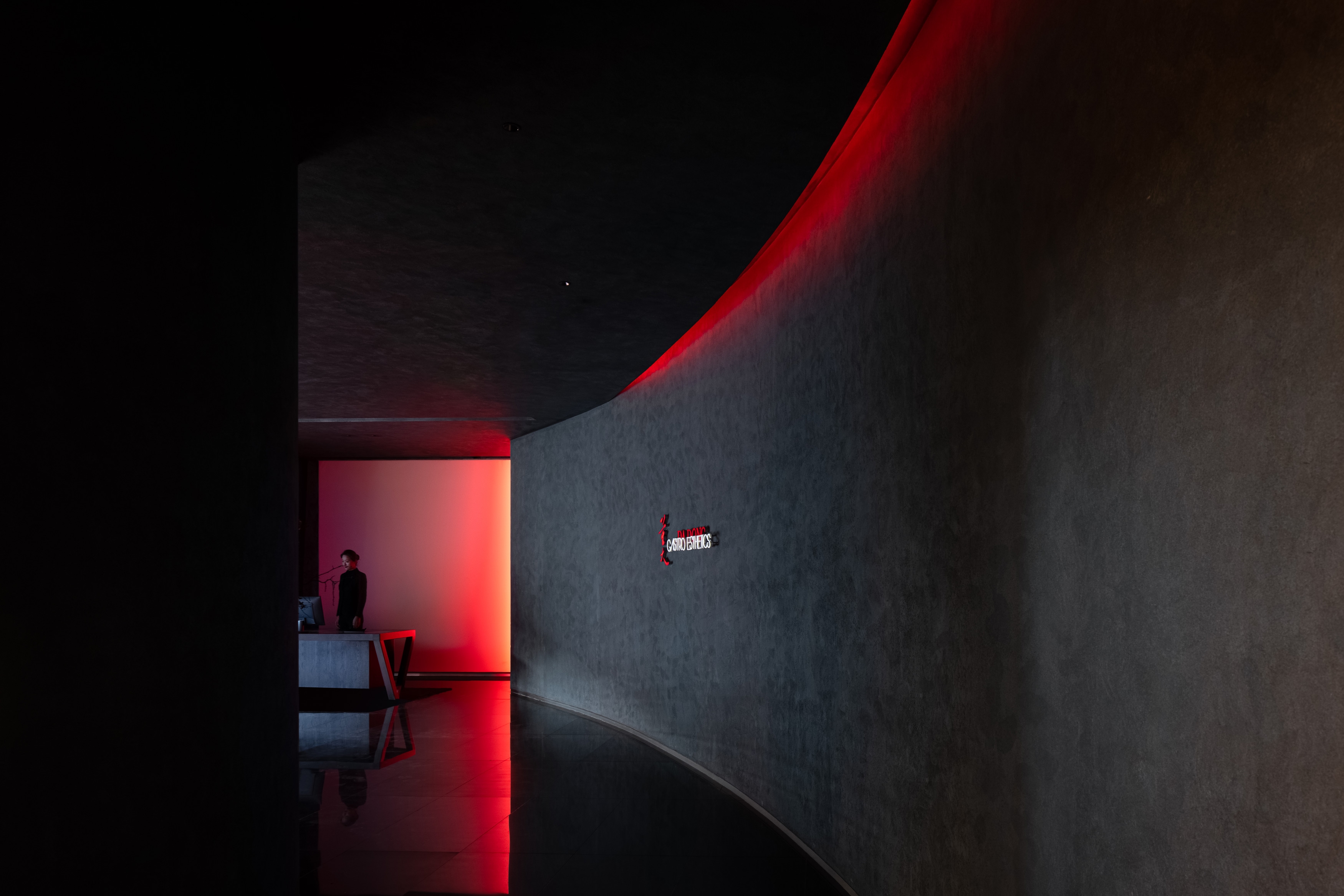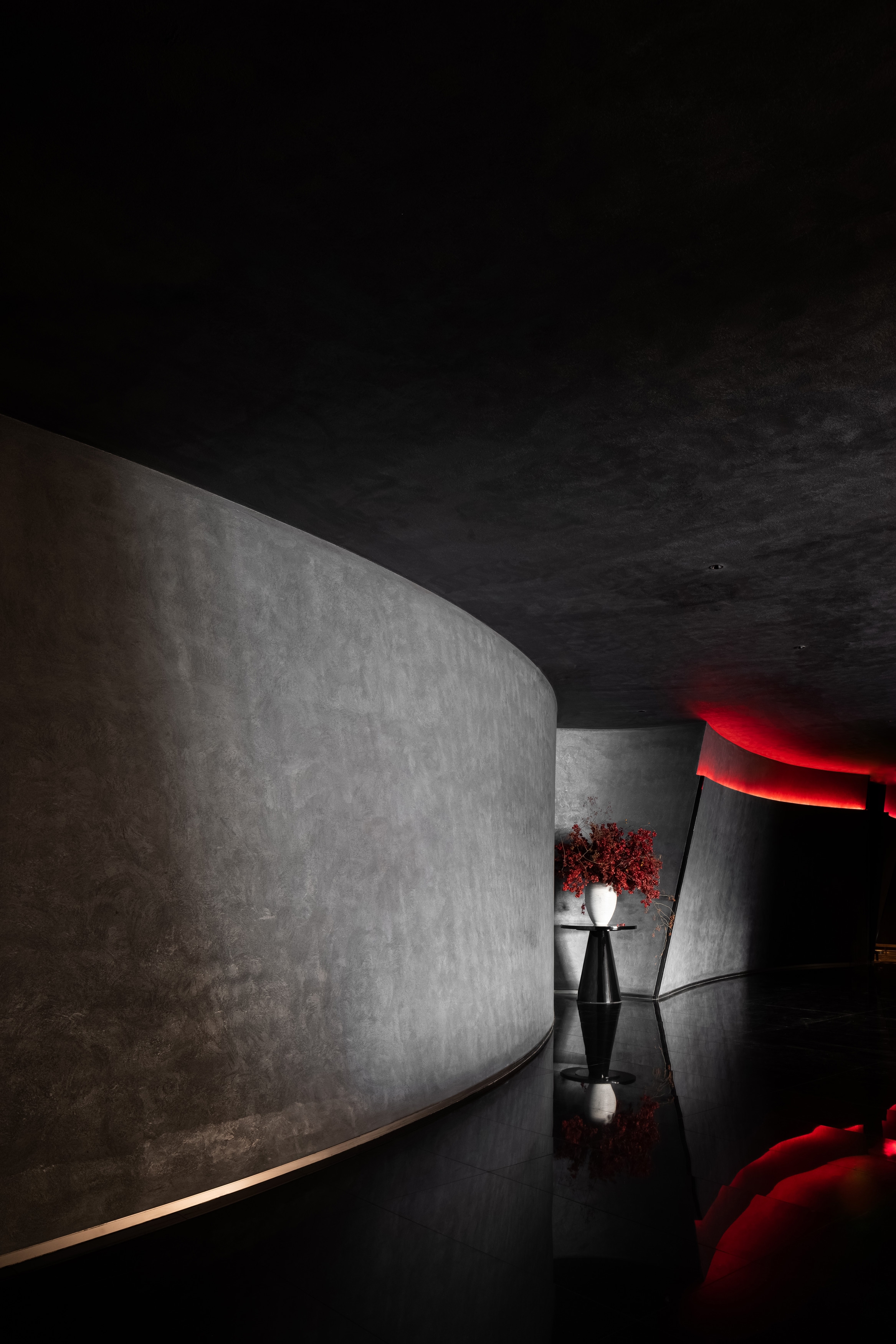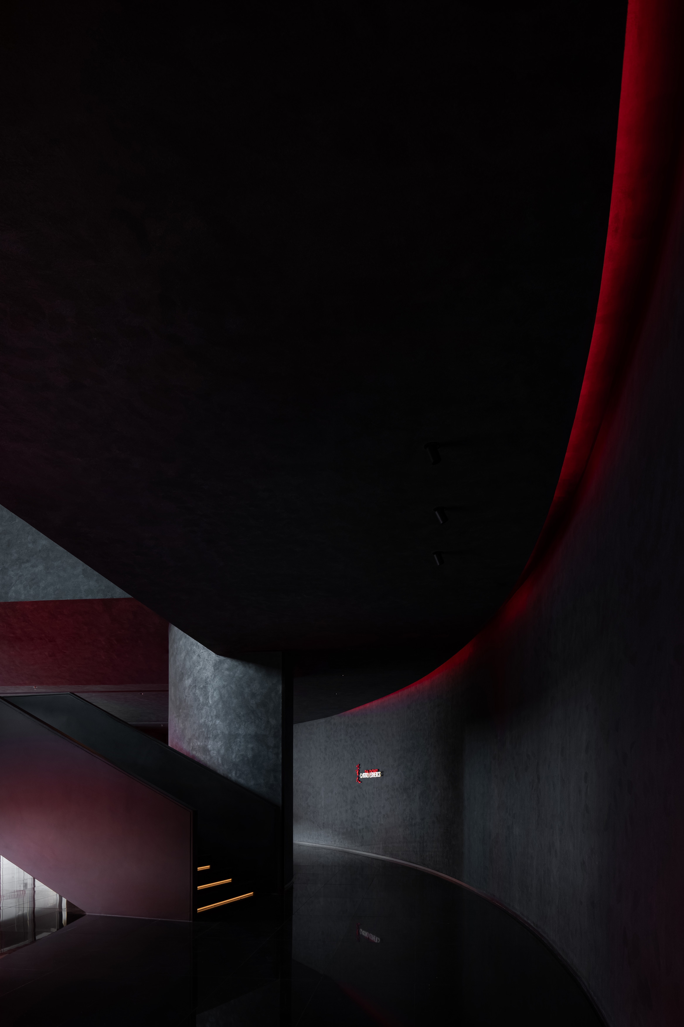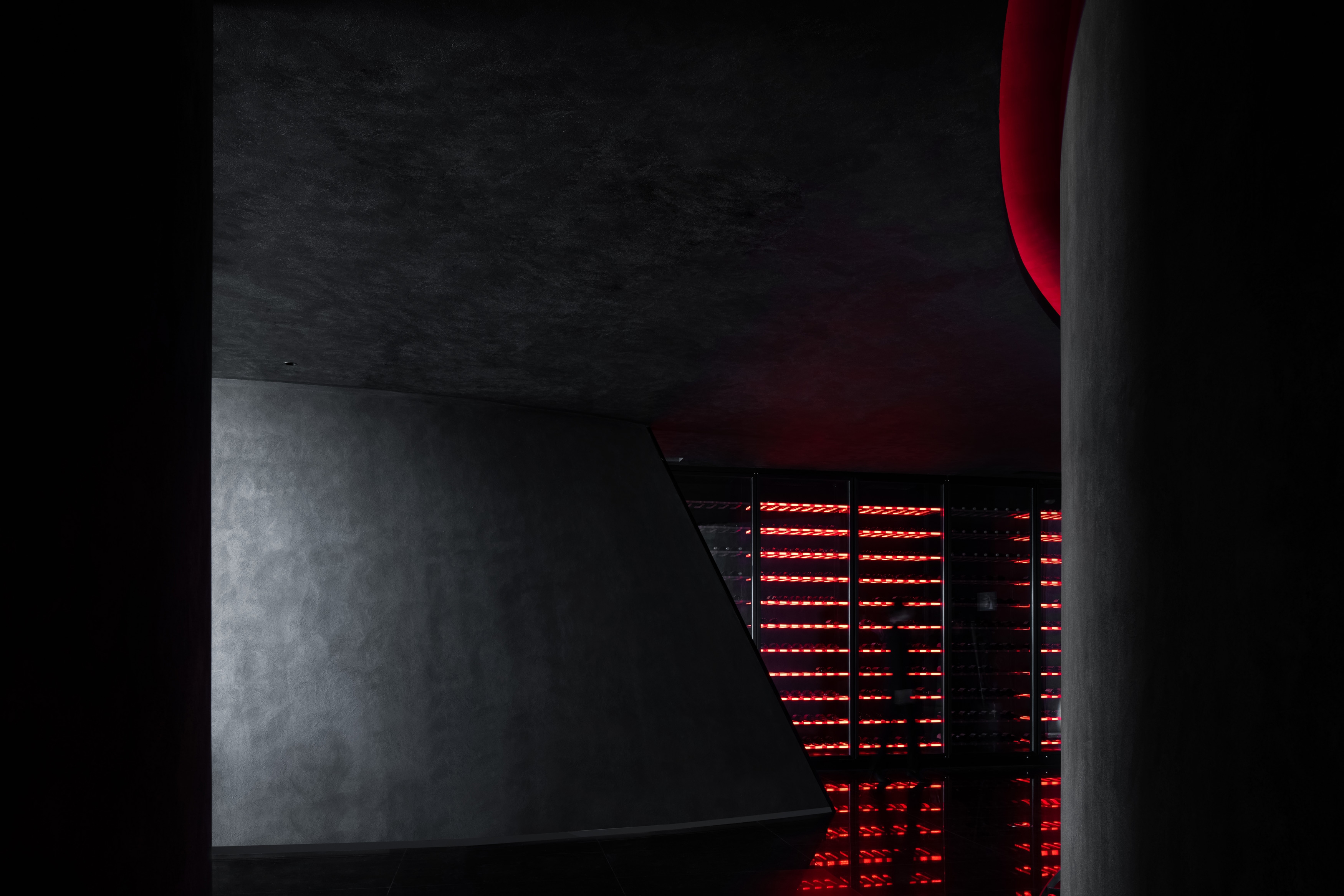 When people enter the entrance lobby, curved walls come into view and guide their lines of sight. The black sculpted staircase becomes the visual focus of the space. The structural column at the bottom of staircase utilizes glowing red acrylic, effectively floating the stair structure and keeping the form intact. Red wine cabinet and central service bar area become features of the lobby.