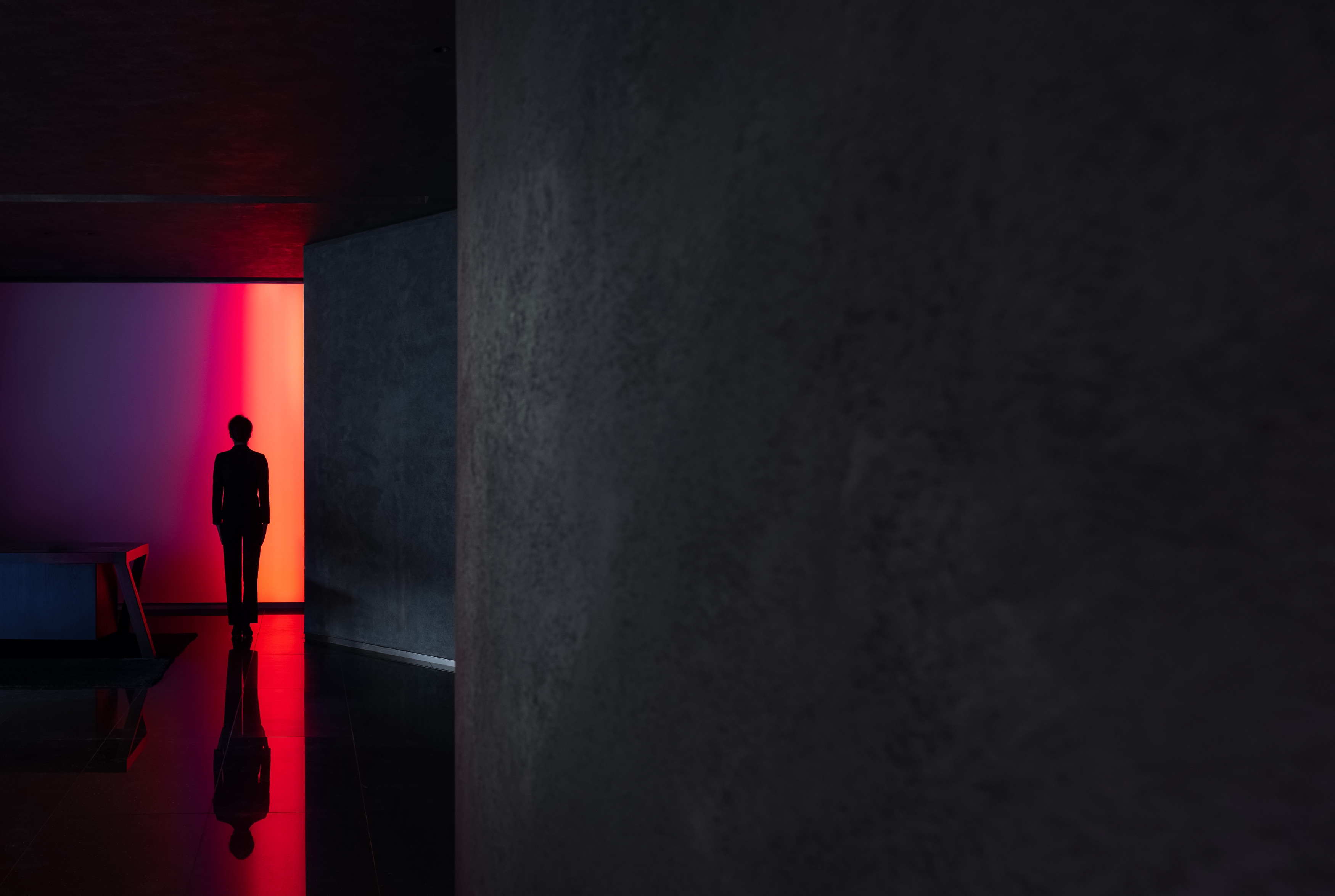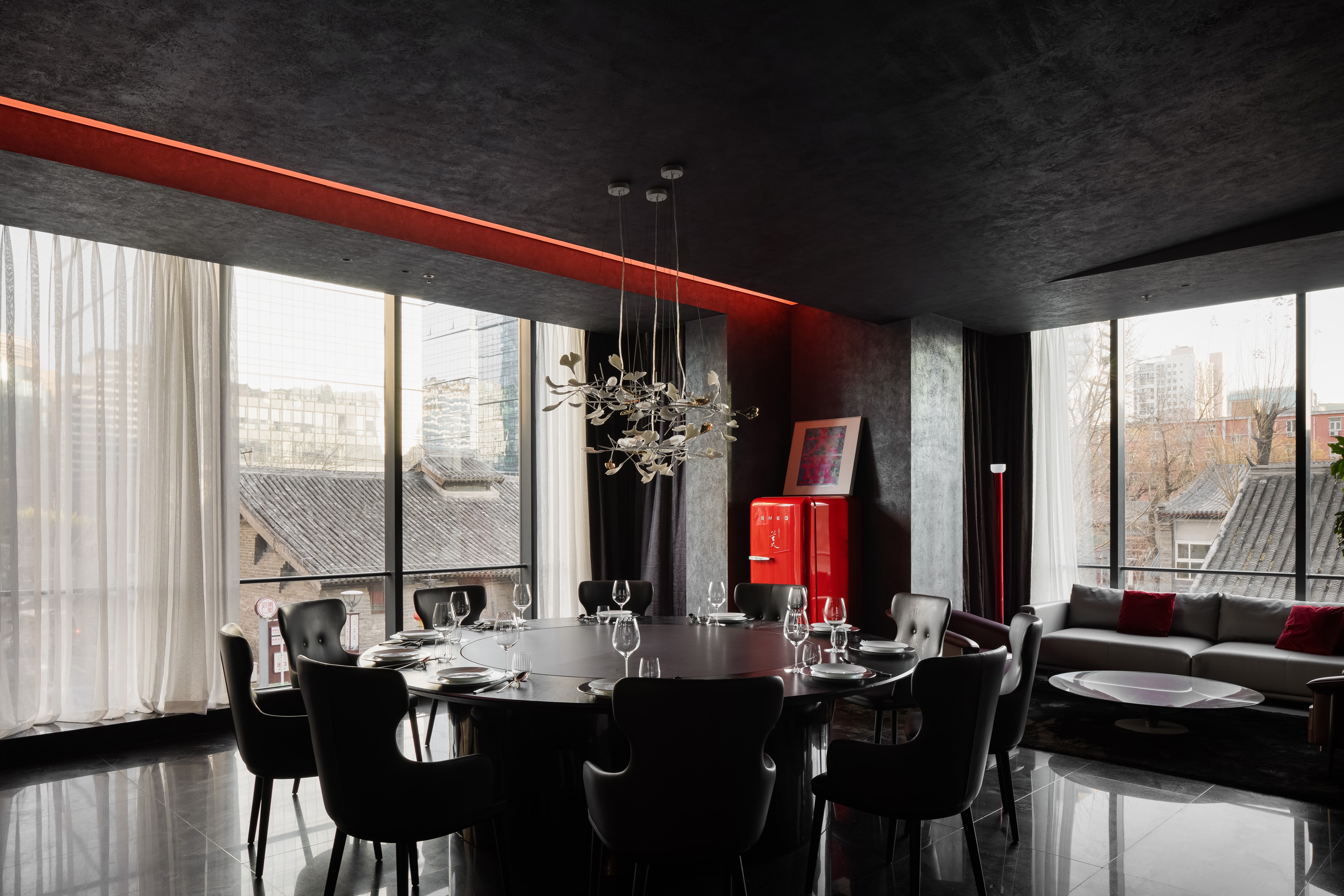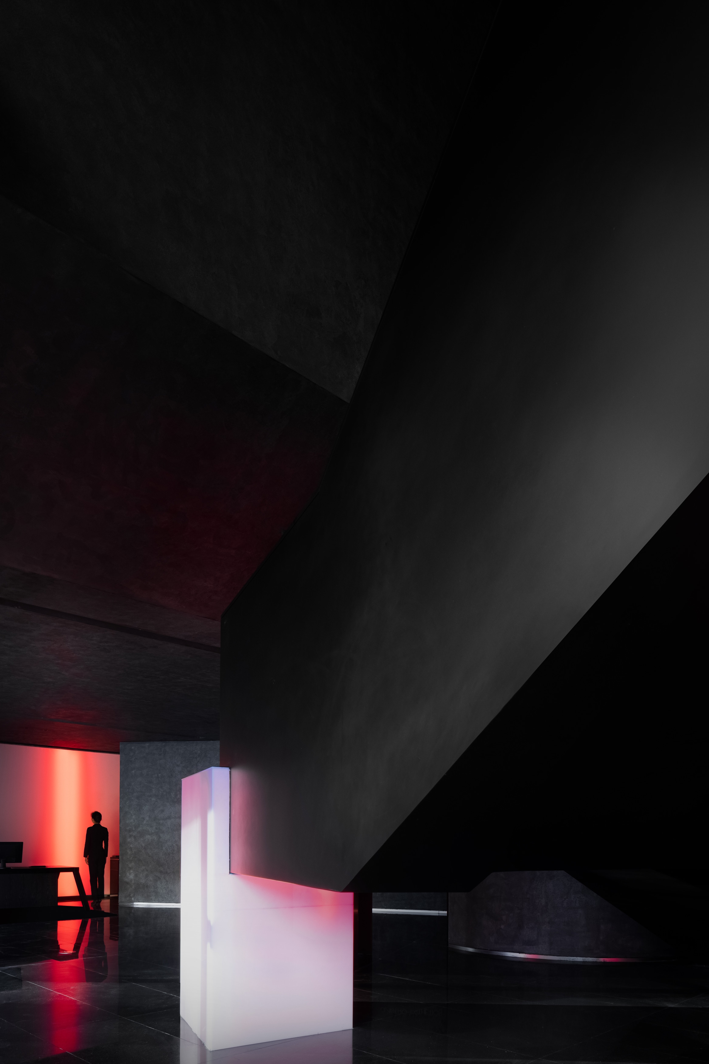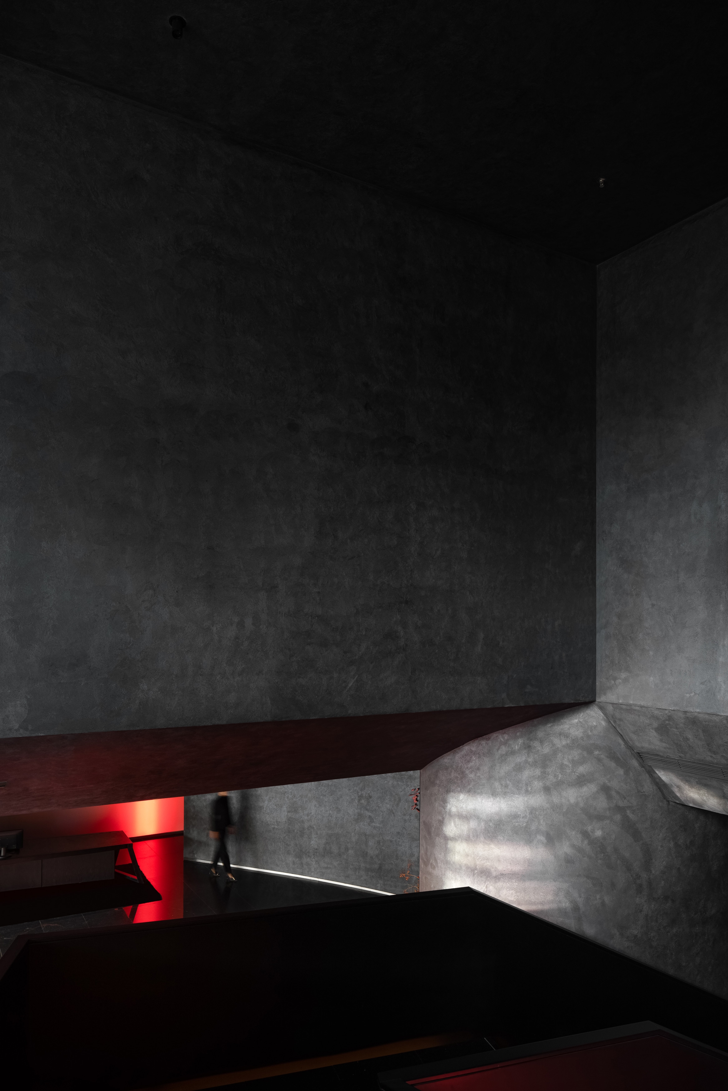 When people enter the entrance lobby, curved walls come into view and guide their lines of sight. The black sculpted staircase becomes the visual focus of the space. The structural column at the bottom of staircase utilizes glowing red acrylic, effectively floating the stair structure and keeping the form intact. Red wine cabinet and central service bar area become features of the lobby.