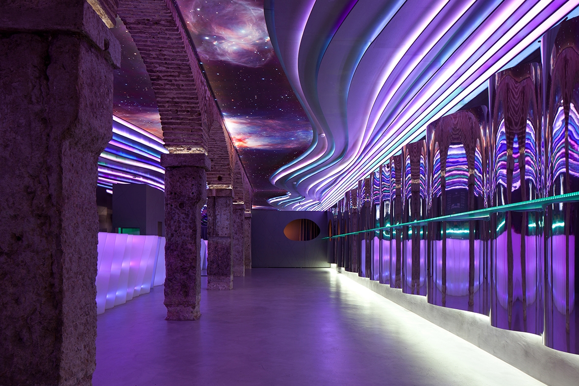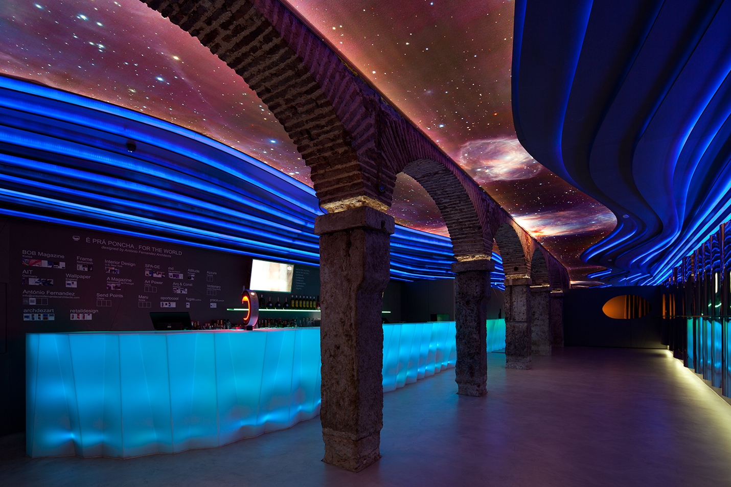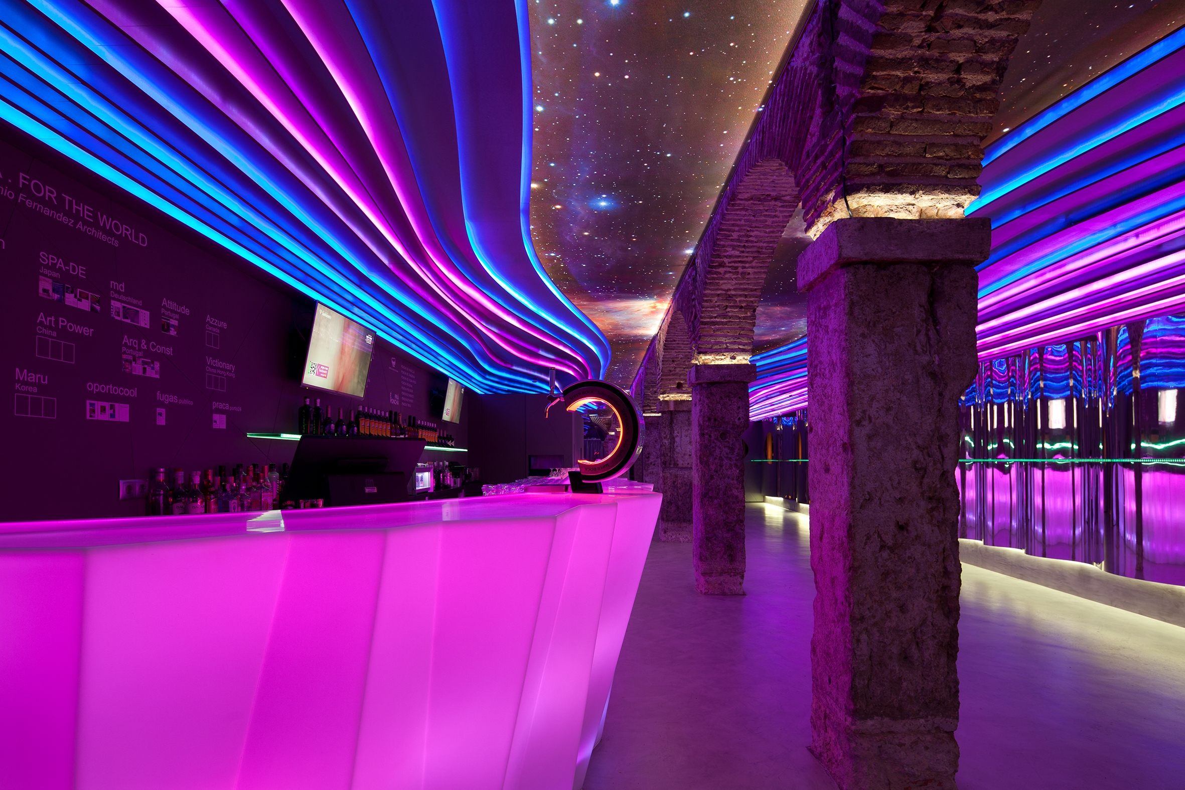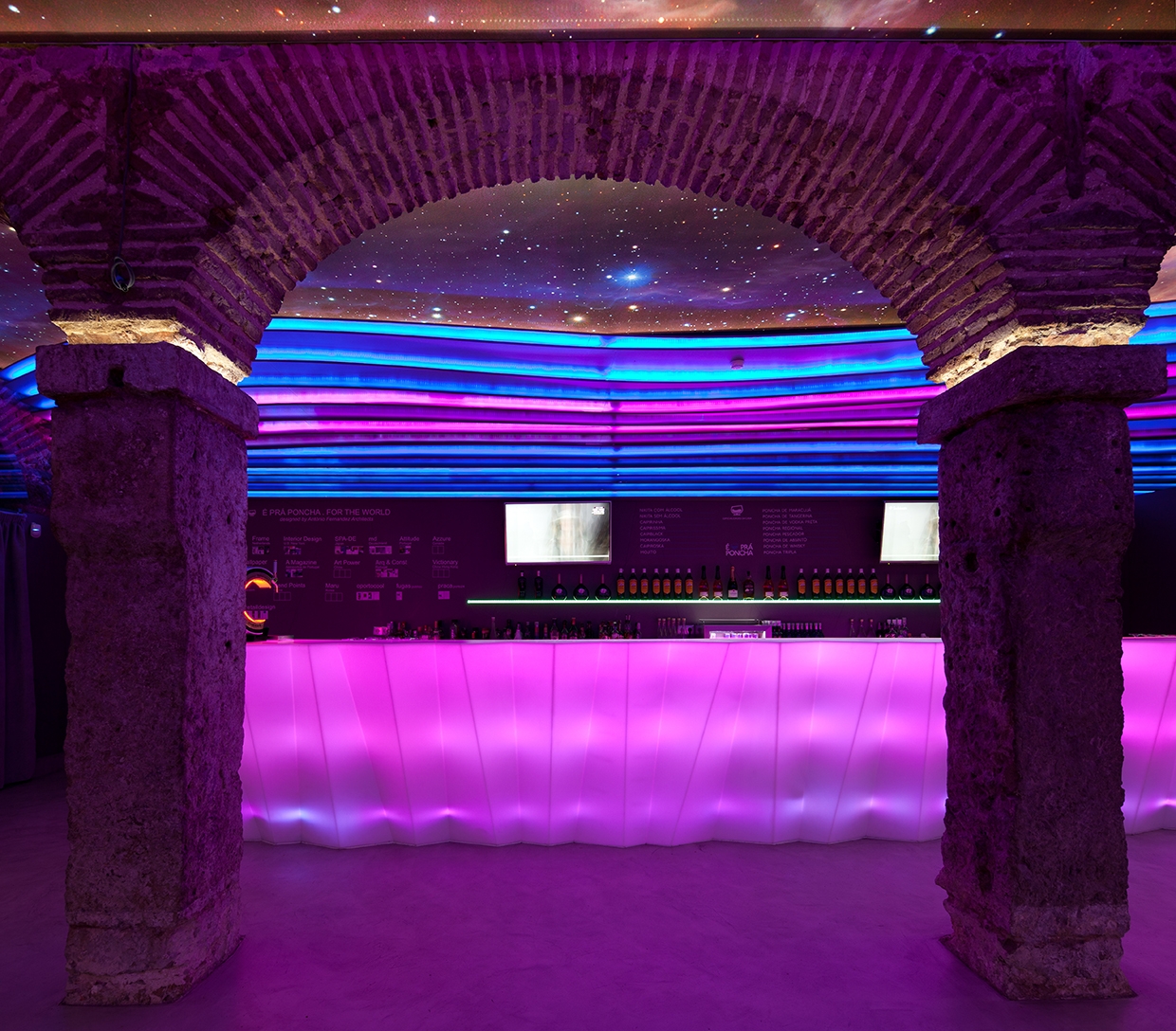 The BAR NUMBER TWO - É PRÁ PONCHA emerges out of respect for its heritage, the desire to interpret it, to unify the Lisbon / Porto designs, and also to attempt to create something genuine. Here the space opens up onto the main room where the central arches and stone pillars, full of history, worn by time and the use of chains that shackled the prisoners, are a strong presence. Now it is the metal trays which are supported by the pillars and people lean on these old stones, not hopelessly, but comforting themselves with a good glass of punch. Thus, the formerly cloistered and cold space of yore gains new life. The strata of coloured panels on the ceiling snake through the space, energizing it and creating a variety of emotions: colour, life, fruit, movement and escape are represented here. On the other hand, dreams, hope and freedom are in the heavens, that is, in the ceiling where the backlit screen helps to create an optical illusion. The stone archway holding us firmly on the ground seems to extend into the void and, in the end, the inside is outside! The illusion flows over the space as an enclosed shell, entrancing it.