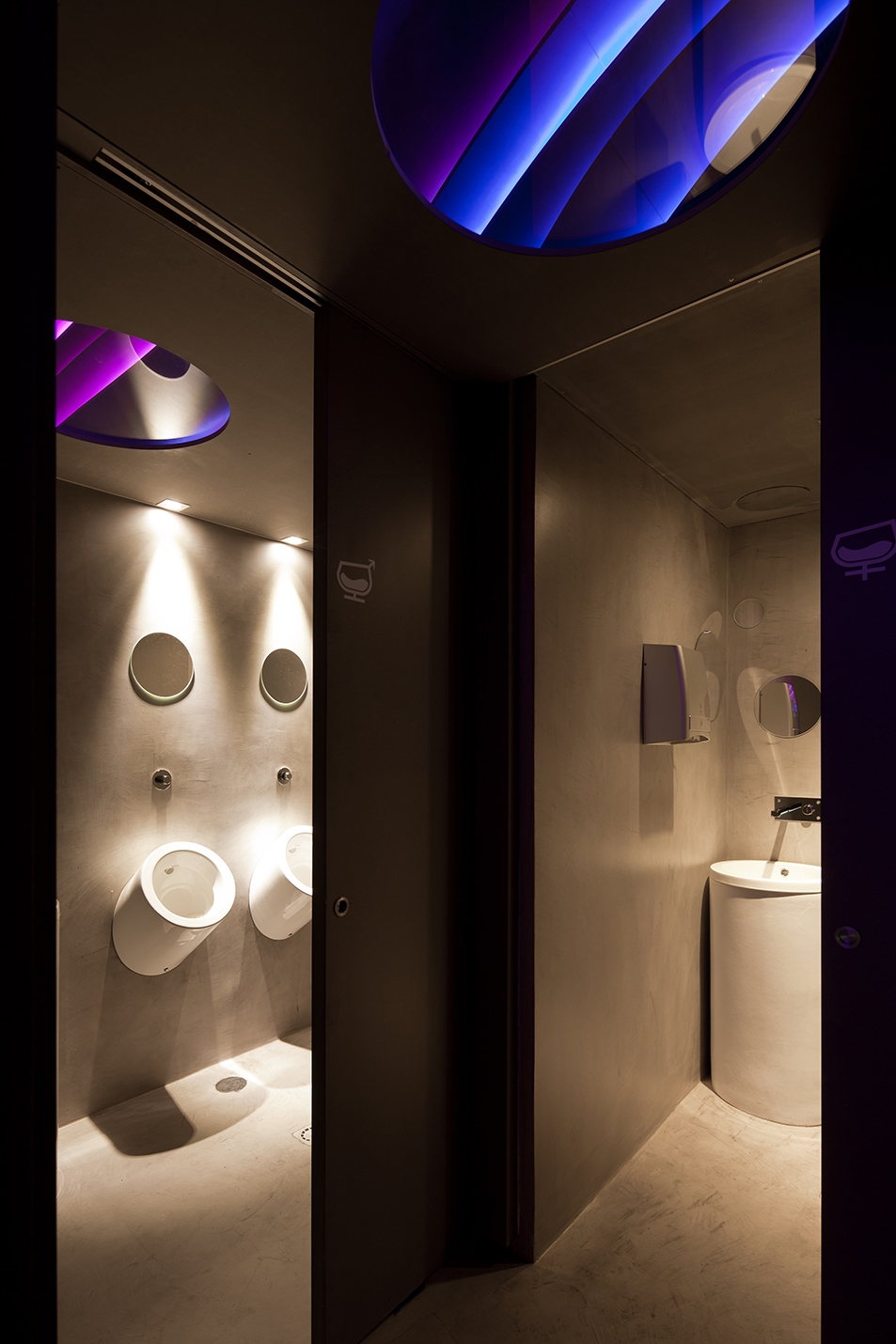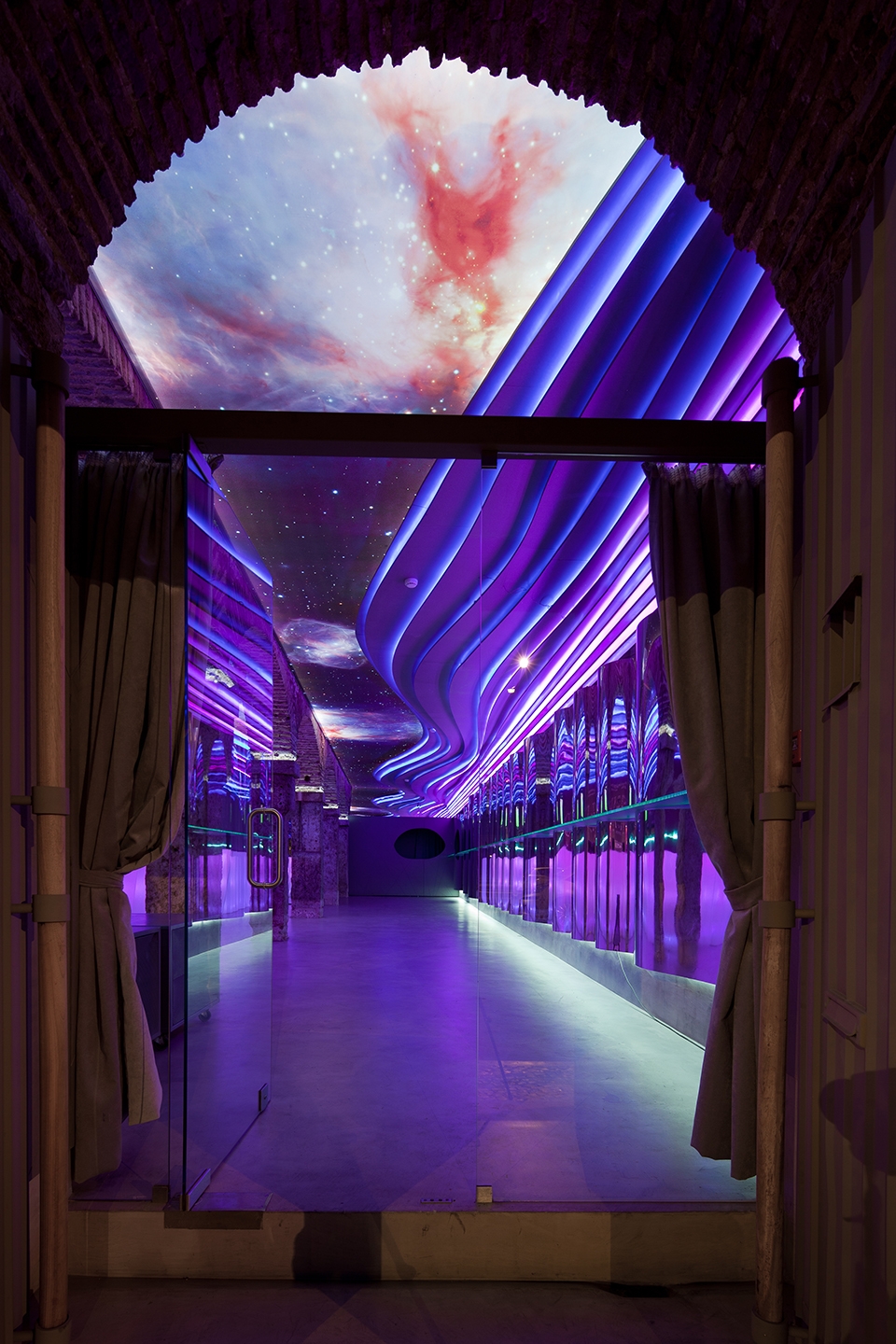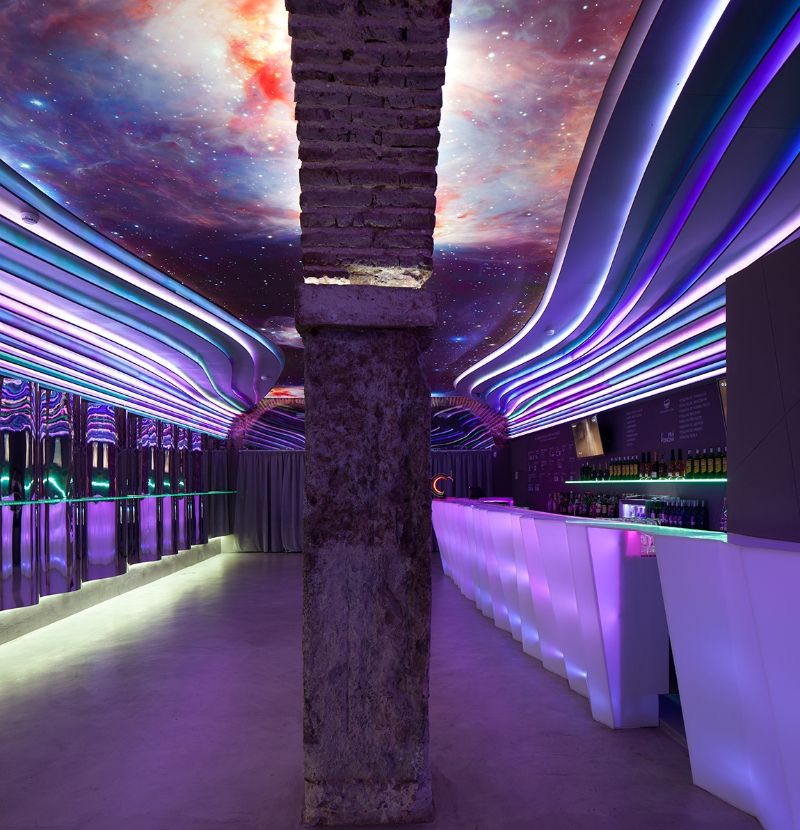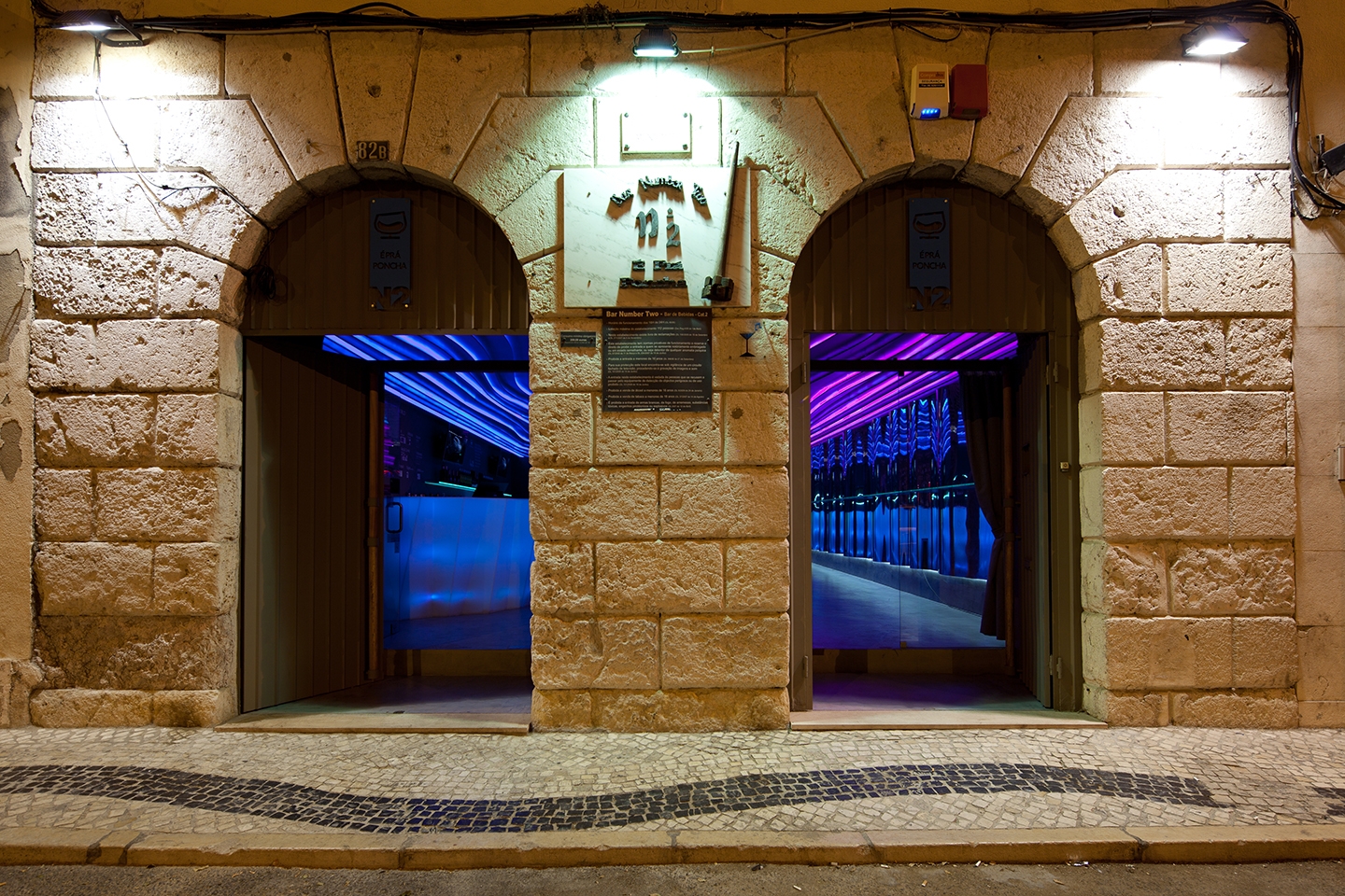 The BAR NUMBER TWO - É PRÁ PONCHA emerges out of respect for its heritage, the desire to interpret it, to unify the Lisbon / Porto designs, and also to attempt to create something genuine. Here the space opens up onto the main room where the central arches and stone pillars, full of history, worn by time and the use of chains that shackled the prisoners, are a strong presence. Now it is the metal trays which are supported by the pillars and people lean on these old stones, not hopelessly, but comforting themselves with a good glass of punch. Thus, the formerly cloistered and cold space of yore gains new life. The strata of coloured panels on the ceiling snake through the space, energizing it and creating a variety of emotions: colour, life, fruit, movement and escape are represented here. On the other hand, dreams, hope and freedom are in the heavens, that is, in the ceiling where the backlit screen helps to create an optical illusion. The stone archway holding us firmly on the ground seems to extend into the void and, in the end, the inside is outside! The illusion flows over the space as an enclosed shell, entrancing it.