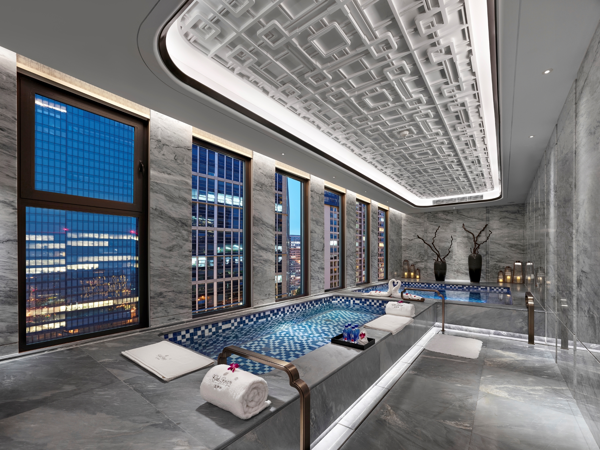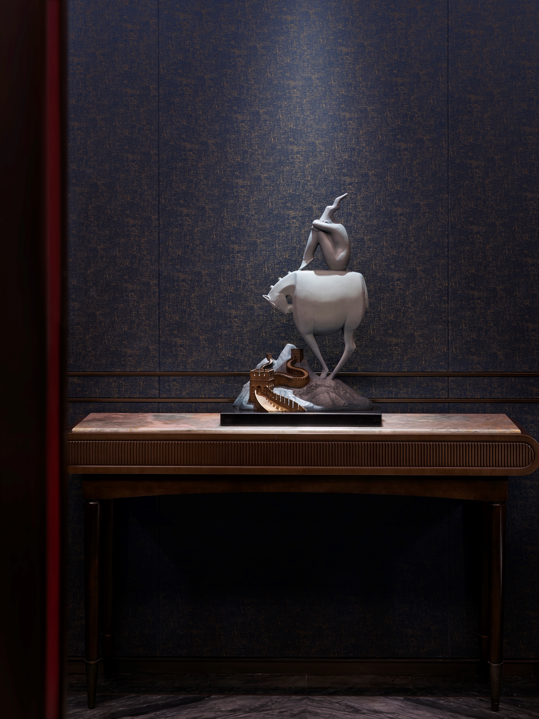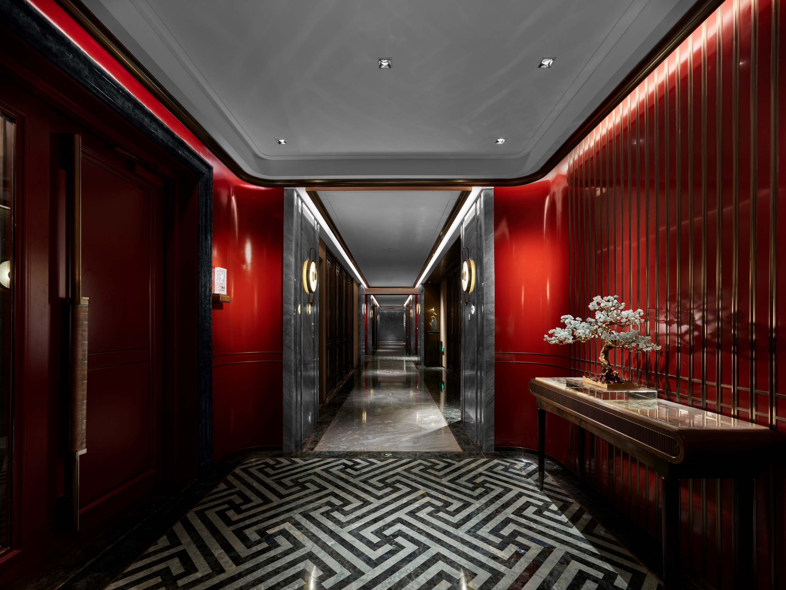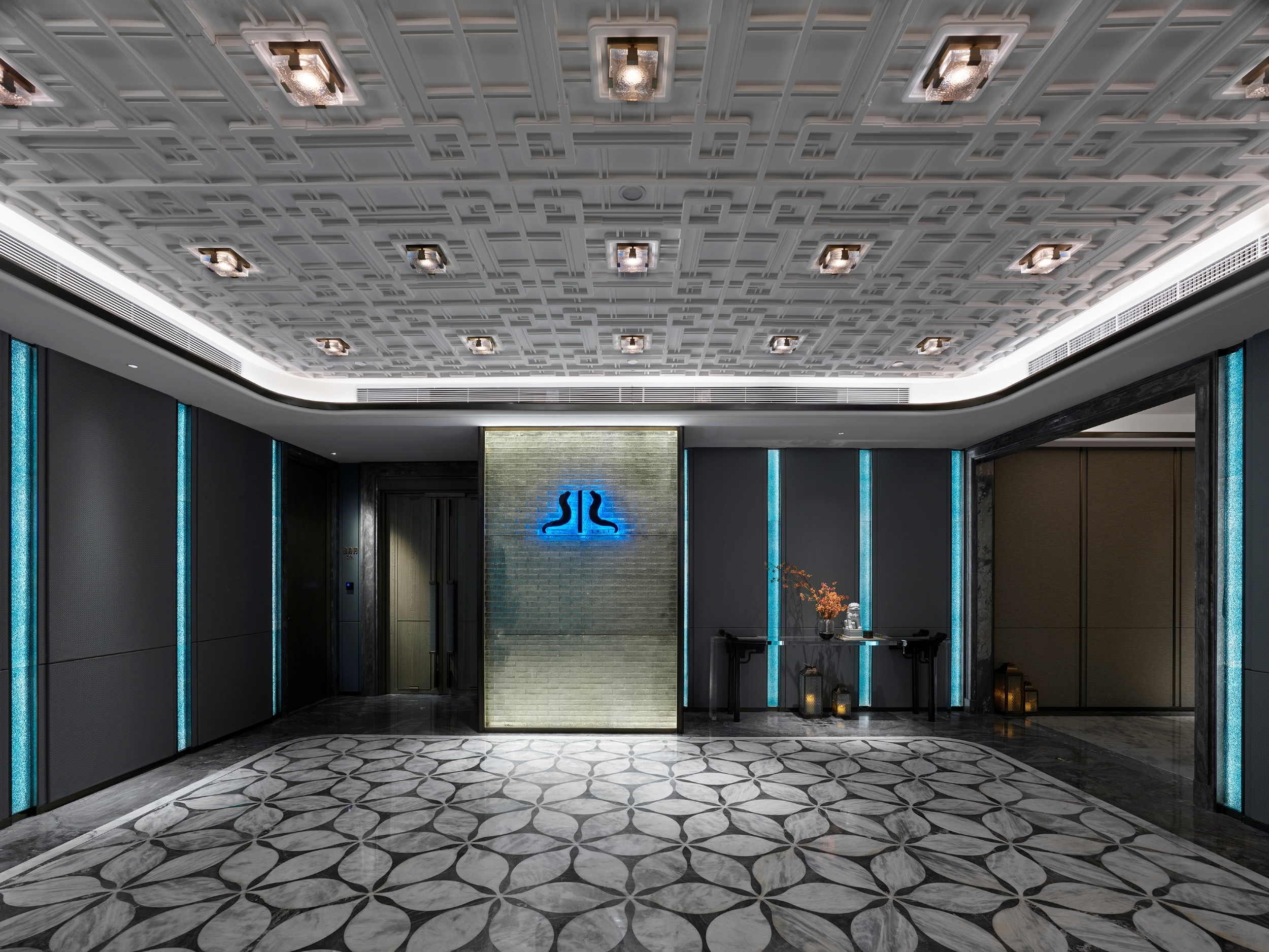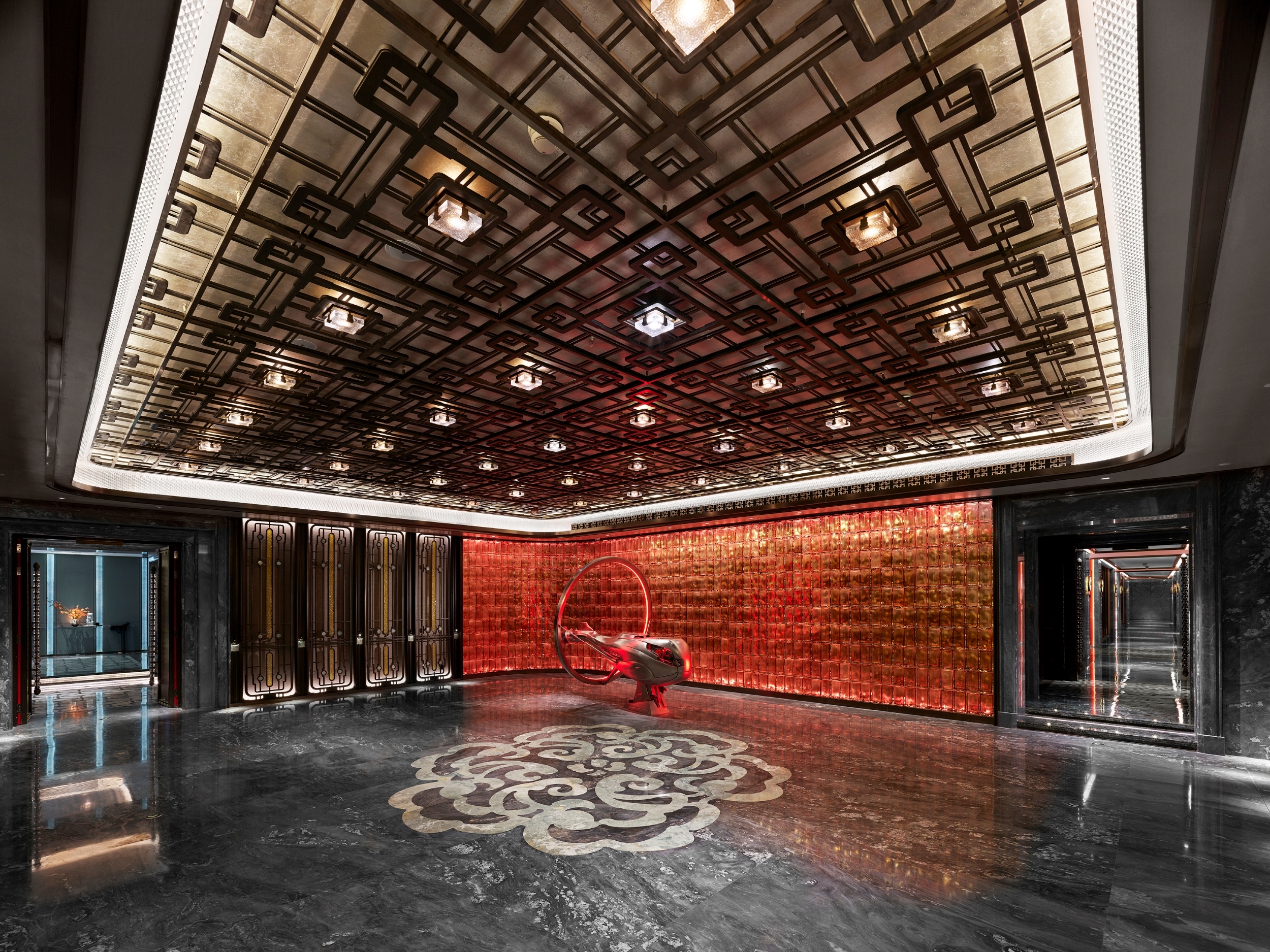 In the reception hall, an asymmetrically designed, unique and grand crustal glazed tile wall is present. The elements are derived from the architectures in Beijing. The main background is a wall made of crystal, which amounts to a piece of art. Its rendering integrates the traditional cast copper. The modern expression integrating crystals are lit up by multimedia lights, creating an artistic ambiance. The floor adopts traditional cloud patterns to form the shape of peony, the emblem of national flower. The space takes on a majestic and luxurious look. As a whole, the hall is splendid and avant-garde, evoking people’s lure for freshness and imagination for a unique experience.