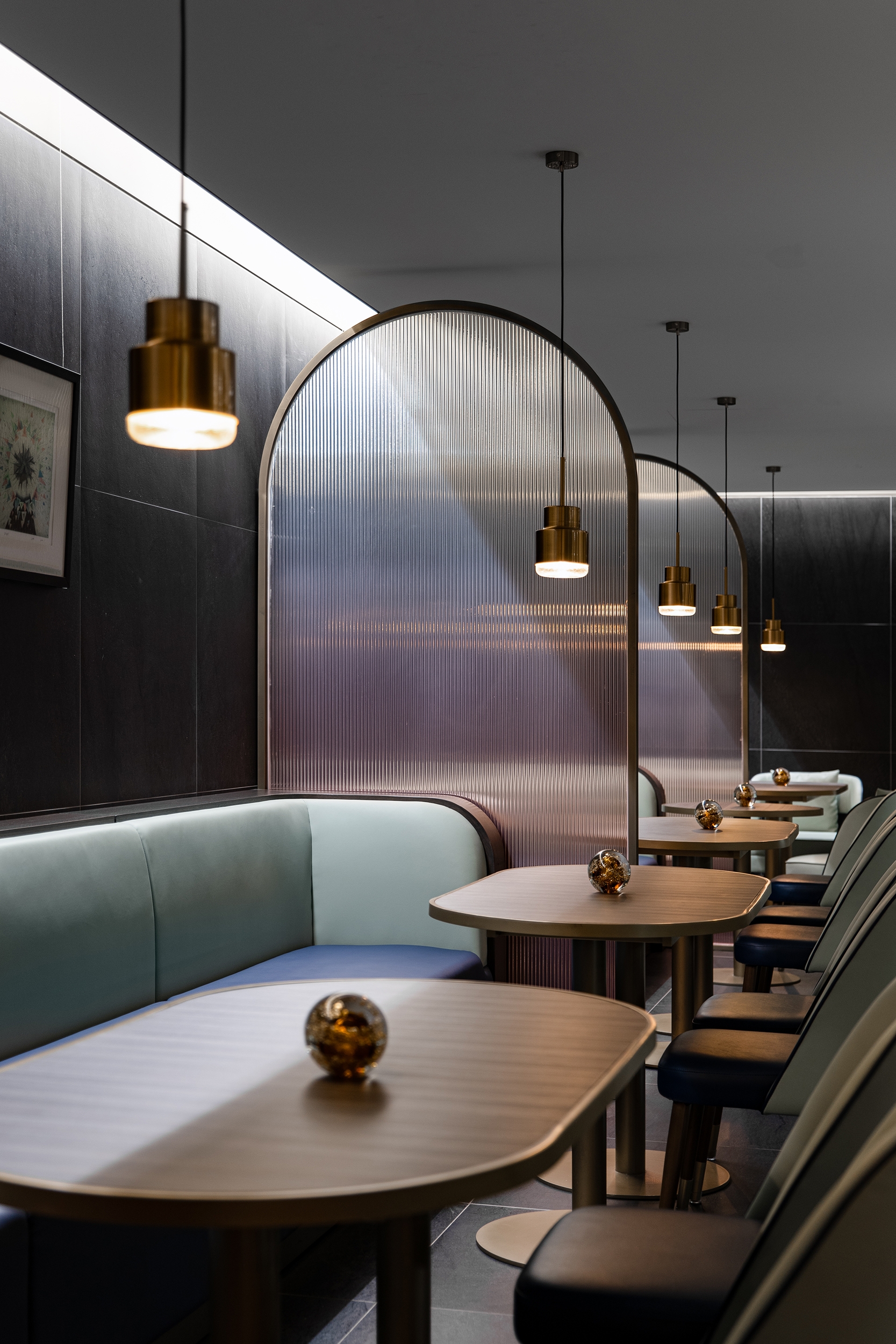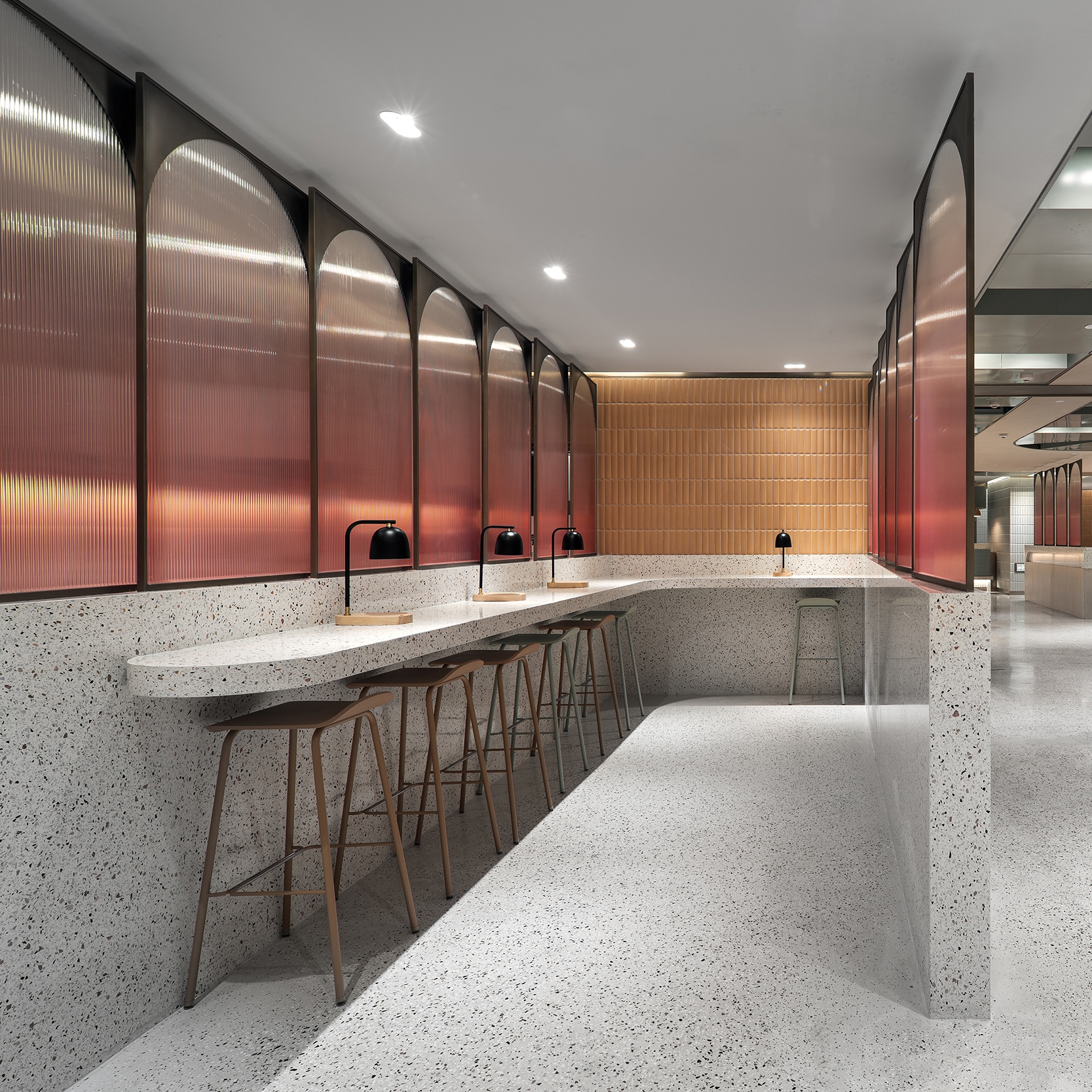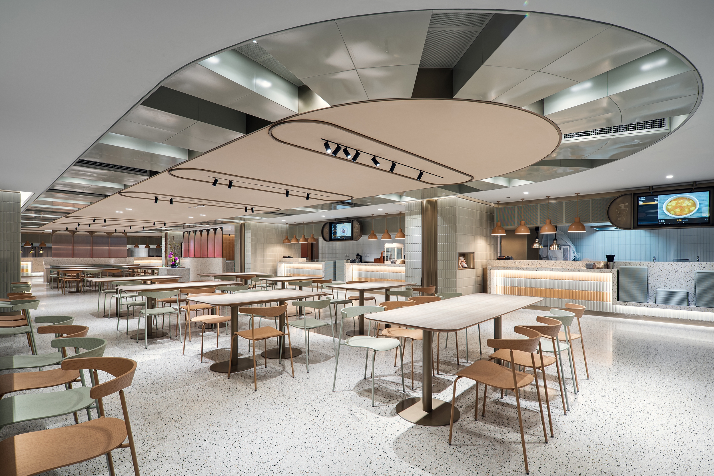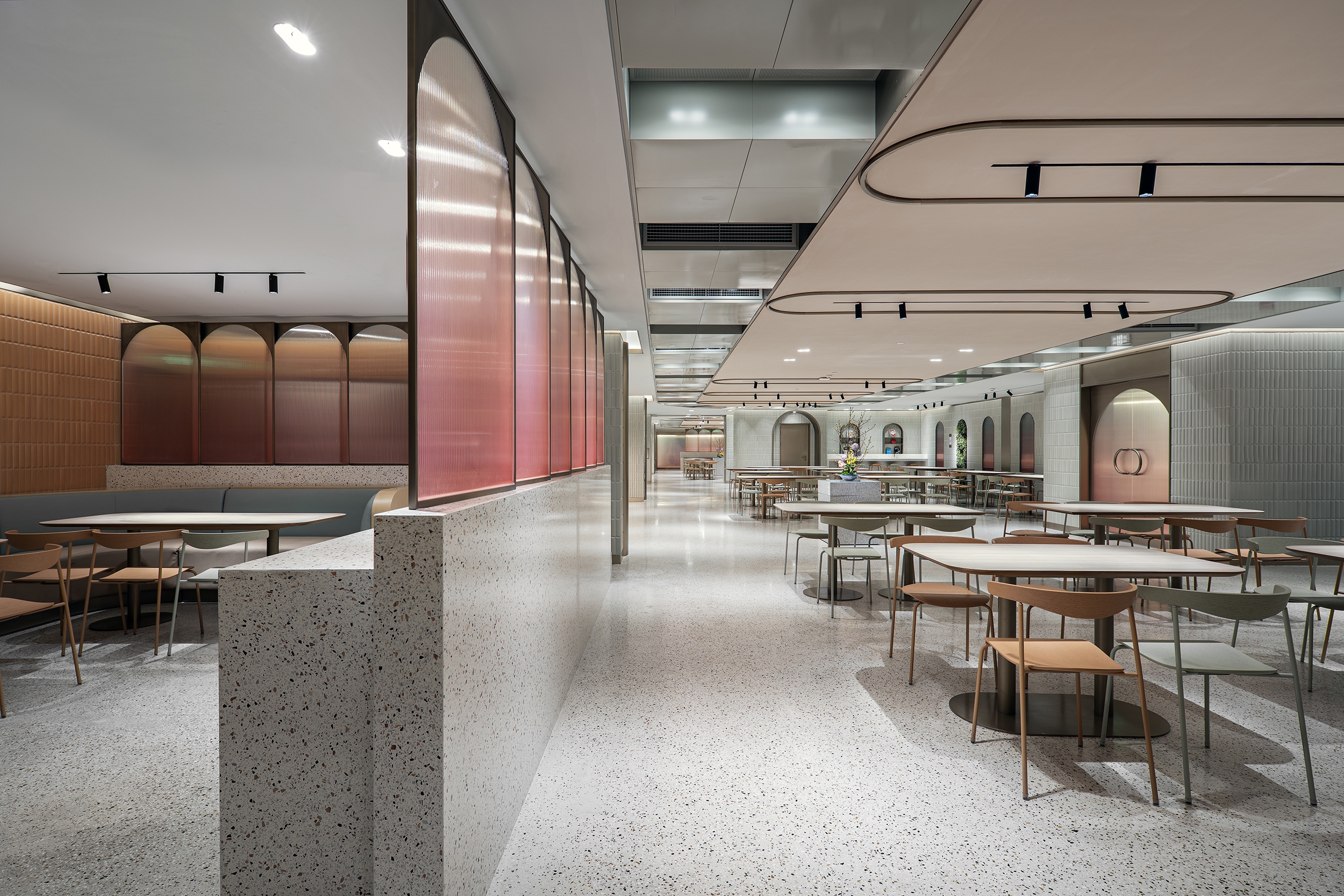 The main dining hall provides the largest catering space to meet daily meal requirements for staff and visitors by serving Chinese and international dishes within different dining zones. A formal dining space opposite the main dining area caters for over 50 covers and can also host ad hoc events. Different tones of greys, mid-century furnishings in pastel shades, bronze accents and low hanging lights add warmth and sophistication. A more traditional Chinese “Hot-pot” seating area has been created too, slated timber walls and a distinctive double symmetry arch metal frame covers the rear dining settings. There is a mix of direct, indirect and concealed lighting throughout as the dining areas are in the buildings’ basement and lighting had to counter the absence of natural light.