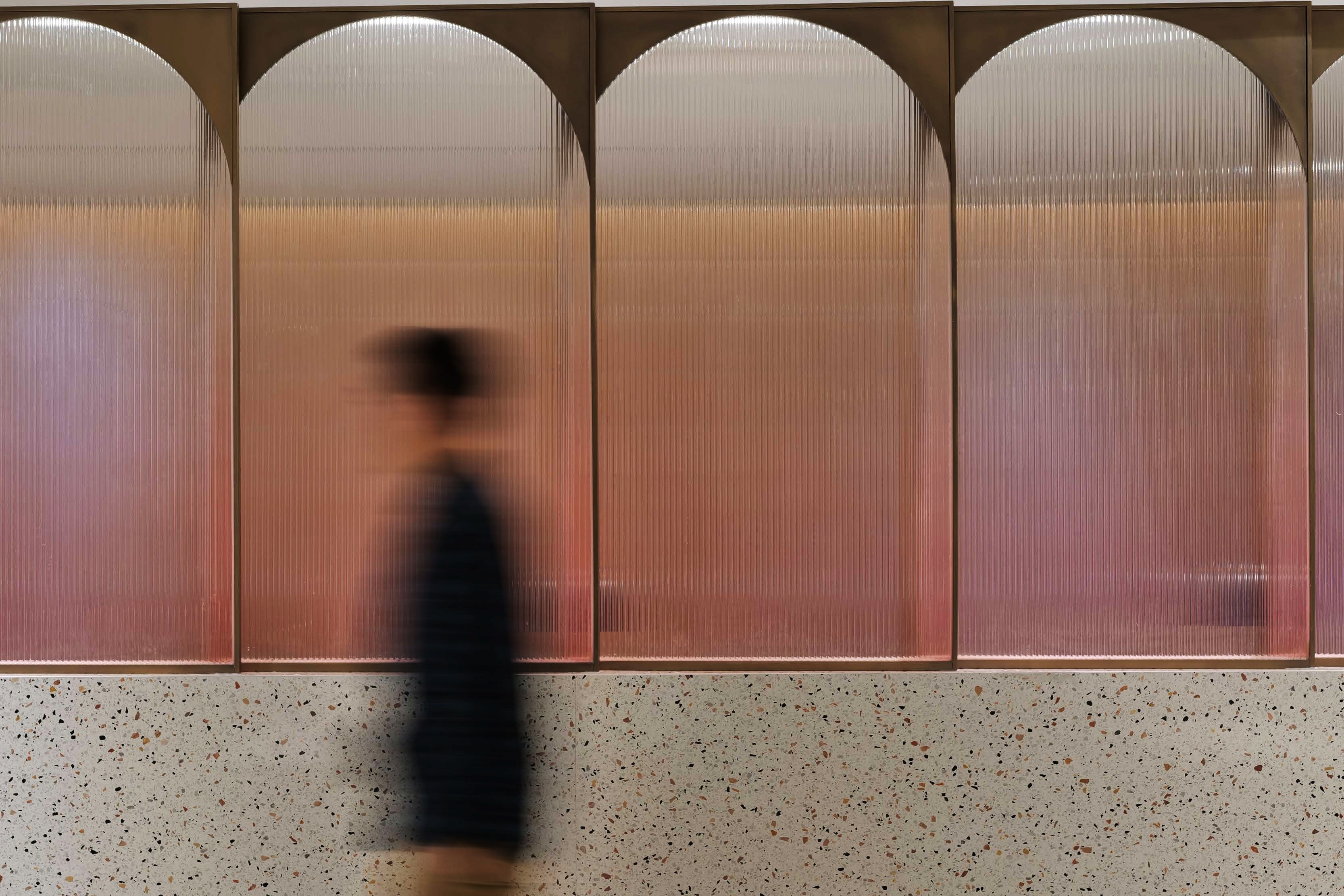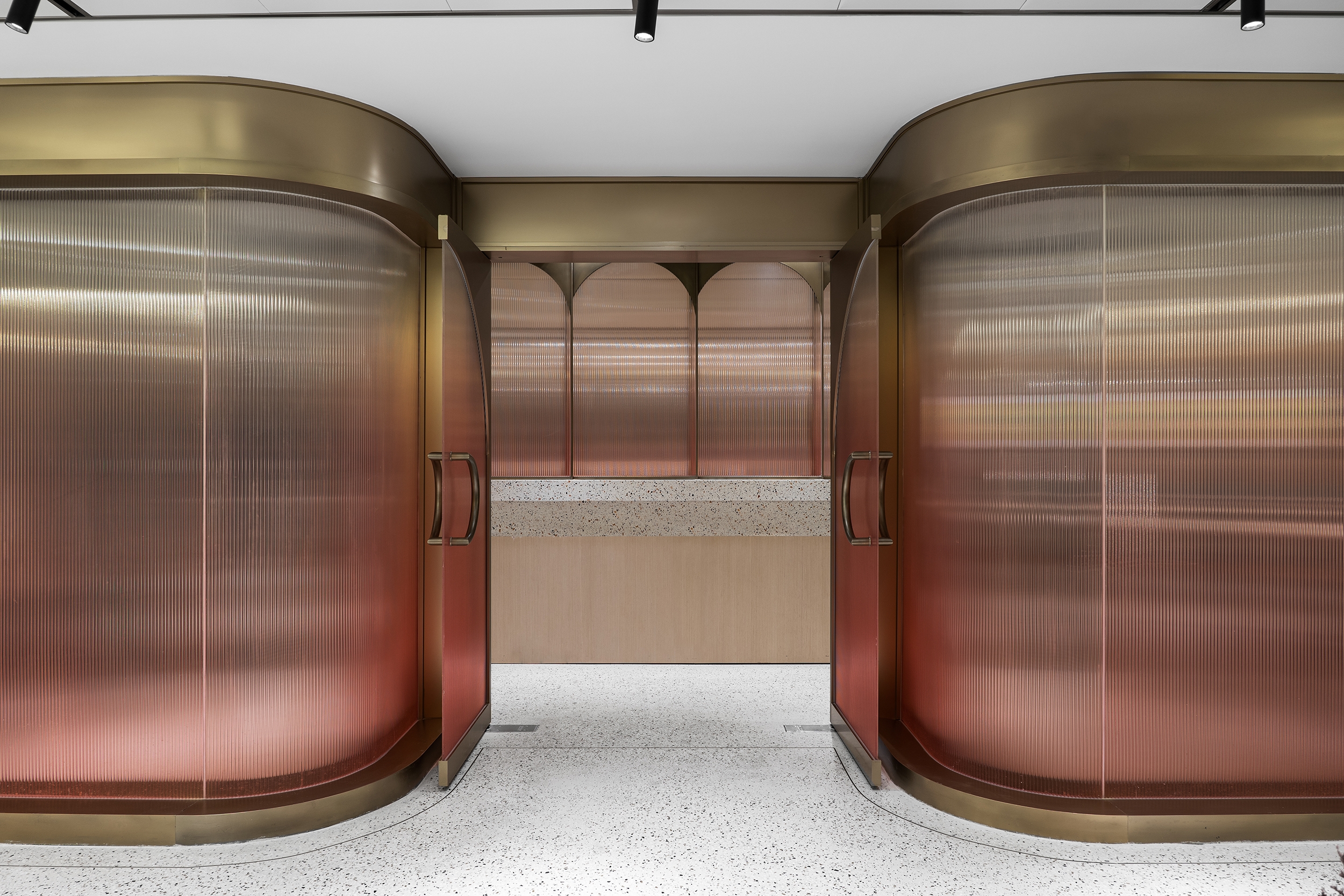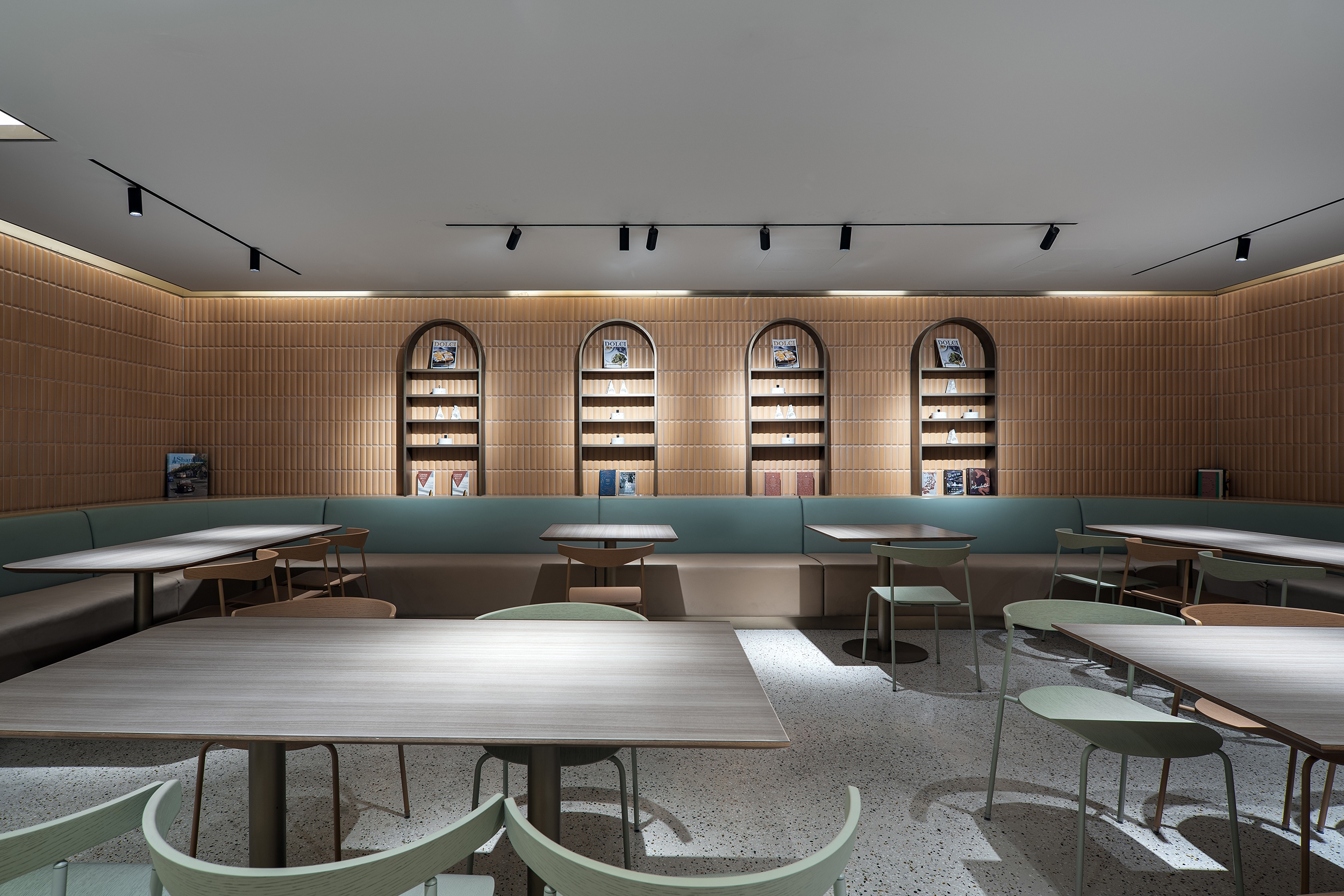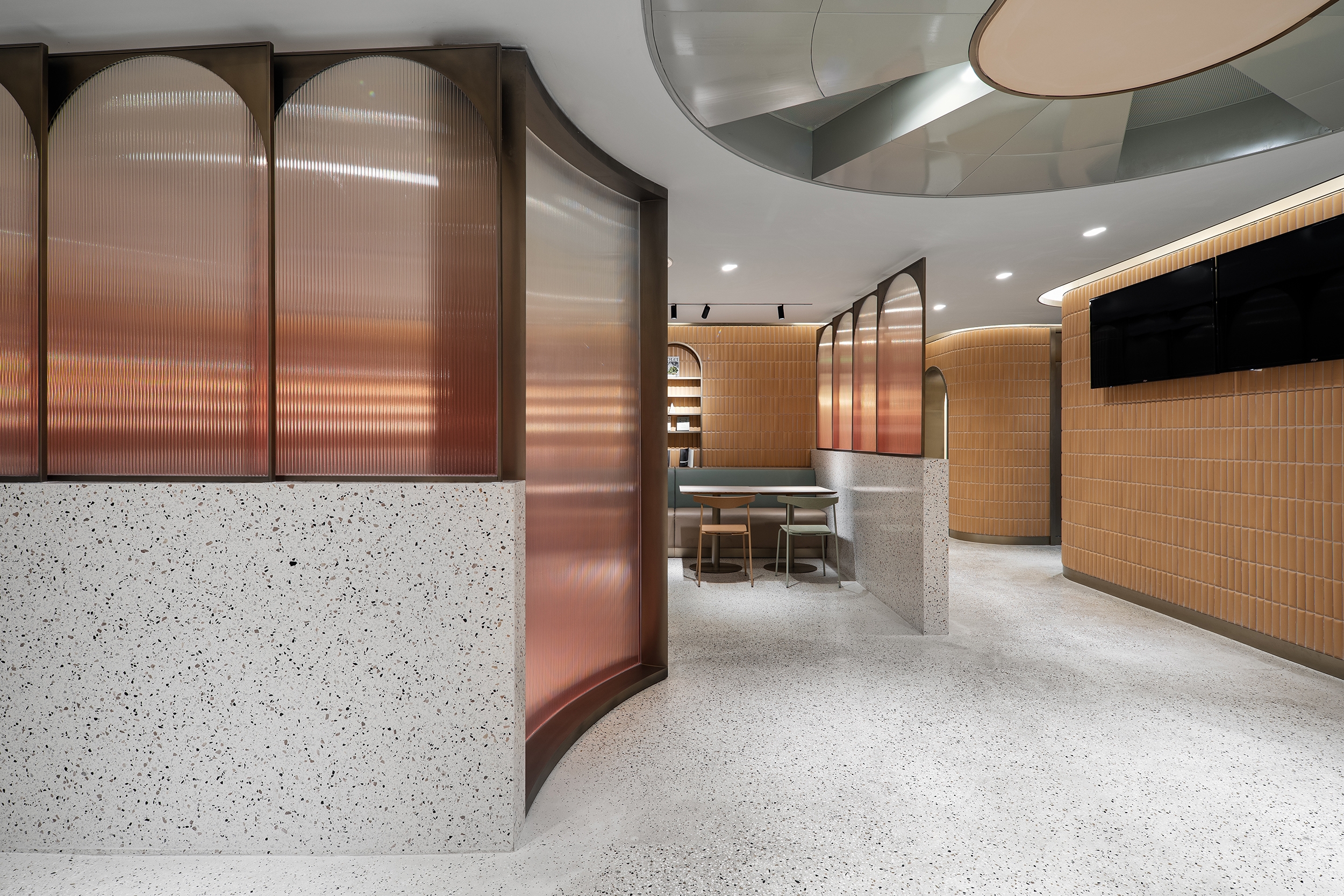 The main dining hall provides the largest catering space to meet daily meal requirements for staff and visitors by serving Chinese and international dishes within different dining zones. A formal dining space opposite the main dining area caters for over 50 covers and can also host ad hoc events. Different tones of greys, mid-century furnishings in pastel shades, bronze accents and low hanging lights add warmth and sophistication. A more traditional Chinese “Hot-pot” seating area has been created too, slated timber walls and a distinctive double symmetry arch metal frame covers the rear dining settings. There is a mix of direct, indirect and concealed lighting throughout as the dining areas are in the buildings’ basement and lighting had to counter the absence of natural light.