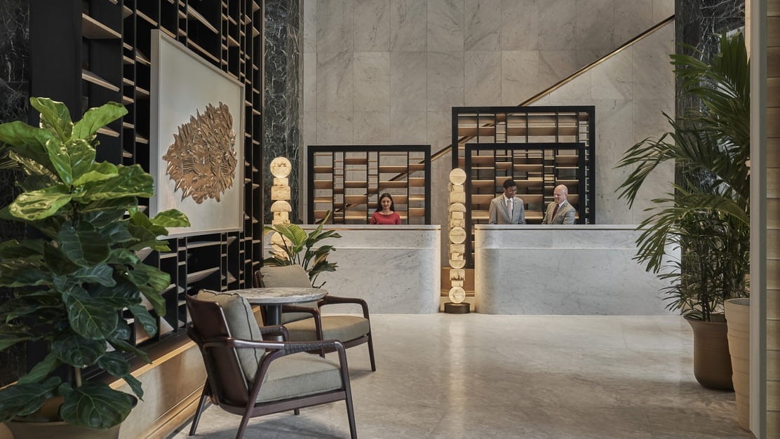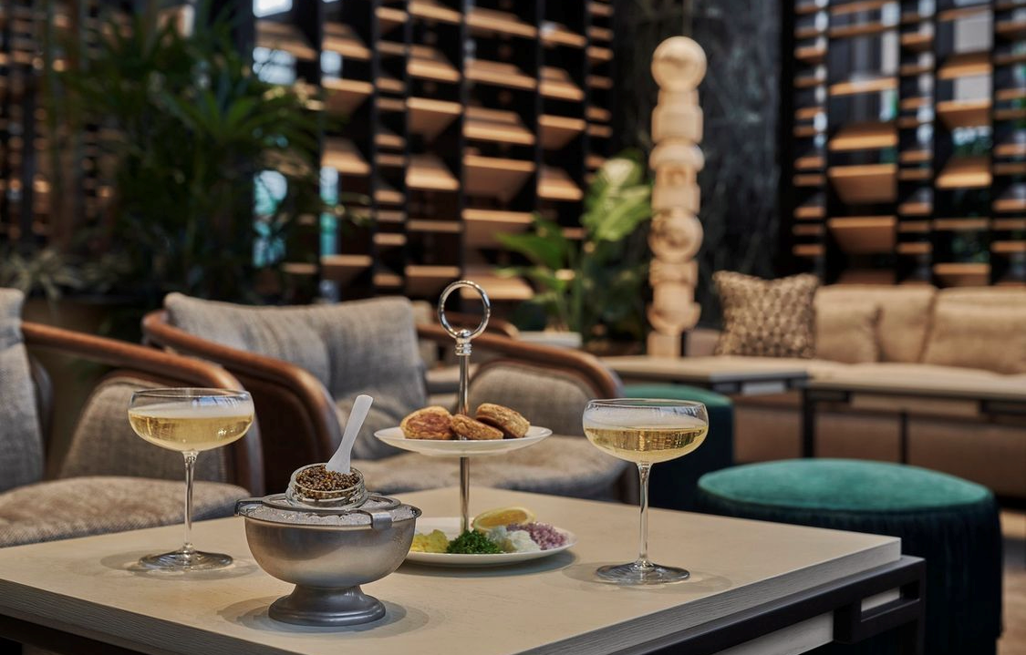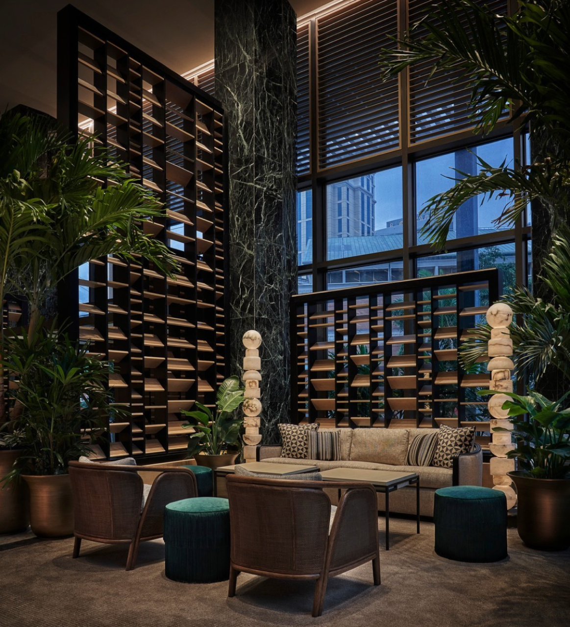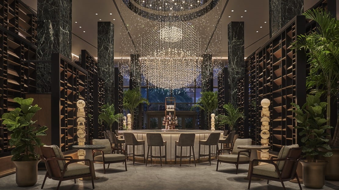 New Orleans is a city that embraces a multicultural heritage, and celebrates life, alluring gardens, art, music, and cuisine. Set on two riverfront acres that will be flanked by lush gardens, the design of the Four Seasons New Orleans is inspired by the sanctuary and allure of this botanic backdrop. It is this restful setting that the interiors become a foundation to celebrate the multi-cultural heritage of the city through art, food, and threads of historic influence. It is also a city and place of memories filled with cherished heirlooms. It is from this legacy that the interiors emerge. The Chandelier Bar is centered around the bar that is enveloped by a grand lighting installation that is made up of varying crystal and glass arrangements creating the hint of an heirloom chandelier shape. The twinkling reflective gentle movement of the chandelier results in an alluring mood. The experience creates a layered story of discovery in a room that is subdivided by contemporary shutter screens made of oak, iron, and curated art that create intimate spaces with their arrangement.