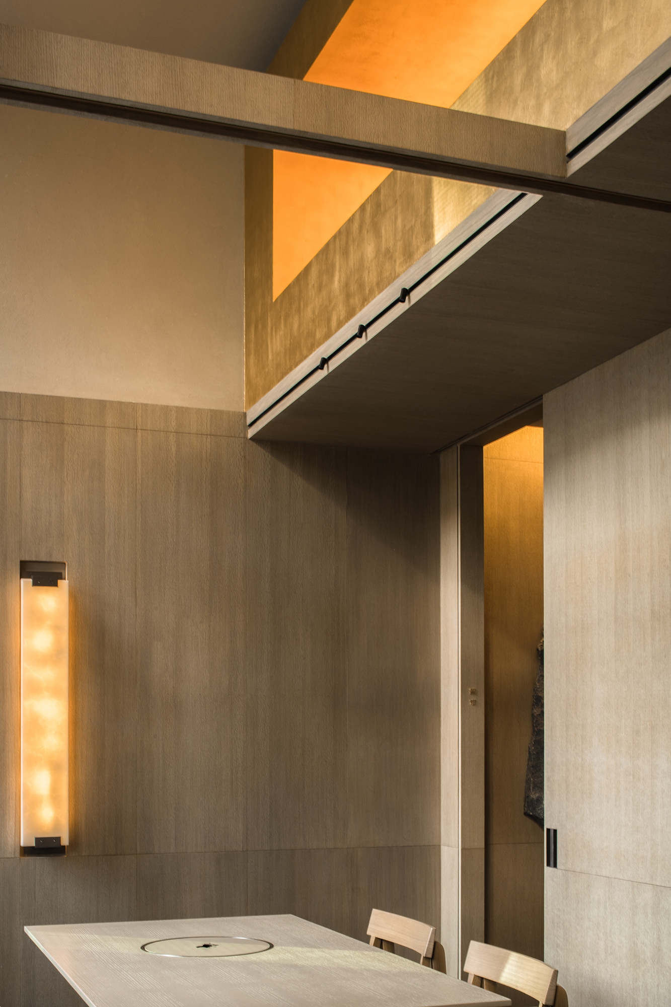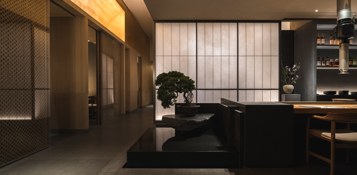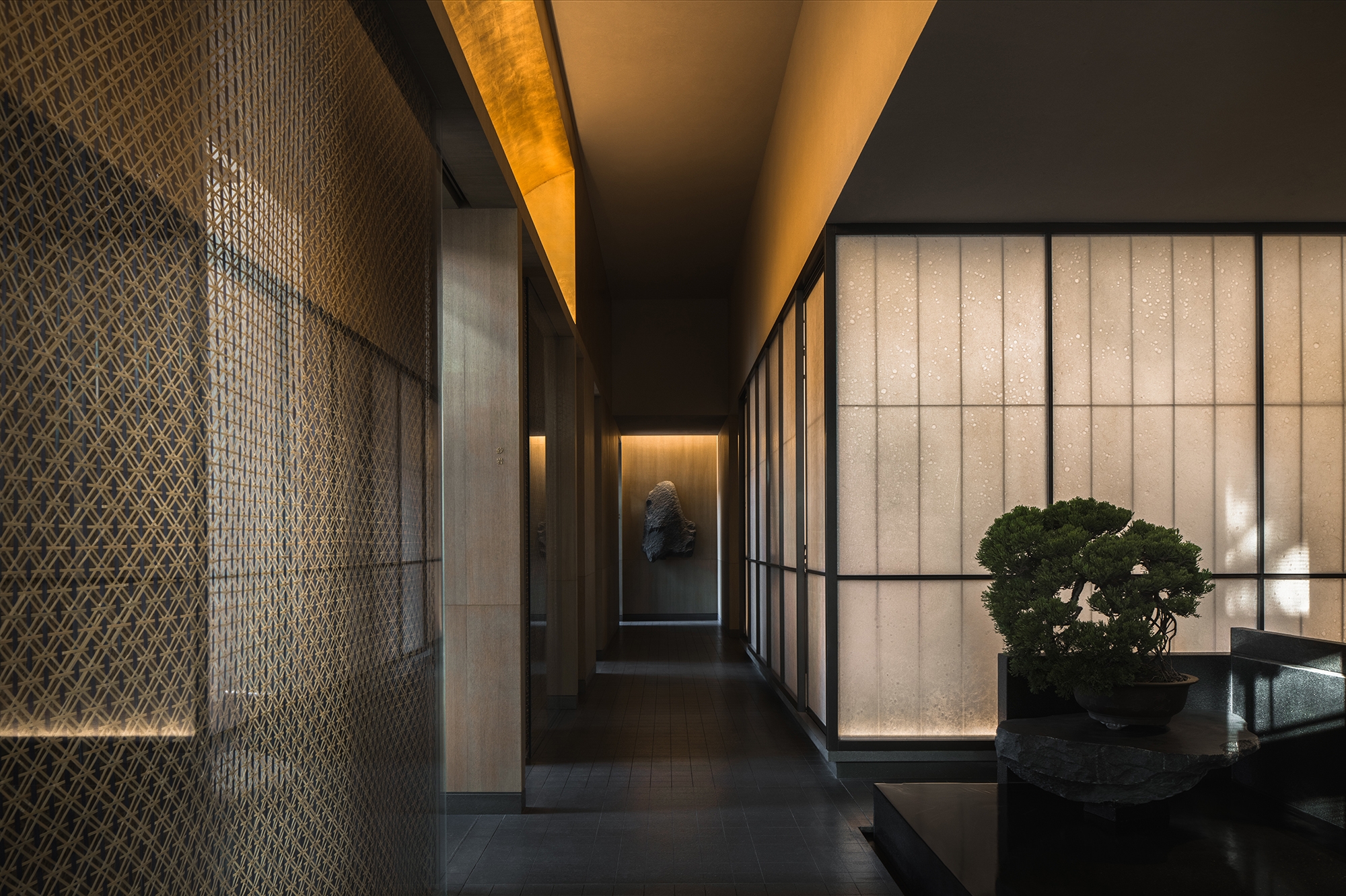 The restaurant hides under a skyscraper in the clouds and is concealed within a densely layered glass wall. Its logo pattern is shaped like the character yan that resembles a Japanese family crest, showing a low-profile presence from the storefront’s glass door and echoing the tree shadows. The natural greenery and the urban background of reinforced concrete create a mysterious and futuristic atmosphere. A black wall connects with the glass curtain wall. It abandons any fancy patterns or textured decorations, only with a gold and bronze-colored logo on it, to remind passers-by this place’s fine cuisine and world of yakiniku hidden behind the steel panels.