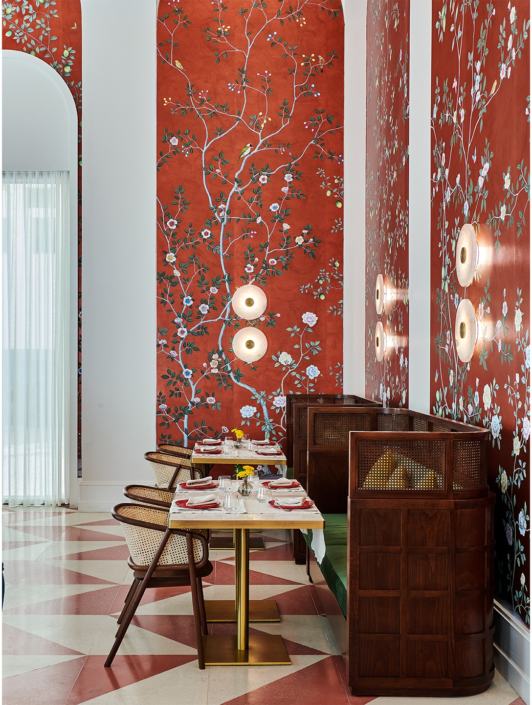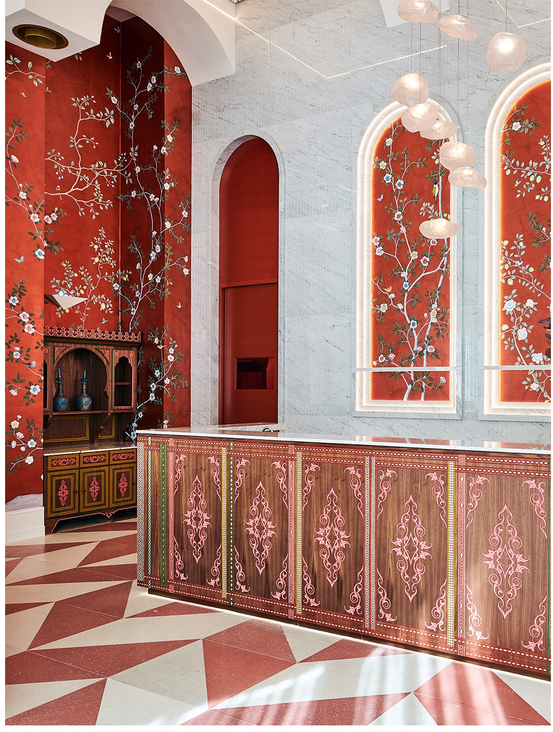 The space is a salute to Lebanese artisanship, architecture and vista. On entering the restaurant, diners are immediately immersed in bearings that feel intimate and oddly personal, as if snatched from cherished memories of times long gone. The walls of red gilded paper, signed de Gournay, are a scatter of poetry and stand in stark contrast to the towering, white-washed ceiling typical of old Lebanese houses. The ceiling is arched and punctured by vaults with custom-made lights that infuse the space with soul and energy.