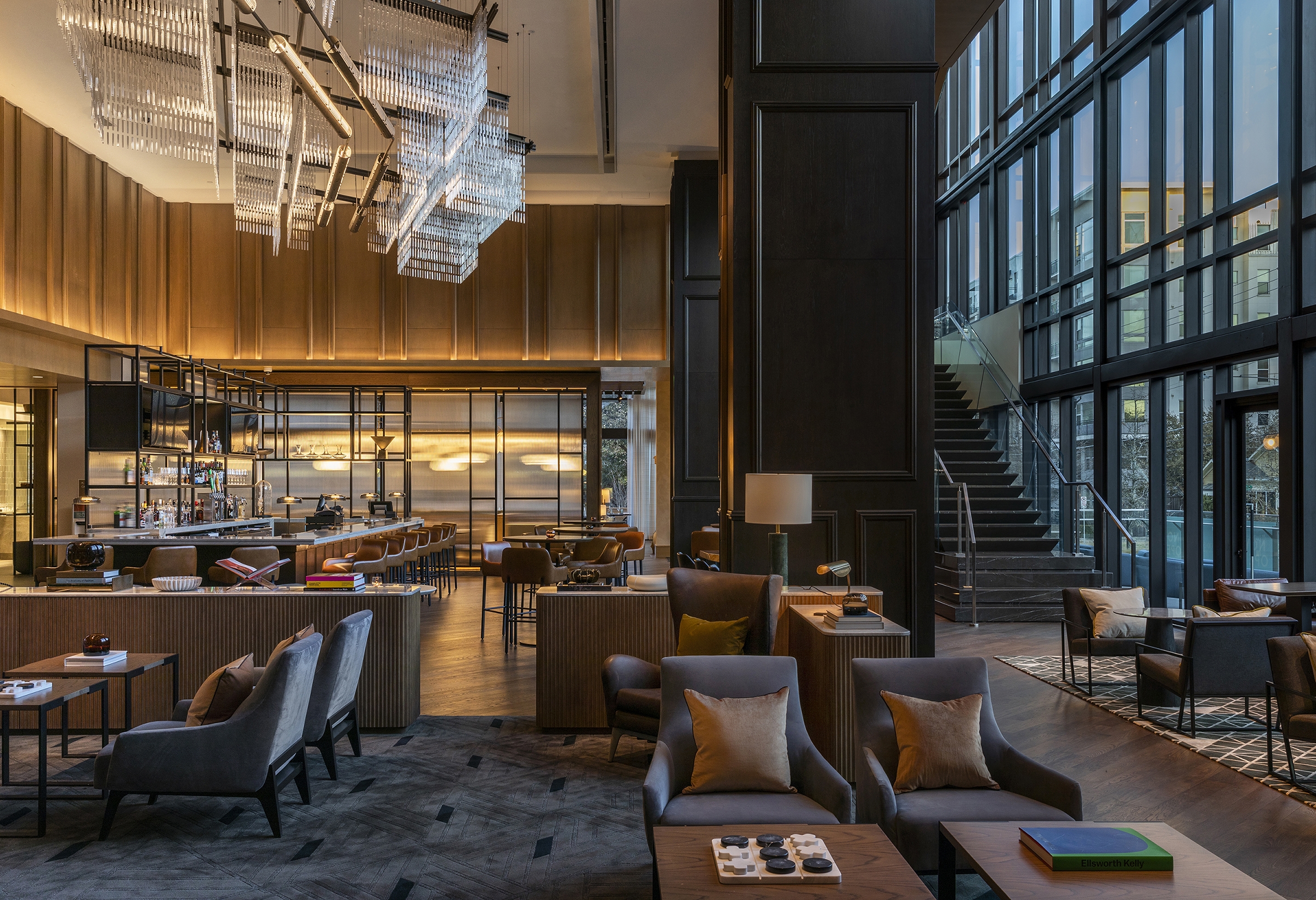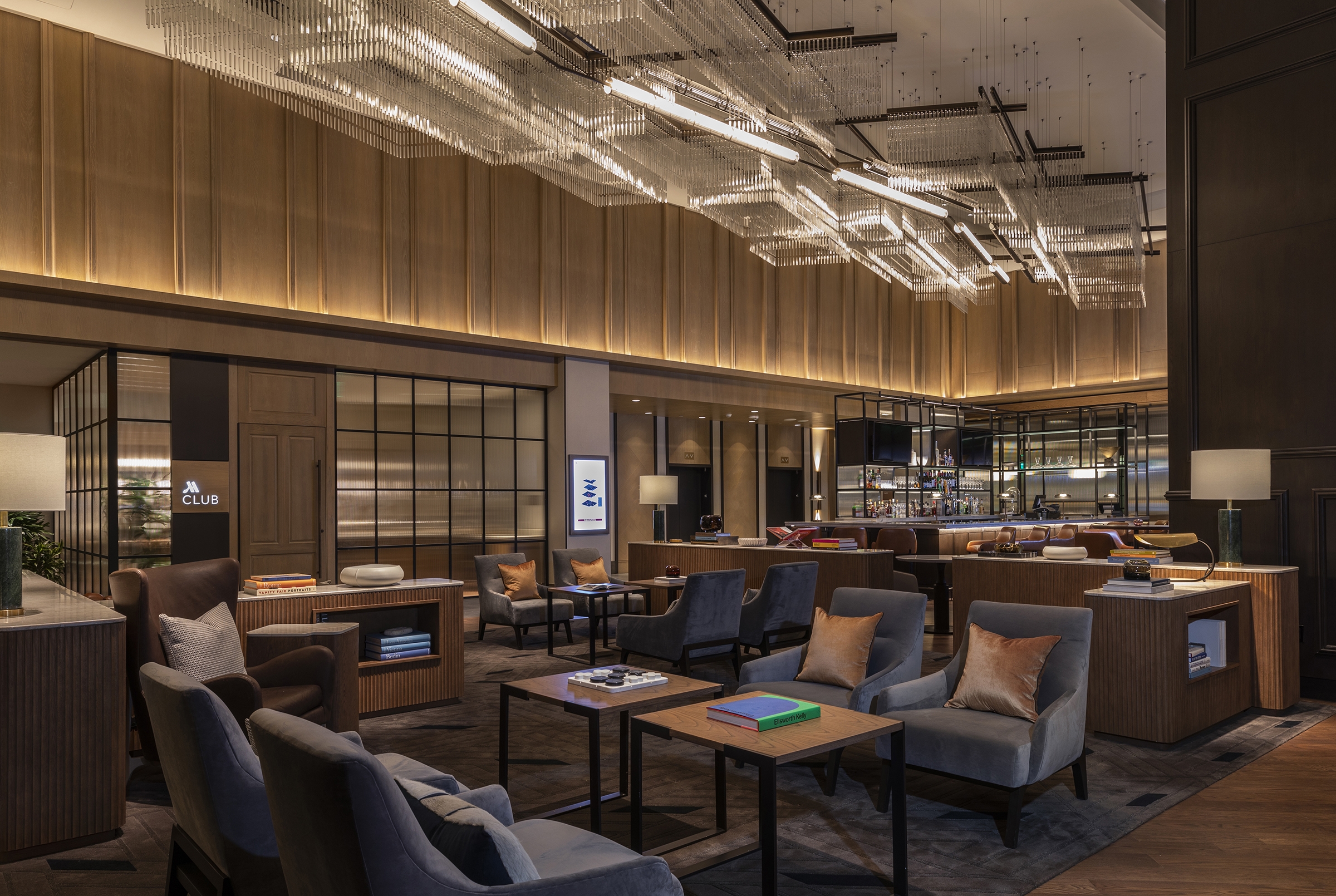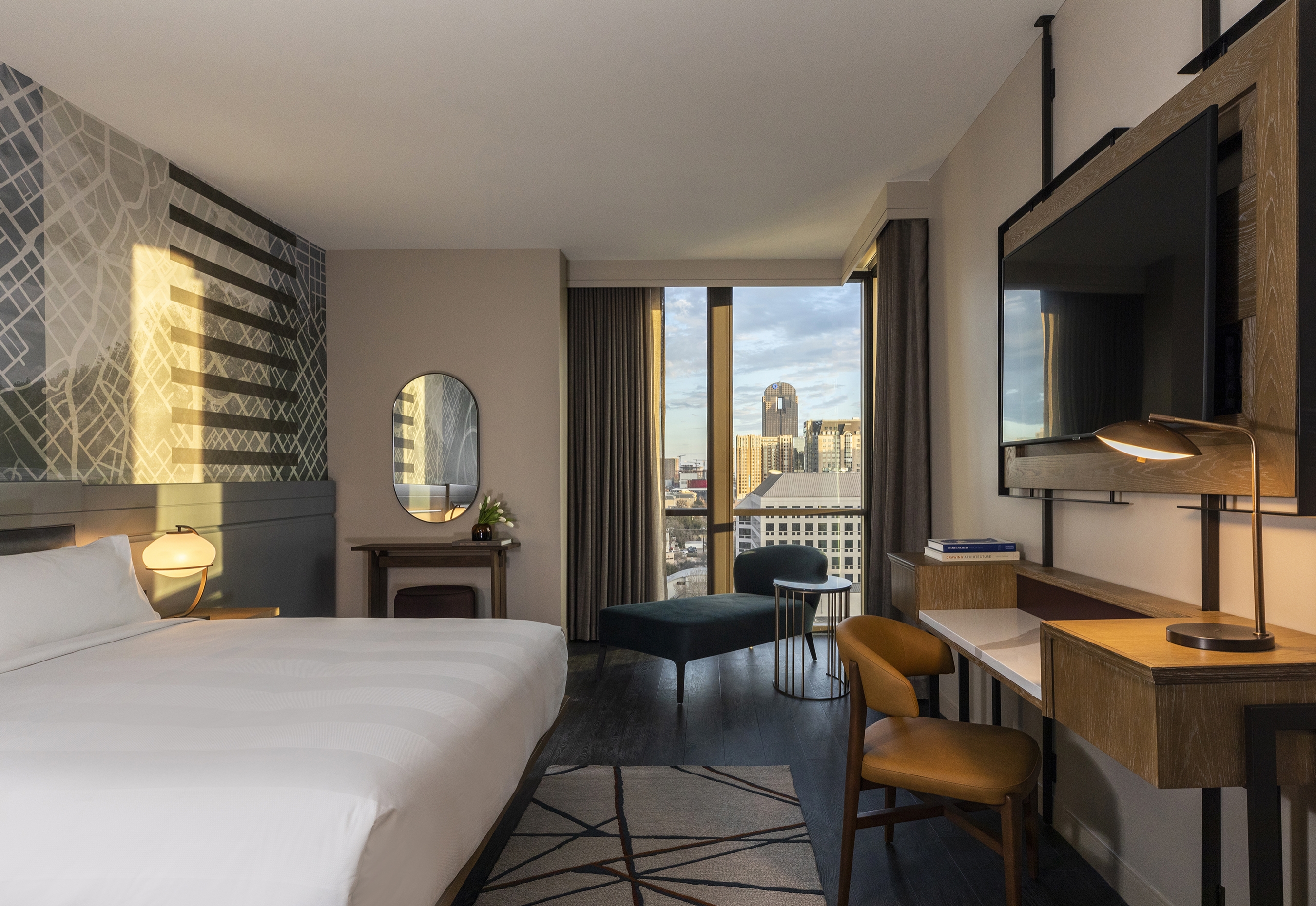 “Modern Urban Style Meets Classic Neighborhood Charm,” invites guests to experience the unique local flavor of Uptown Dallas. The Marriot Dallas Uptown was designed to elegantly integrate into its location through walkable street access, local materials and artwork, and a connection to the surrounding landscape. The warm color palette draws from nature, with warm browns, soft grays, olive green, rusty red, cream and white. Behind the lobby’s front desk, an art installation made from locally reclaimed wood depicts bikers and runners along Katy Trail. Small pendant lights above the lobby seating are reminiscent of fireflies one might see on an evening walk on the trail. Above the lobby bar, a dramatic sculptural light installation adds striking visual interest, with a grid pattern reflective of a city map.