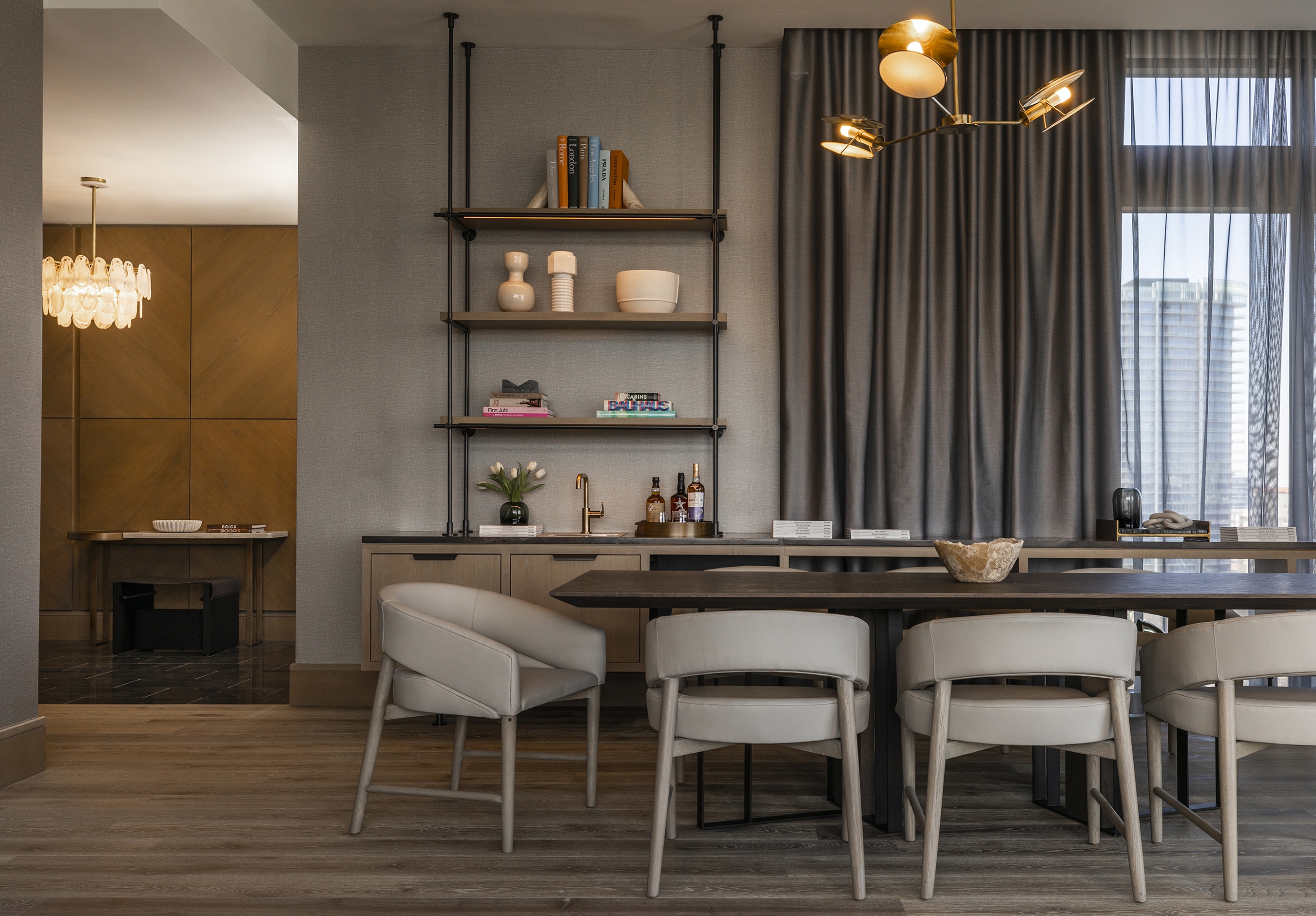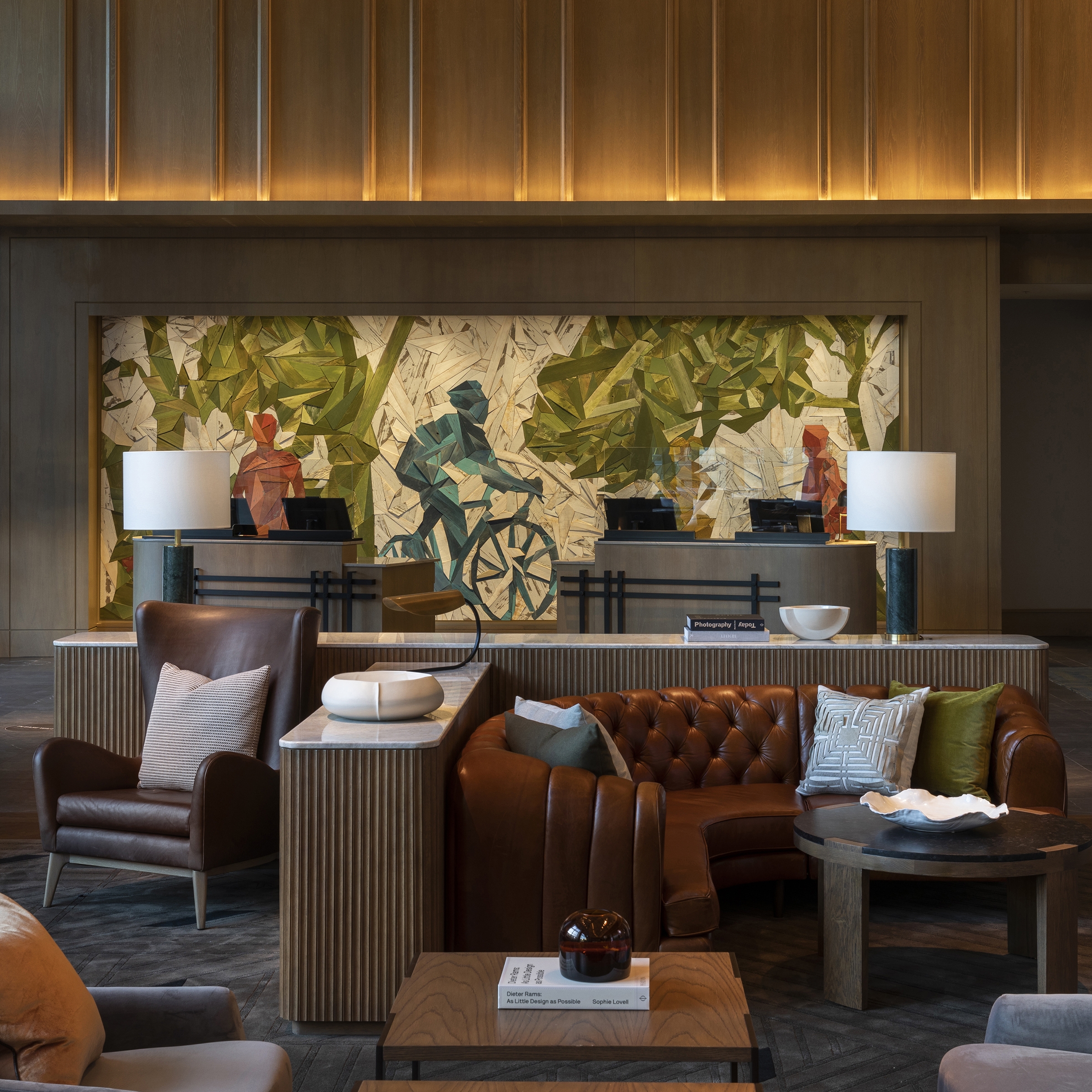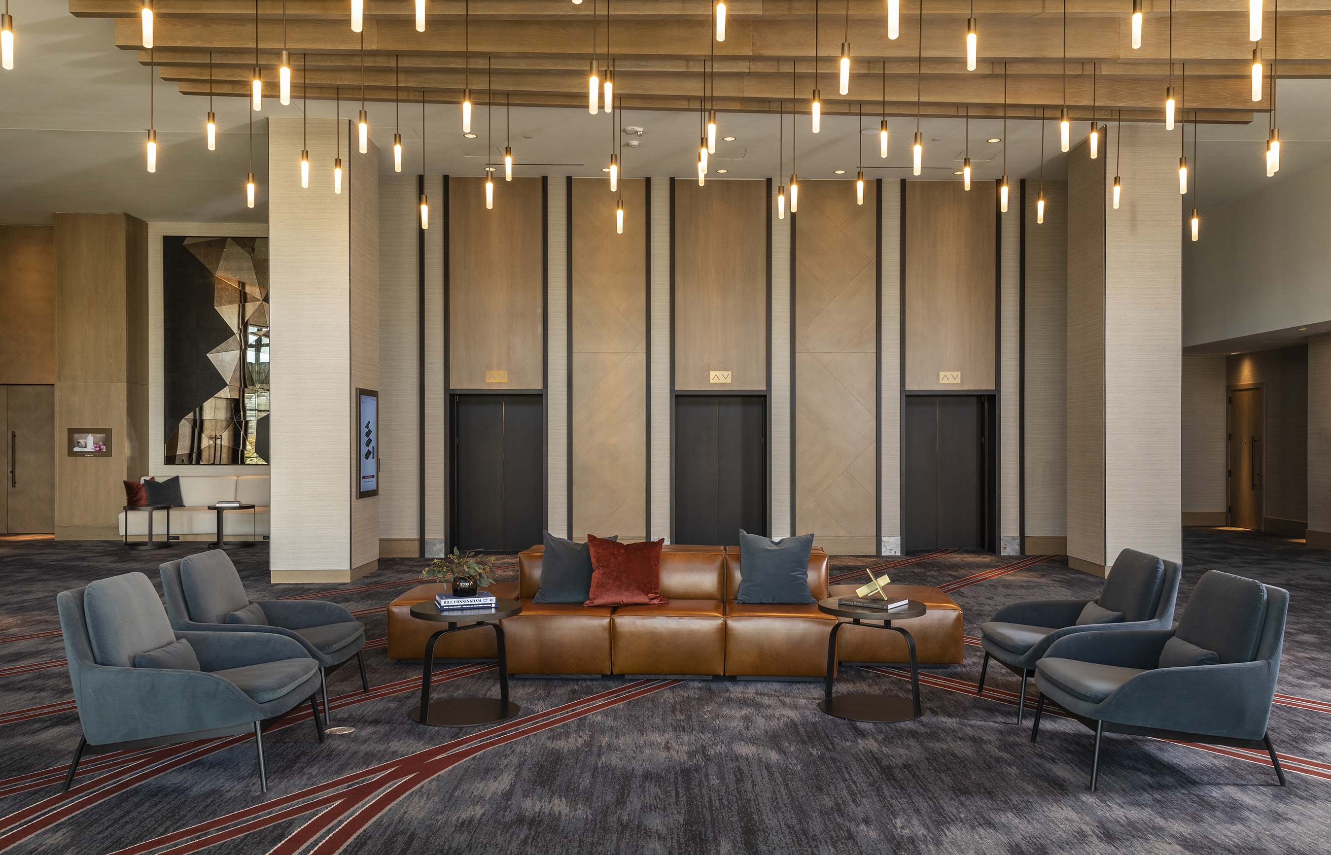 “Modern Urban Style Meets Classic Neighborhood Charm,” invites guests to experience the unique local flavor of Uptown Dallas. The Marriot Dallas Uptown was designed to elegantly integrate into its location through walkable street access, local materials and artwork, and a connection to the surrounding landscape. The warm color palette draws from nature, with warm browns, soft grays, olive green, rusty red, cream and white. Behind the lobby’s front desk, an art installation made from locally reclaimed wood depicts bikers and runners along Katy Trail. Small pendant lights above the lobby seating are reminiscent of fireflies one might see on an evening walk on the trail. Above the lobby bar, a dramatic sculptural light installation adds striking visual interest, with a grid pattern reflective of a city map.