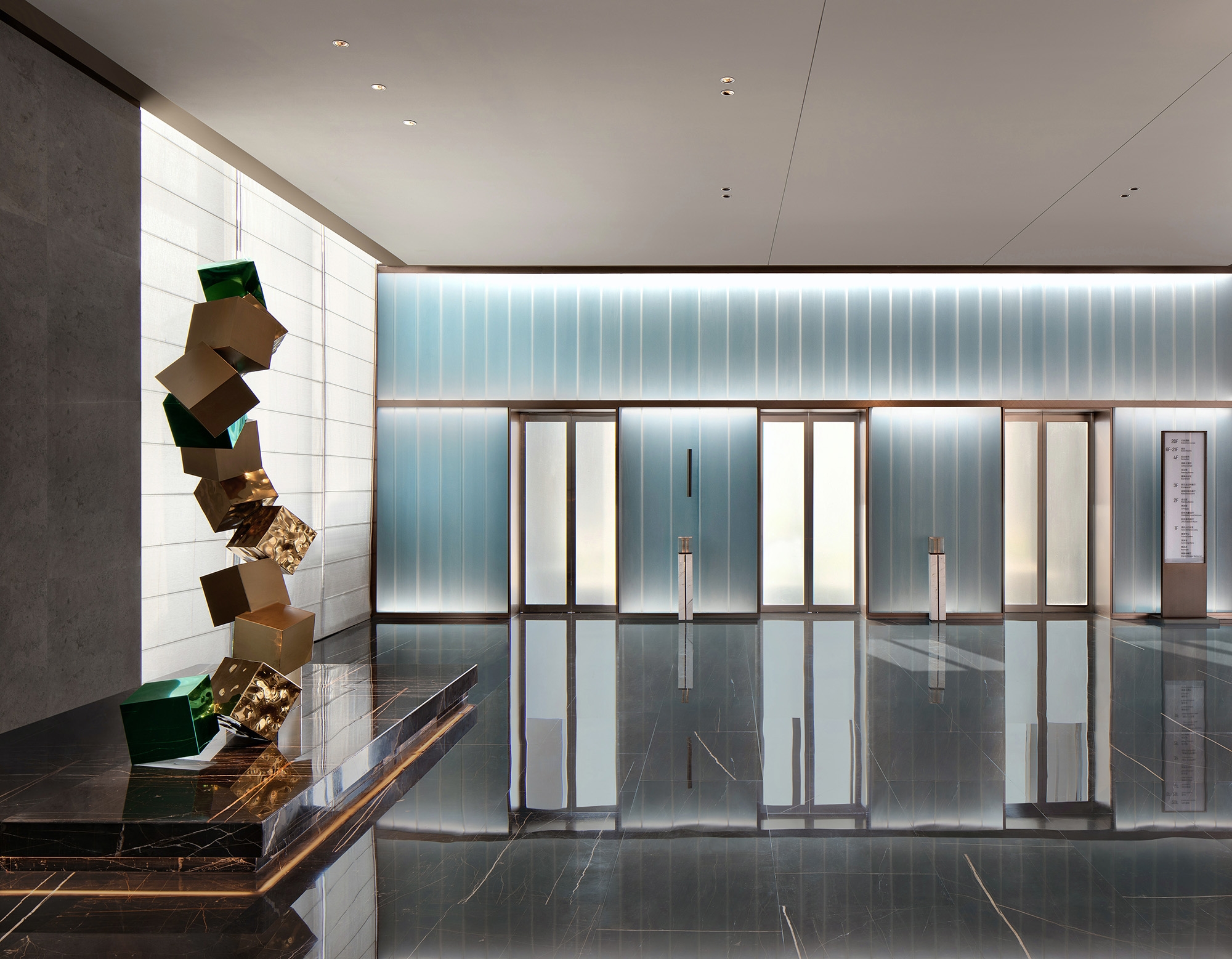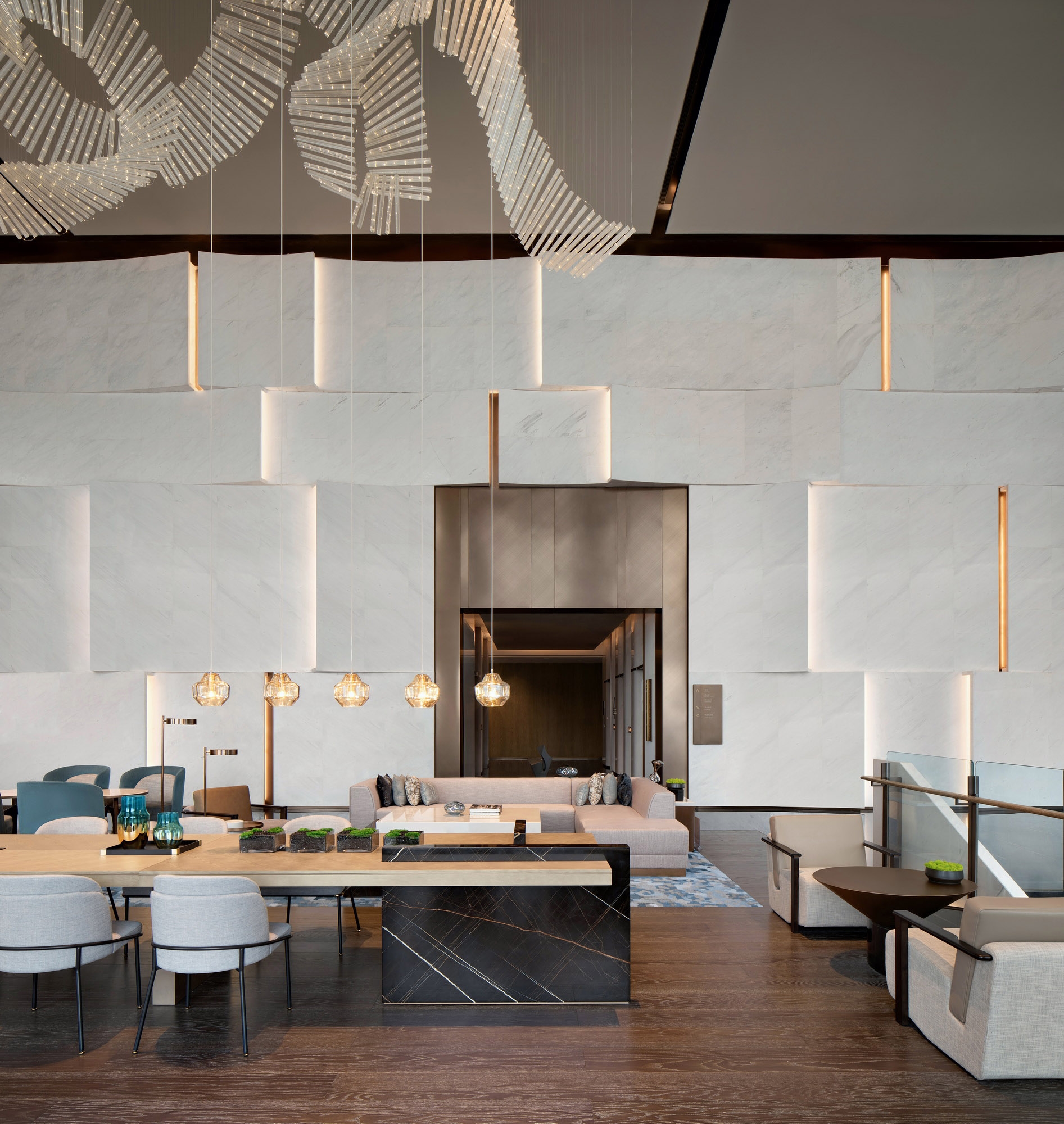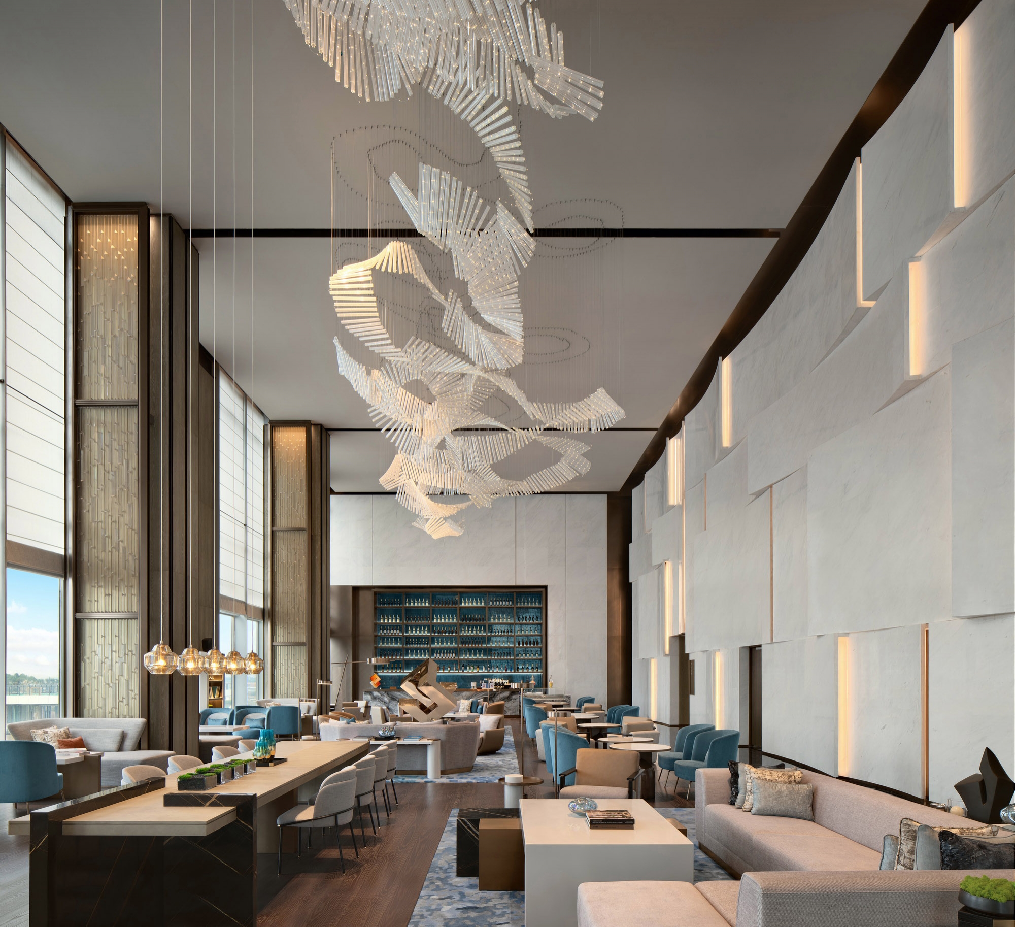 The interior design values both beauty and practicality. Sofas and long tables in the lobby lounge can be either combined or scattered to meet the requirements both for business meetings and leisure gatherings. Inspired by a propeller spinning around in sea water, the artistic pendant lights weaken the sense of distance of the 8.85-meter-high ceiling while enhancing the quality of the space.