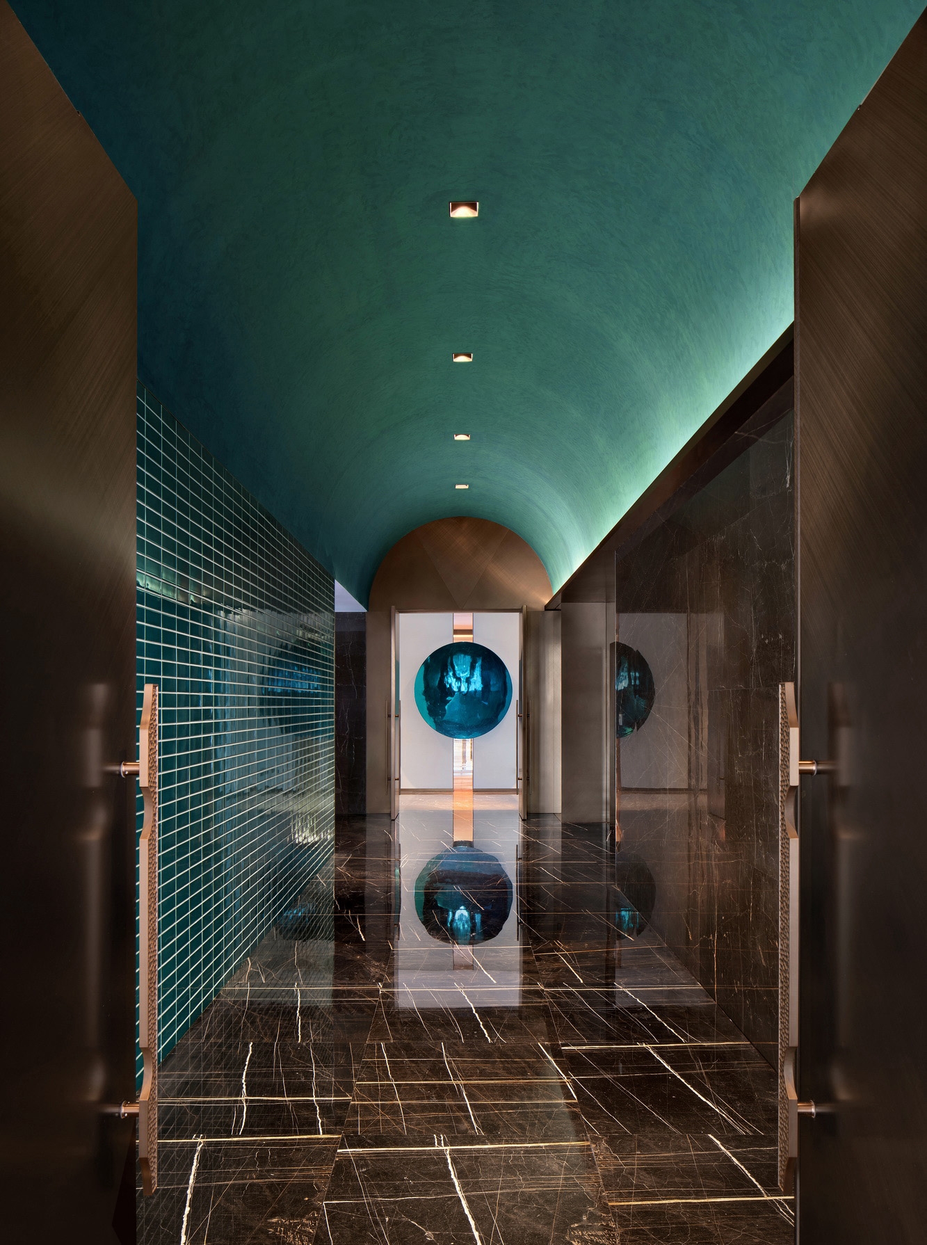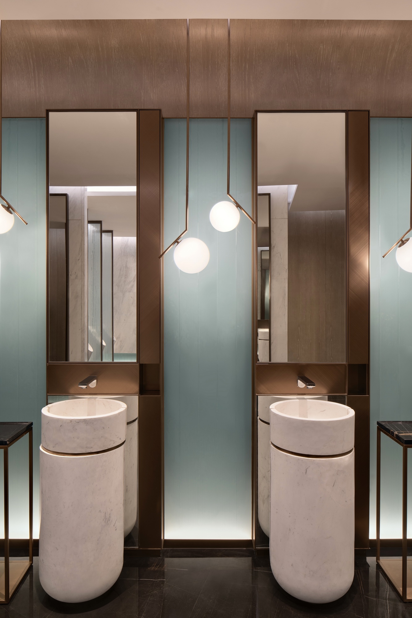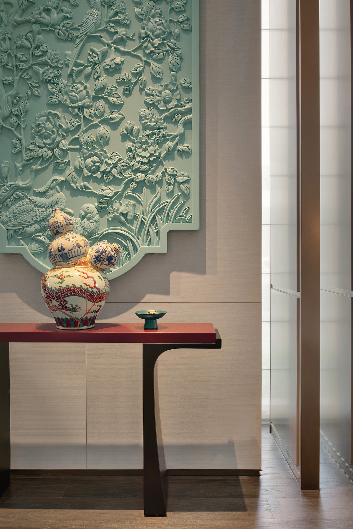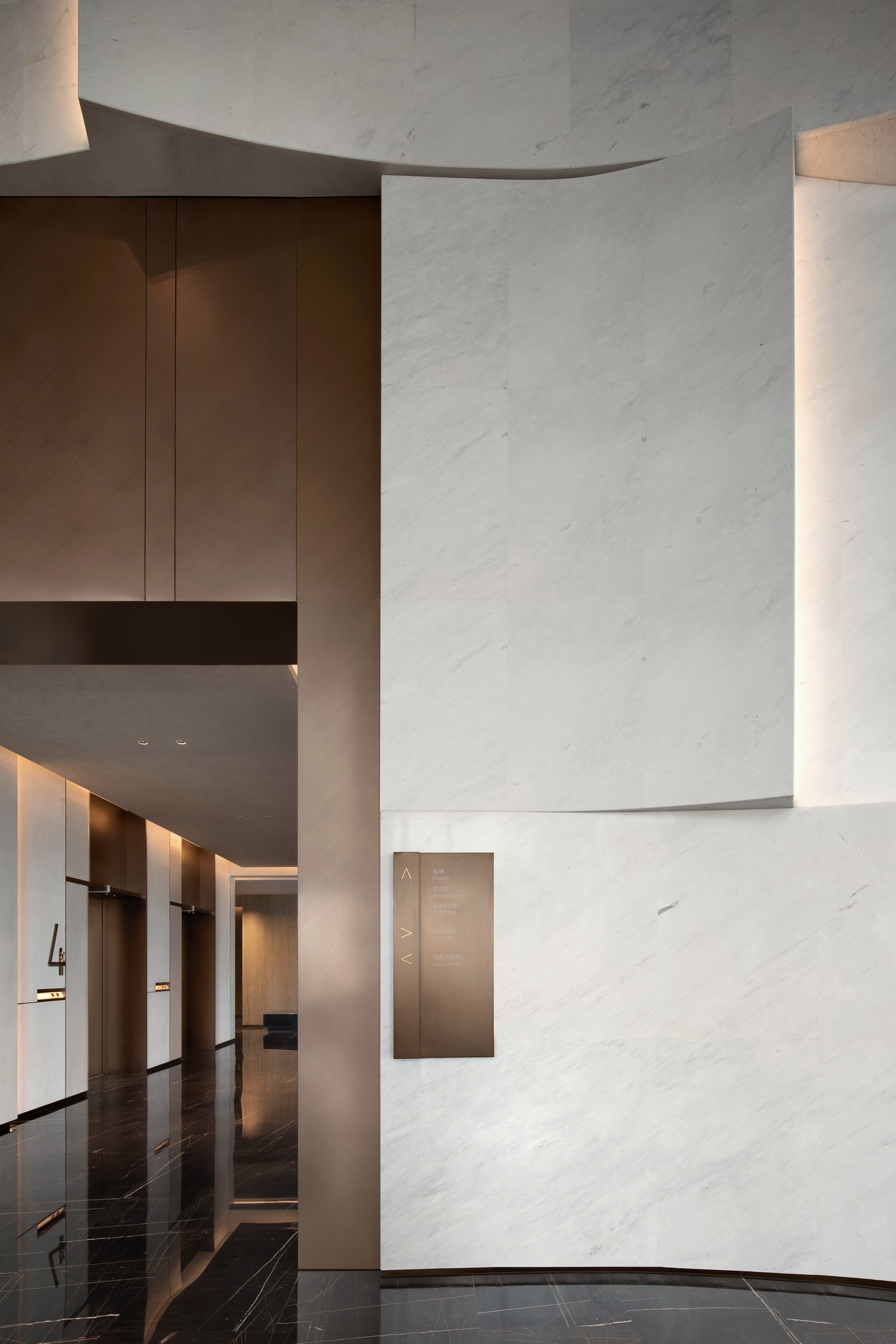 The interior design values both beauty and practicality. Sofas and long tables in the lobby lounge can be either combined or scattered to meet the requirements both for business meetings and leisure gatherings. Inspired by a propeller spinning around in sea water, the artistic pendant lights weaken the sense of distance of the 8.85-meter-high ceiling while enhancing the quality of the space.