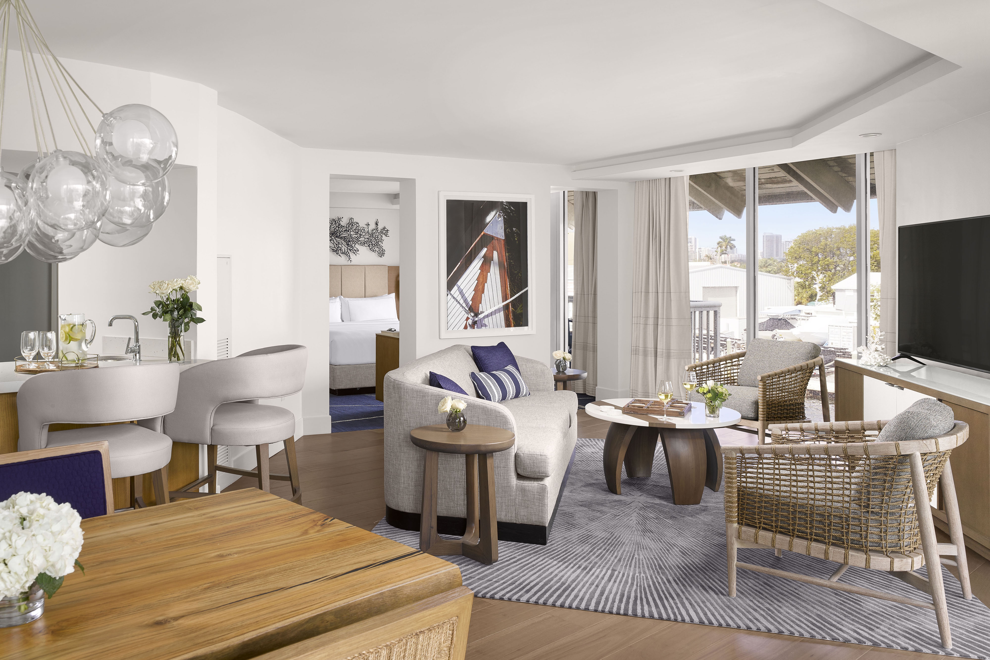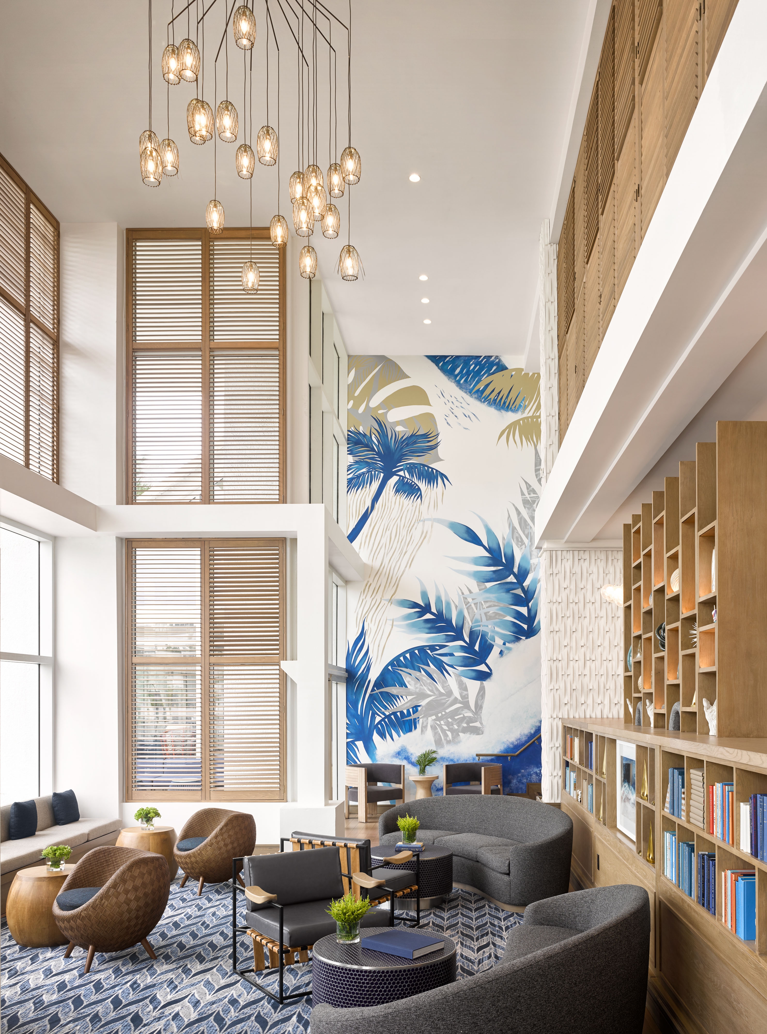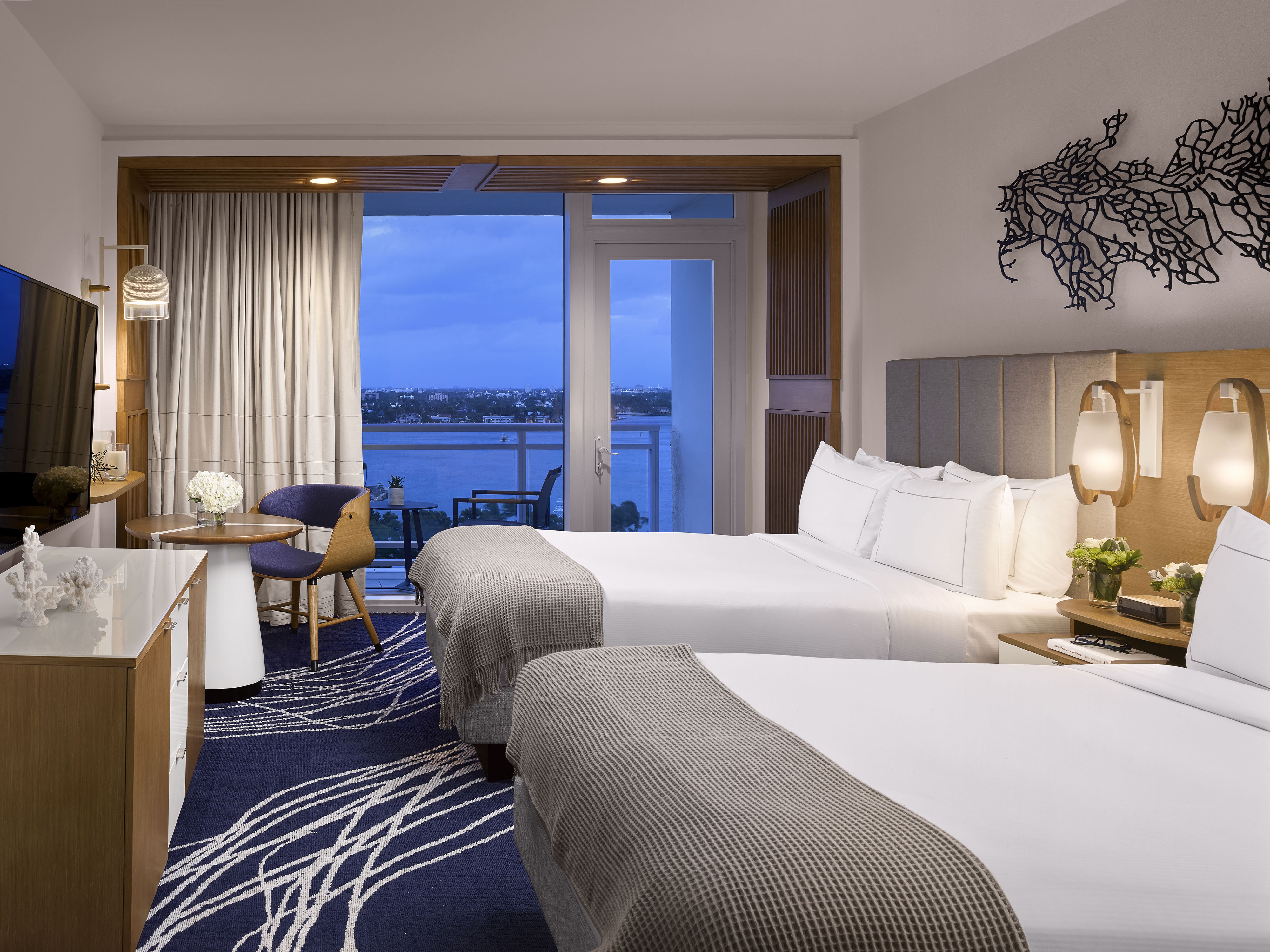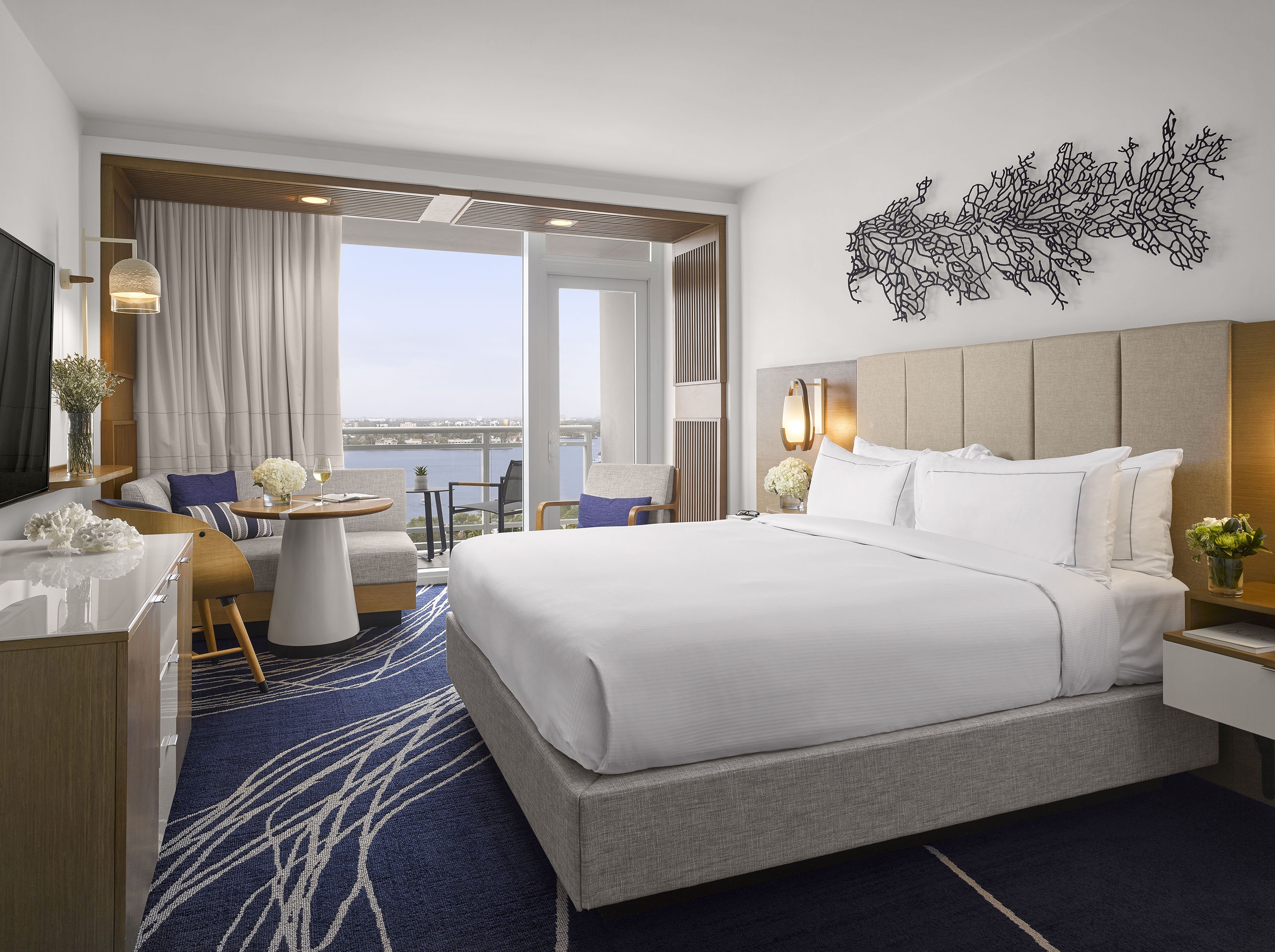Ft. Lauderdale has a strong, rich connection with the exciting and cosmopolitan world of yachting. Bringing this inspiration into the project offered an opportunity to create a sleek definition of sophistication in both the guestrooms and public spaces. The team drew from their intelligent use of “white space” and elegantly streamlined looks. Vibrant, lush colors are inspired by the surrounding natural richness and are incorporated into the design to captivate and welcome guests. Our design mantra was for a sophisticated, crisp and bright environment that enables guests to rejuvenate in the fresh ocean breeze, the scent of salt water and the sounds of the marina. Maritime-inspired materials and finishes are used in innovative ways and grounded with our use of neutral textures and finishes accented with pops of colors: rich blue color pillows, carpet and artwork that provide just the right amount of a marine accent. Lively murals and bright carpet designs were designed and located at key welcoming location. In the guestrooms, wood slat casing around the window frames the view of the waterfront beyond.