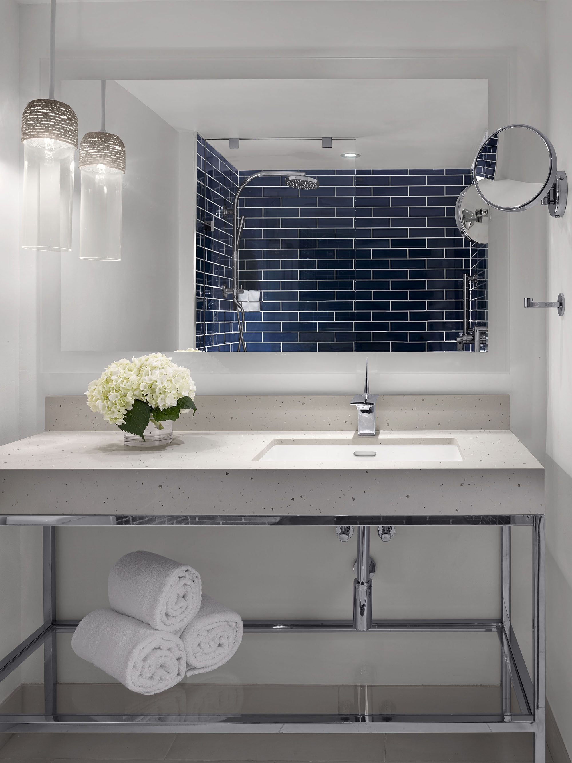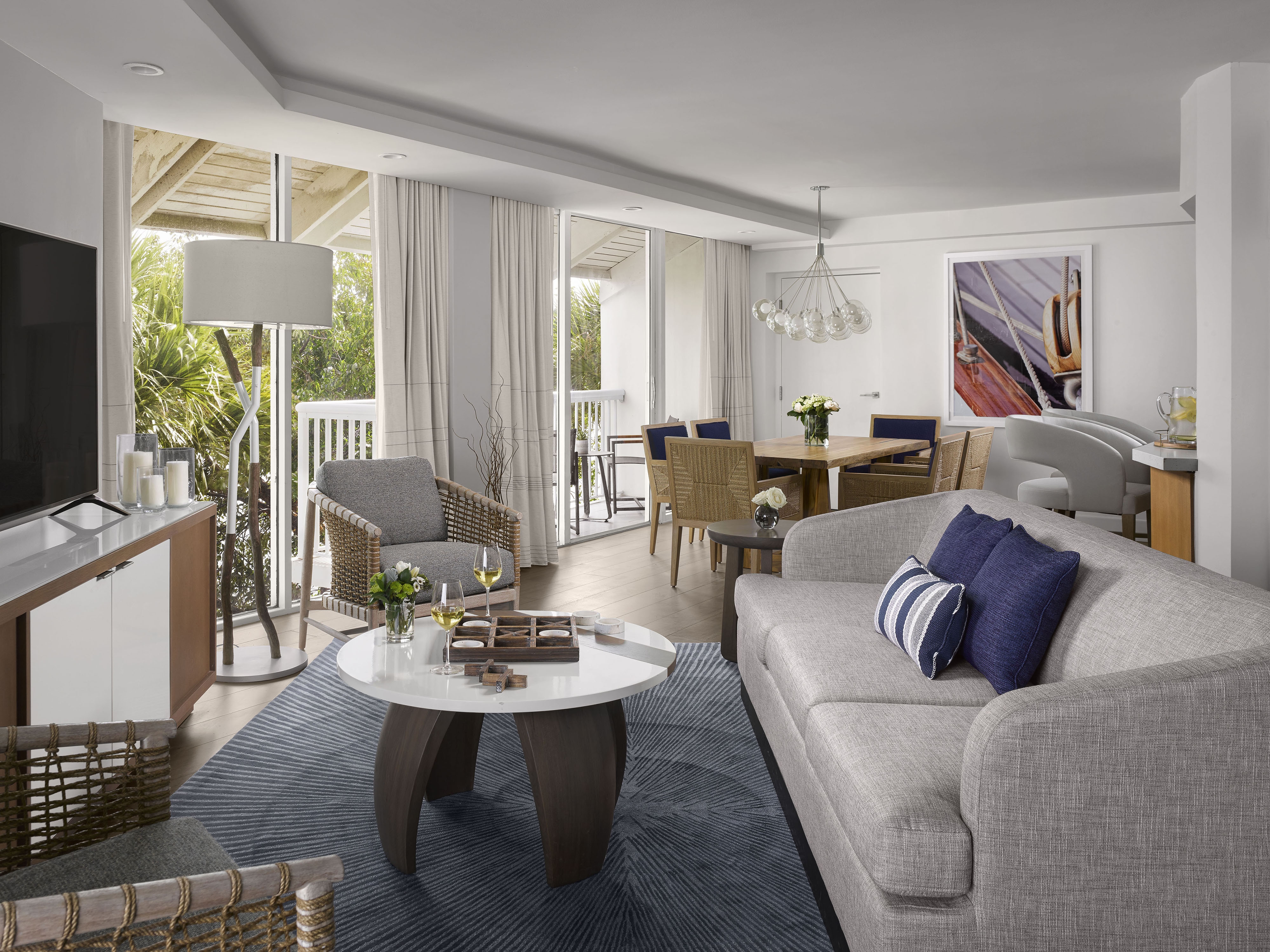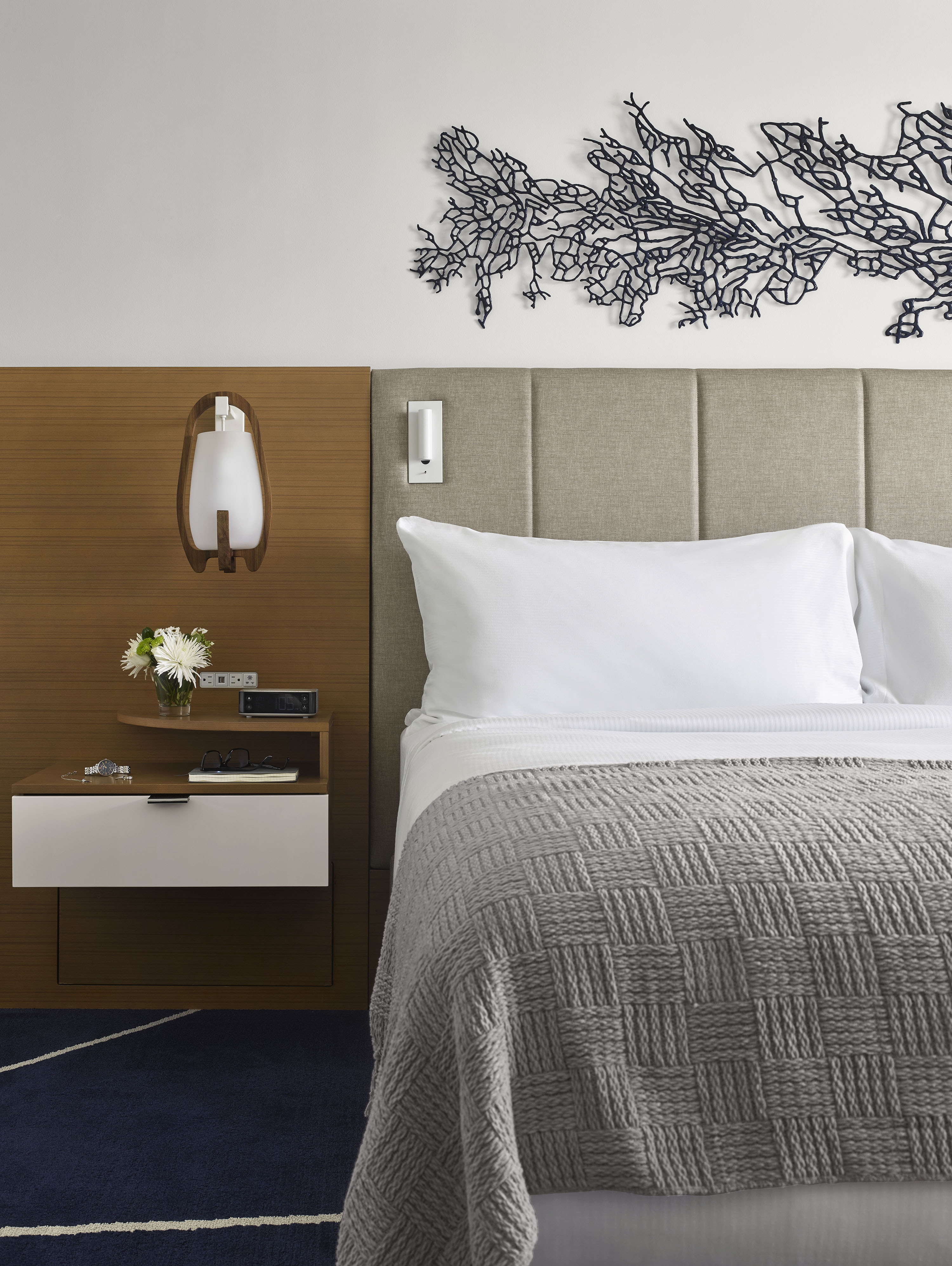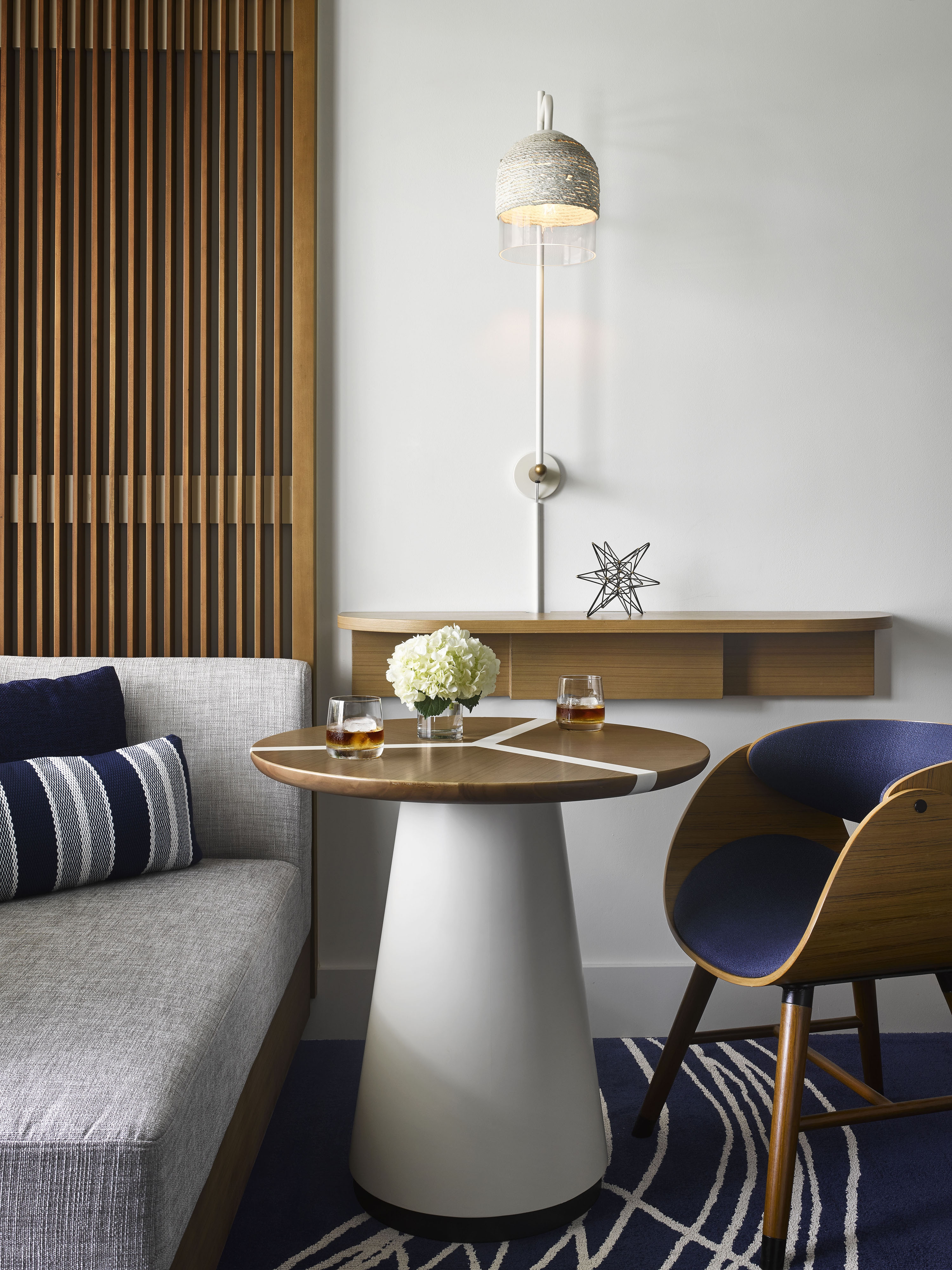 Ft. Lauderdale has a strong, rich connection with the exciting and cosmopolitan world of yachting. Bringing this inspiration into the project offered an opportunity to create a sleek definition of sophistication in both the guestrooms and public spaces. The team drew from their intelligent use of “white space” and elegantly streamlined looks. Vibrant, lush colors are inspired by the surrounding natural richness and are incorporated into the design to captivate and welcome guests. Our design mantra was for a sophisticated, crisp and bright environment that enables guests to rejuvenate in the fresh ocean breeze, the scent of salt water and the sounds of the marina. Maritime-inspired materials and finishes are used in innovative ways and grounded with our use of neutral textures and finishes accented with pops of colors: rich blue color pillows, carpet and artwork that provide just the right amount of a marine accent. Lively murals and bright carpet designs were designed and located at key welcoming location. In the guestrooms, wood slat casing around the window frames the view of the waterfront beyond.