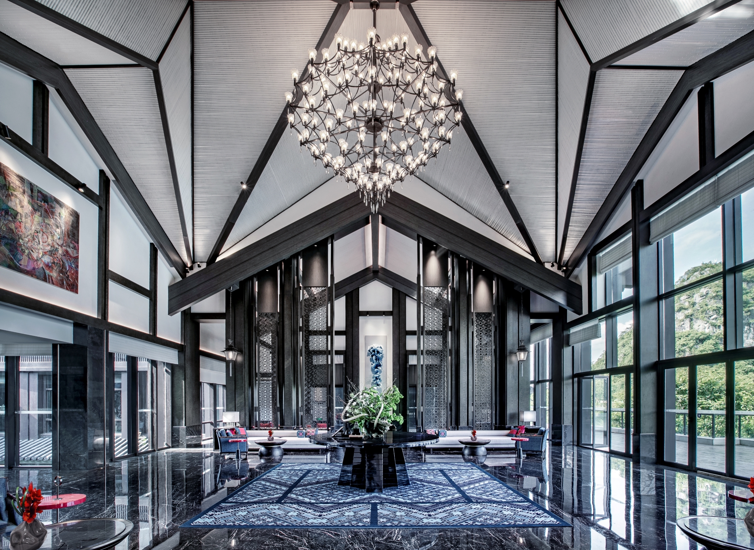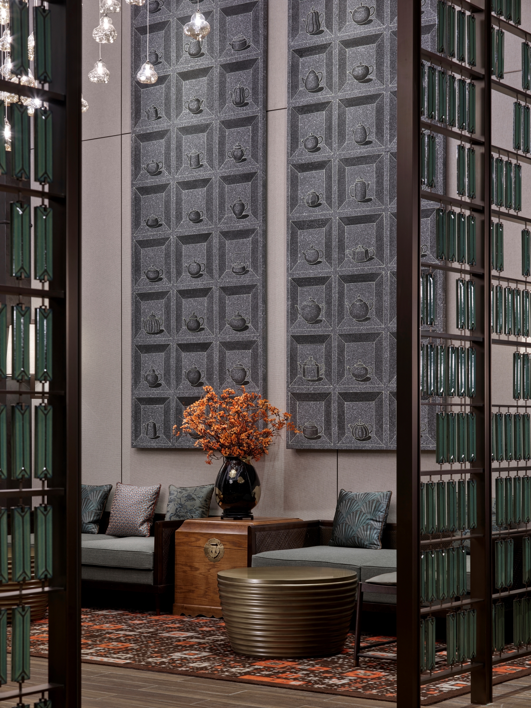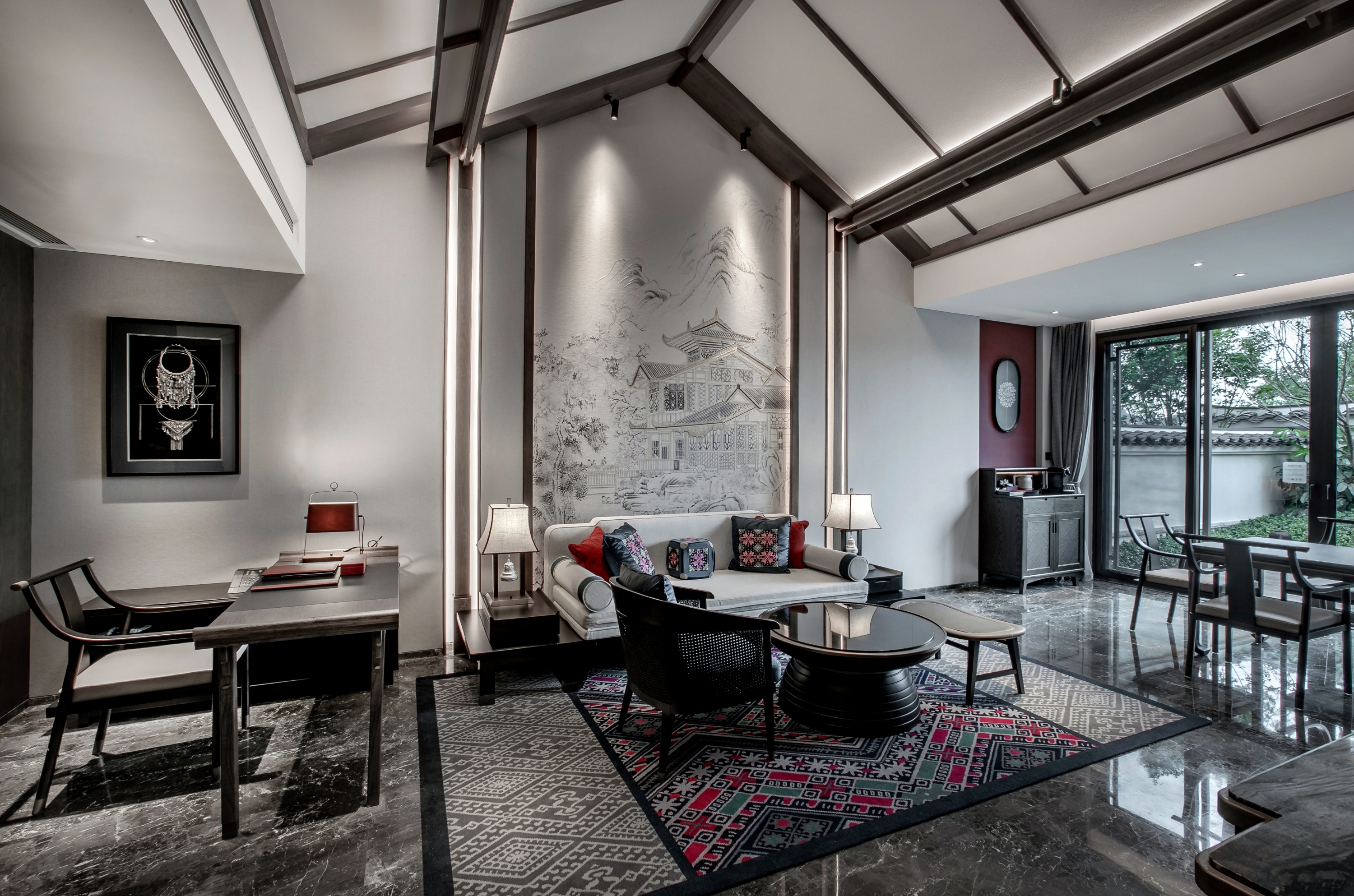 The design of the interior space of the lobby adopts the “ganlan-style” architecture to render its aesthetics. Wandering inside, you will observe its grandeur and beauty. The tiered space layout will present you with changing scenes and comfort. The screen shape of the vertical space is derived from brocade patterns. The gorgeous lighting is inspired by the shape of silver flower-shaped headpiece, and drum tower. The soft outfit is brightly colored, with an emphasis on showing the ethnic embroidery craftsmanship and artistic colors.