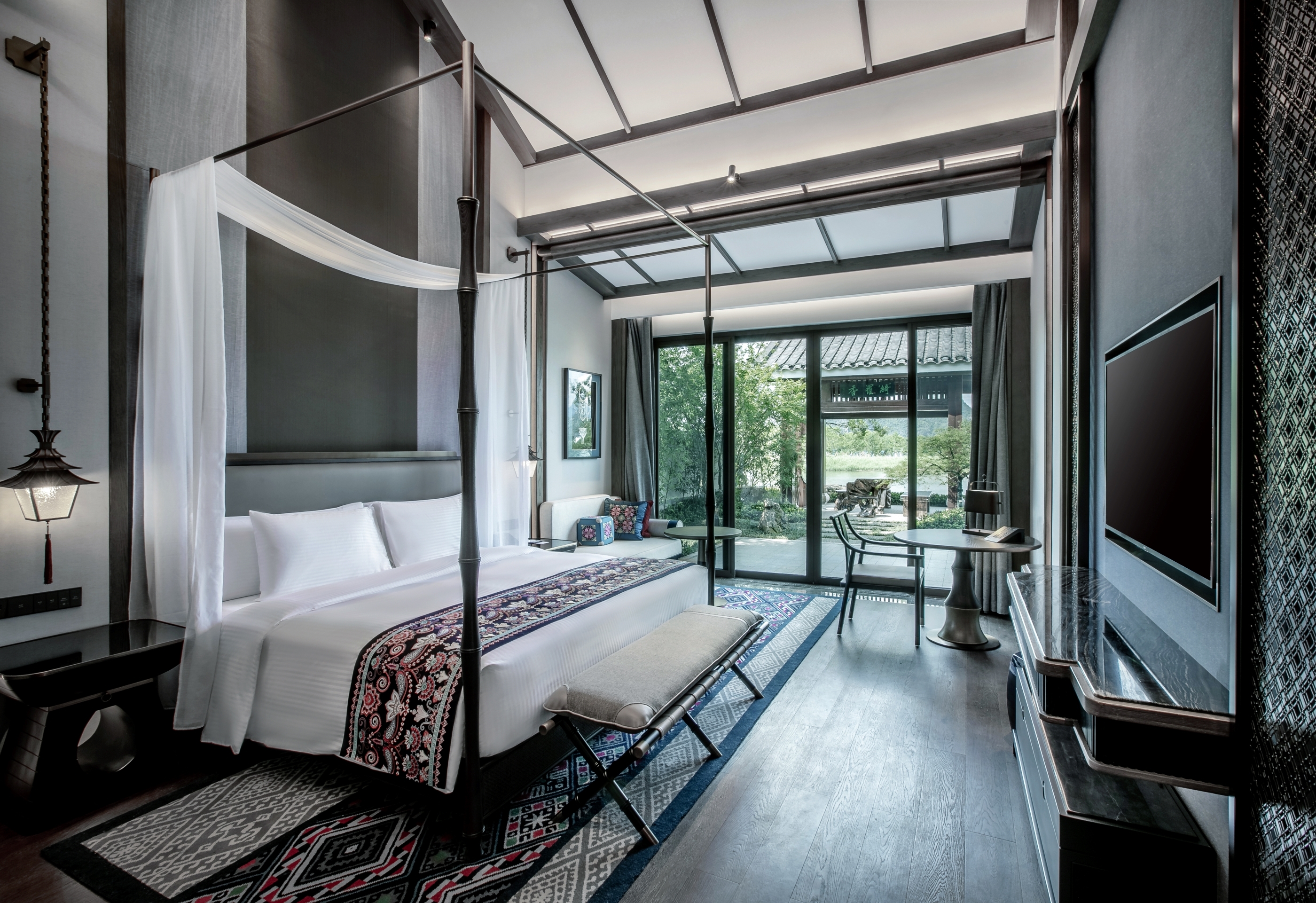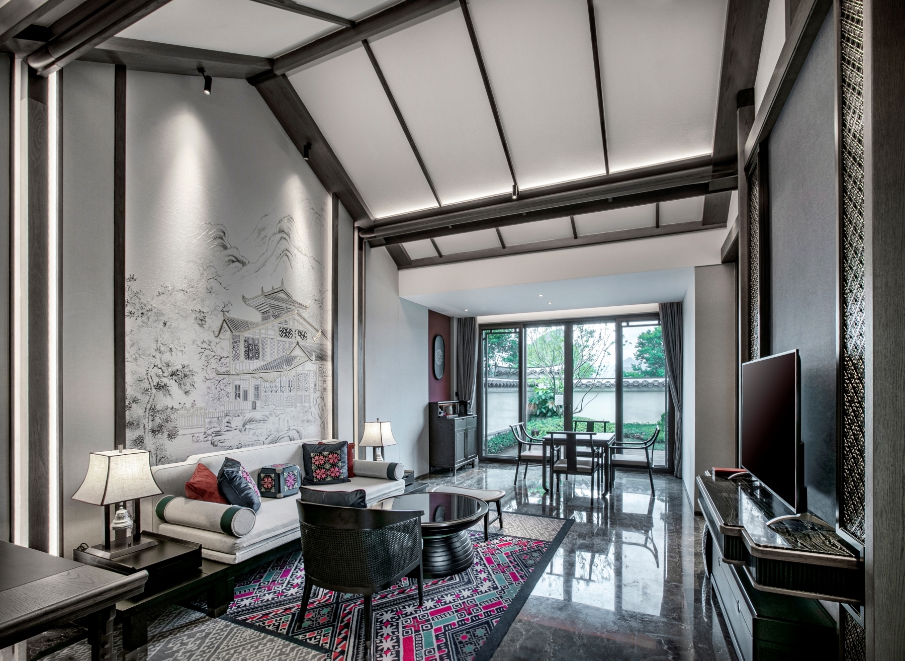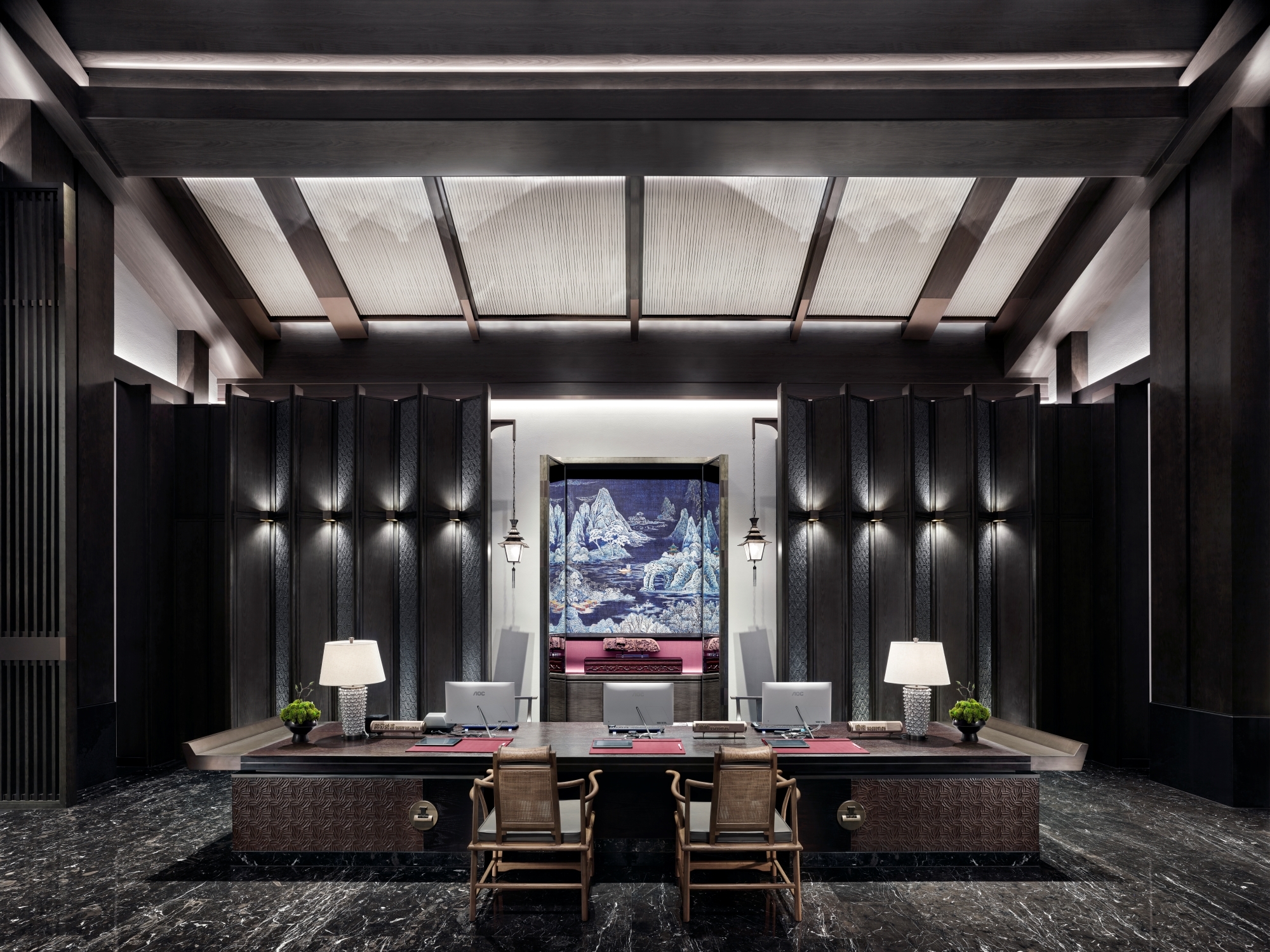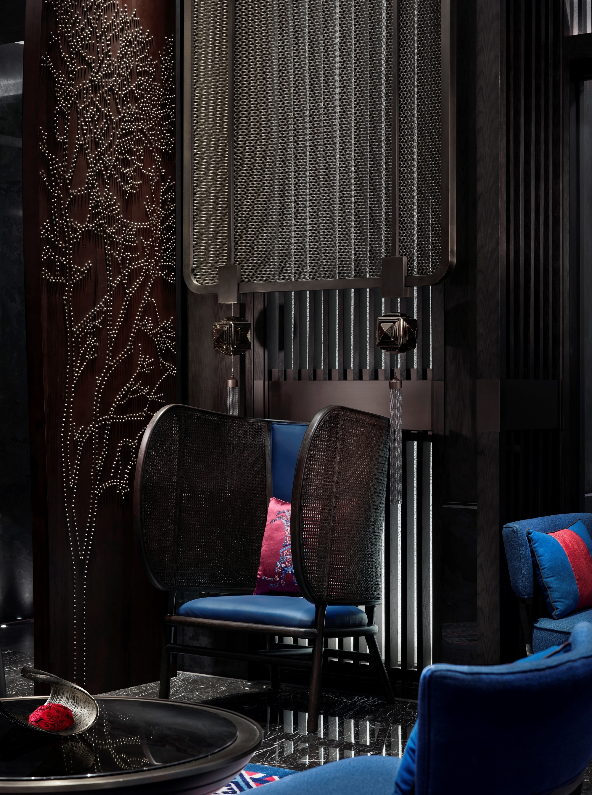 The design of the interior space of the lobby adopts the “ganlan-style” architecture to render its aesthetics. Wandering inside, you will observe its grandeur and beauty. The tiered space layout will present you with changing scenes and comfort. The screen shape of the vertical space is derived from brocade patterns. The gorgeous lighting is inspired by the shape of silver flower-shaped headpiece, and drum tower. The soft outfit is brightly colored, with an emphasis on showing the ethnic embroidery craftsmanship and artistic colors.