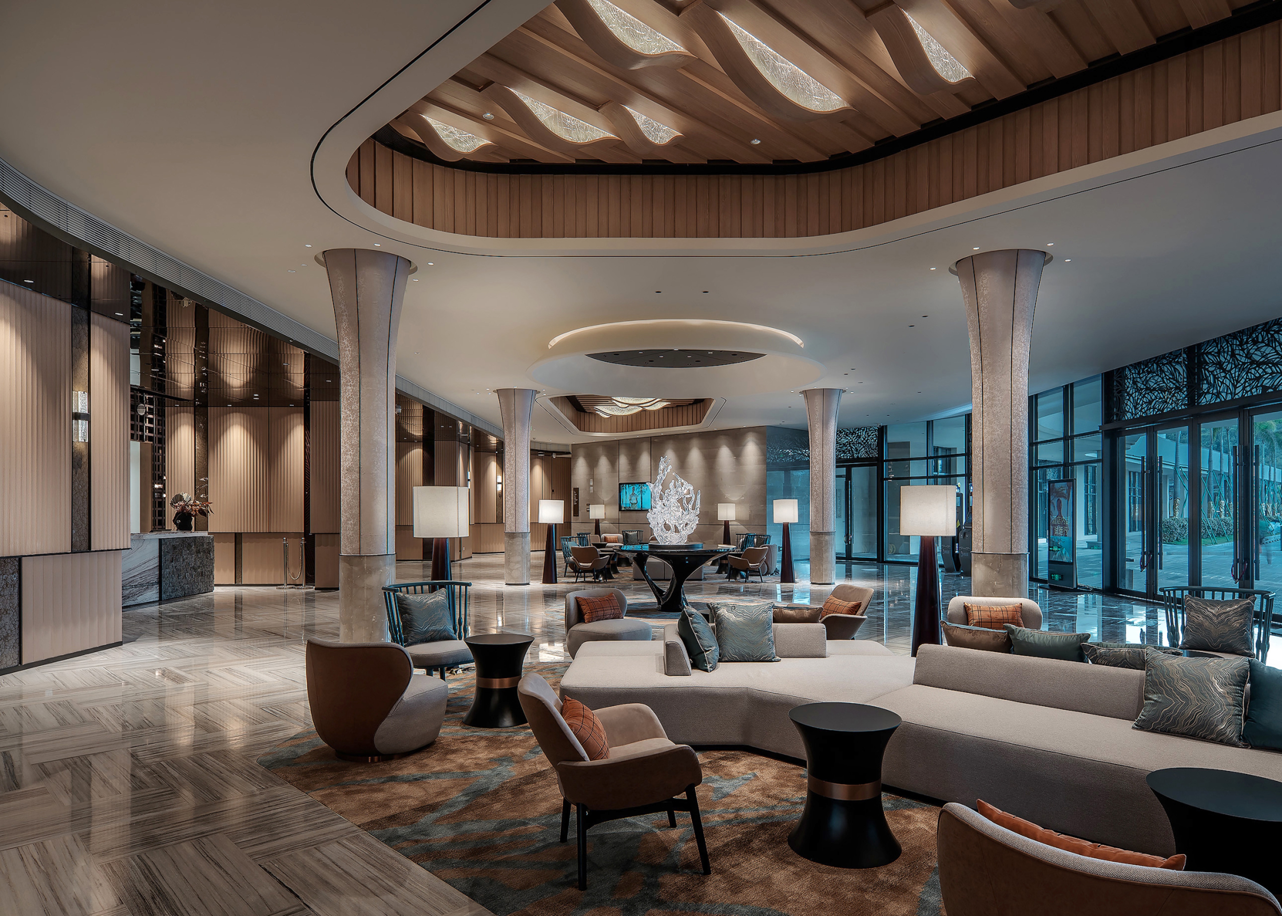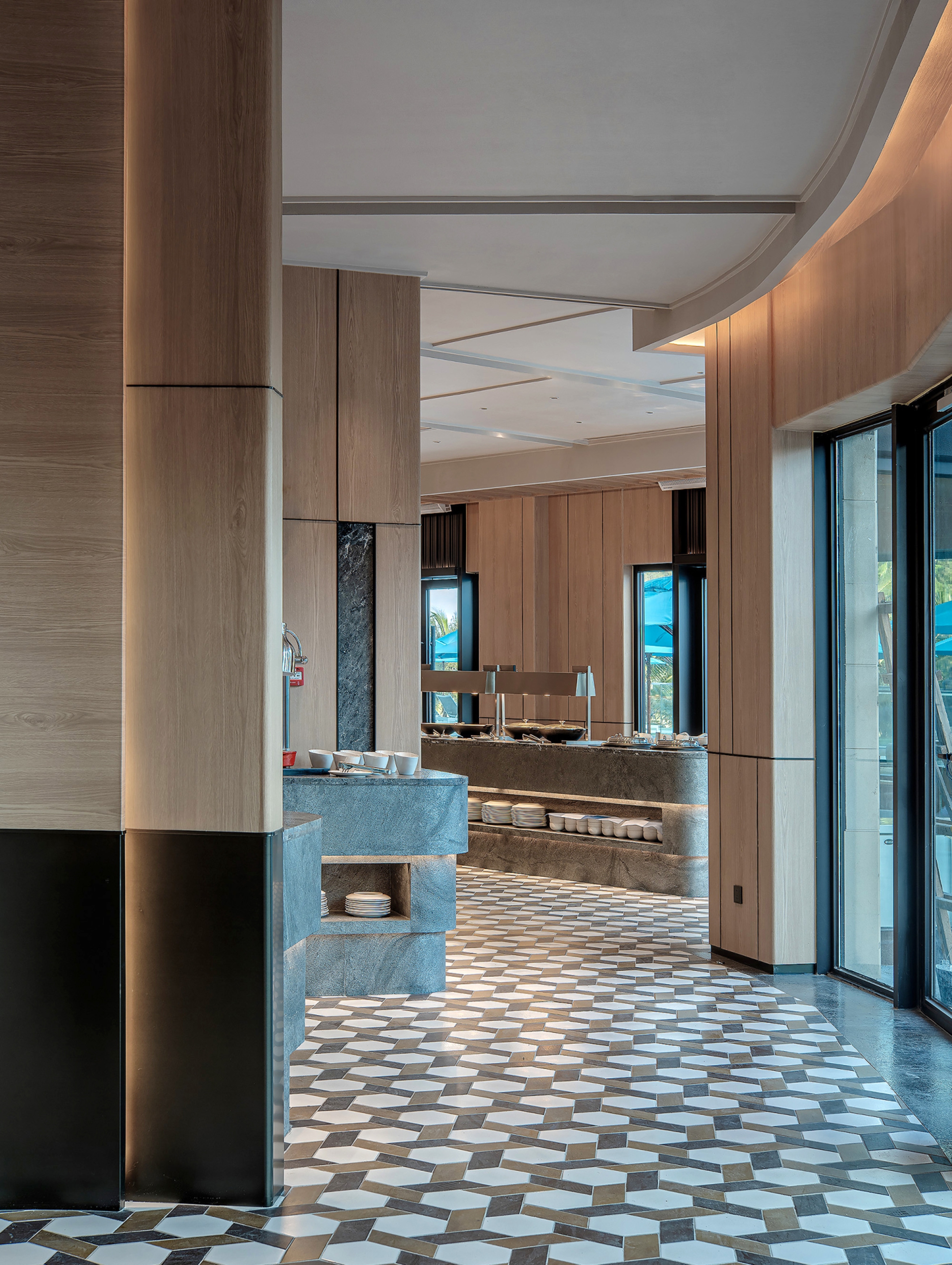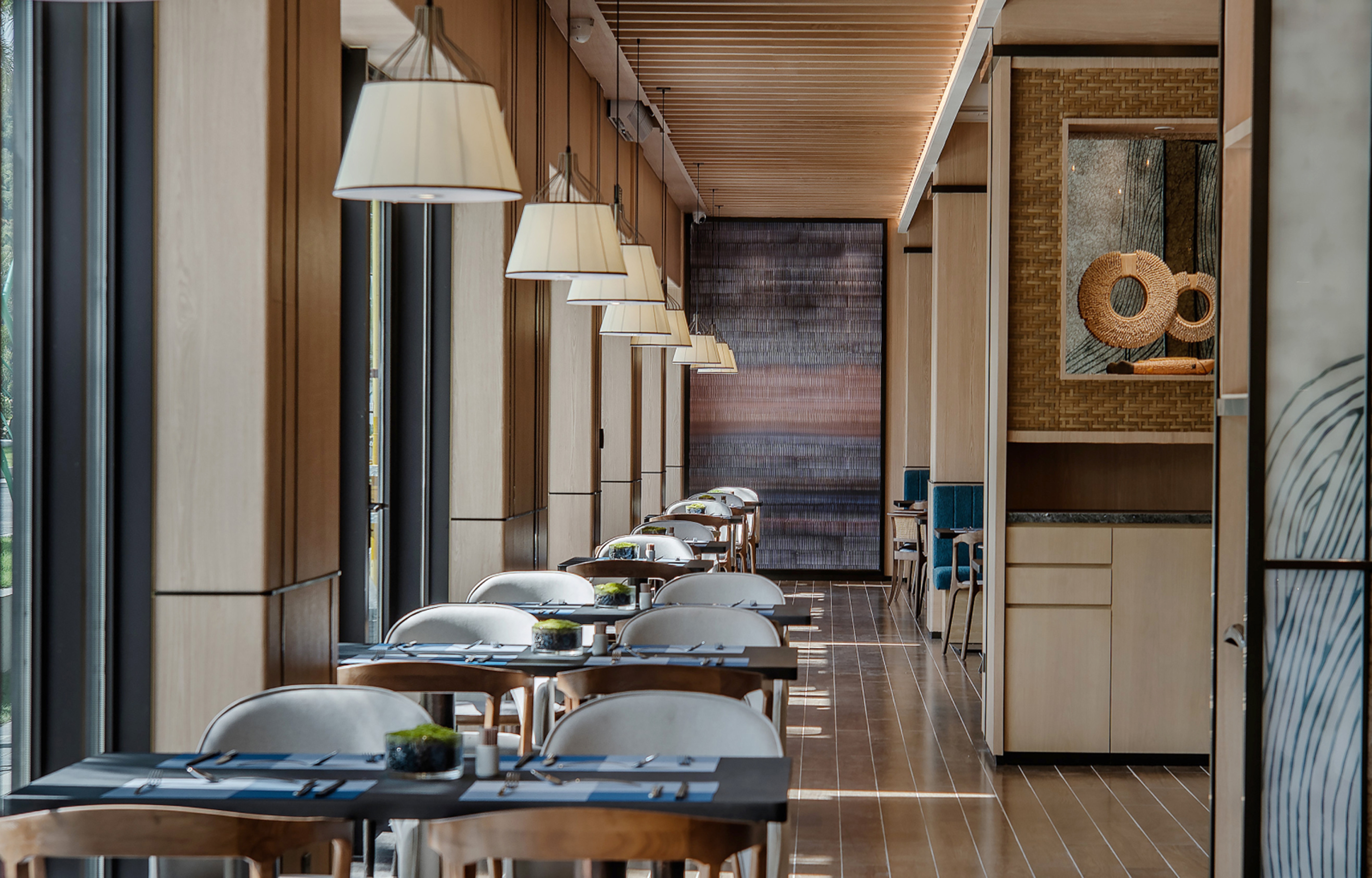 As one of the ten most beautiful islands in China, Hailing Island has idyllic scenery like a paradise and cultural customs full of fisherman culture. Grass wrapped in the fragrance of soil; Neat and orderly, like ridges waiting for farmers to review; The industrious figure of sunrise and sunset in the field; Green bricks and grey tiles full of years; From far to near, or virtual or real mountains... The sea looms, accompanied by the fisherman's spark in the eye of the bright moon... A charming and vibrant fishing boat singing night is played one by one. The design creativity of this case is extracted from the local culture and fully integrated into the hotel lobby and restaurant space. It is planned to build the hotel into a tourist card of Hailing Island and arouse tourists' desire to explore Hailing Island, which is the core concept in the design concept.