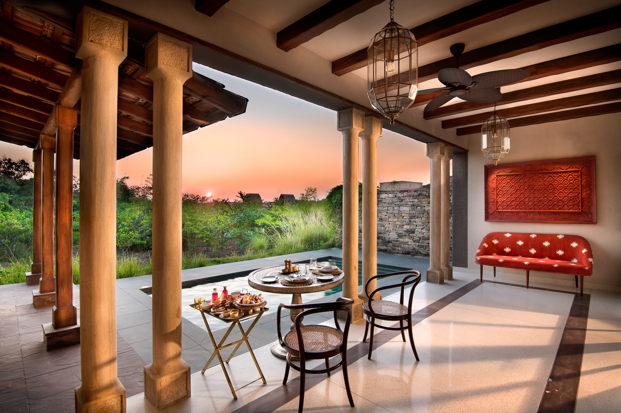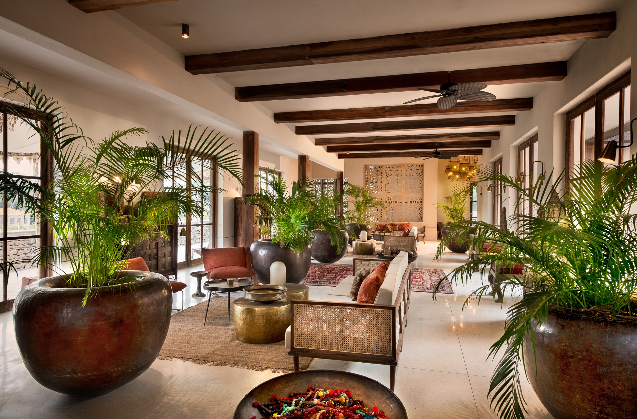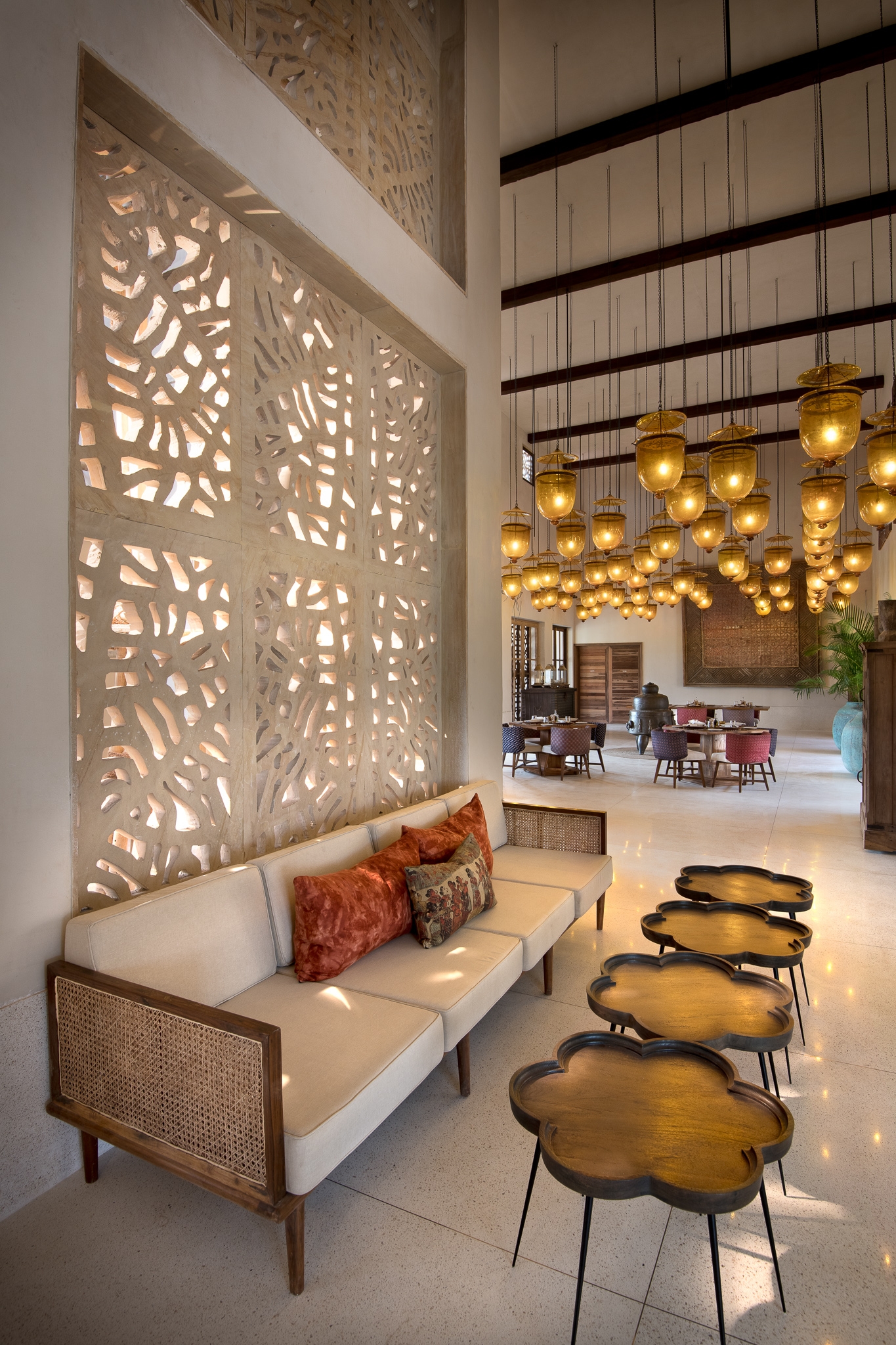 The brief was to design simple, sophisticated and unpretentious spaces that give the guests an unmistakable sense of place and pared-back luxury. Honest materials such as limestone cladding, traditional stucco plaster, moulded terrazzo, Indian teak, sandstone and marble inform the look and feel of the interiors. Similarly, our colour palette is drawn from the lodge’s natural context and is made up of saffron, bone and oxblood – an earthy mix that is both unpretentious and rich. Gujarat’s iconic quotidian elements feature throughout like charpoys (day beds), fabric printing blocks, reclaimed, hand-carved timber doors, vintage textiles, Gujarati dowry chests and more. Dramatic hand-carved sandstone jali screens are a traditional element of design, inspired by the perforations of dried sal (teak) leaves in the surrounding forest. The result is distinctly design-led and sophisticated, using simplicity and subtlety to convey its message and give guests a taste of authentic India within the context of comfort and luxury. Drawing from a unique village concept, it’s loaded with local cultural references but is consciously restrained with a modern sensibility.