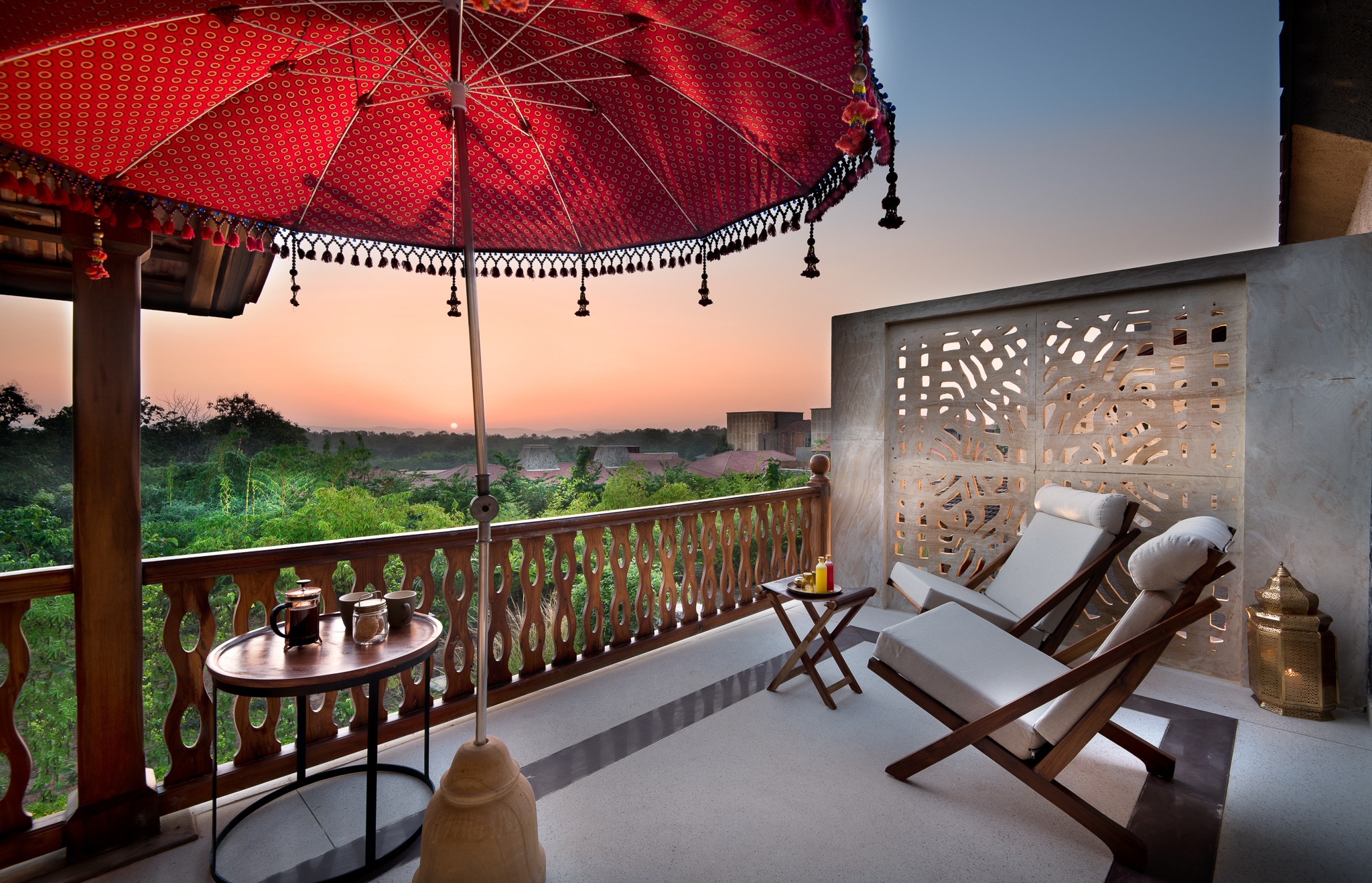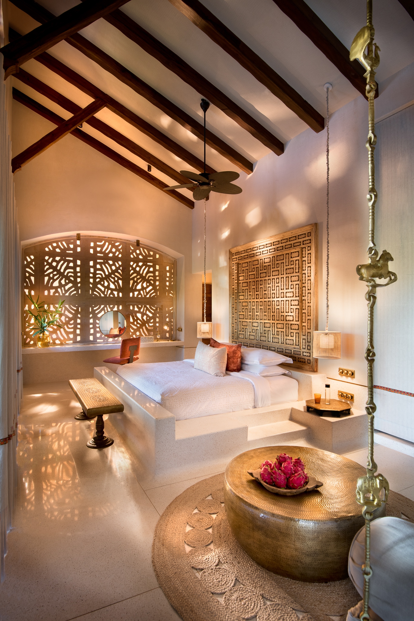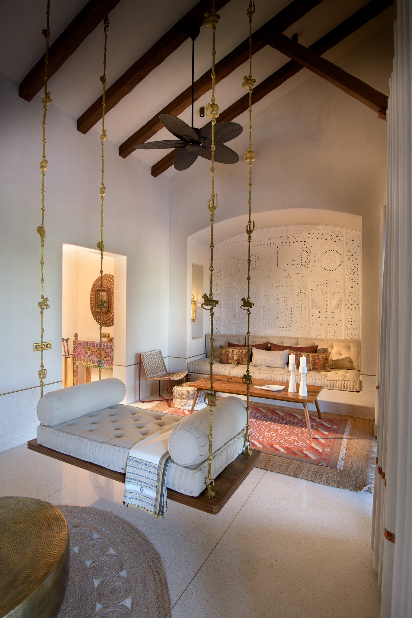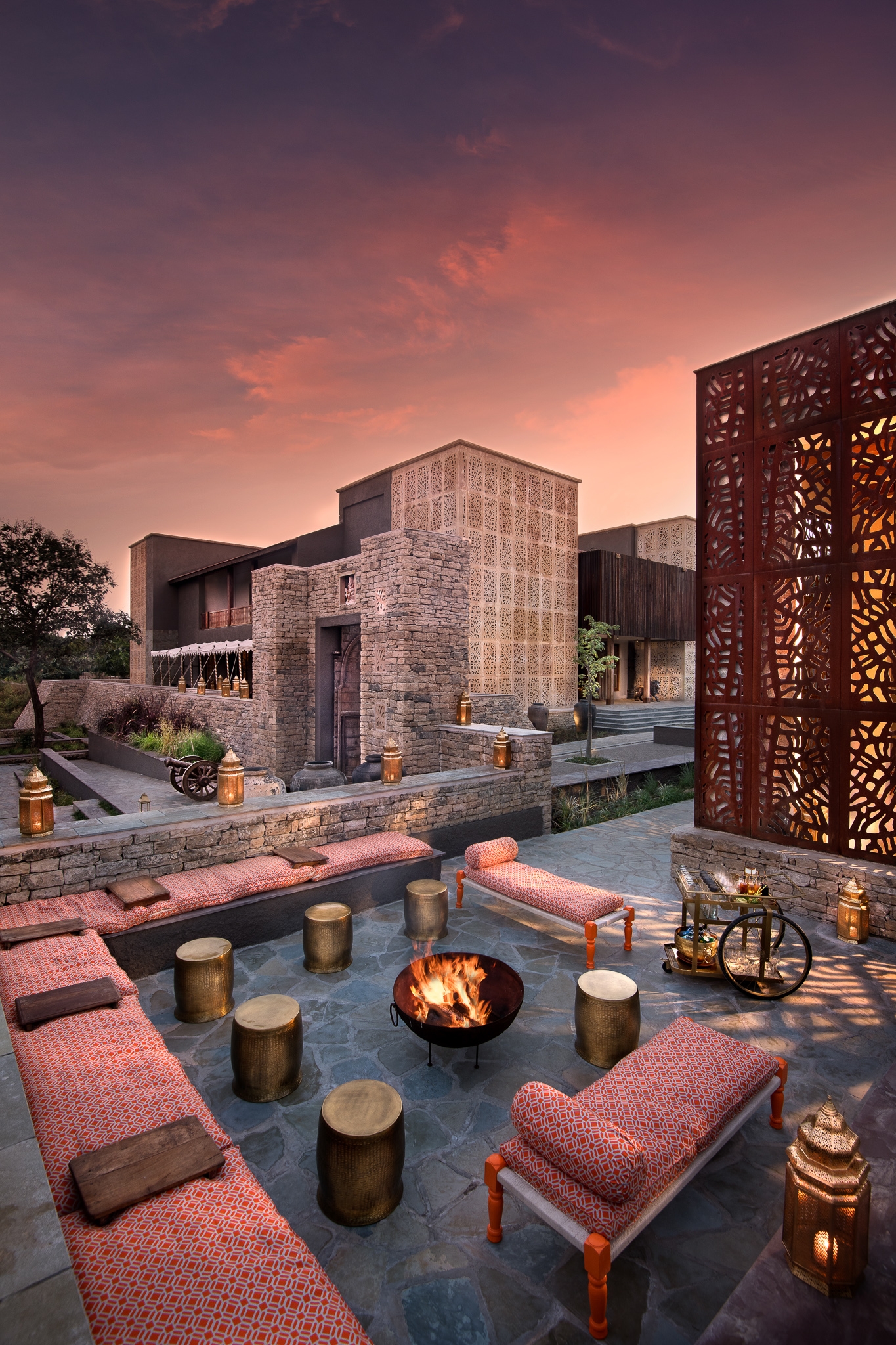 The brief was to design simple, sophisticated and unpretentious spaces that give the guests an unmistakable sense of place and pared-back luxury. Honest materials such as limestone cladding, traditional stucco plaster, moulded terrazzo, Indian teak, sandstone and marble inform the look and feel of the interiors. Similarly, our colour palette is drawn from the lodge’s natural context and is made up of saffron, bone and oxblood – an earthy mix that is both unpretentious and rich. Gujarat’s iconic quotidian elements feature throughout like charpoys (day beds), fabric printing blocks, reclaimed, hand-carved timber doors, vintage textiles, Gujarati dowry chests and more. Dramatic hand-carved sandstone jali screens are a traditional element of design, inspired by the perforations of dried sal (teak) leaves in the surrounding forest. The result is distinctly design-led and sophisticated, using simplicity and subtlety to convey its message and give guests a taste of authentic India within the context of comfort and luxury. Drawing from a unique village concept, it’s loaded with local cultural references but is consciously restrained with a modern sensibility.