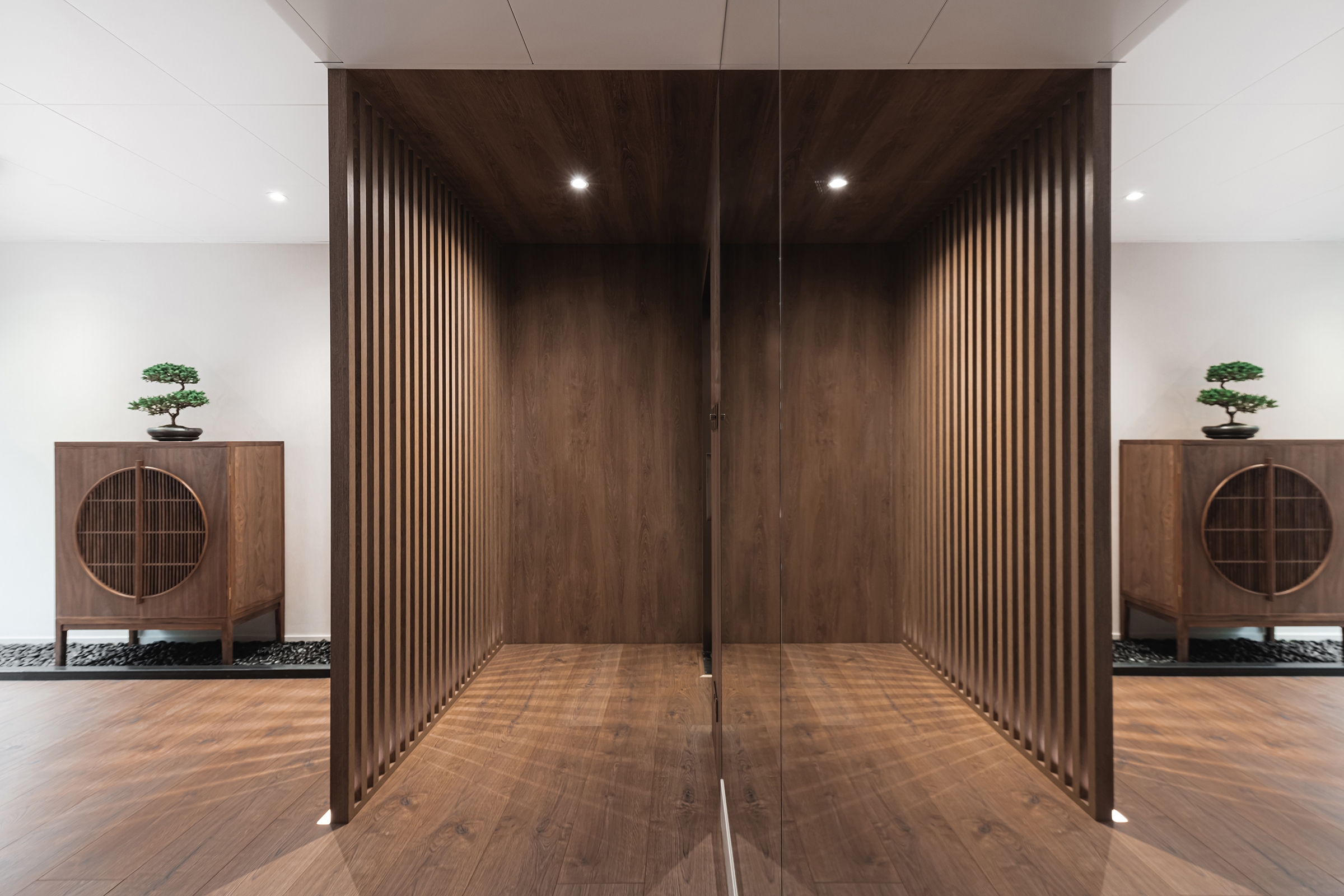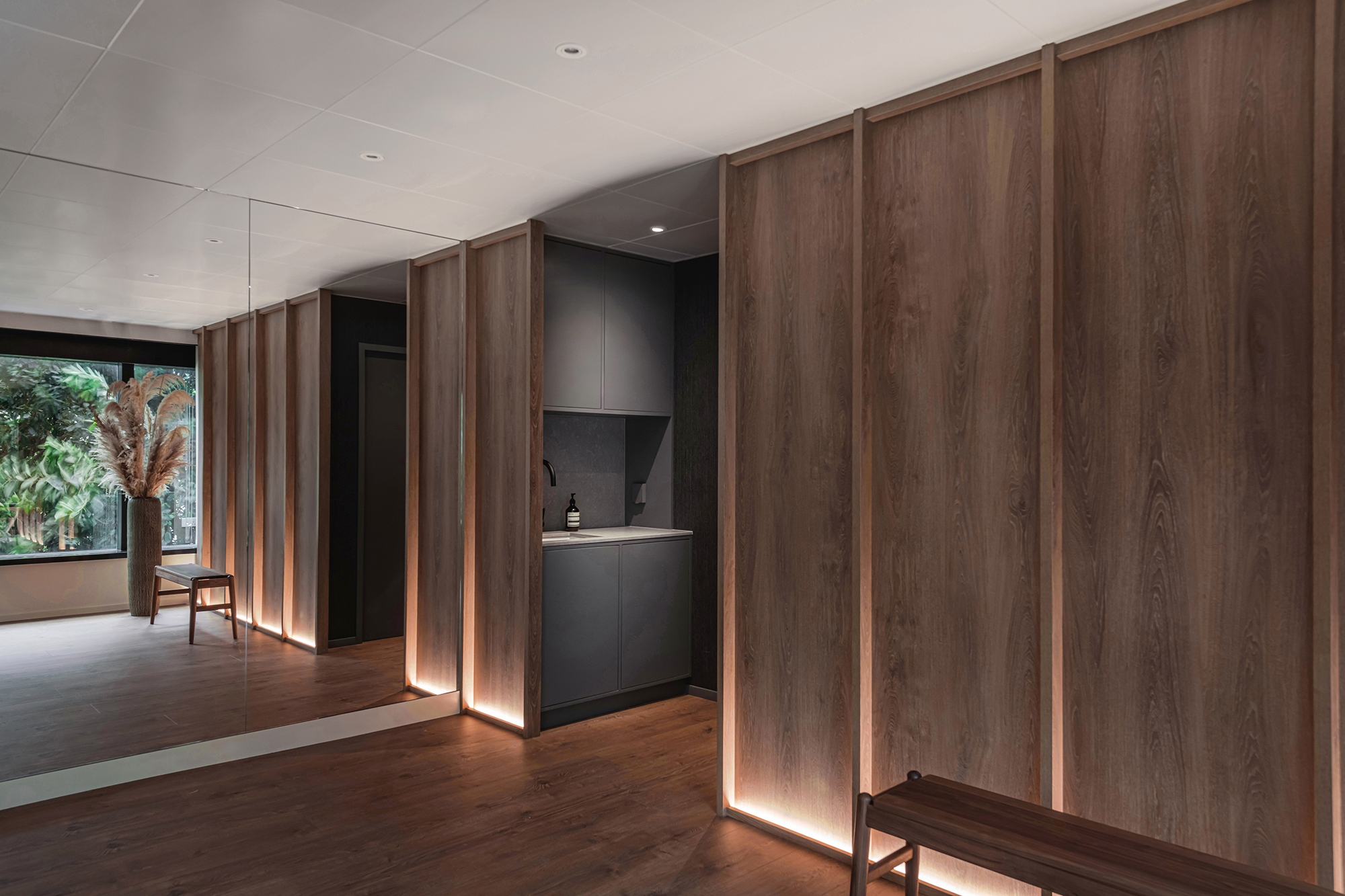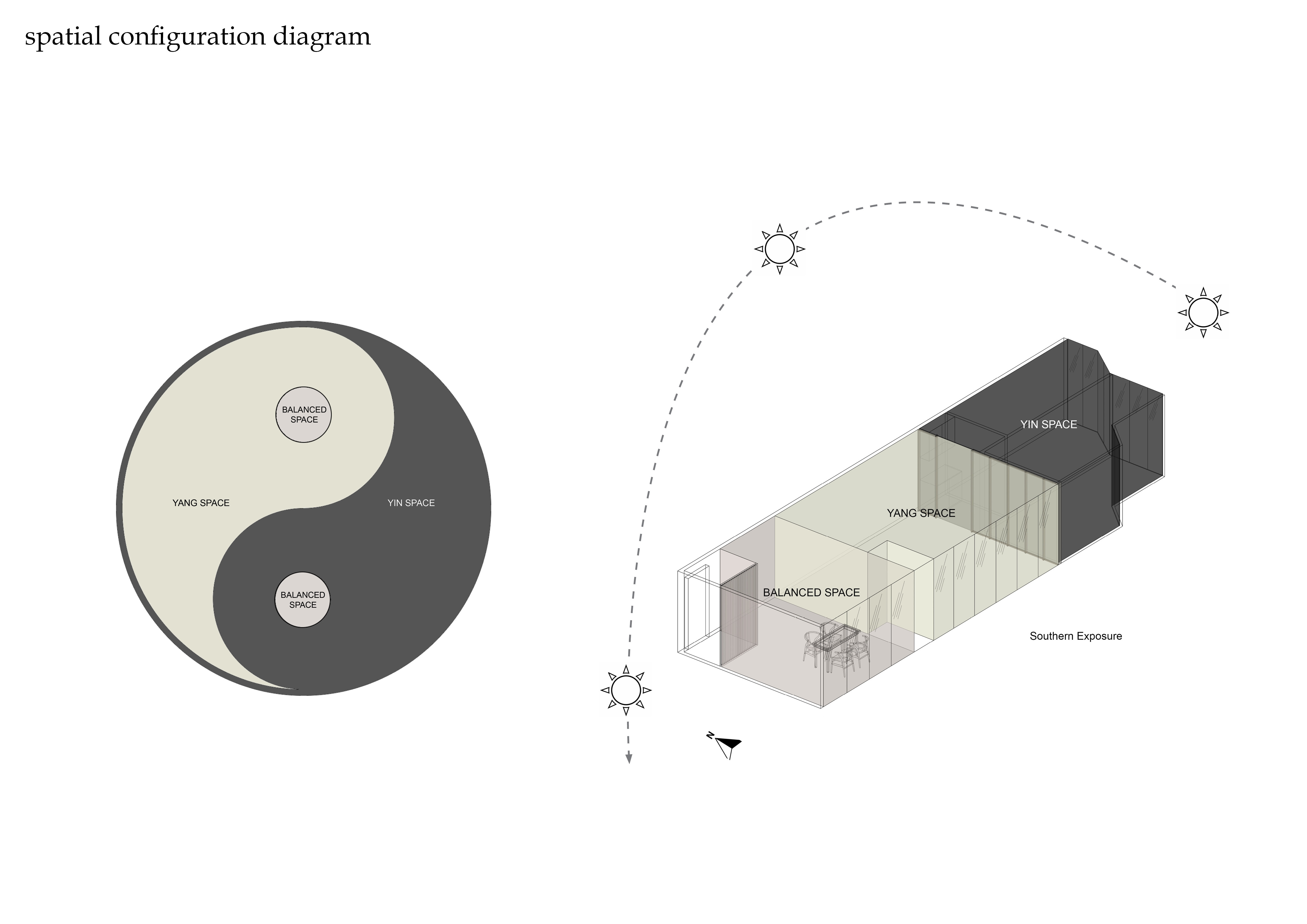 The floorplan represents 2 diametrically opposed forces: Yin and Yang, informed by daylighting. 'Yang' space, receiving the most natural sunlight due to its Southern Exposure, accommodates group training, while 'Yin' space, more subdued, cater to traditional holistic treatments. Tai Chi is practiced in parks during the morning so the studio, likewise, simulates this by allowing in ample daylight throughout the day, modulated by smart lighting, and by evoking morning mist in a forest via an uplit wooden wall. An intermediary 'Balanced' space represents a tea room where guests from both spaces mingle.