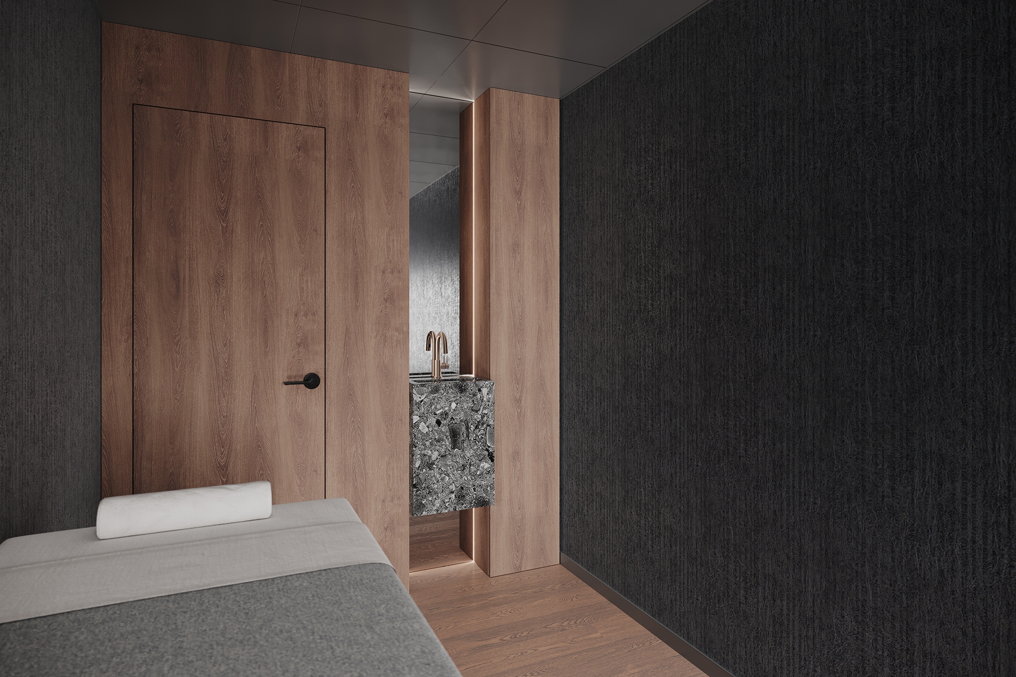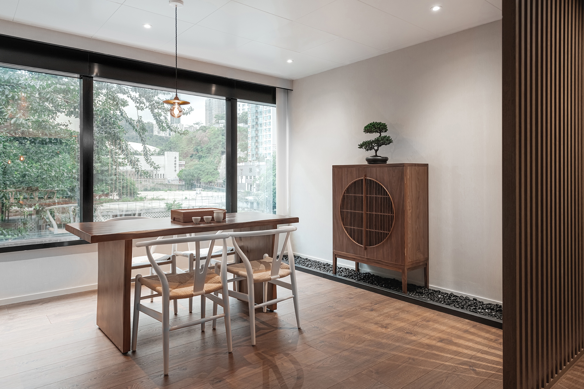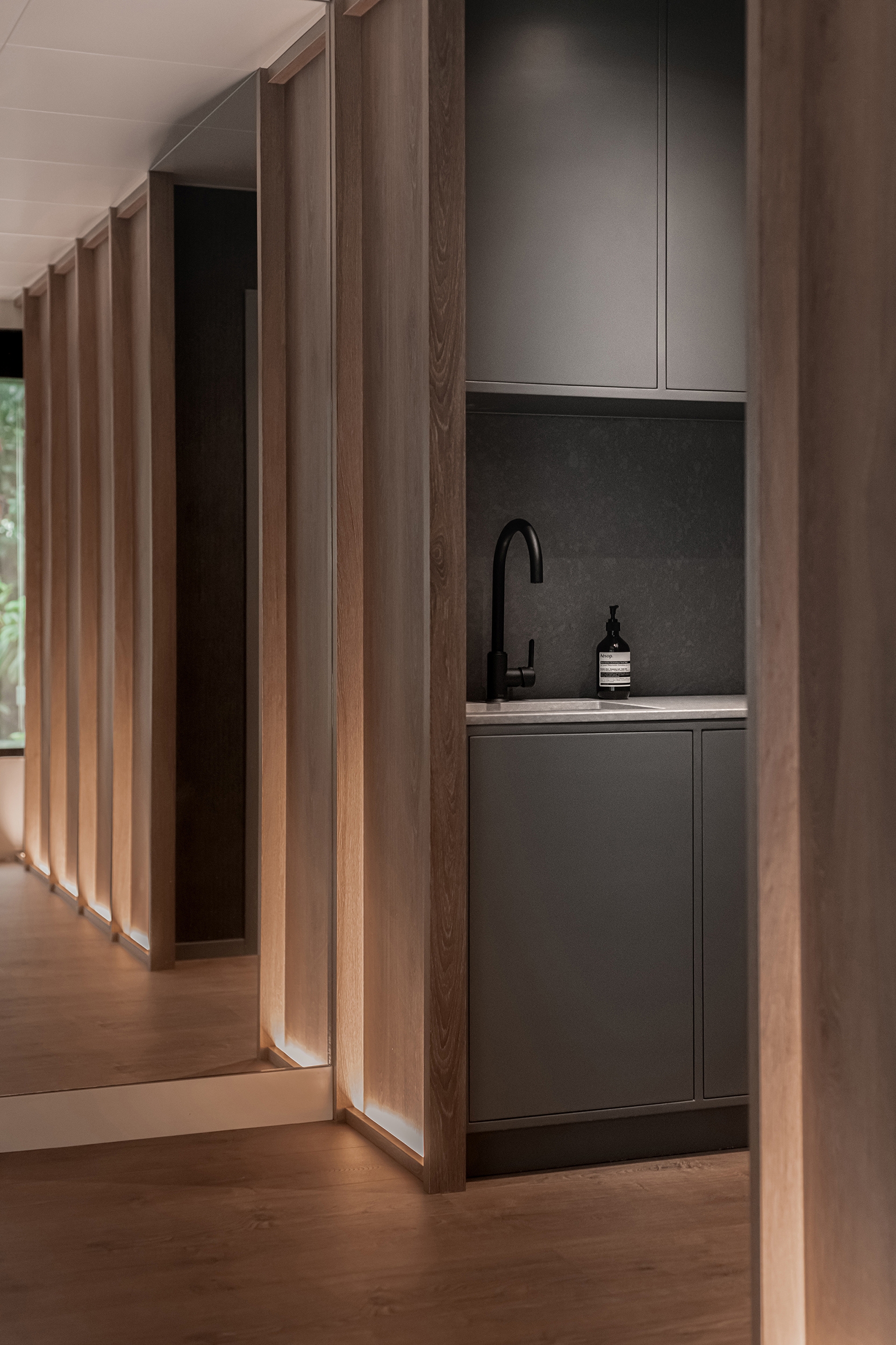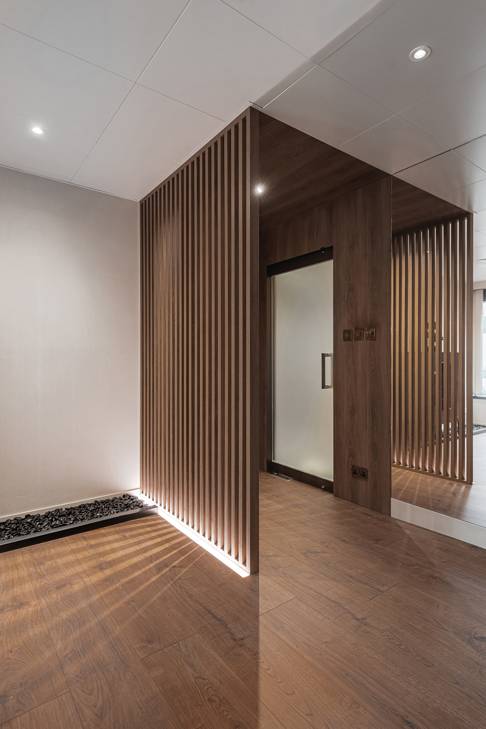 The floorplan represents 2 diametrically opposed forces: Yin and Yang, informed by daylighting. 'Yang' space, receiving the most natural sunlight due to its Southern Exposure, accommodates group training, while 'Yin' space, more subdued, cater to traditional holistic treatments. Tai Chi is practiced in parks during the morning so the studio, likewise, simulates this by allowing in ample daylight throughout the day, modulated by smart lighting, and by evoking morning mist in a forest via an uplit wooden wall. An intermediary 'Balanced' space represents a tea room where guests from both spaces mingle.