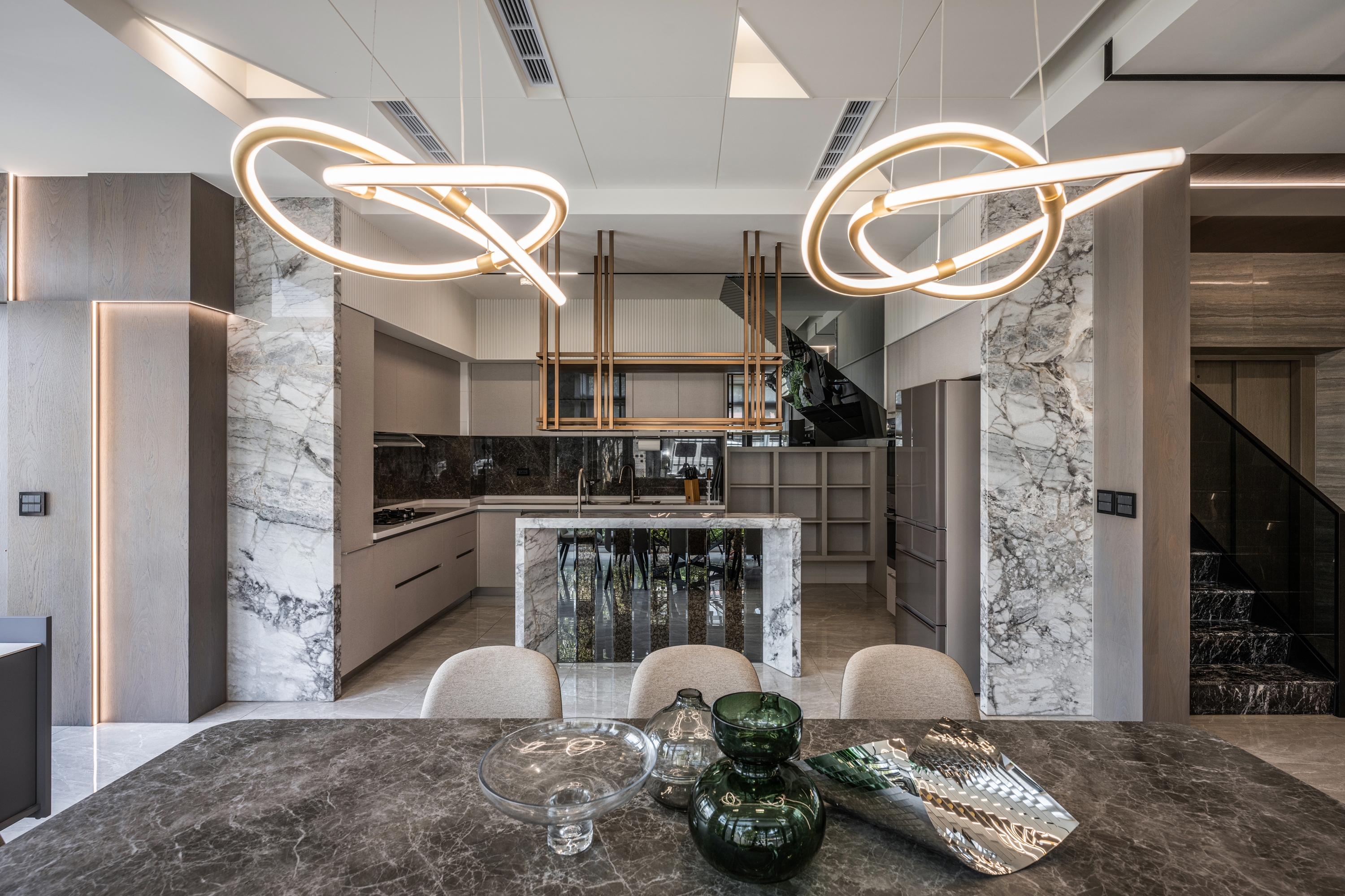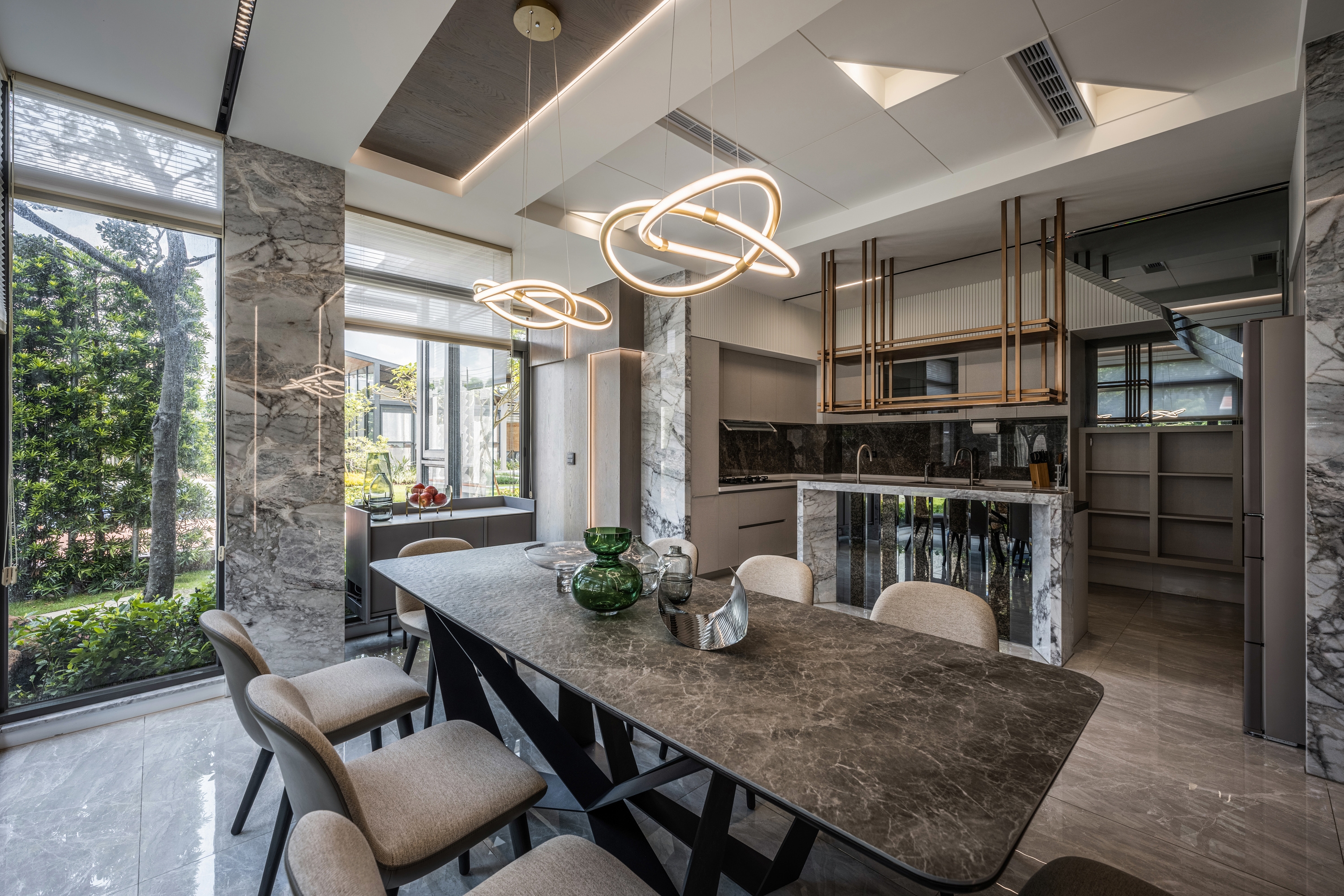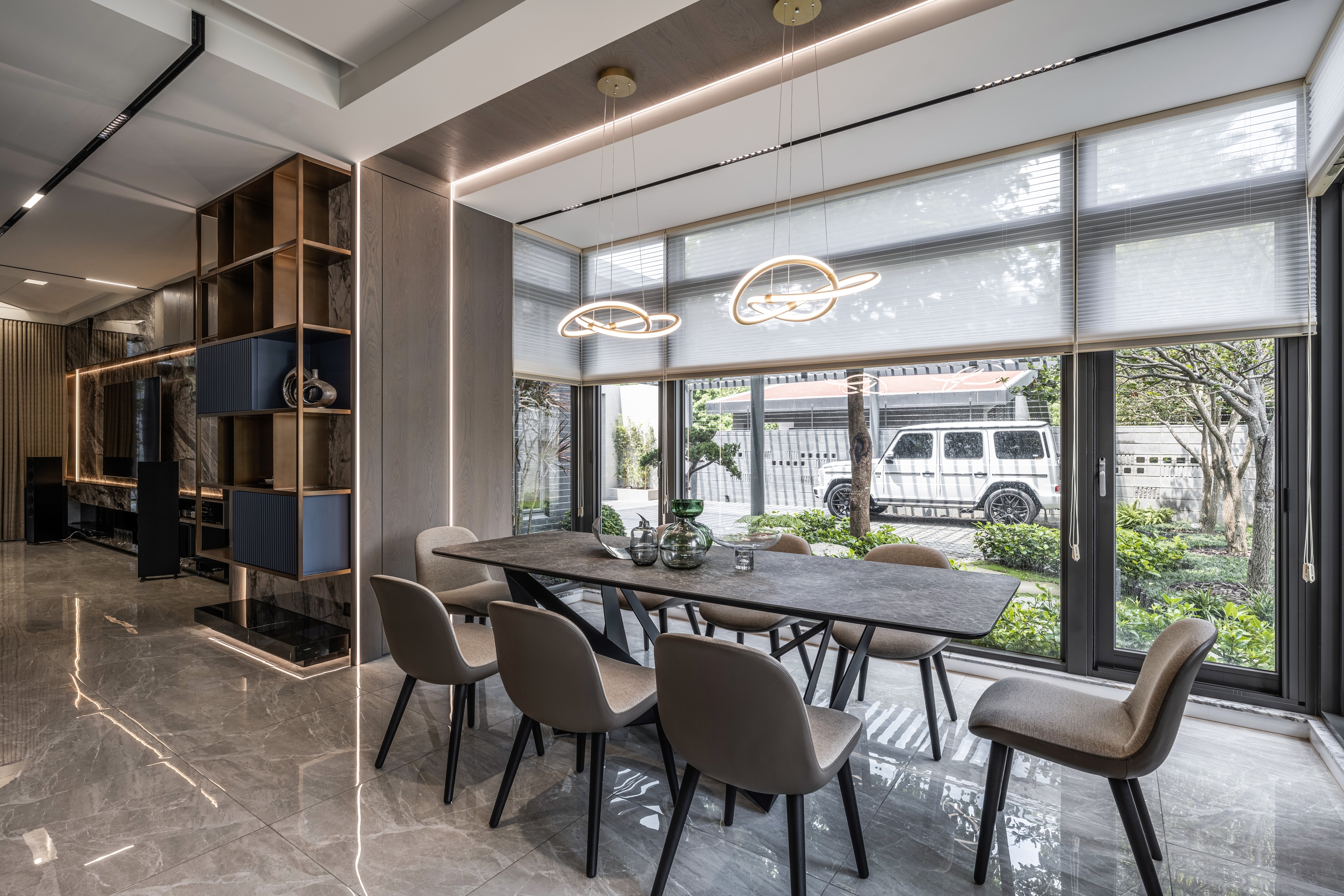 This project has a 380 square meter outdoor courtyard, and the building itself is surrounded by scenery. Therefore, the designer opens up the layout with large windows on all sides to preserve the green landscape and allow natural sunlight to enter and fill the interior. In order to make the space with light everywhere, not cutting off either visual nor spatial sense, the designer forms a framework with light bands. Through the light, the area attributes are defined. At the same time, the foyer is hollowed out to link the living room and dining room with an open approach. The partitions and cabinets are also designed with a sense of penetration. The greenery framed by the large open windows is allowed to enter the interior and becomes the most natural decoration in the space. The building material is used as the carrier of light, through diffuse lighting design and reflection of reflective materials. Let the light pass between the virtual and the real, and extend naturally in the space, from the living room to the dining room to the bedroom, using light to dance a rich pattern.