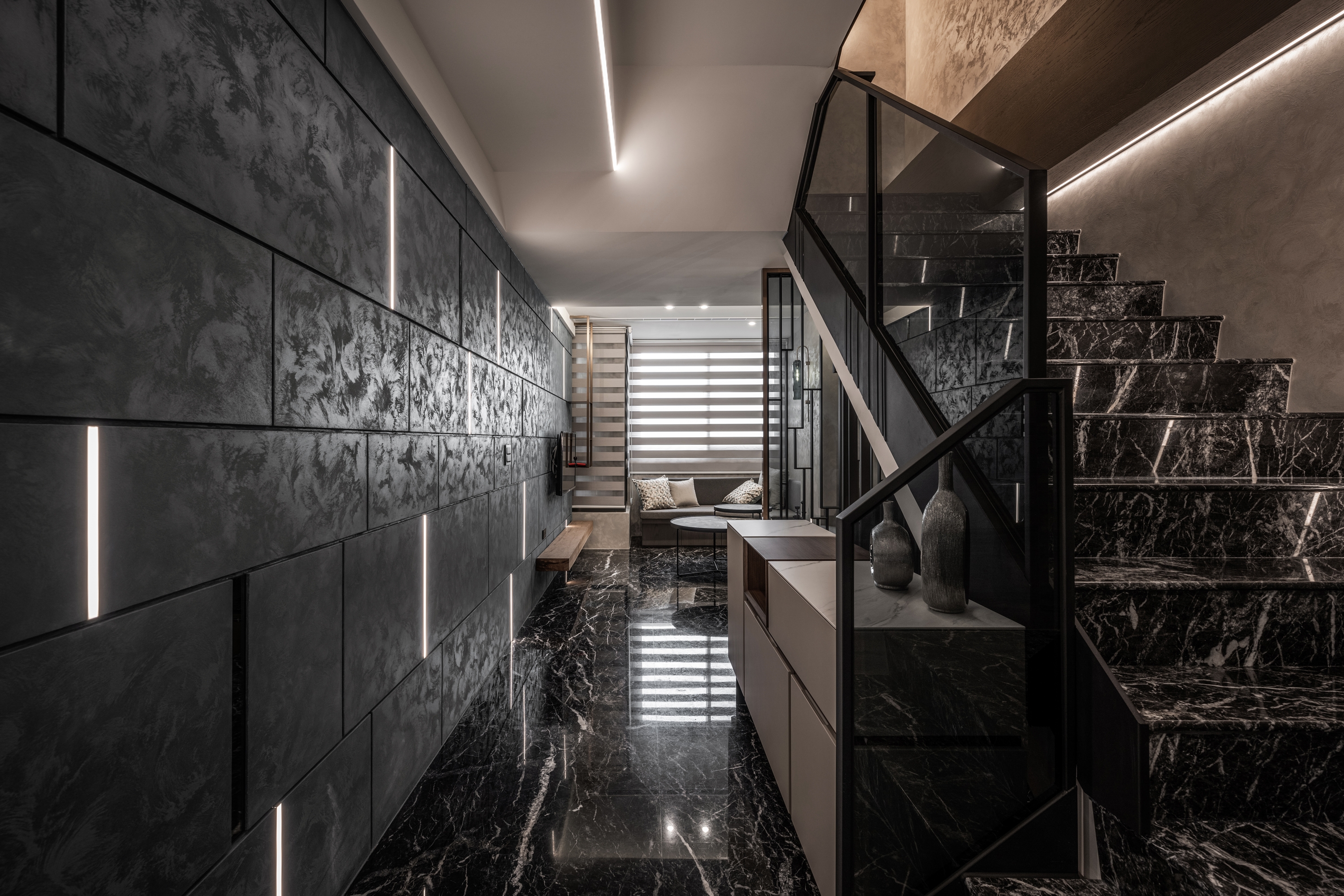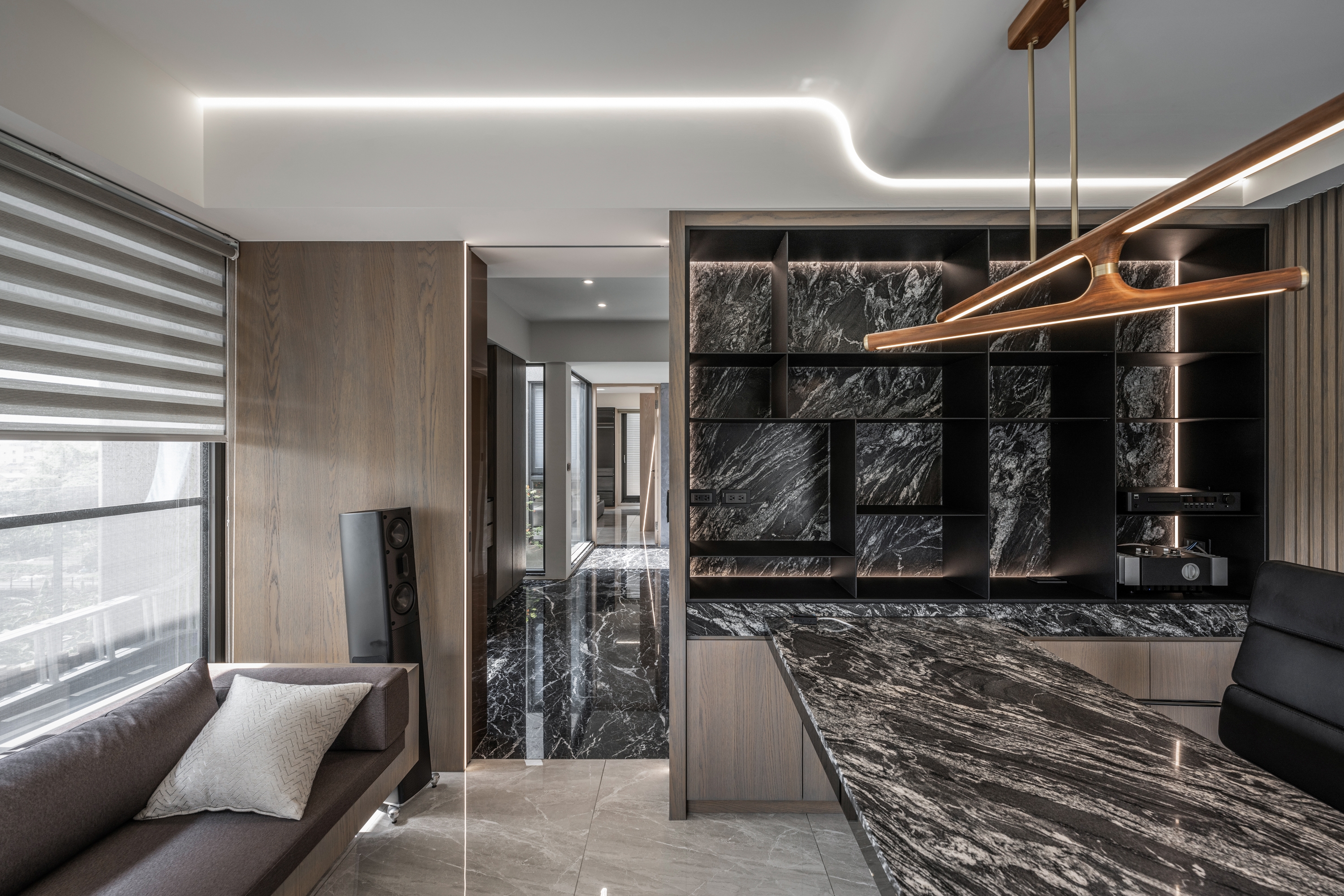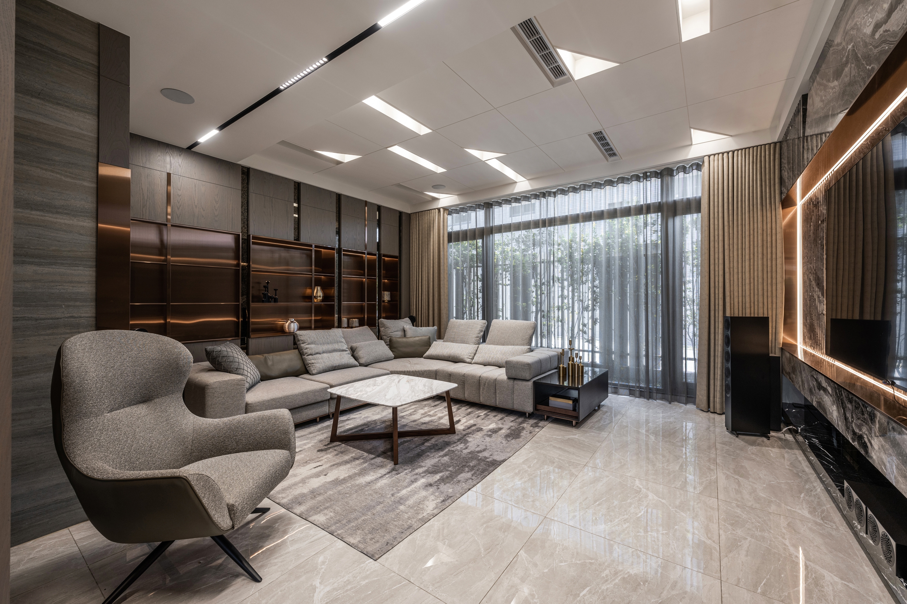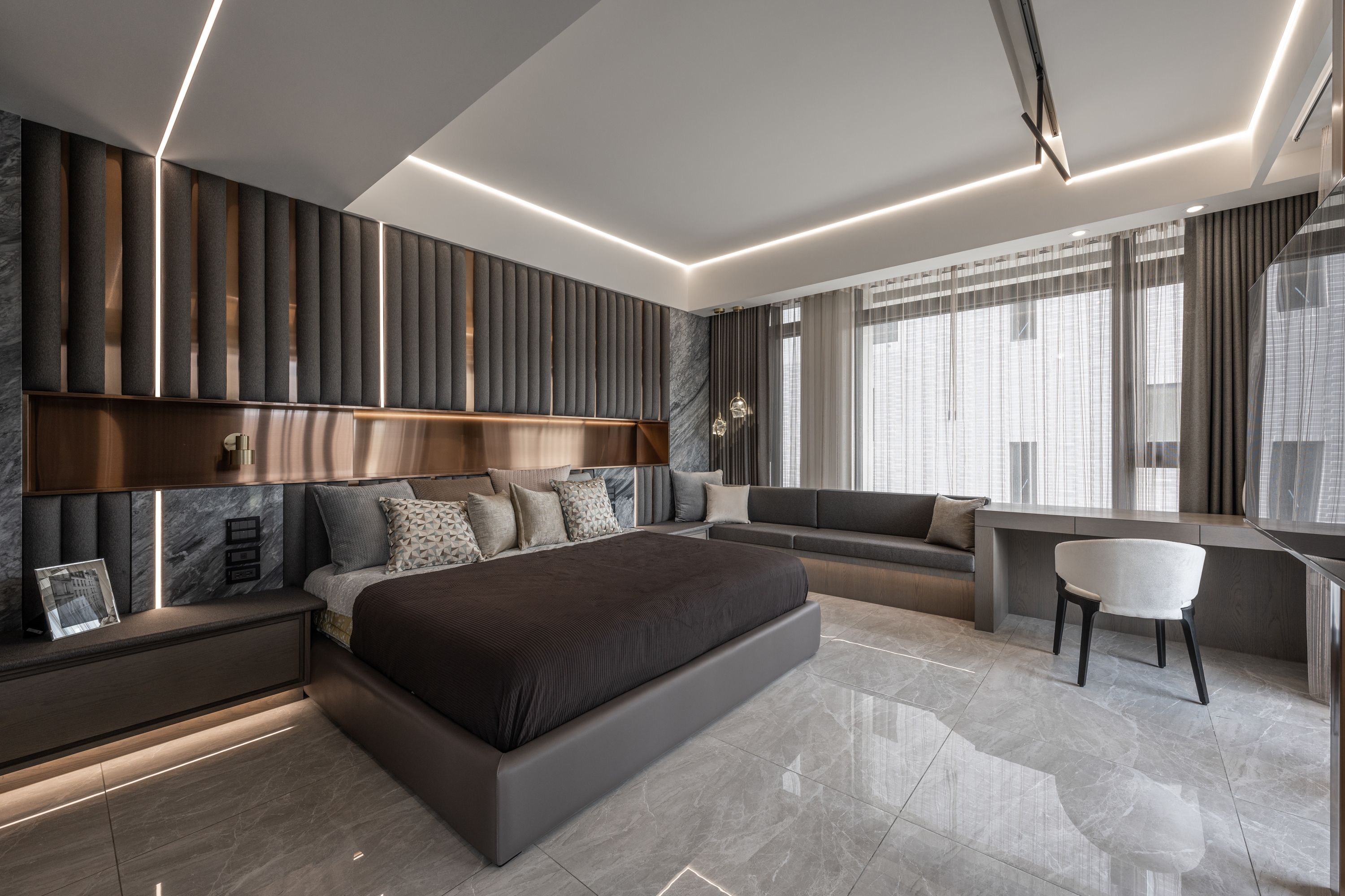 This project has a 380 square meter outdoor courtyard, and the building itself is surrounded by scenery. Therefore, the designer opens up the layout with large windows on all sides to preserve the green landscape and allow natural sunlight to enter and fill the interior. In order to make the space with light everywhere, not cutting off either visual nor spatial sense, the designer forms a framework with light bands. Through the light, the area attributes are defined. At the same time, the foyer is hollowed out to link the living room and dining room with an open approach. The partitions and cabinets are also designed with a sense of penetration. The greenery framed by the large open windows is allowed to enter the interior and becomes the most natural decoration in the space. The building material is used as the carrier of light, through diffuse lighting design and reflection of reflective materials. Let the light pass between the virtual and the real, and extend naturally in the space, from the living room to the dining room to the bedroom, using light to dance a rich pattern.