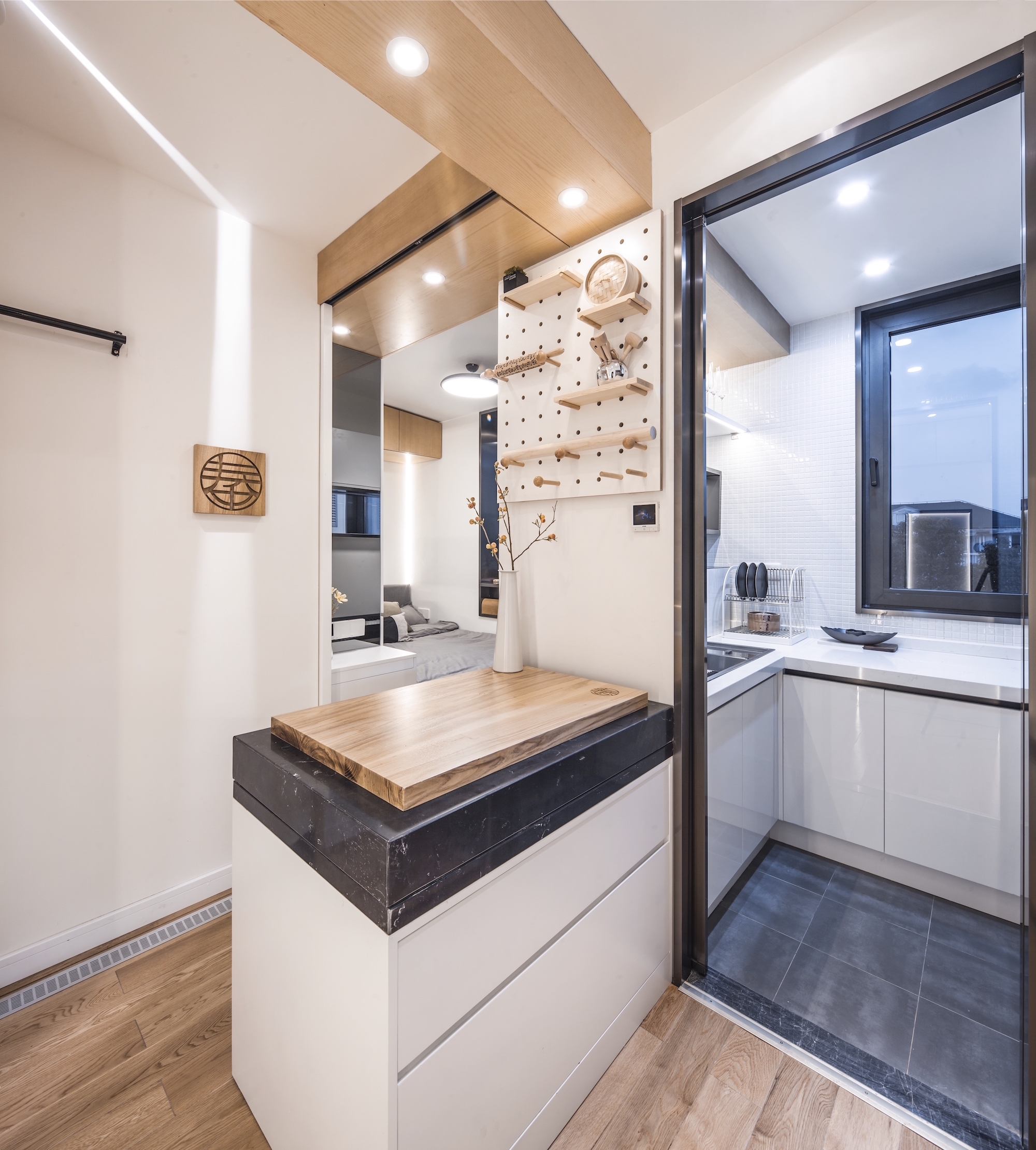The design use the Jade and Exquisite Study as the space prototype. The porch, the entrance hall and the grand’s room compose a prototype of the Jade and Exquisite Study so that the sight distance is prolonged from 1.7 meters to 6.2 meters. Then the living room, the entrance hall and the kitchen make up of another Jade and Exquisite Study, extending the sight distance again from 3.5 meters to 7.4 meters. The previous narrow spaces are integrated, and the horizontal distance is extended. In this mini space of less than 34 square meters, the design creates two kitchens, two bedrooms, a living room, a game area and even a professional singing hall.
