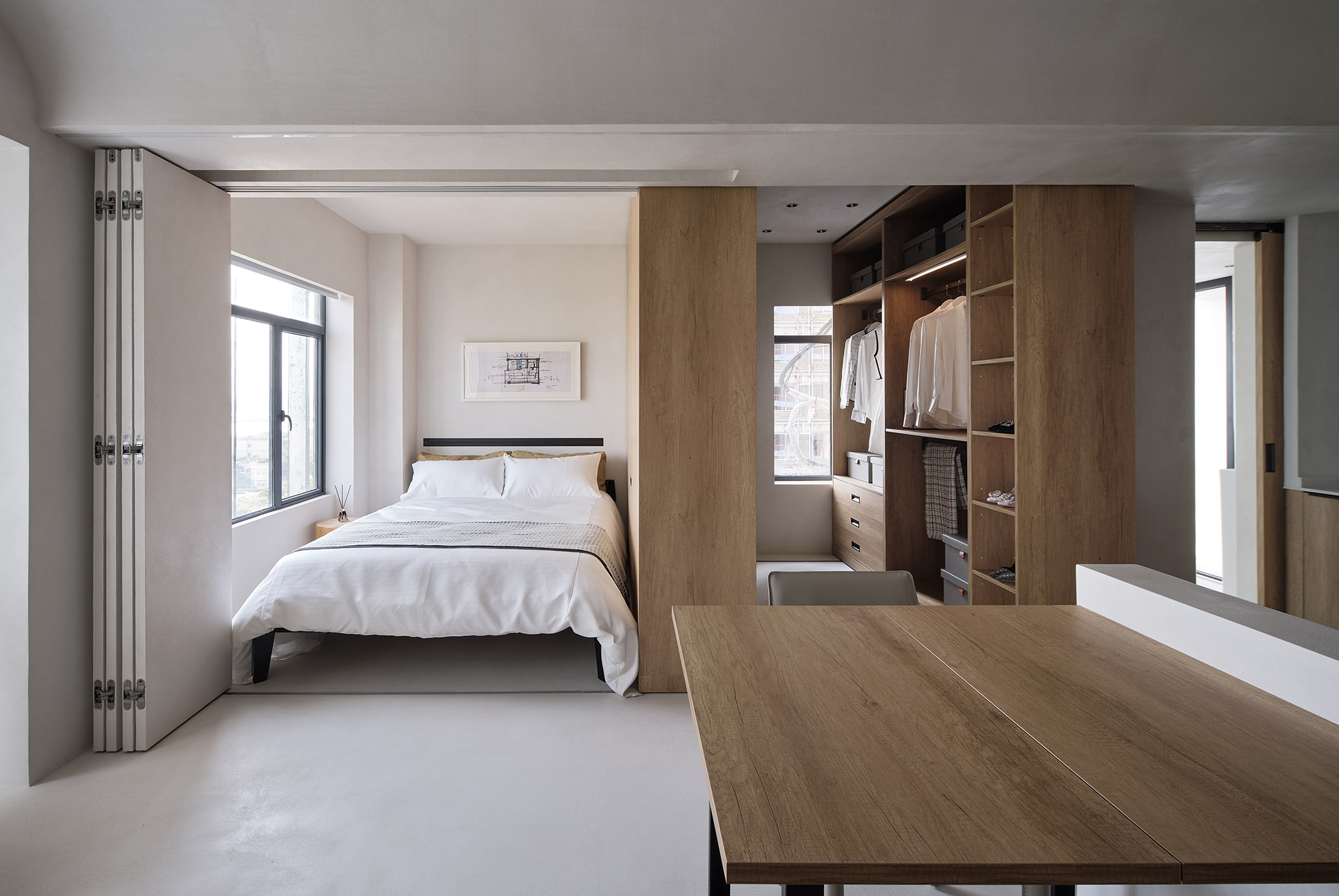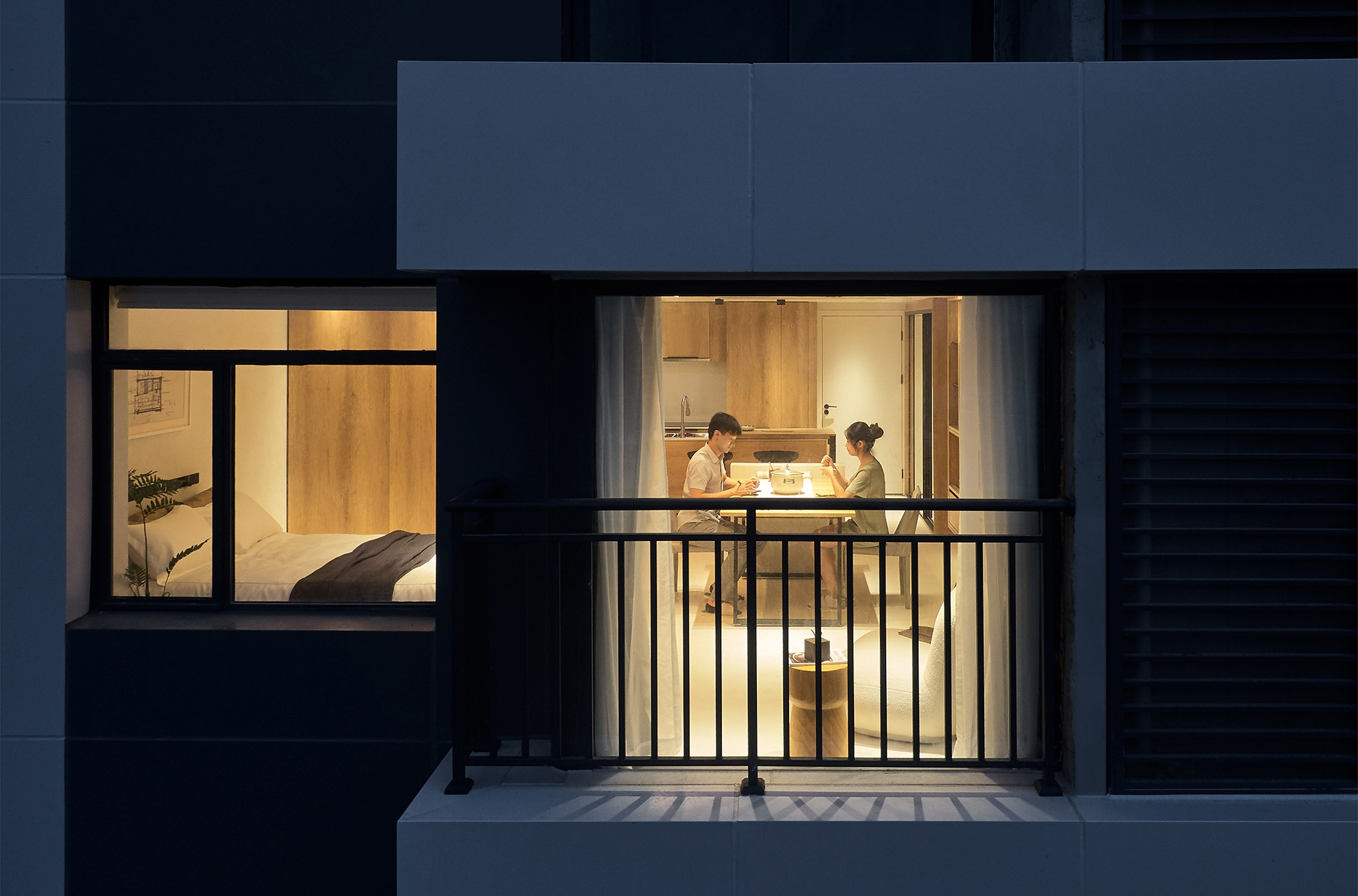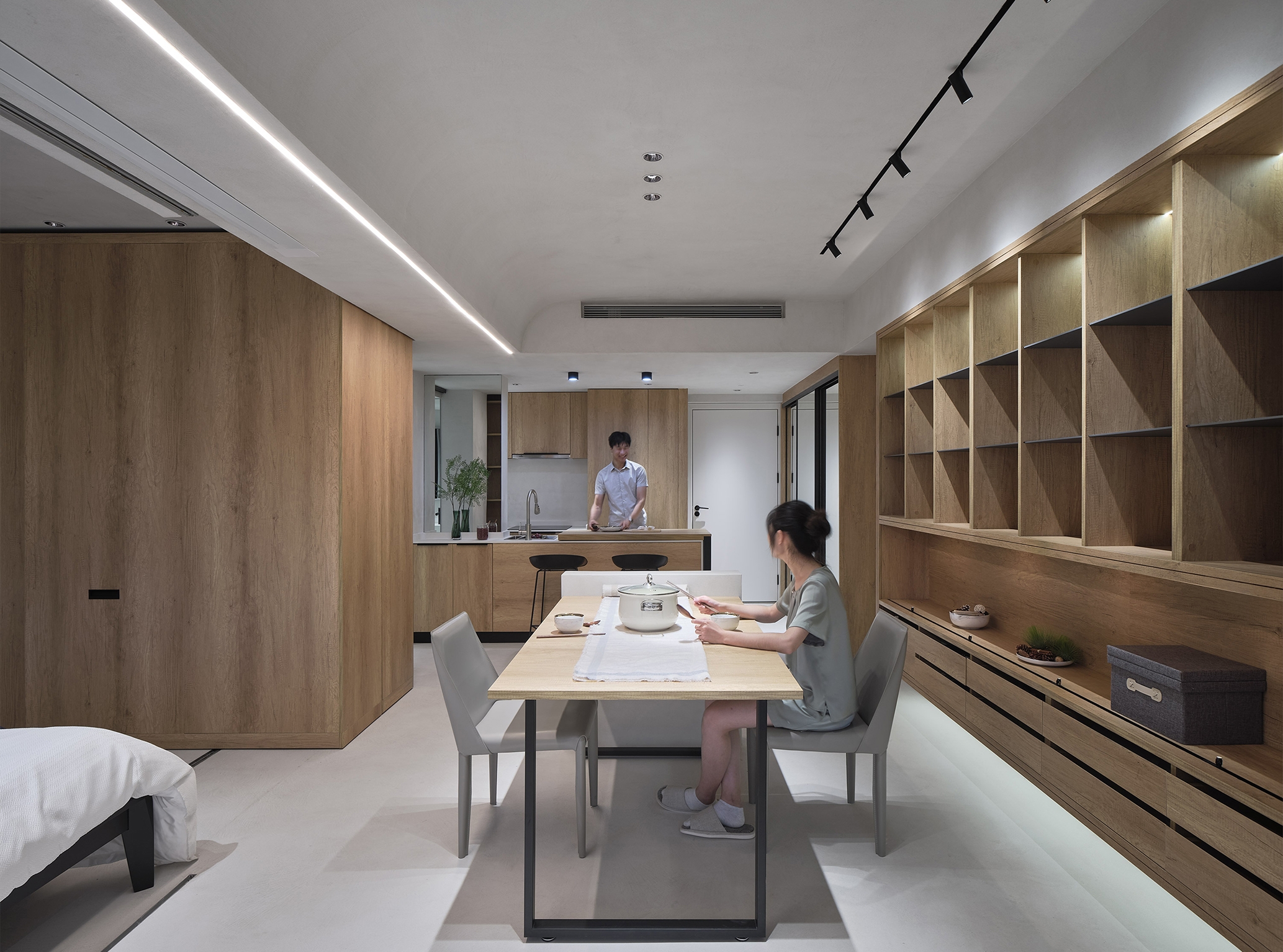 We take the "living alone" of young people as the basic prototype, and expand the system to meet more use scenarios. In the "living alone mode, 40 square meters includes U-shaped kitchen, independent bathroom, open living room, bedroom and variable cabinet. Even without considering the variable cabinet, this 40 square meter unit can meet the various needs of "living alone with high quality. Cooking, reading, gathering and watching movies can be carried out in a comfortable way to meet the needs of young people for the sense of ceremony in life.