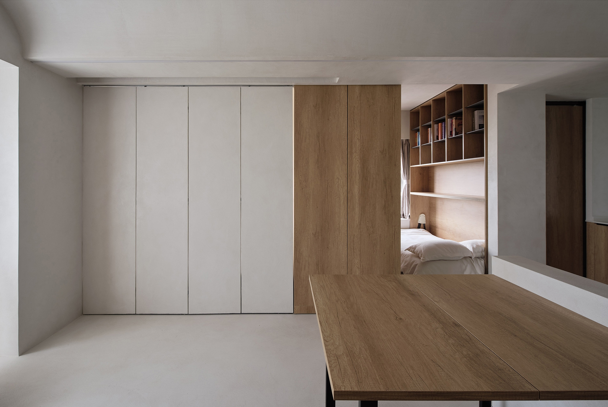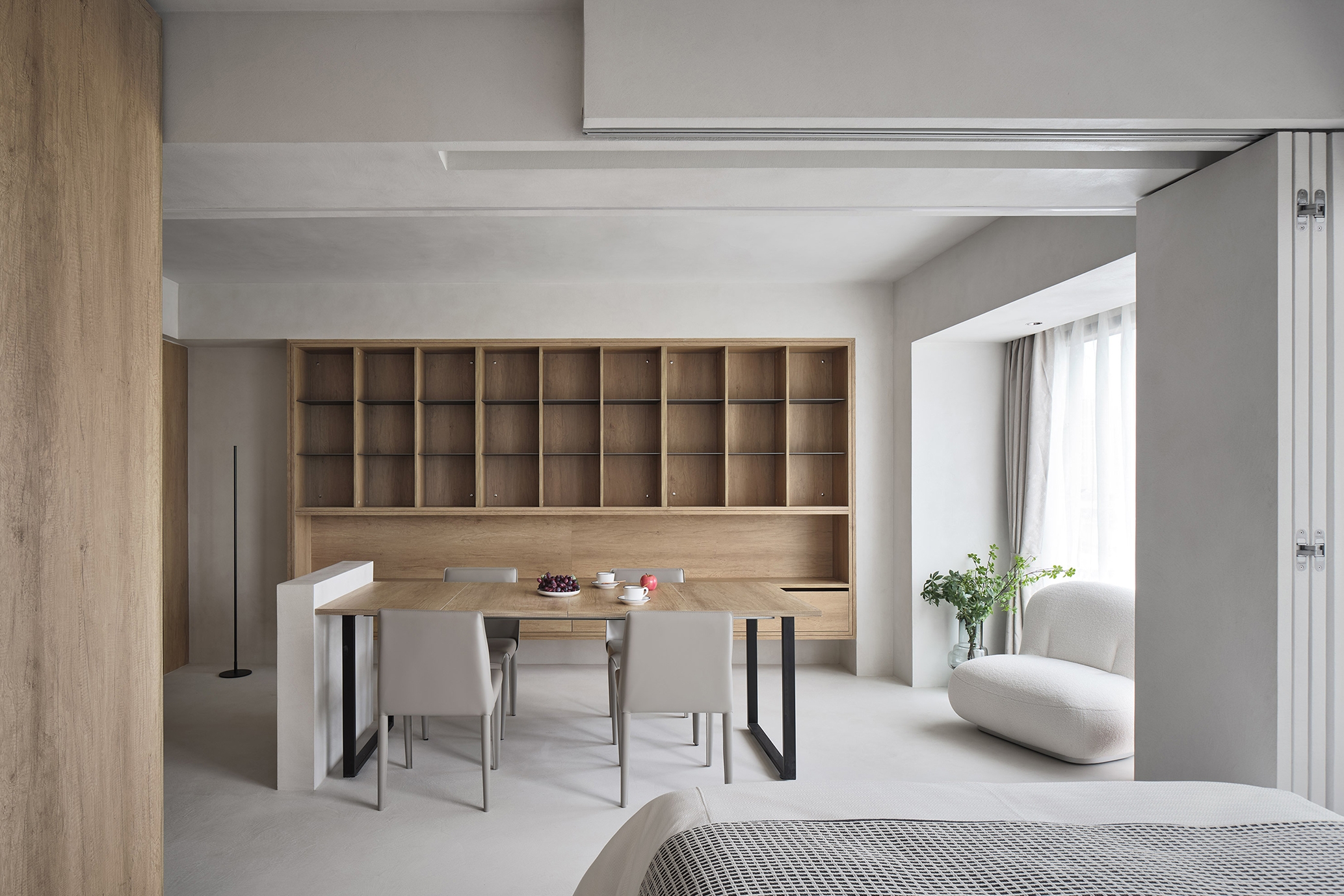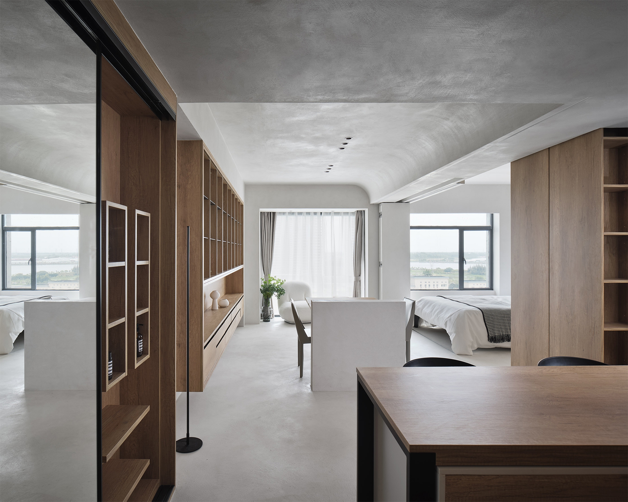 We take the "living alone" of young people as the basic prototype, and expand the system to meet more use scenarios. In the "living alone mode, 40 square meters includes U-shaped kitchen, independent bathroom, open living room, bedroom and variable cabinet. Even without considering the variable cabinet, this 40 square meter unit can meet the various needs of "living alone with high quality. Cooking, reading, gathering and watching movies can be carried out in a comfortable way to meet the needs of young people for the sense of ceremony in life.