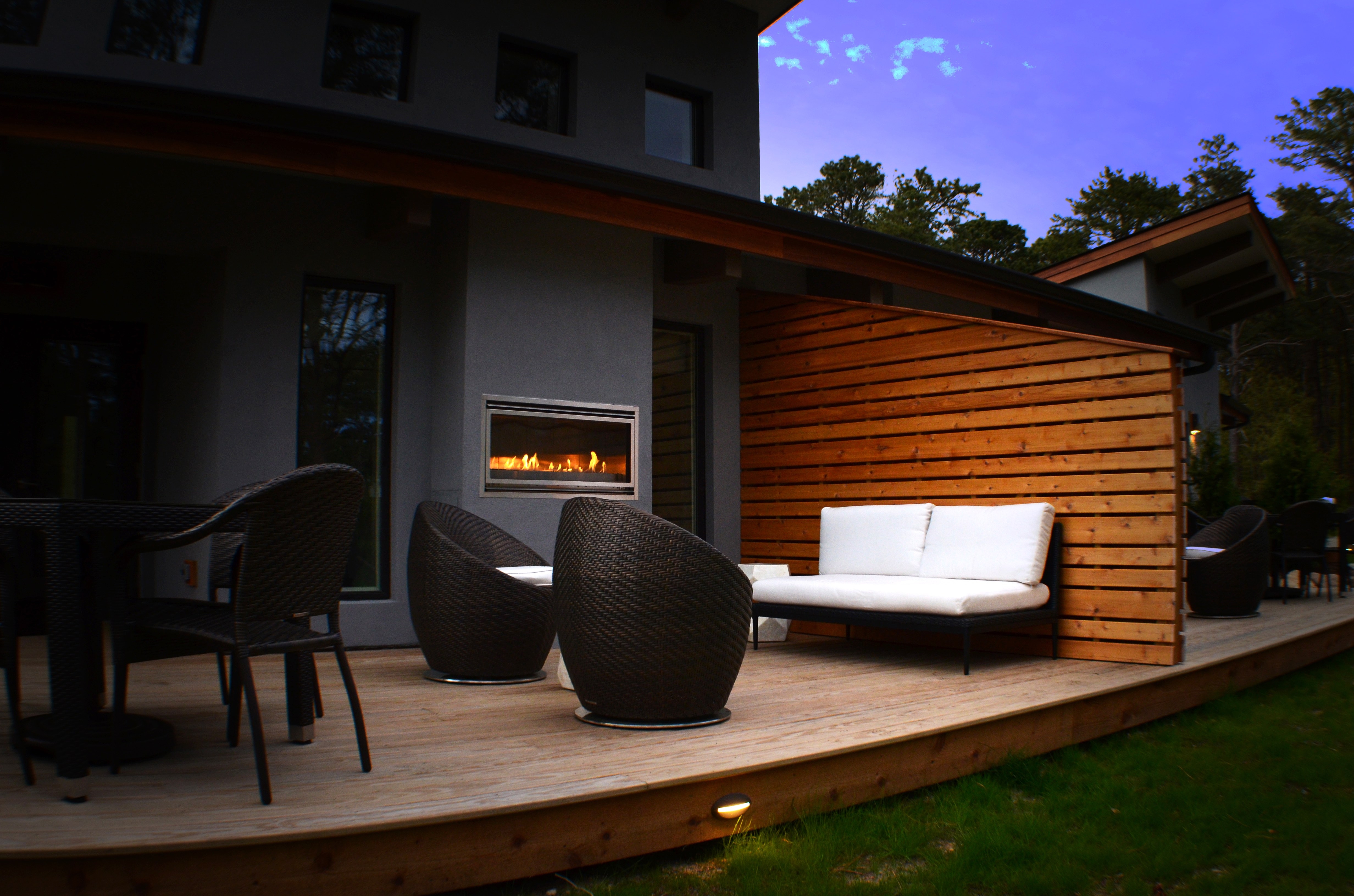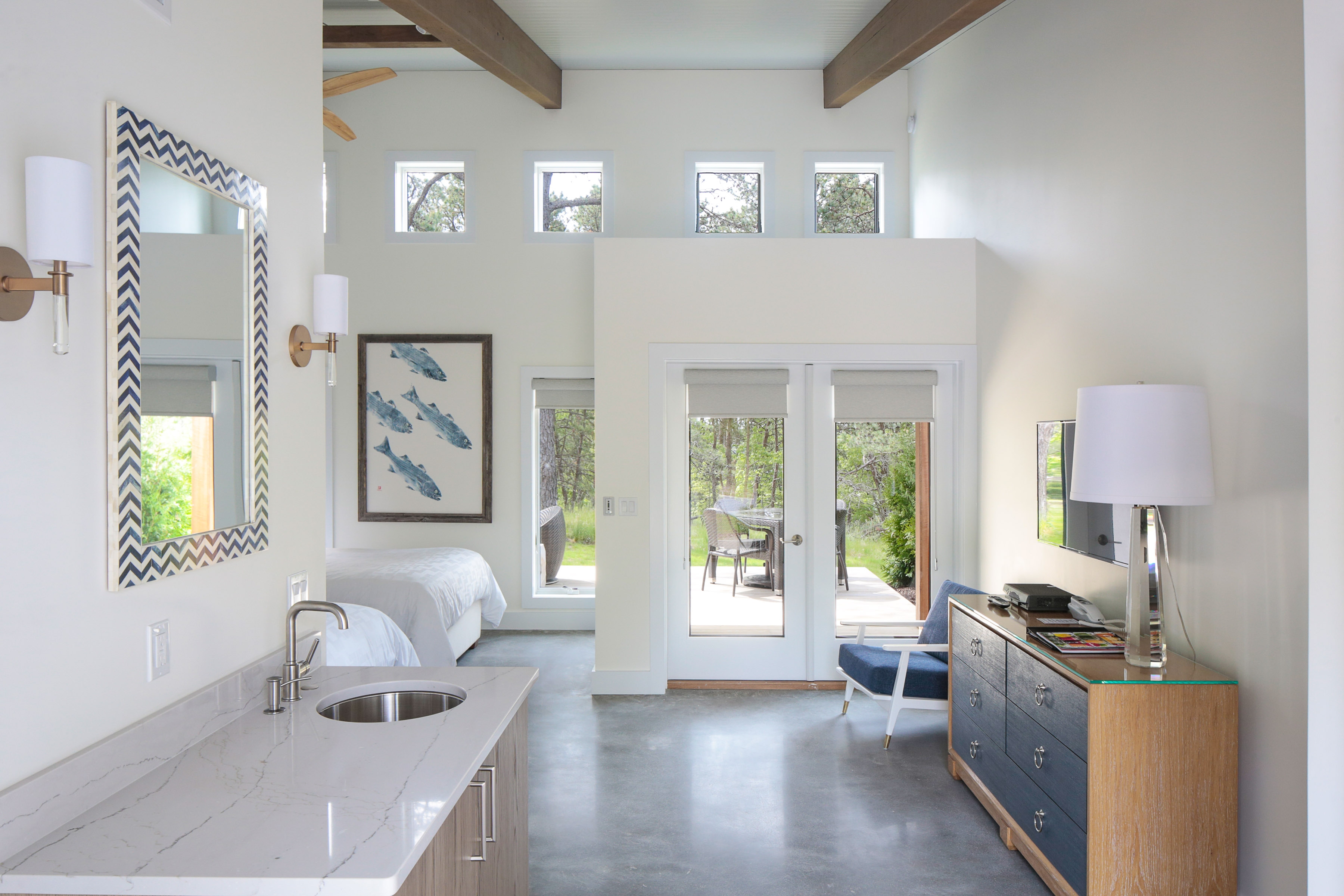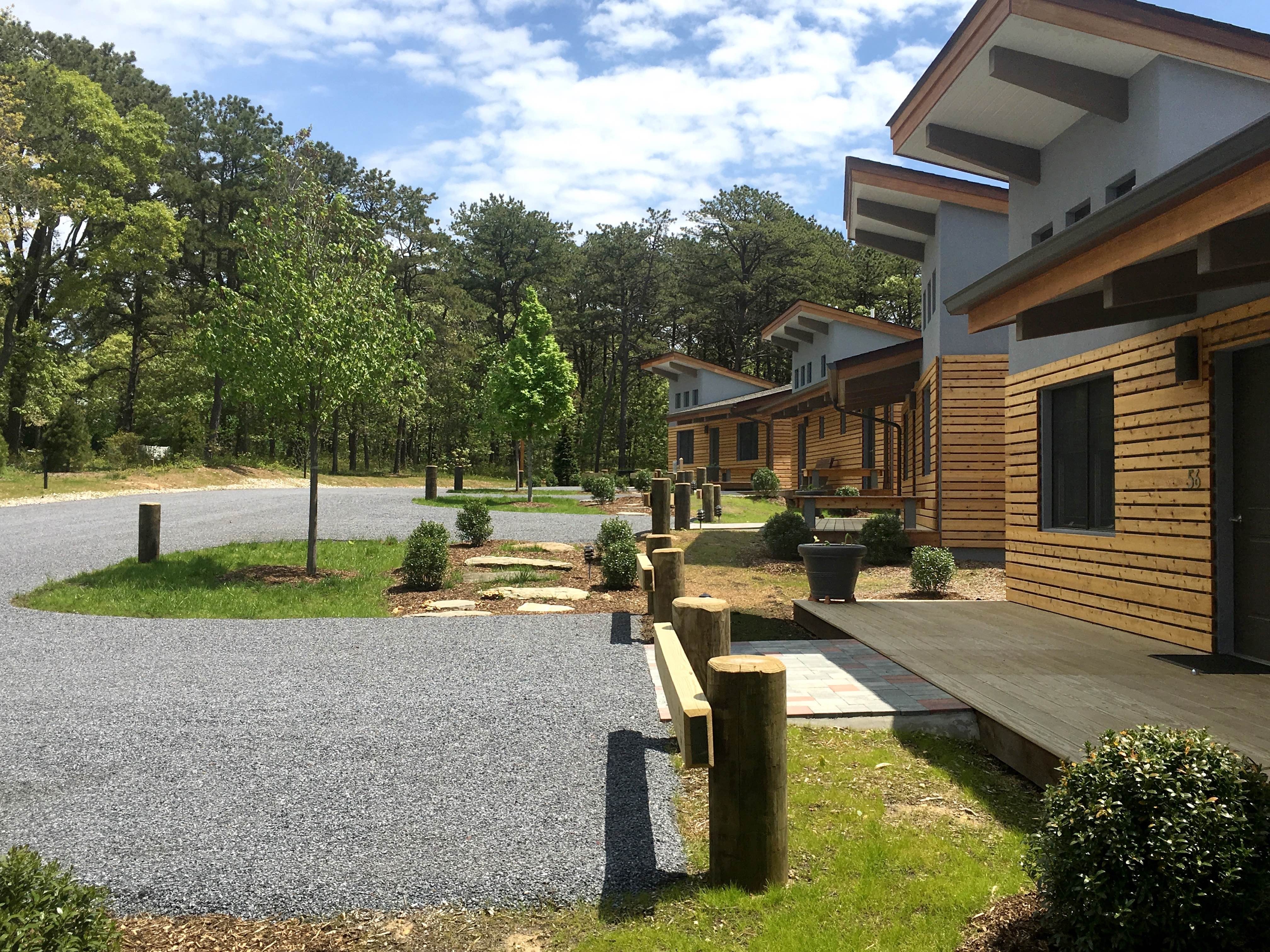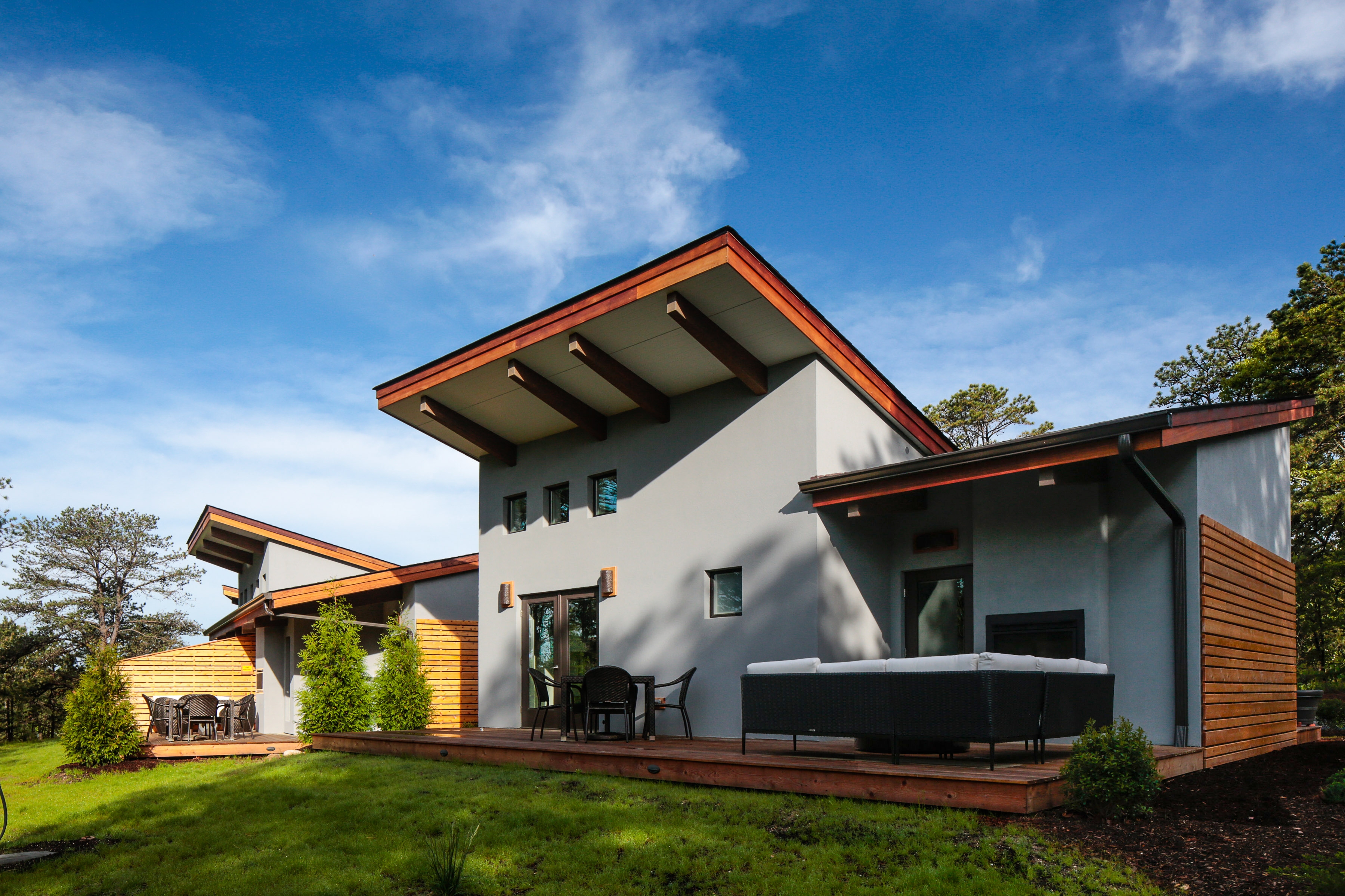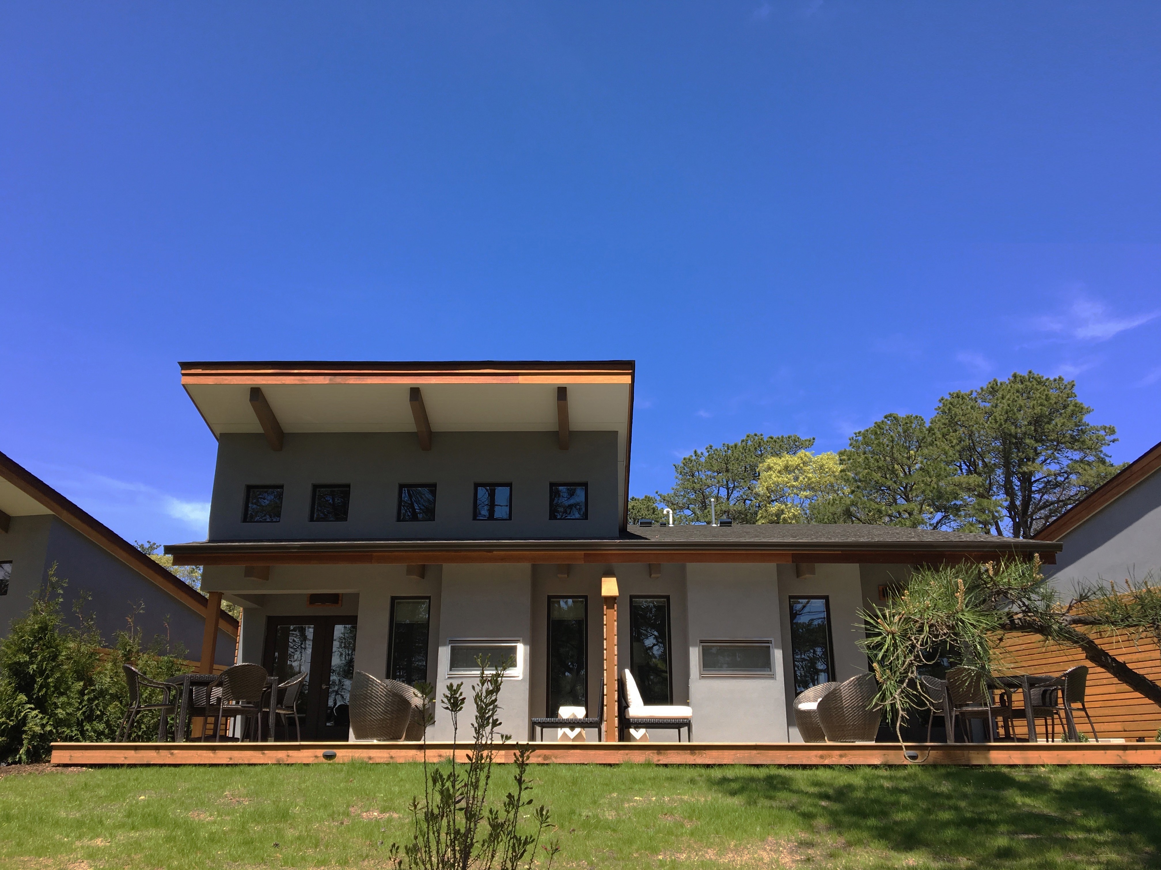 Each unit includes fireplace and private outdoor deck. The new units were planned to take full advantage of the southern Shinnecock Bay water views and sunsets. The new buildings were designed to be very efficient and have received LEED Gold certification from the USGBC. The walls are Insulated Concrete Forms (ICF) with a simple stucco finish and rain screen. Roofs are metal skin SIPS, the underside of which is exposed factory painted finish, both inside and outside.