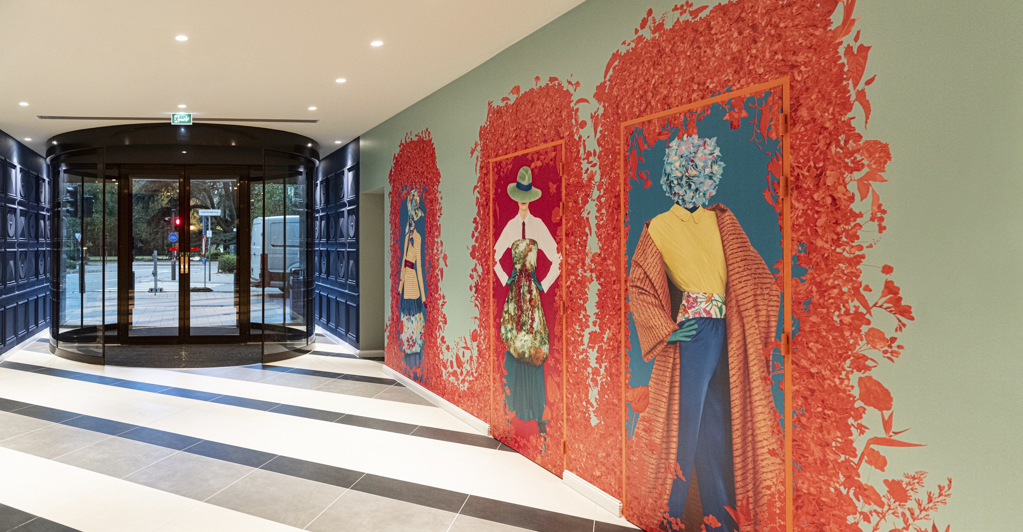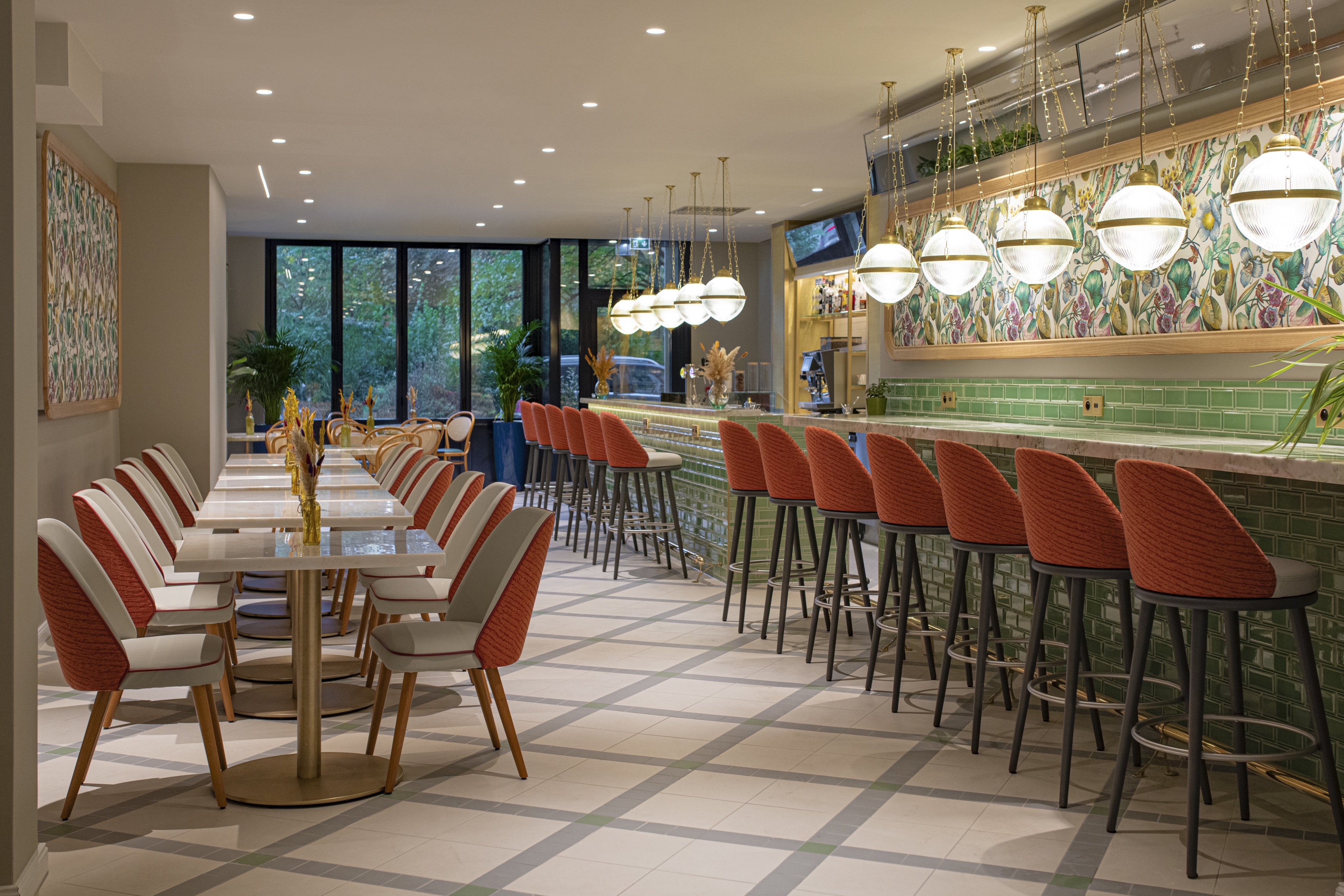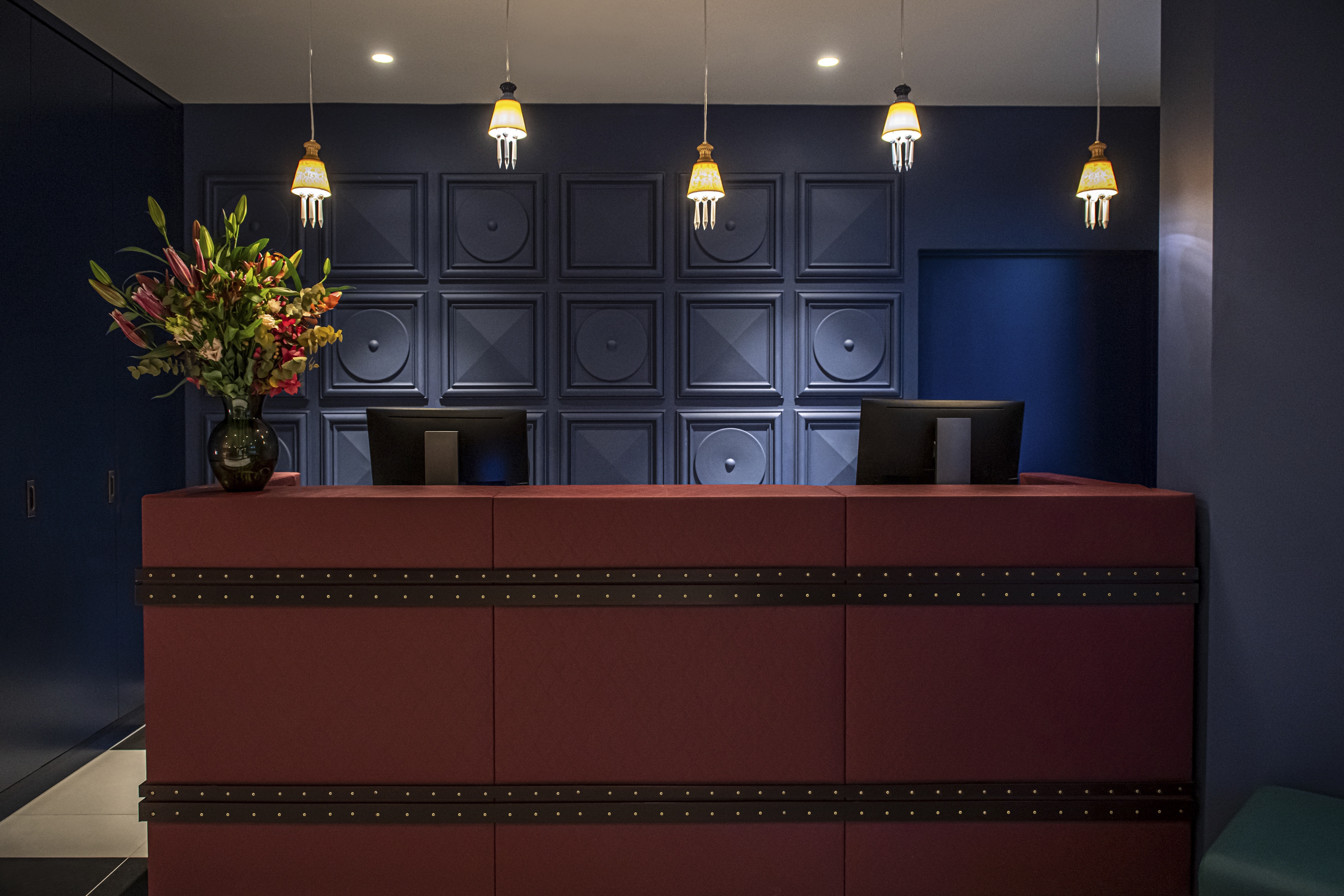 With localisation being pivotal to the Mercure brand, we were inspired by Antwerp’s Academy of Fine Art which has produced some of the worlds finest master painters and fashion designers. This gave us licence to be bold in our use of pattern, colour, texture and art to pay homage to these creative talents. We opened up the previously small, dark arrival to provide a generous lobby space. The lobby features Antwerp Blue panelled walls, deep burgundy tiled boutique, stitched reception desk and large bespoke photographic print created with fabrics from the interior to make the fashion inspired image. A lighter palette emerges in the f&b areas. Pattern was used in a more subtle expression, through solid oak framed acoustic panels. We used classic European bistro references such as a glazed tile bar front, suspended globe pendants, and bentwood chairs. A large framed print hangs above the staircase -inspired Jan Van Eyck’s Portrait of A Man. Our version has model in a towel and bathrobe as a playful reference to being in a hotel.Atmospheric corridors contrast with light fresh guest rooms – with a light touch refurbishment – bespoke wallcovering, tailored details and rich colour palette