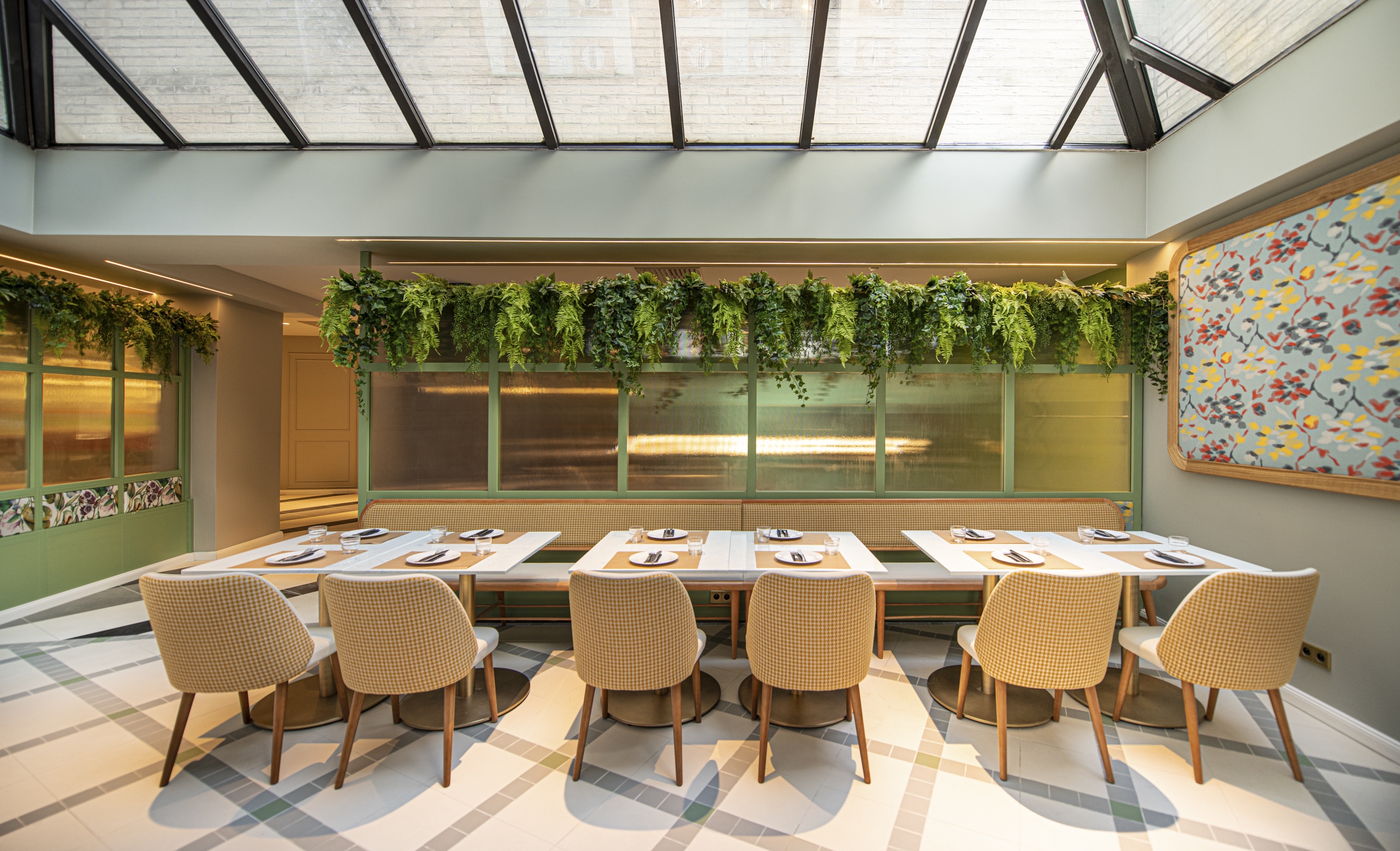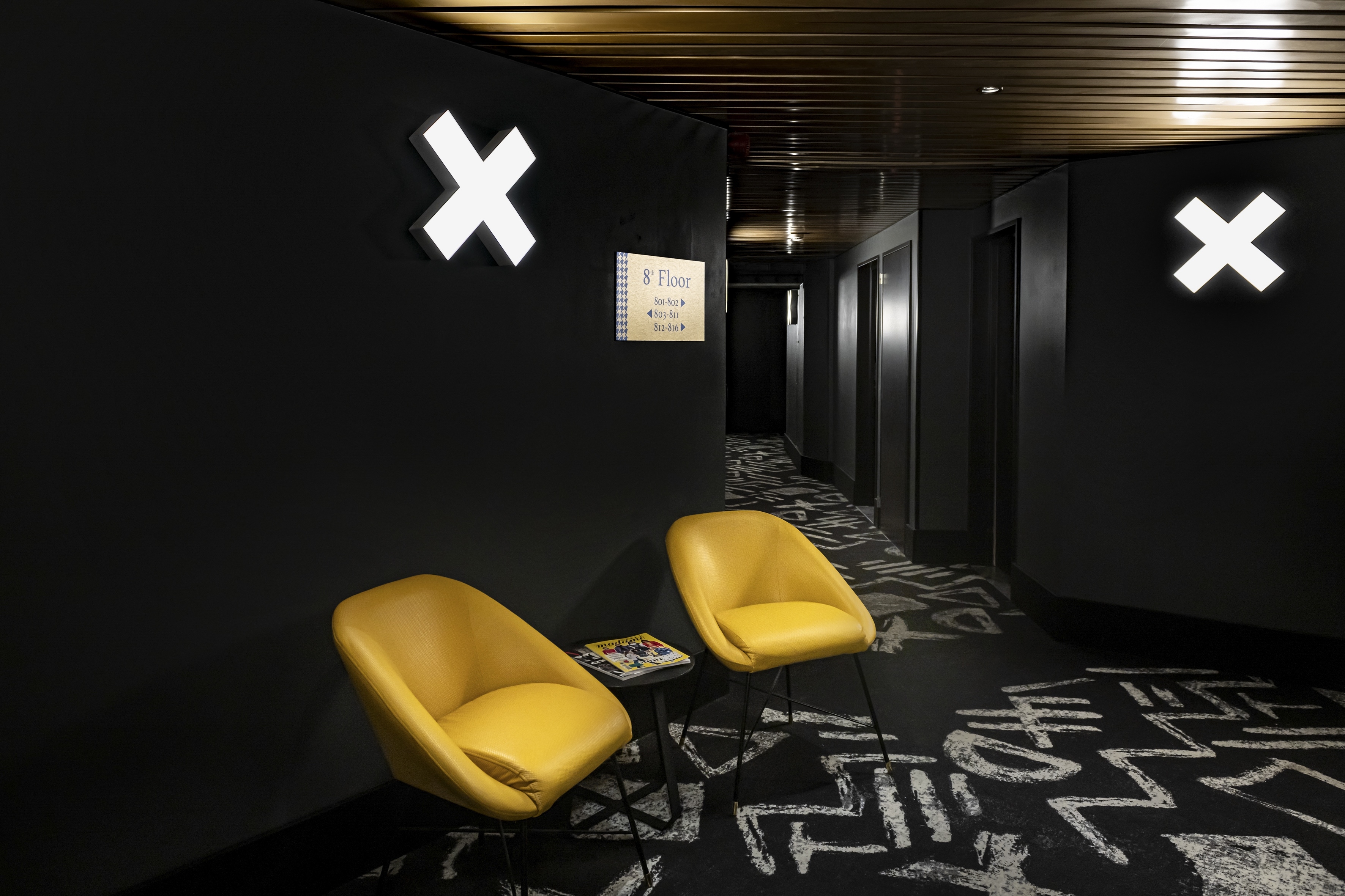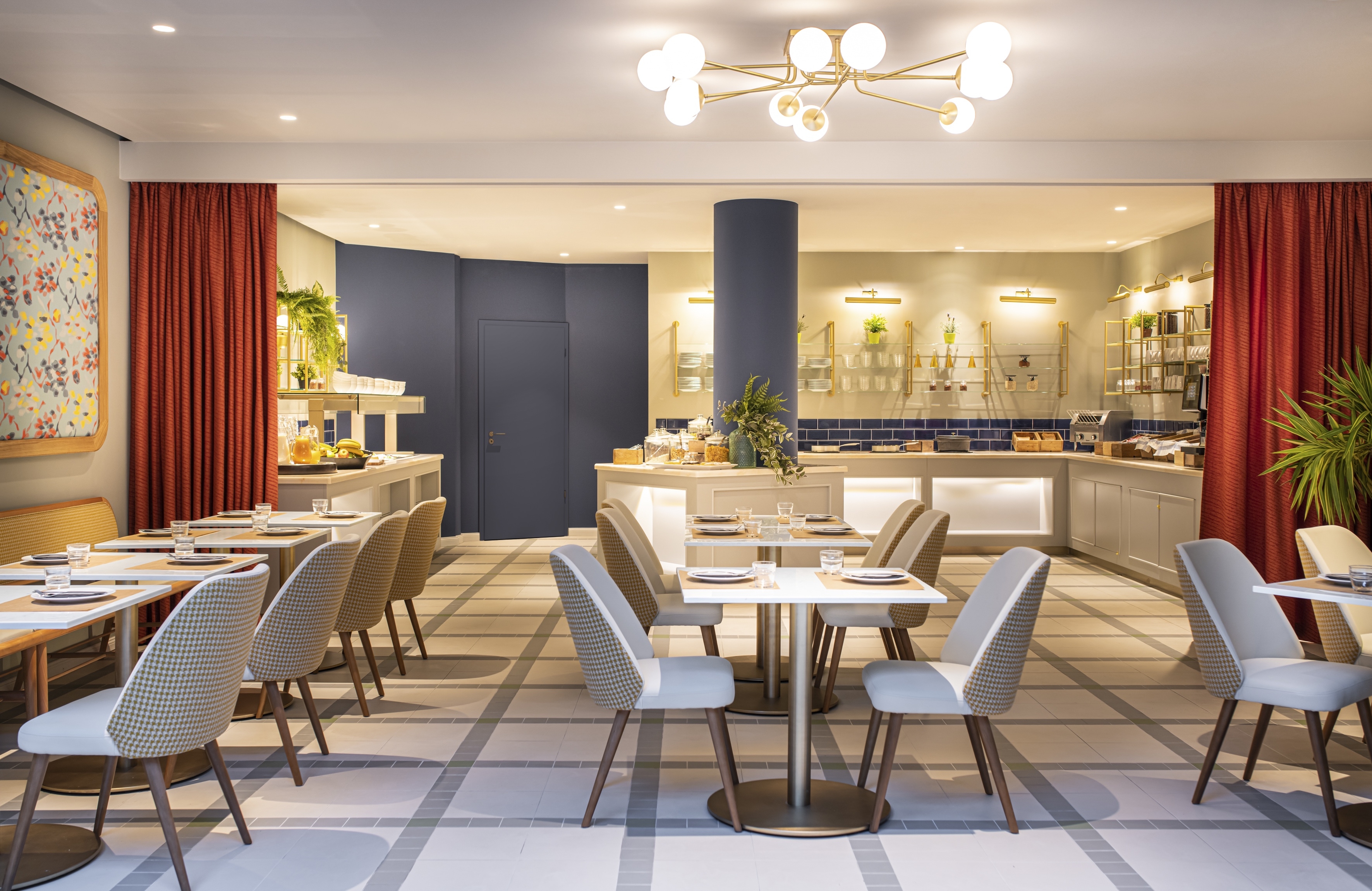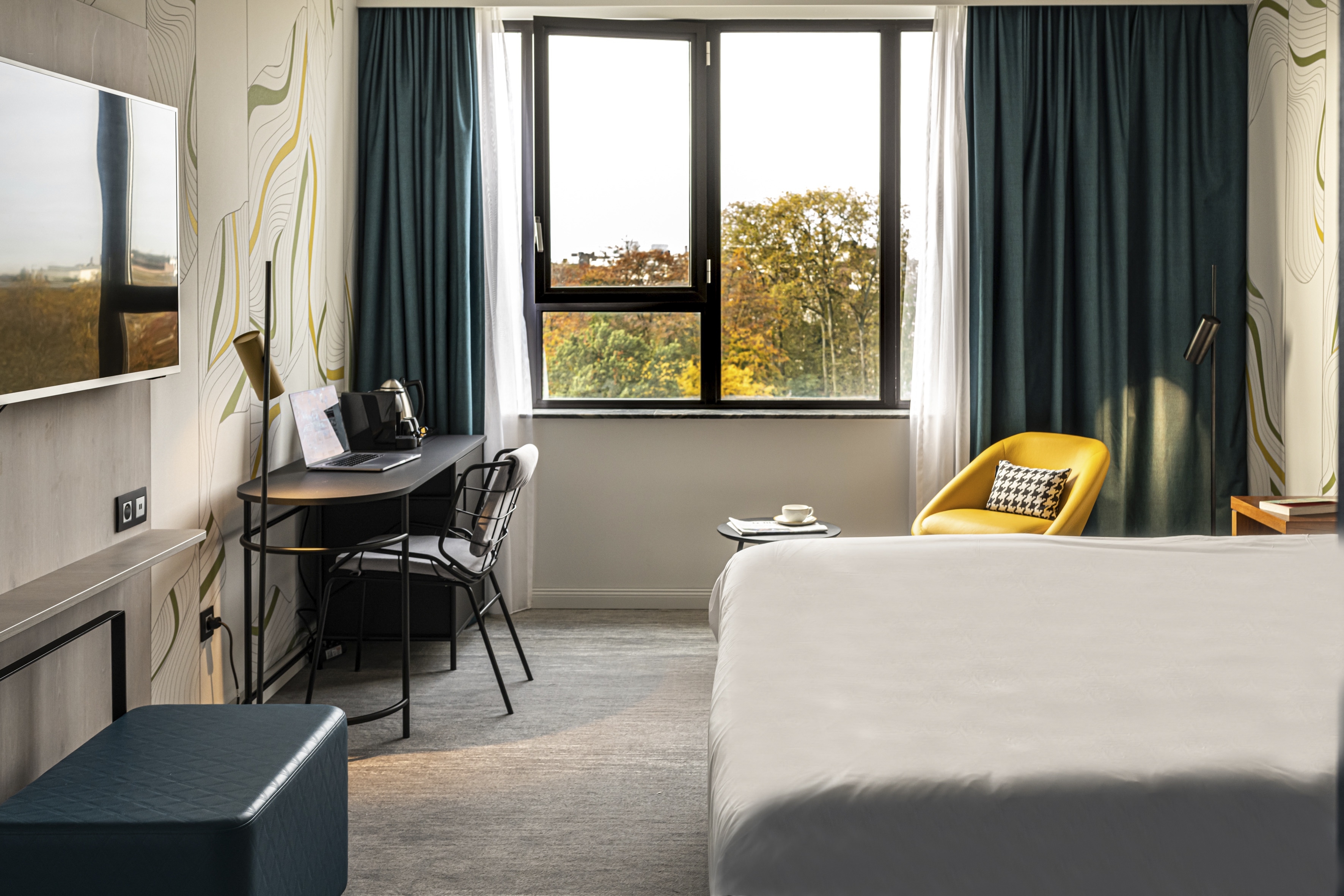 With localisation being pivotal to the Mercure brand, we were inspired by Antwerp’s Academy of Fine Art which has produced some of the worlds finest master painters and fashion designers. This gave us licence to be bold in our use of pattern, colour, texture and art to pay homage to these creative talents. We opened up the previously small, dark arrival to provide a generous lobby space. The lobby features Antwerp Blue panelled walls, deep burgundy tiled boutique, stitched reception desk and large bespoke photographic print created with fabrics from the interior to make the fashion inspired image. A lighter palette emerges in the f&b areas. Pattern was used in a more subtle expression, through solid oak framed acoustic panels. We used classic European bistro references such as a glazed tile bar front, suspended globe pendants, and bentwood chairs. A large framed print hangs above the staircase -inspired Jan Van Eyck’s Portrait of A Man. Our version has model in a towel and bathrobe as a playful reference to being in a hotel.Atmospheric corridors contrast with light fresh guest rooms – with a light touch refurbishment – bespoke wallcovering, tailored details and rich colour palette