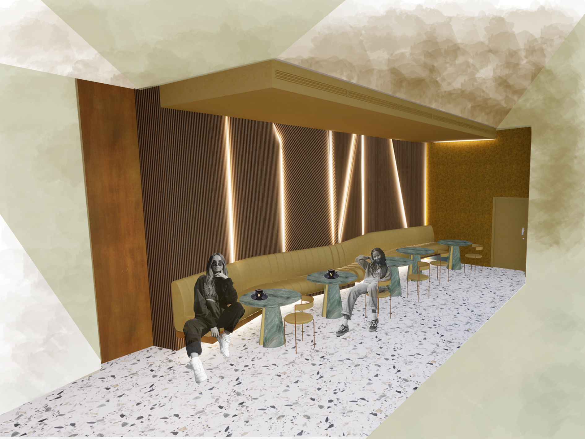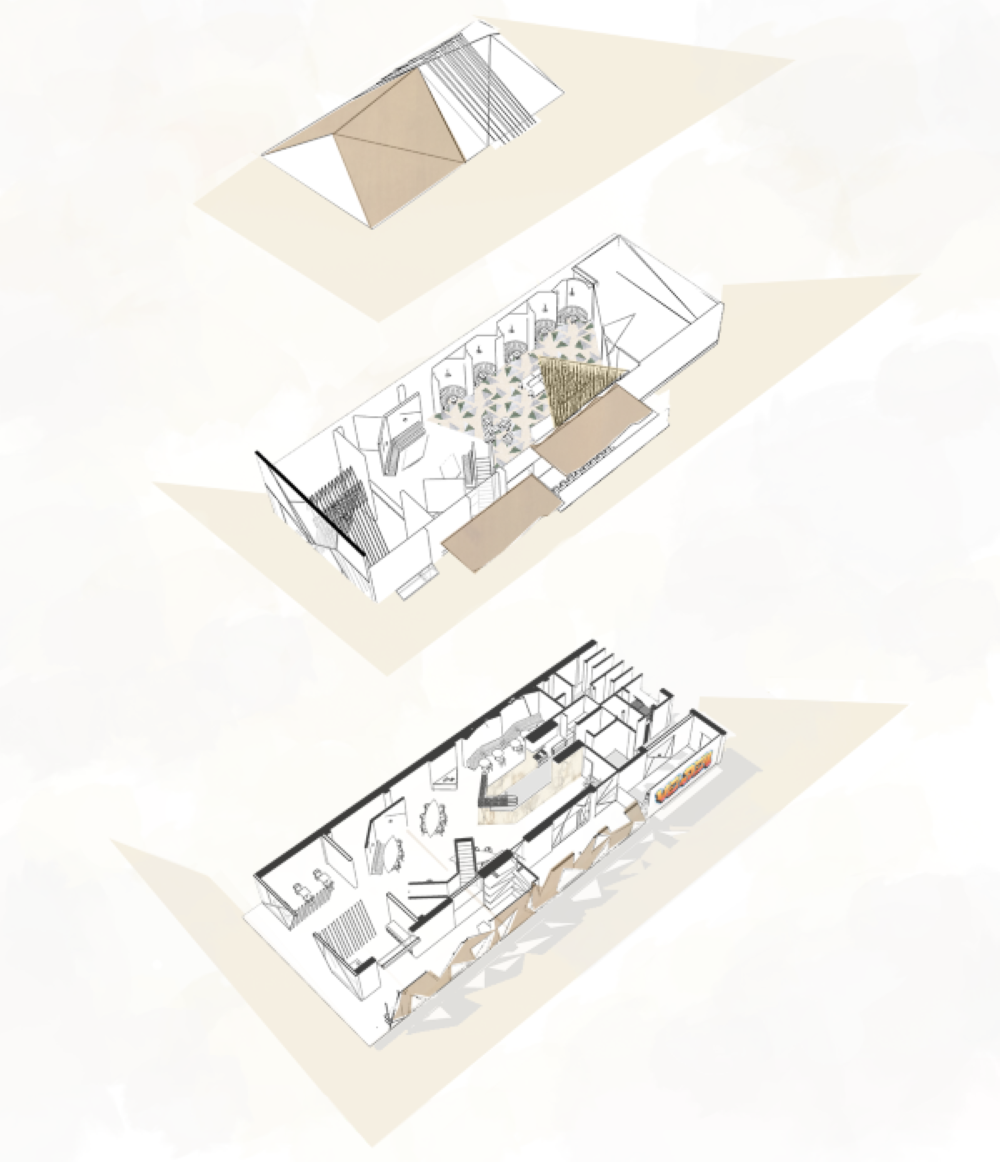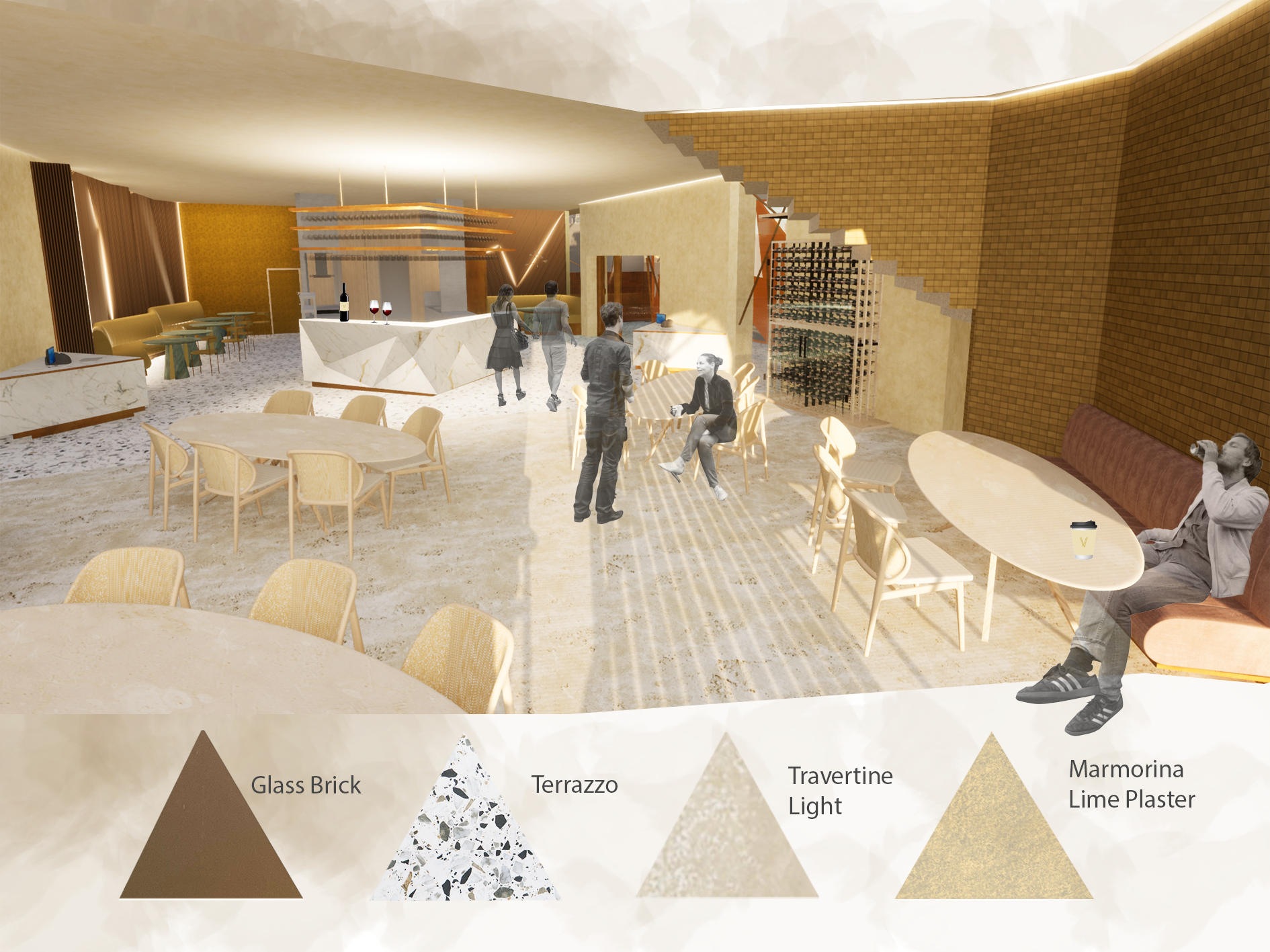 The conceptual client, Joost Bakker, loves to grind his own wheat for his restaurants. The striking wheat structure at the entrance and the natural, earthy colour palette with angles throughout the design reflect walking through a wheat field. Velden means "field" in Dutch - a nod to our client's Dutch heritage.