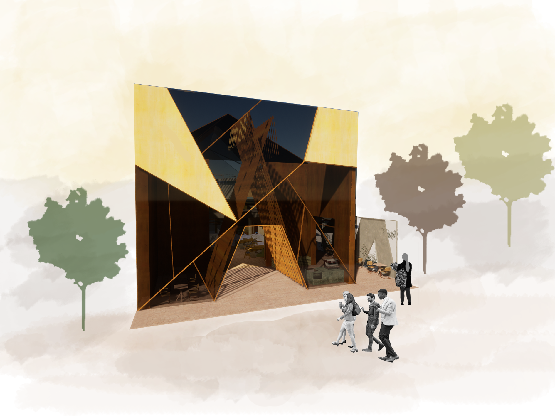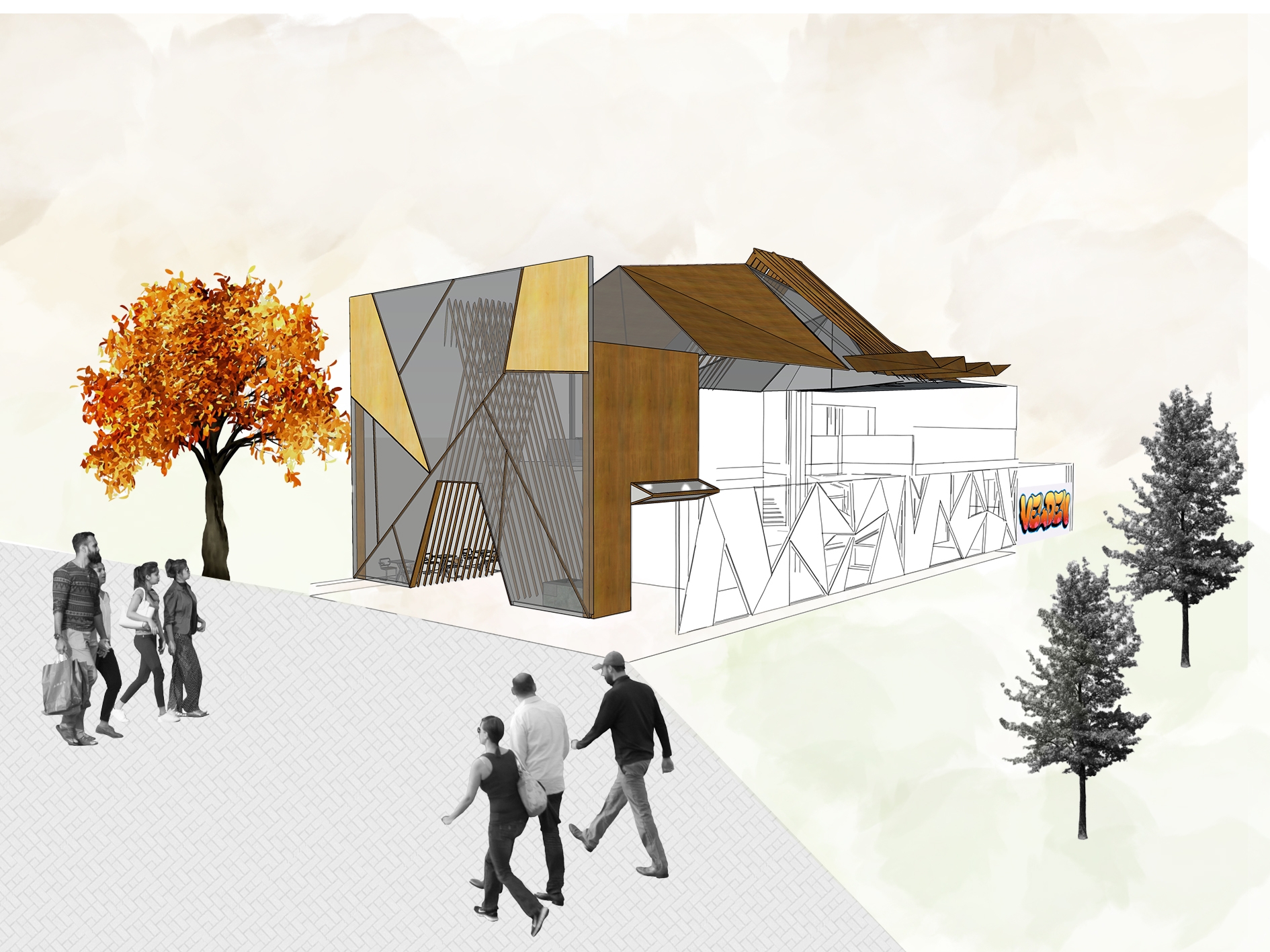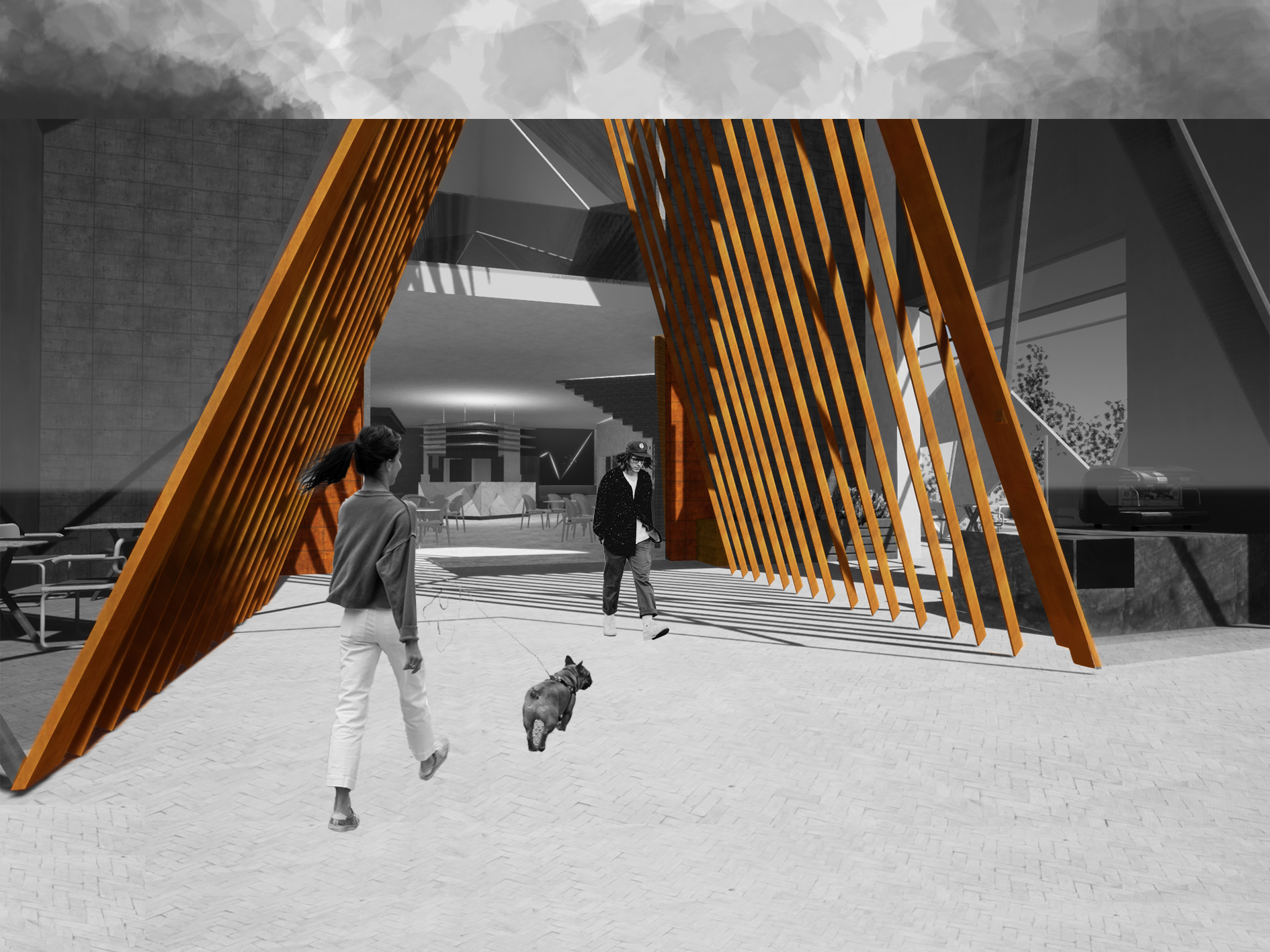 The conceptual client, Joost Bakker, loves to grind his own wheat for his restaurants. The striking wheat structure at the entrance and the natural, earthy colour palette with angles throughout the design reflect walking through a wheat field. Velden means "field" in Dutch - a nod to our client's Dutch heritage.