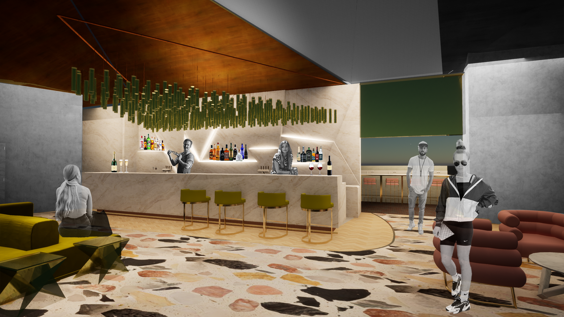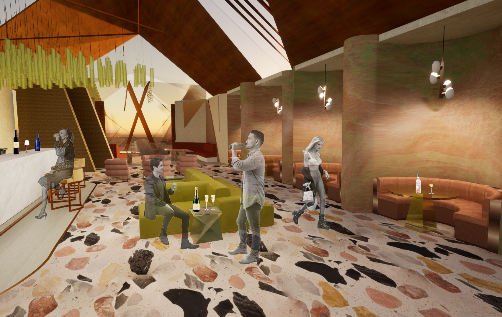 Drawing inspiration from wheat, some of the materials for the exterior and downstairs dining are aged brass metal, herringbone terracotta pavers, terrazzo flooring and wood panelling. Upstairs, in the bar and lounge, there is a clear view of the wheat structure.