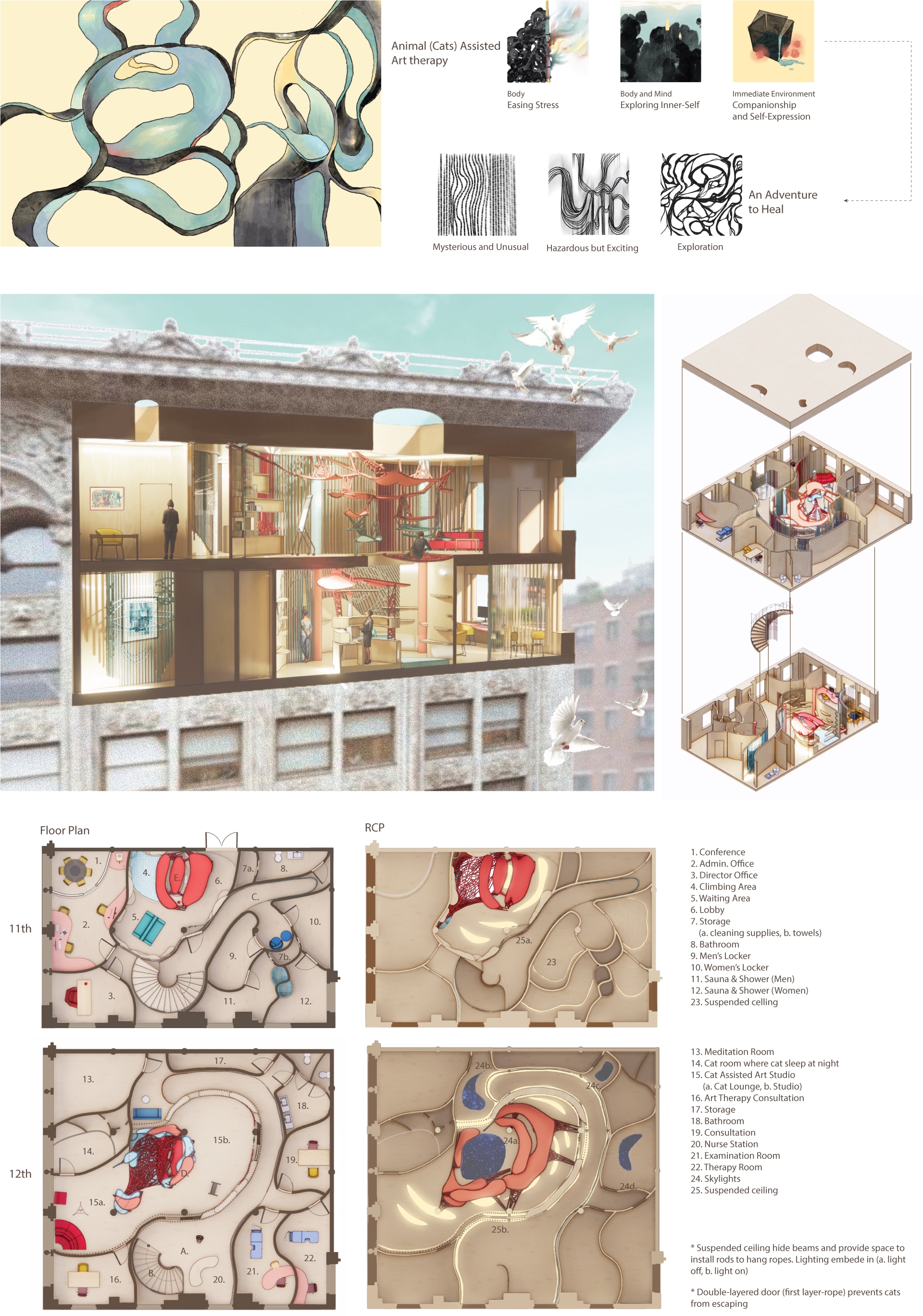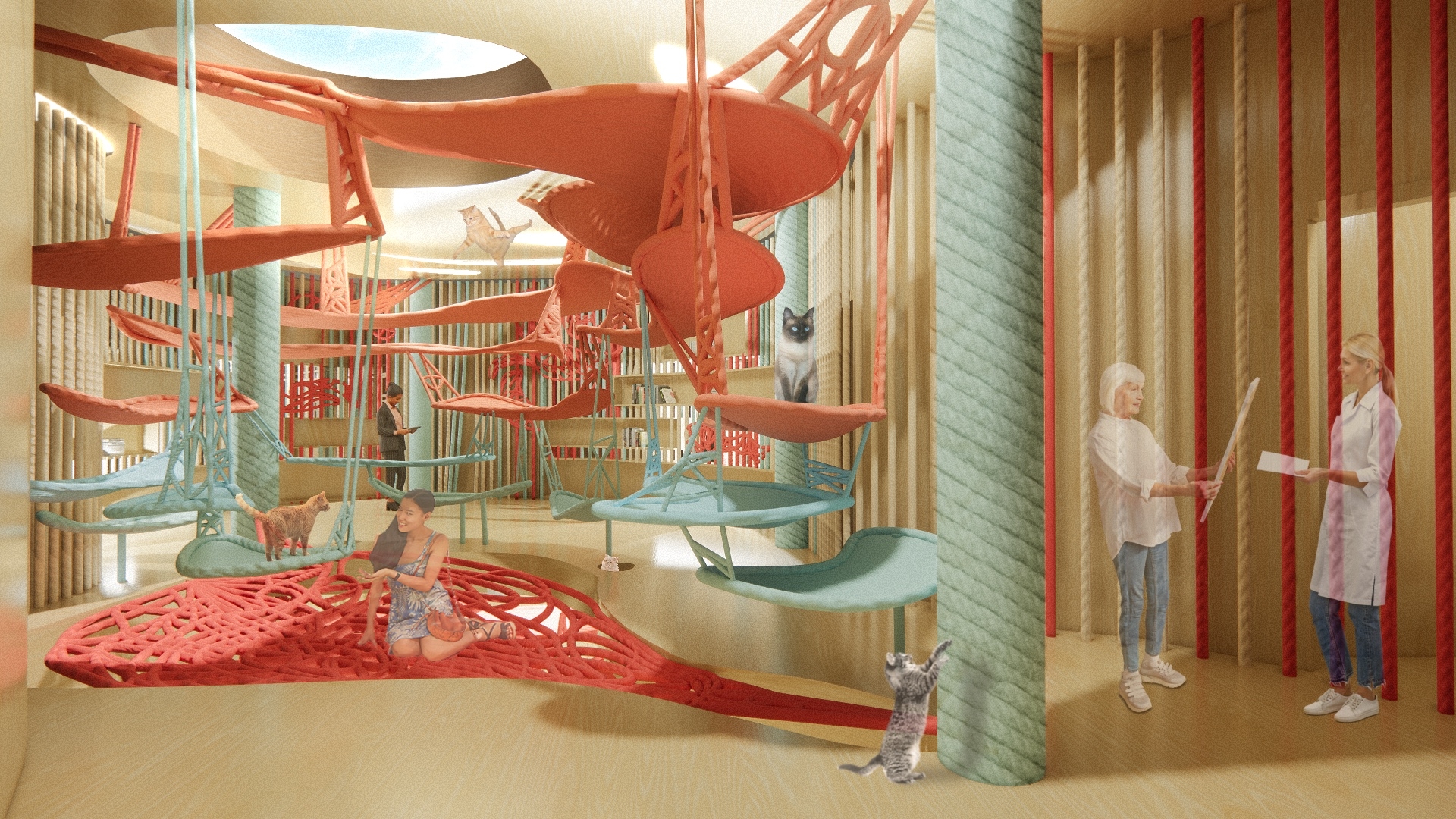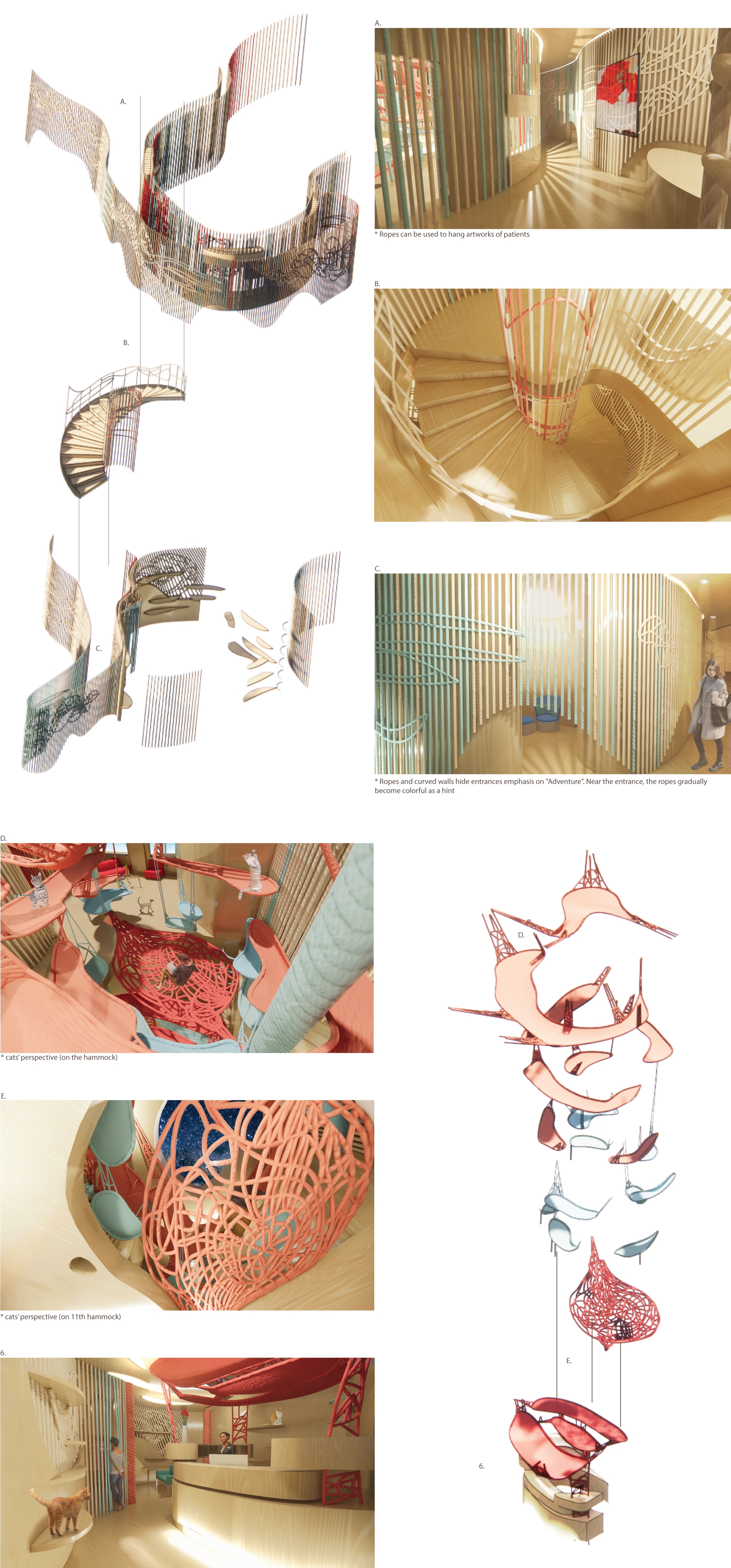 This wellness center provides animal (cats) assisted art therapy, which helps patients with depression explore themselves psychologically under the company of cats. The center uses Accoya wood and hemp ropes which are natural and sustainable. The materials construct an environment to help patients relax and heal. The spiral-form spatial layout and vertical structures create adventurous spaces to provide a unique experience for cats and humans. Red, Blue, and light beige are applied to achieve a balance between excitement and relaxation.