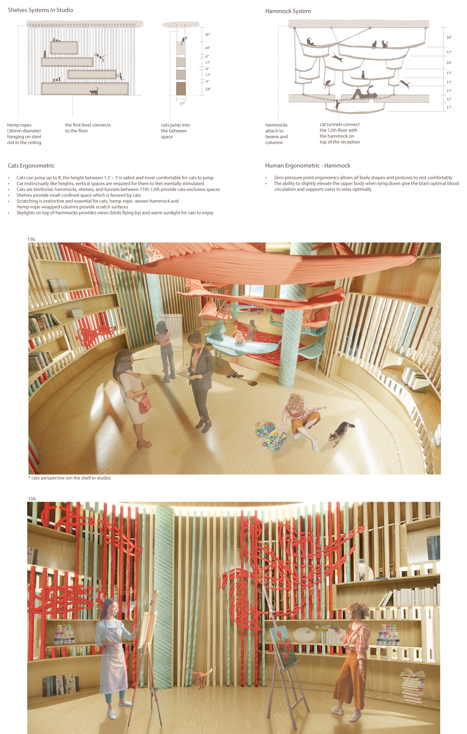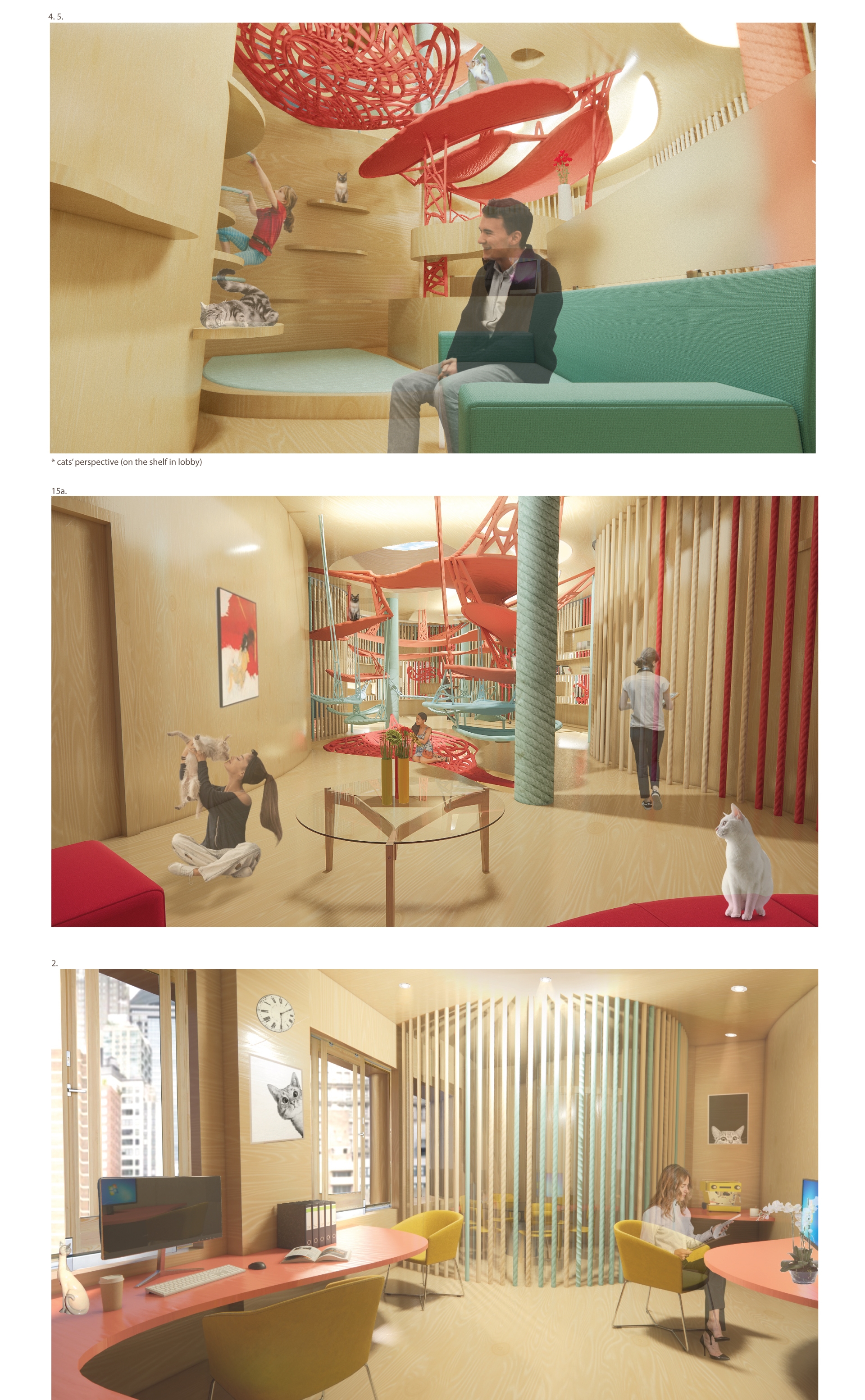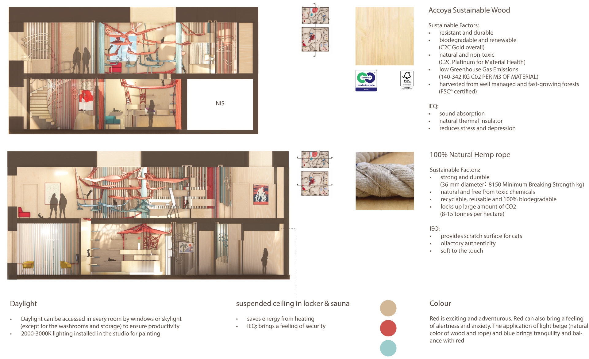 This wellness center provides animal (cats) assisted art therapy, which helps patients with depression explore themselves psychologically under the company of cats. The center uses Accoya wood and hemp ropes which are natural and sustainable. The materials construct an environment to help patients relax and heal. The spiral-form spatial layout and vertical structures create adventurous spaces to provide a unique experience for cats and humans. Red, Blue, and light beige are applied to achieve a balance between excitement and relaxation.