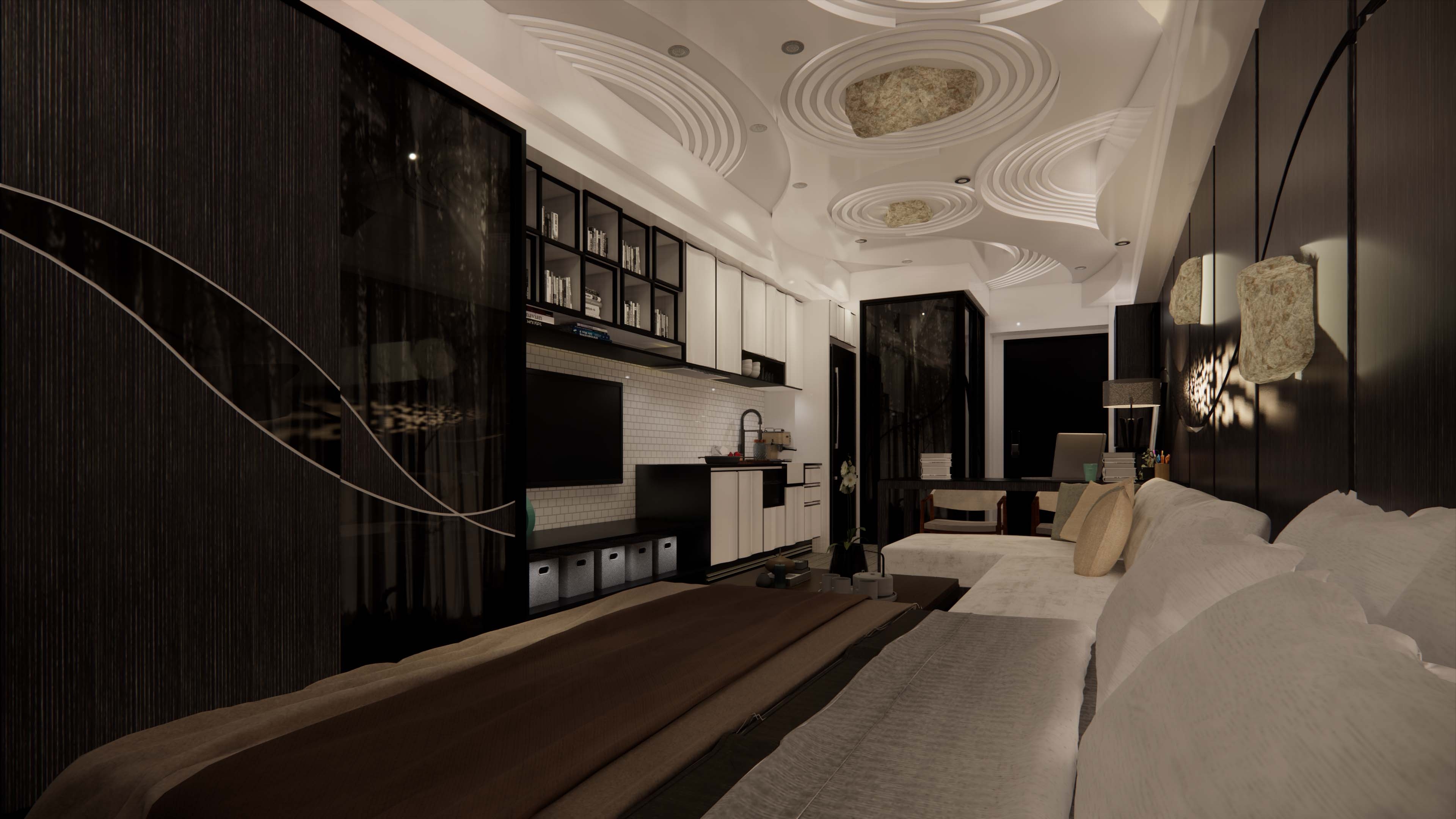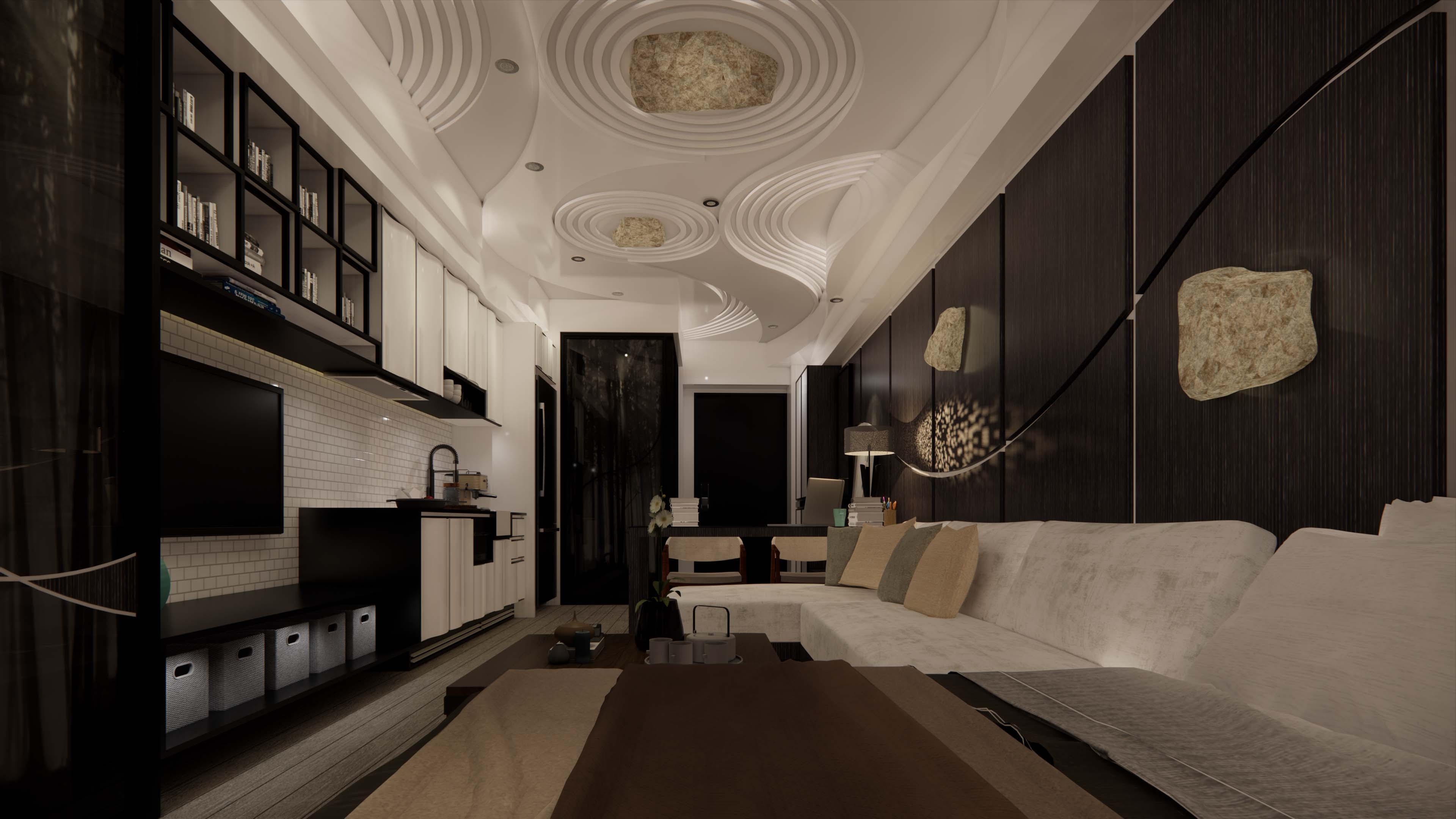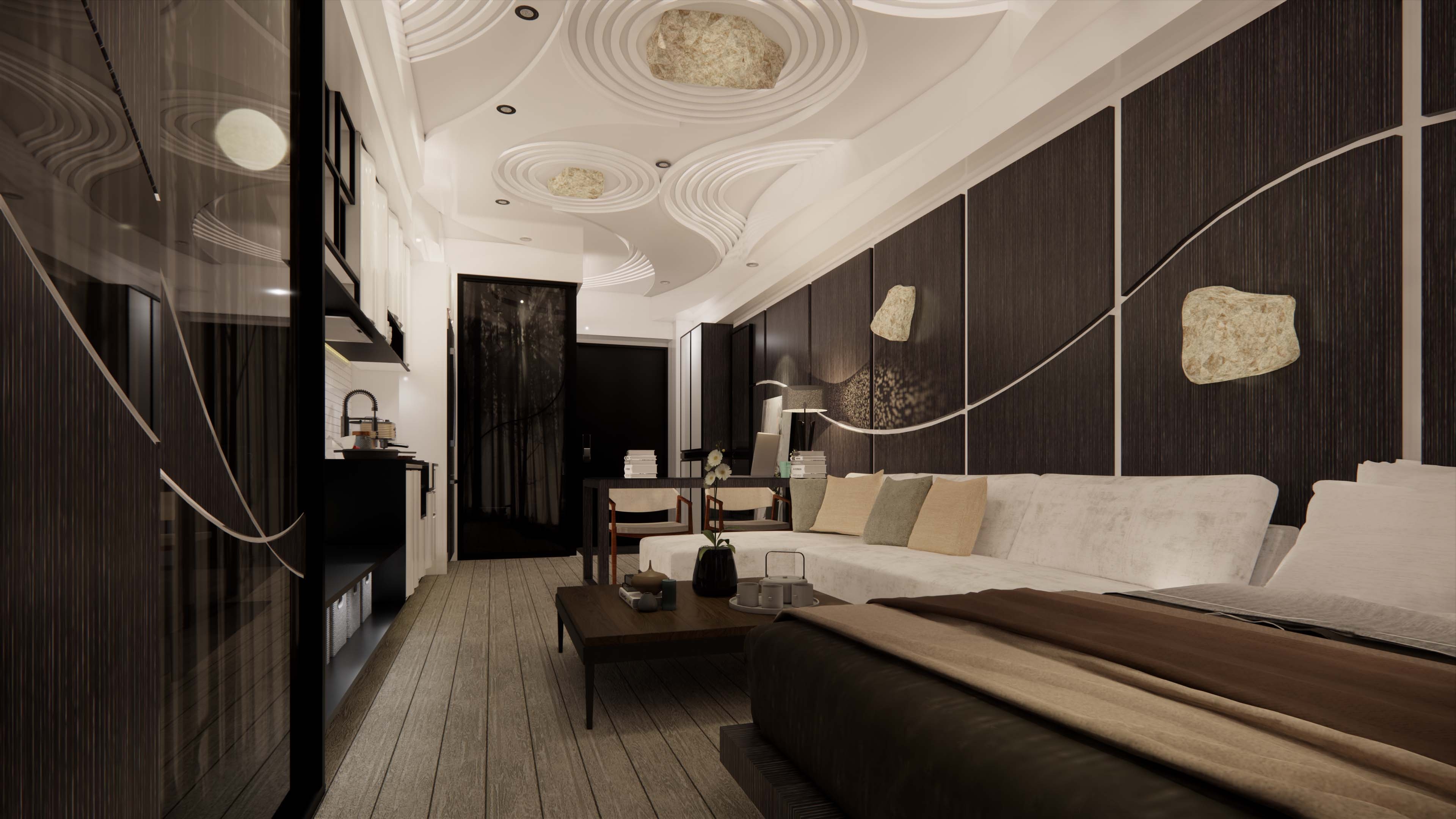 The artistic conception of Karesansui(Japanese Rock Garden) is not the exquisite beauty of ordinary Japanese gardens. Monks can stare and meditate nearby in the indoors. In this miniature world constructed by the concept, it combines with nature to design the situation of Karesansui as the theme.
